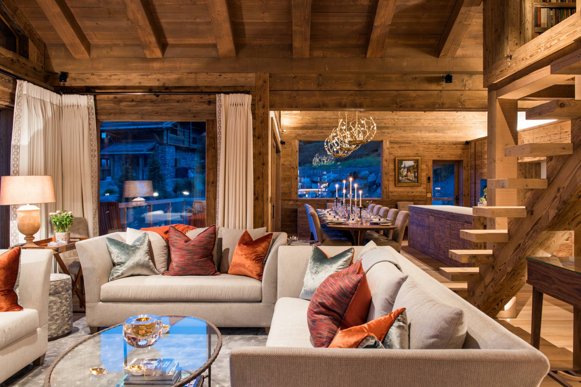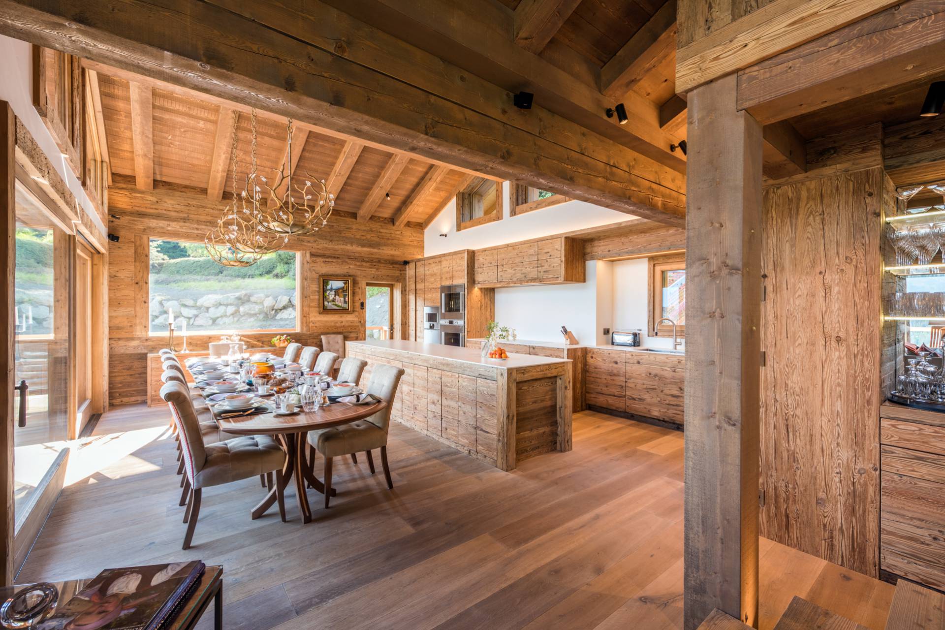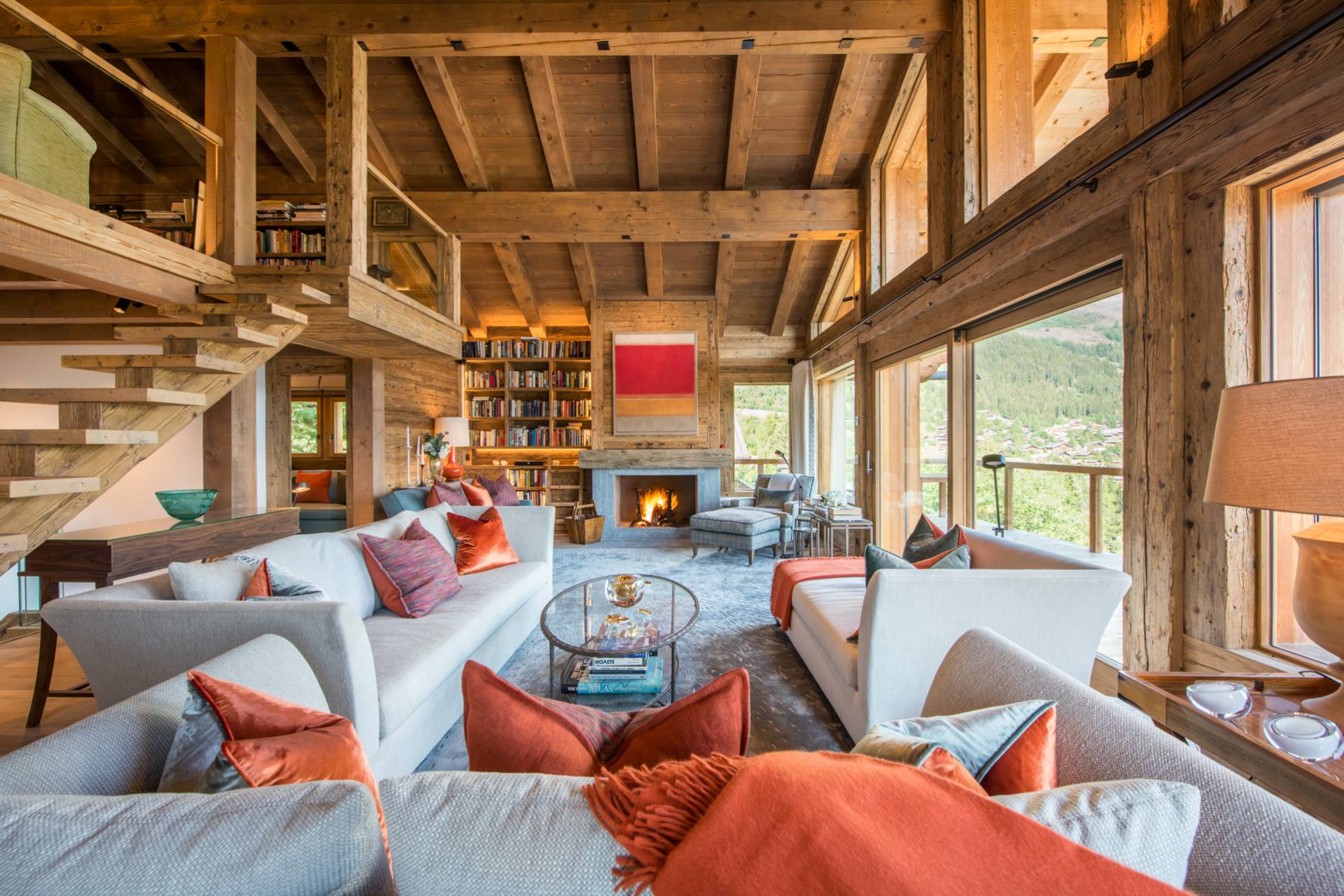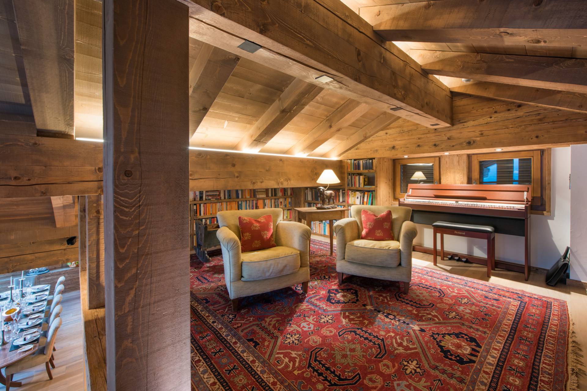 Au troisième étage se déploie la pièce maîtresse du chalet : sous la charpente en bois massif, l'immense pièce à vivre distribuant le grand salon, la salle à manger pouvant réunir une douzaine de convives et la cuisine ouverte. La façade entièrement vitrée du salon offre un panorama spectaculaire et inonde la pièce de lumière. Vous aimerez y passer de longues heures avec un bon livre, confortablement installés dans l'un des quatre grands canapés au style classique réchauffés par des coussins de couleurs vives, ou bien vous étendre dans la méridienne au coin du feu. Meubles et luminaires ont été choisis avec un goût sûr et élégant, associant détails rustiques et montagnards au design le plus actuel. La seconde terrasse vous permettra également de profiter des heures de soleil en hiver et de partager des repas dehors en été face au massif des Combins. La nuit tombée, petits et grands pourront se régaler dans la salle de cinéma. Et si vous levez les yeux enfin pour suivre l'échelle qui vous guidera tout en haut de ce chalet de luxe au charme intemporel, vous découvrirez une charmante mezzanine aménagée en petit salon de musique, agrémenté d'un piano et d'une bibliothèque.