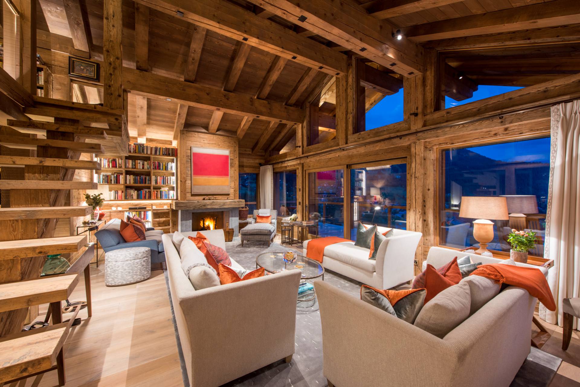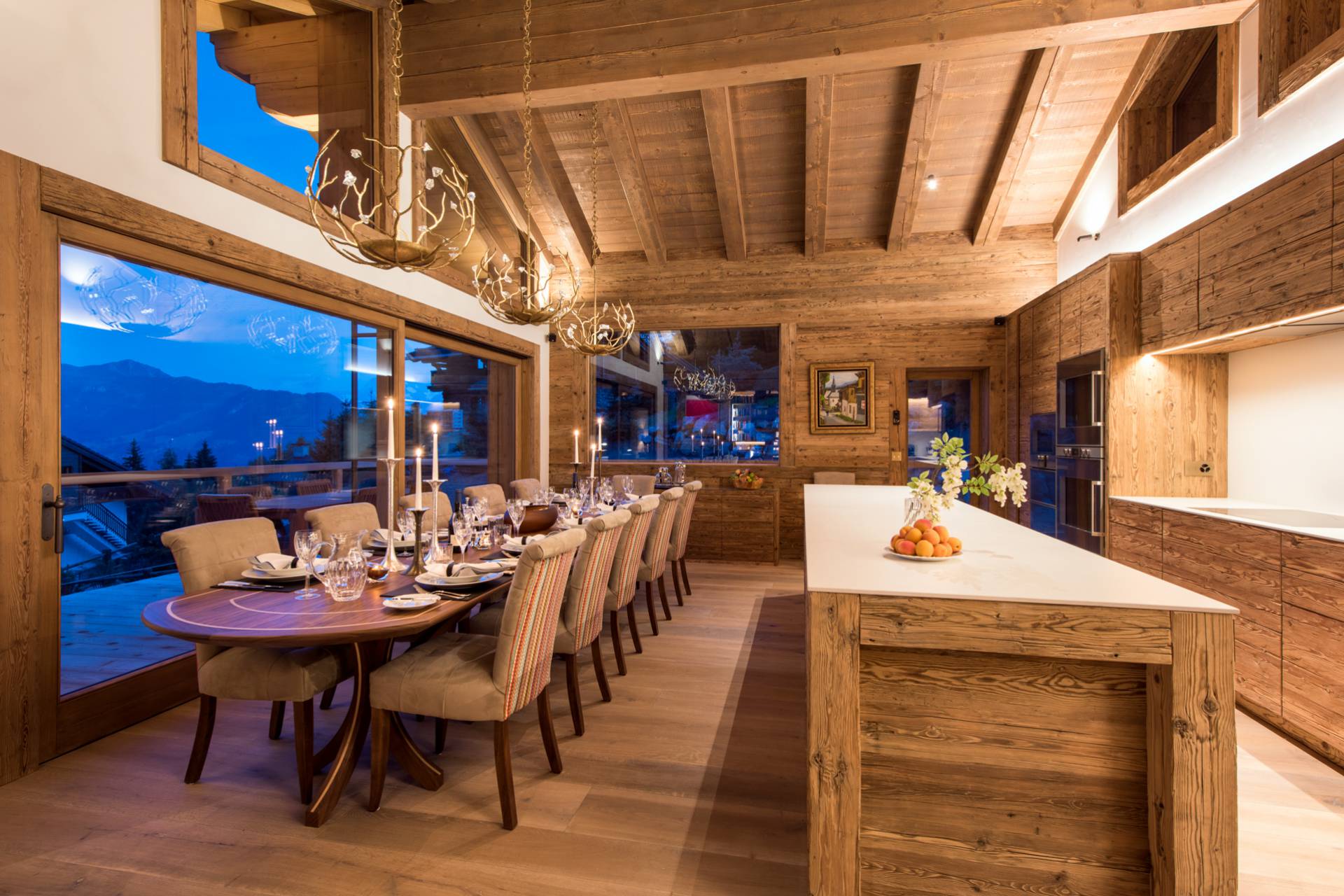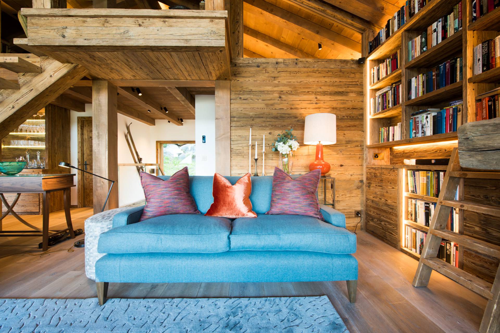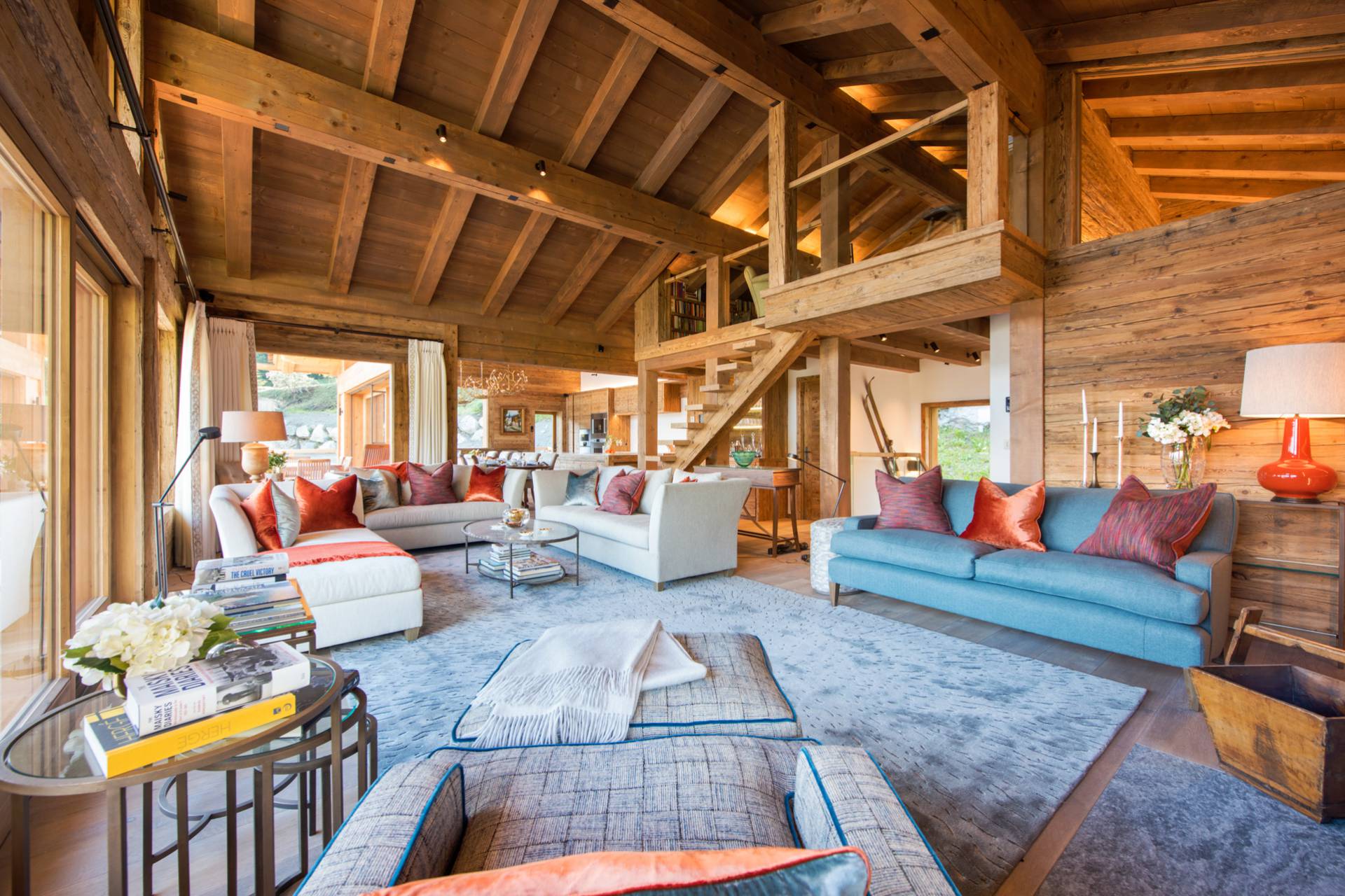 Au troisième étage se déploie la pièce maîtresse du chalet : sous la charpente en bois massif, l'immense pièce à vivre distribuant le grand salon, la salle à manger pouvant réunir une douzaine de convives et la cuisine ouverte. La façade entièrement vitrée du salon offre un panorama spectaculaire et inonde la pièce de lumière. Vous aimerez y passer de longues heures avec un bon livre, confortablement installés dans l'un des quatre grands canapés au style classique réchauffés par des coussins de couleurs vives, ou bien vous étendre dans la méridienne au coin du feu. Meubles et luminaires ont été choisis avec un goût sûr et élégant, associant détails rustiques et montagnards au design le plus actuel. La seconde terrasse vous permettra également de profiter des heures de soleil en hiver et de partager des repas dehors en été face au massif des Combins. La nuit tombée, petits et grands pourront se régaler dans la salle de cinéma. Et si vous levez les yeux enfin pour suivre l'échelle qui vous guidera tout en haut de ce chalet de luxe au charme intemporel, vous découvrirez une charmante mezzanine aménagée en petit salon de musique, agrémenté d'un piano et d'une bibliothèque.