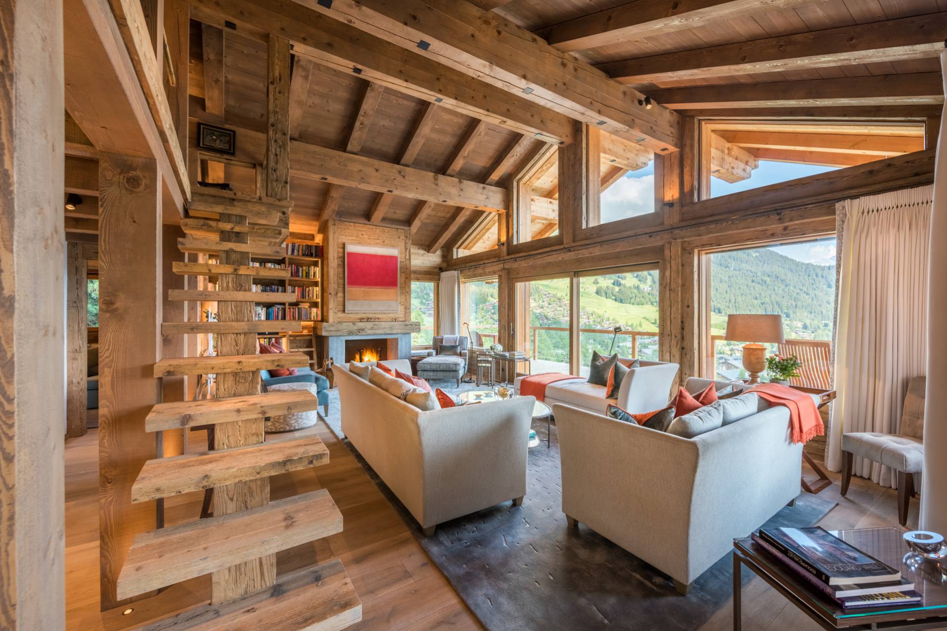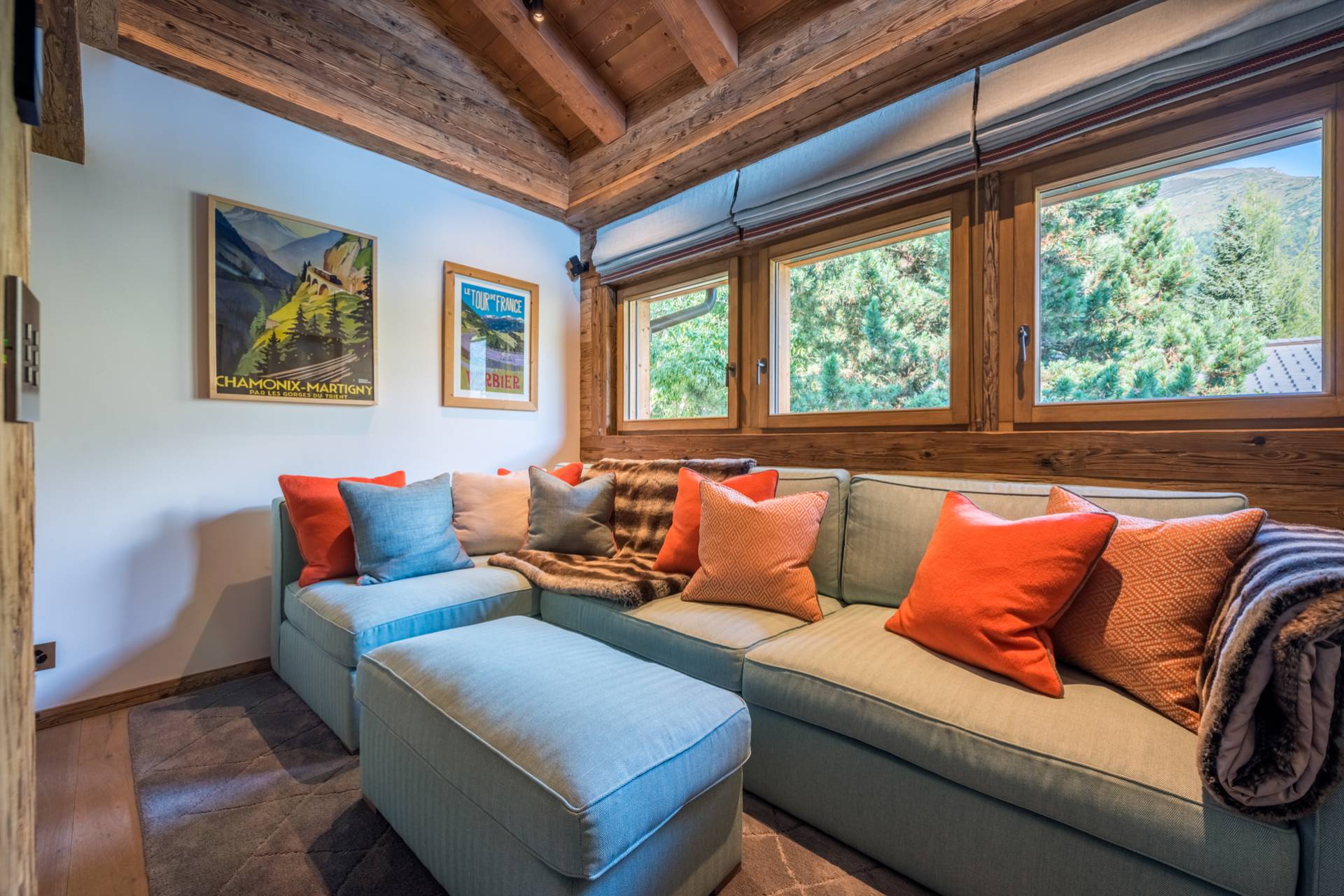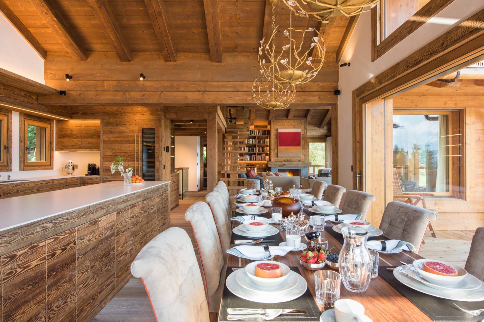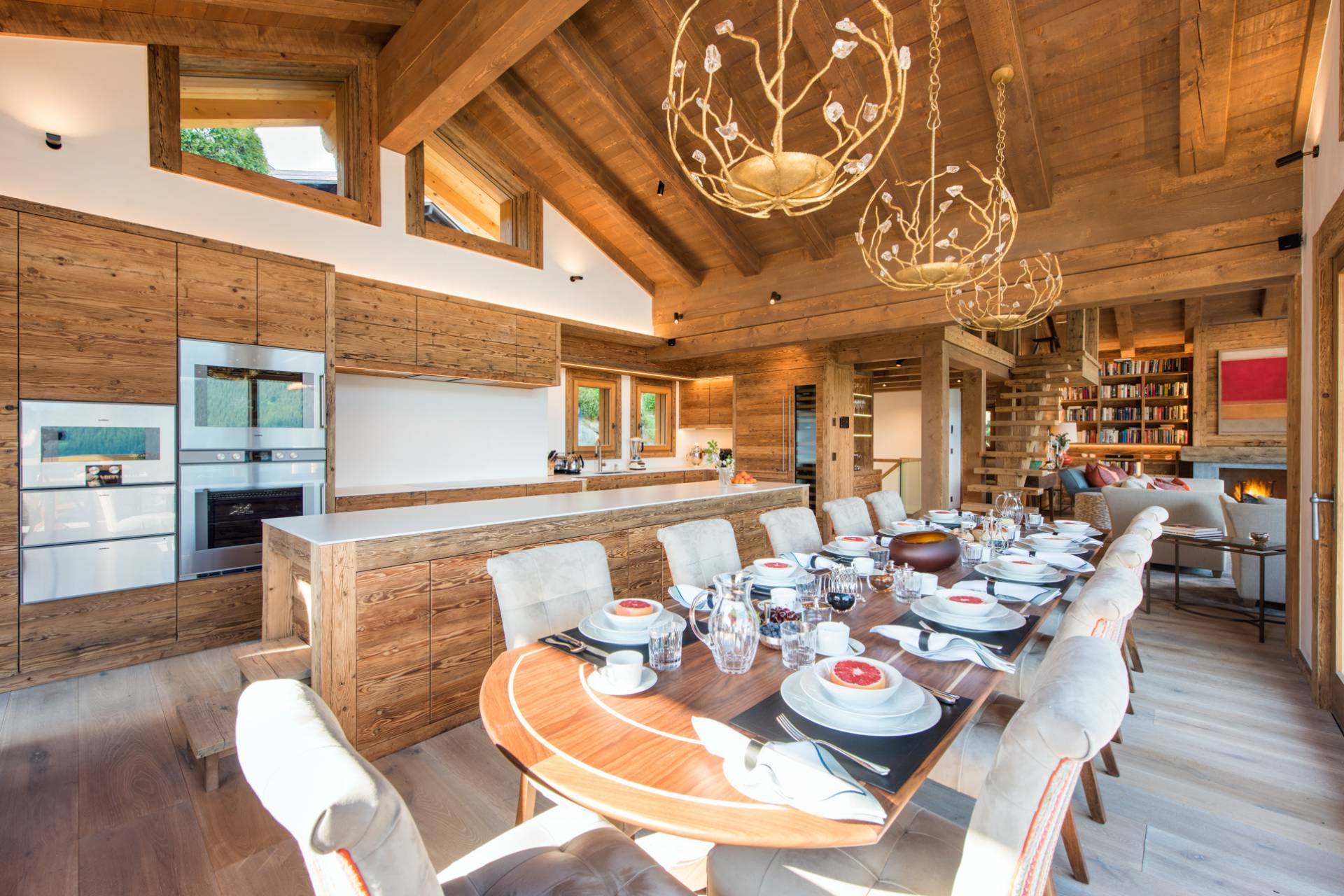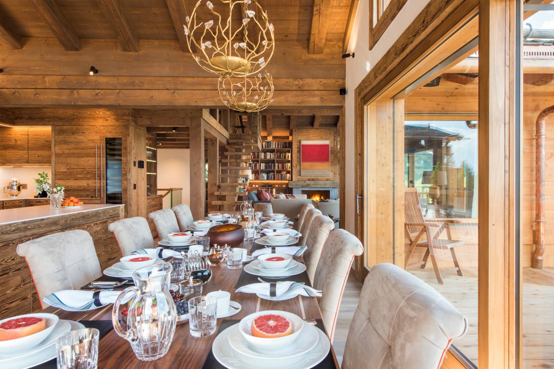 Au troisième étage se déploie la pièce maîtresse du chalet : sous la charpente en bois massif, l'immense pièce à vivre distribuant le grand salon, la salle à manger pouvant réunir une douzaine de convives et la cuisine ouverte. La façade entièrement vitrée du salon offre un panorama spectaculaire et inonde la pièce de lumière. Vous aimerez y passer de longues heures avec un bon livre, confortablement installés dans l'un des quatre grands canapés au style classique réchauffés par des coussins de couleurs vives, ou bien vous étendre dans la méridienne au coin du feu. Meubles et luminaires ont été choisis avec un goût sûr et élégant, associant détails rustiques et montagnards au design le plus actuel. La seconde terrasse vous permettra également de profiter des heures de soleil en hiver et de partager des repas dehors en été face au massif des Combins. La nuit tombée, petits et grands pourront se régaler dans la salle de cinéma. Et si vous levez les yeux enfin pour suivre l'échelle qui vous guidera tout en haut de ce chalet de luxe au charme intemporel, vous découvrirez une charmante mezzanine aménagée en petit salon de musique, agrémenté d'un piano et d'une bibliothèque.