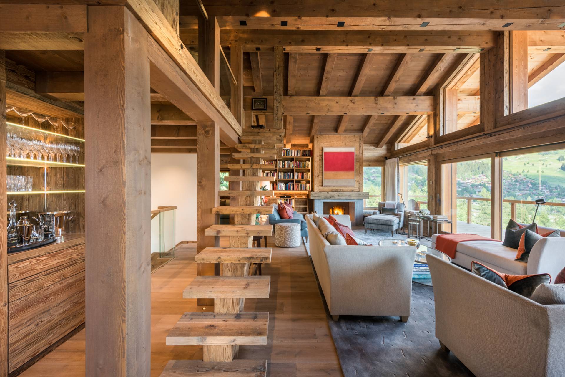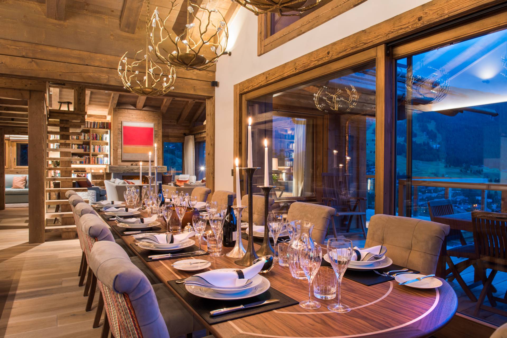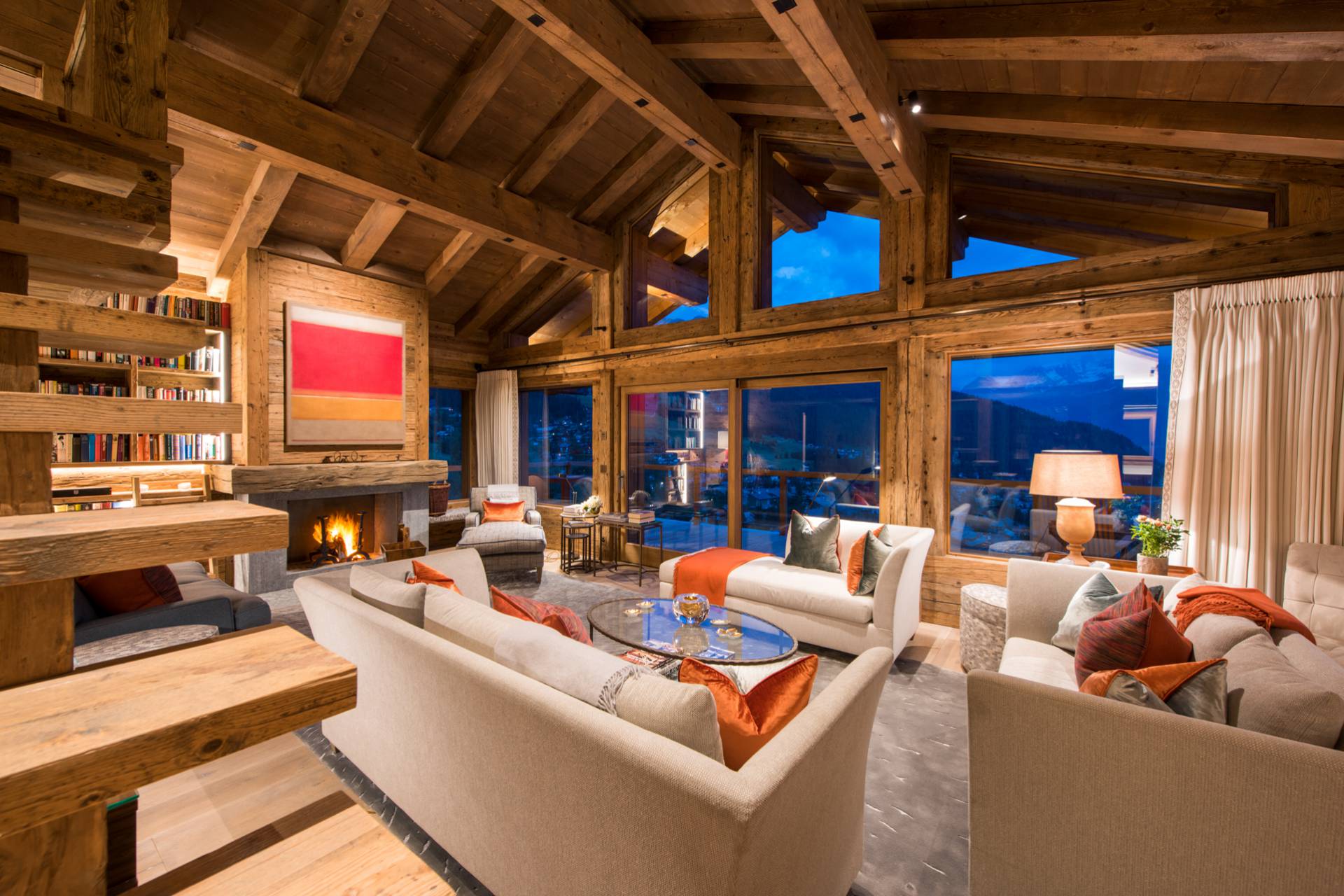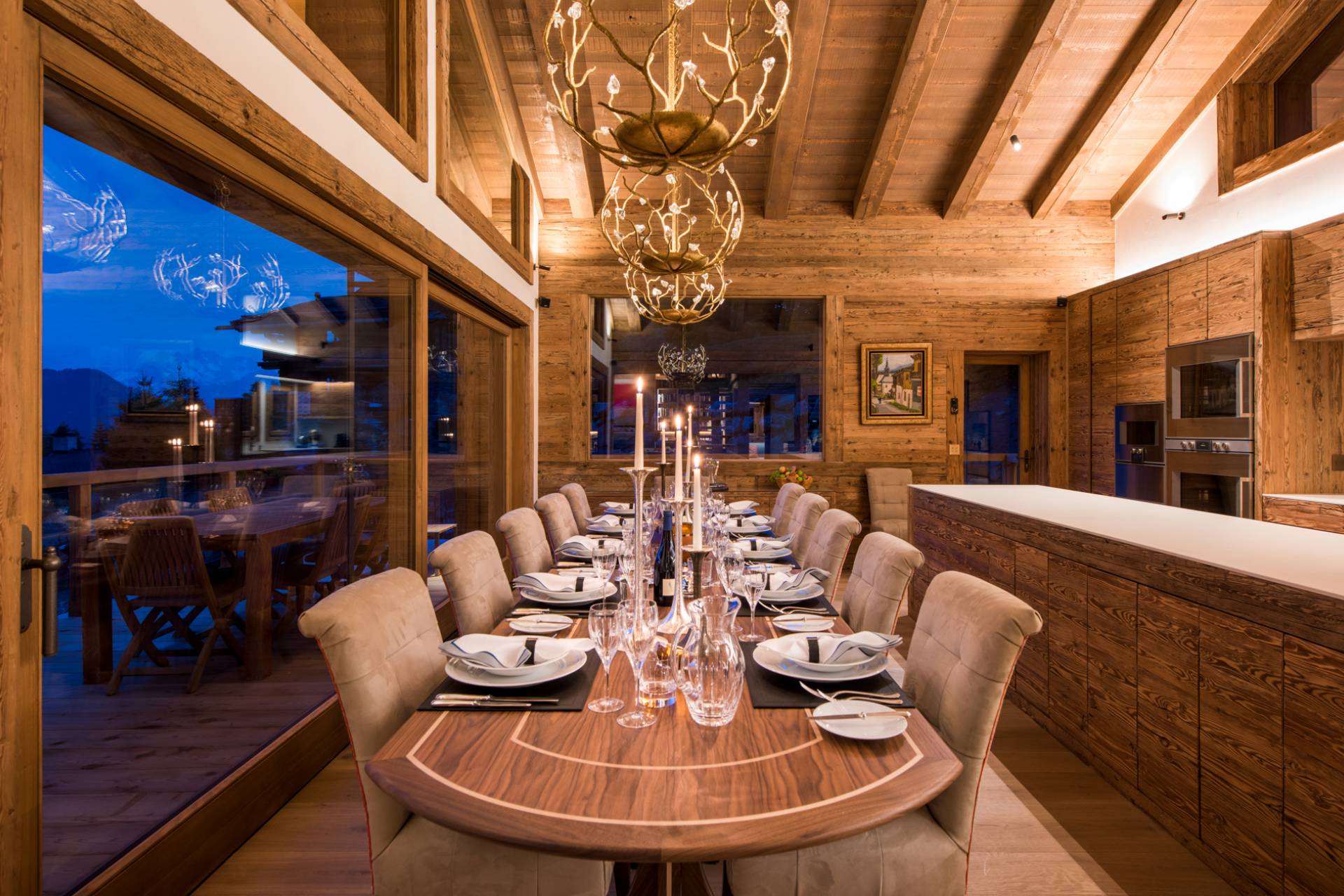 Au troisième étage se déploie la pièce maîtresse du chalet : sous la charpente en bois massif, l'immense pièce à vivre distribuant le grand salon, la salle à manger pouvant réunir une douzaine de convives et la cuisine ouverte. La façade entièrement vitrée du salon offre un panorama spectaculaire et inonde la pièce de lumière. Vous aimerez y passer de longues heures avec un bon livre, confortablement installés dans l'un des quatre grands canapés au style classique réchauffés par des coussins de couleurs vives, ou bien vous étendre dans la méridienne au coin du feu. Meubles et luminaires ont été choisis avec un goût sûr et élégant, associant détails rustiques et montagnards au design le plus actuel. La seconde terrasse vous permettra également de profiter des heures de soleil en hiver et de partager des repas dehors en été face au massif des Combins. La nuit tombée, petits et grands pourront se régaler dans la salle de cinéma. Et si vous levez les yeux enfin pour suivre l'échelle qui vous guidera tout en haut de ce chalet de luxe au charme intemporel, vous découvrirez une charmante mezzanine aménagée en petit salon de musique, agrémenté d'un piano et d'une bibliothèque.