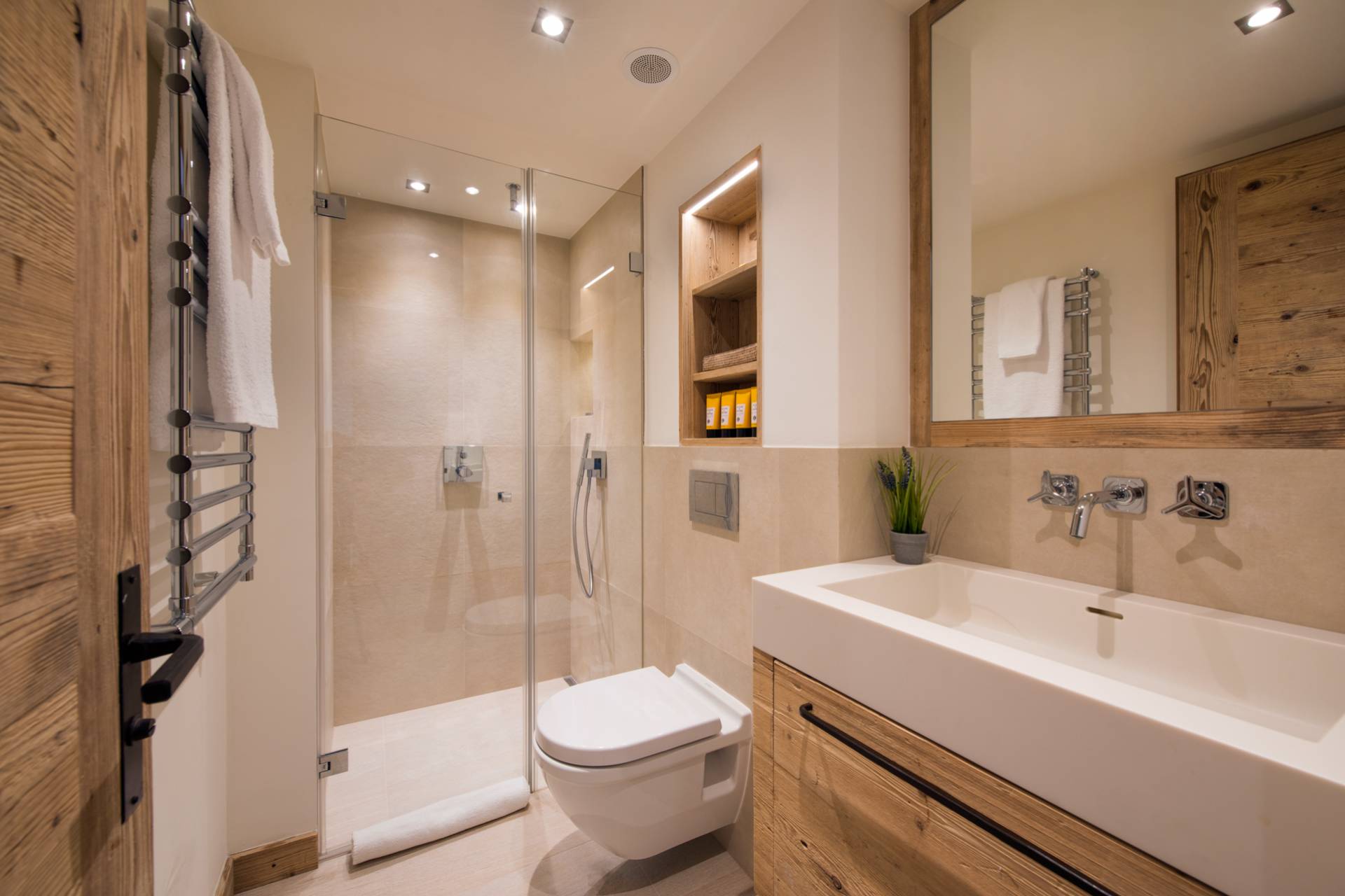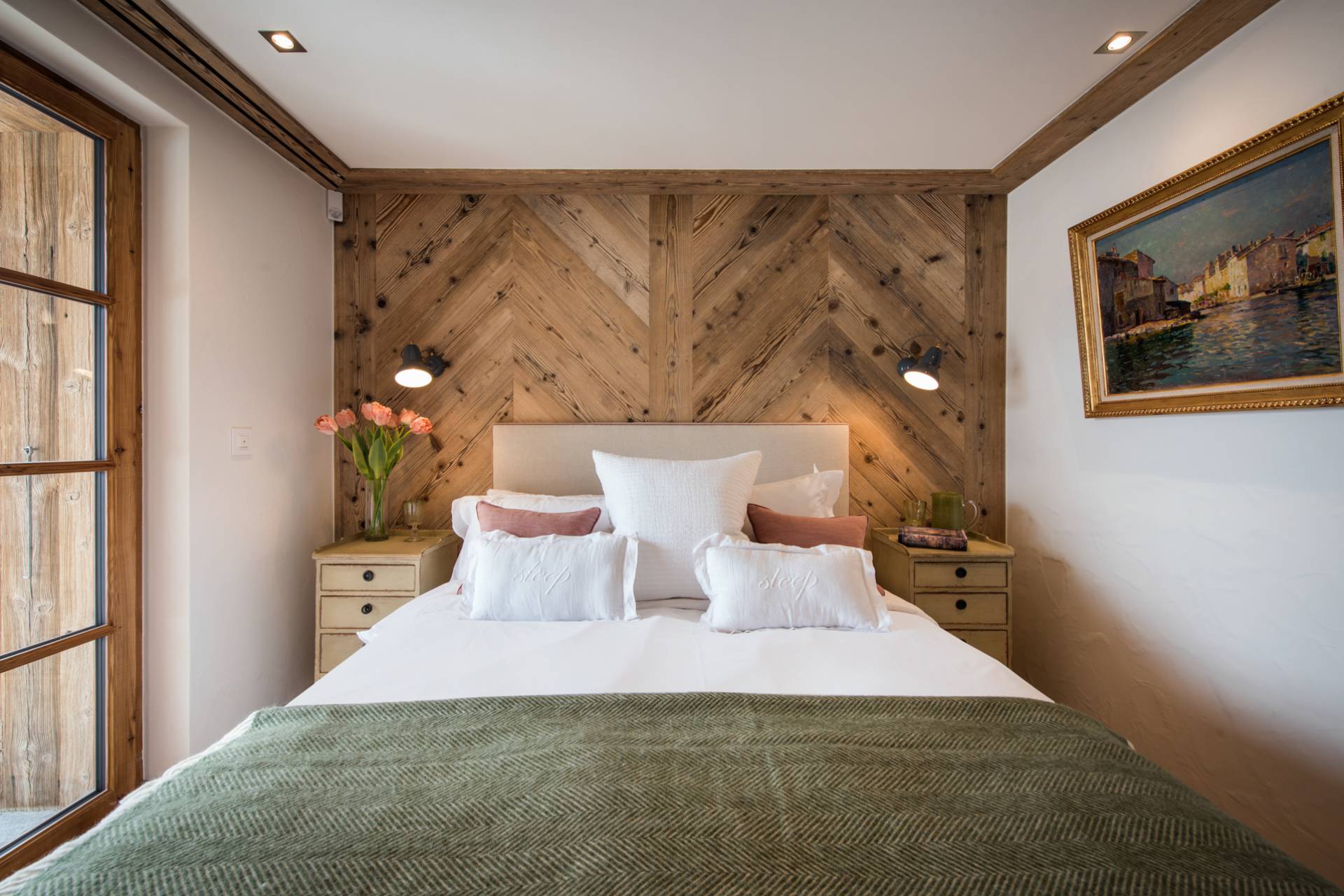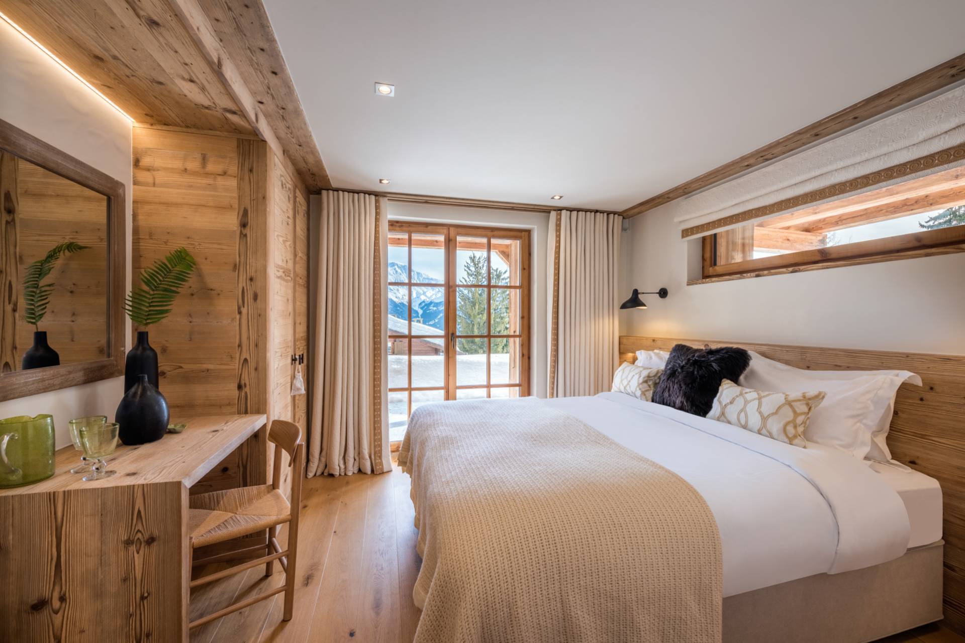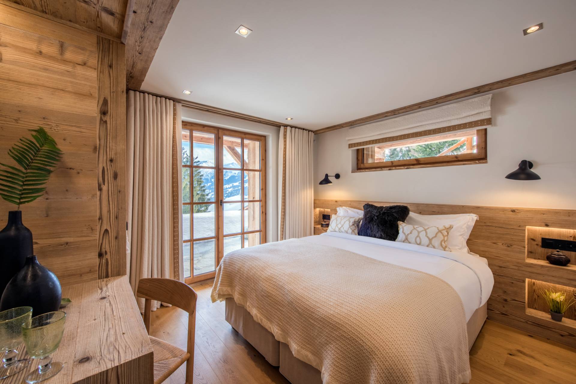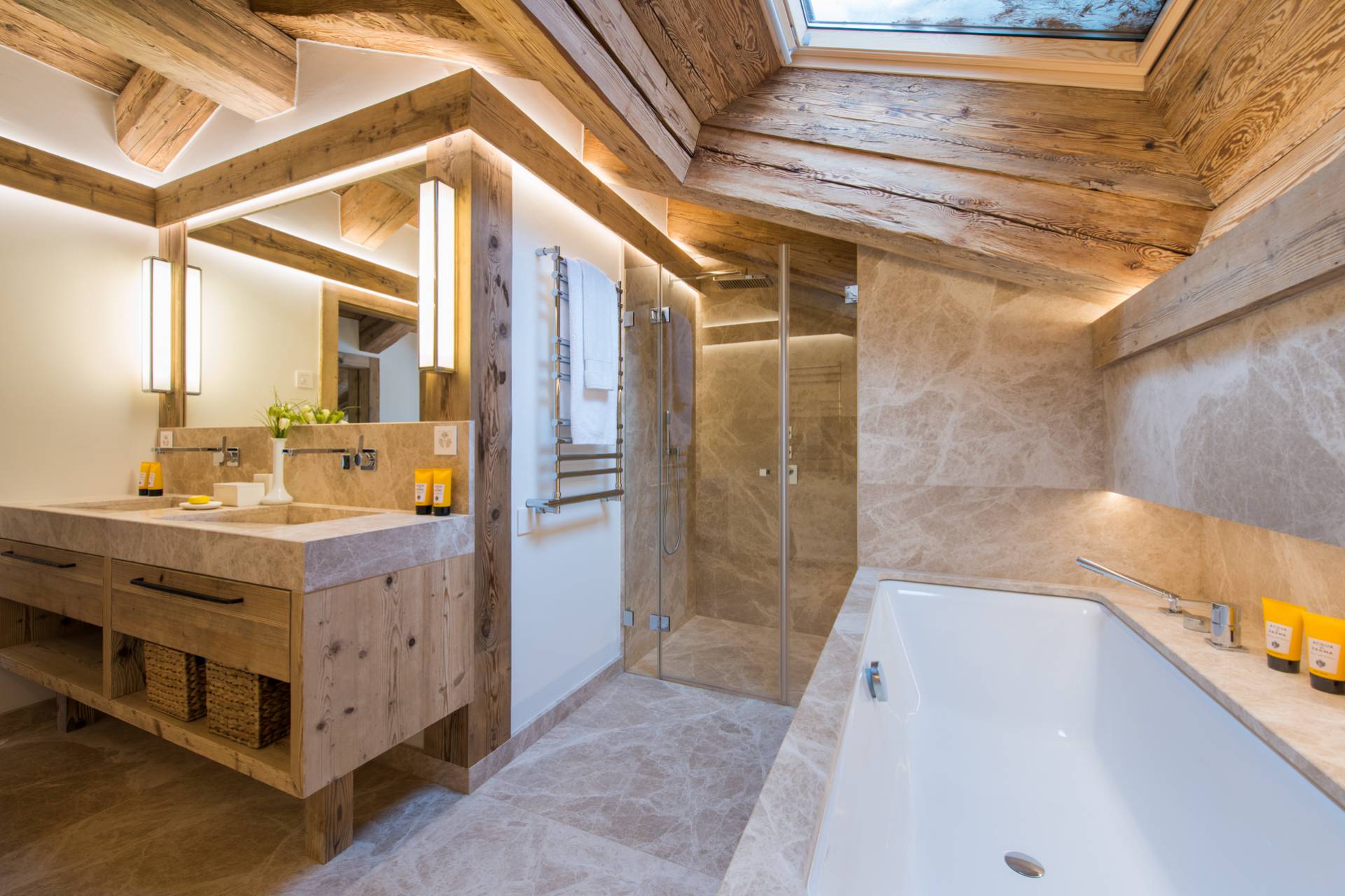Le dernier étage est quant à lui entièrement consacré à la suite parentale. Avec un splendide coup d’œil sur les monts du Valais depuis son balcon privé, ce petit nid perché sous le toit du chalet est pourvu, pour votre plus grand confort, d’un lit king size, d’un véritable salon et d’une superbe salle de bain attenante, toute de bois et de marbre, avec baignoire et douche séparées, éclairée par un puits de lumière zénithale.