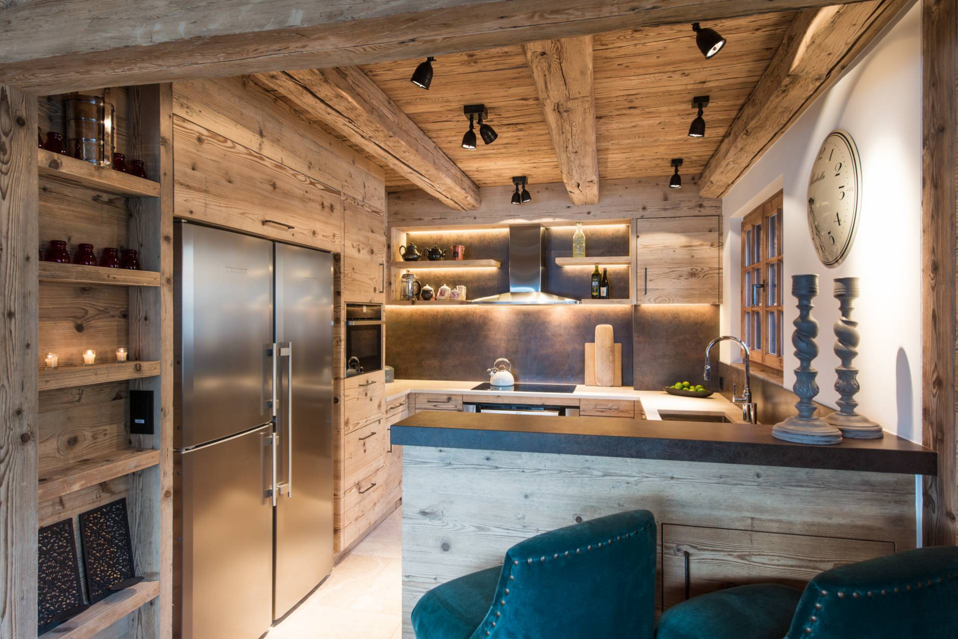 Les architectes ont su conserver le cachet traditionnel et rustique de ce magnifique chalet tout en y apportant une touche de modernité. Ainsi le liseré fleuri des rideaux et les découpes typiques en formes de têtes bovines ou de flocons du bois de la balustrade s’accordent par exemple à merveille avec les lignes épurées et contemporaines du comptoir du bar.