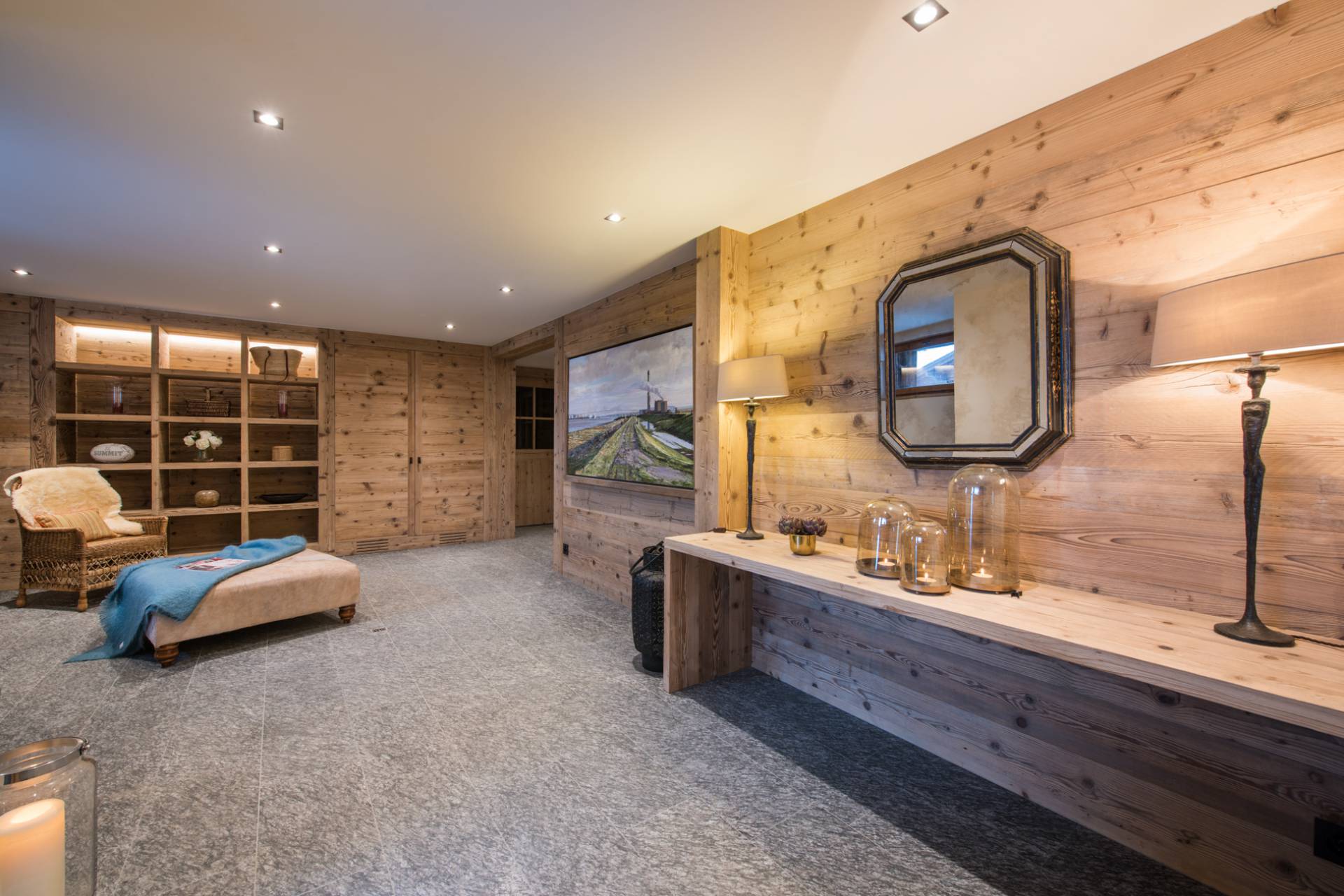 Idéalement aménagé, le chalet a été pensé pour faciliter la vie en groupe. On y entre par le rez-de-chaussée où se trouvent les commodités (le local à ski avec armoire à chaussures chauffante, la buanderie, les toilettes séparées, des espaces de rangement et le lounge). Atout majeur, on peut accéder à tous les étages supérieurs par un escalier mais aussi par un ascenseur.