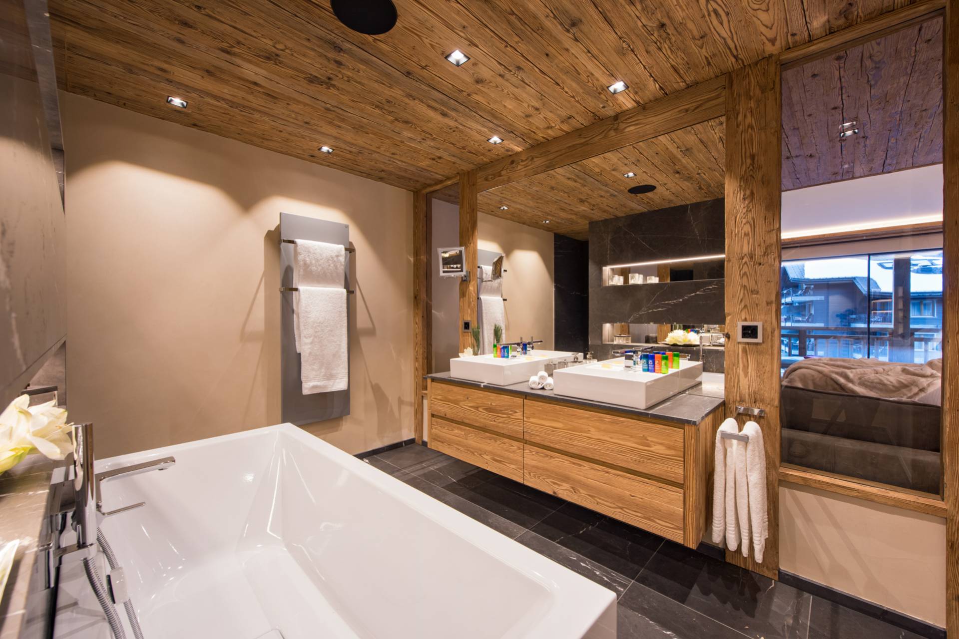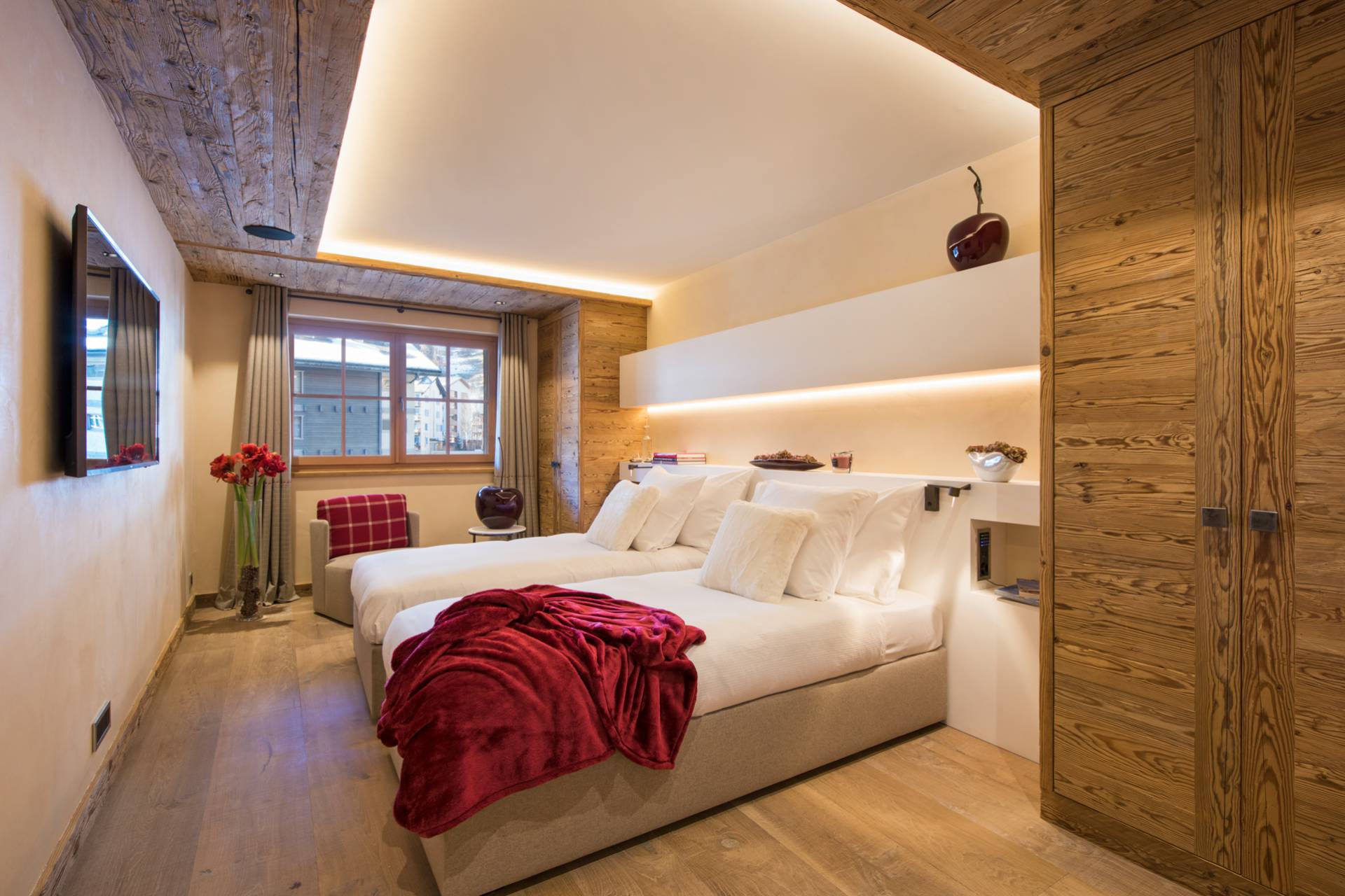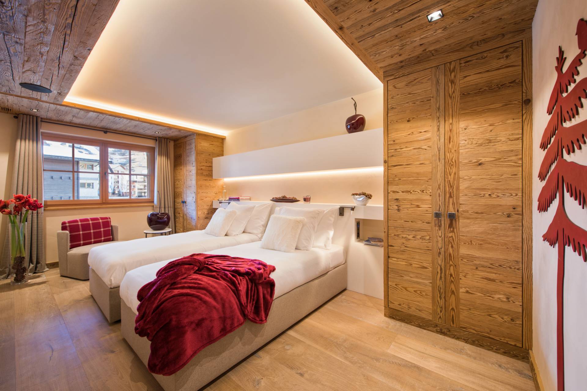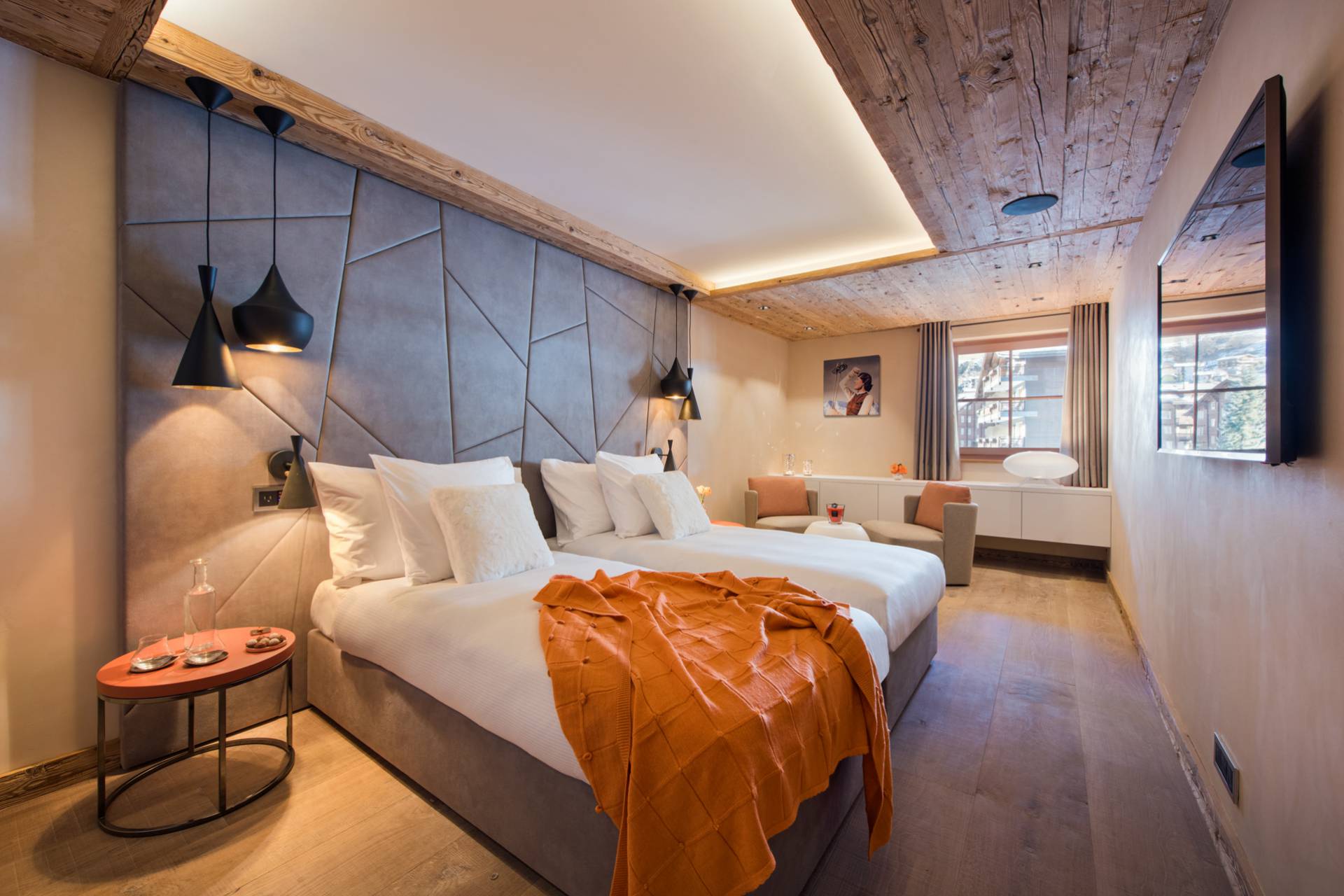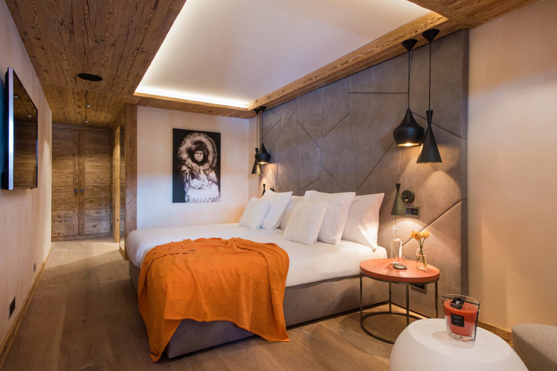 En descendant au deuxième étage, vous découvrirez deux grandes chambres orientées sud-ouest, avec une vue imprenable sur les montagnes. Une des chambres possède son propre dressing. Comme l’ensemble des pièces du chalet, les chambres sont toutes décorées avec goût et vous baigneront dans une ambiance cosy et confortable.