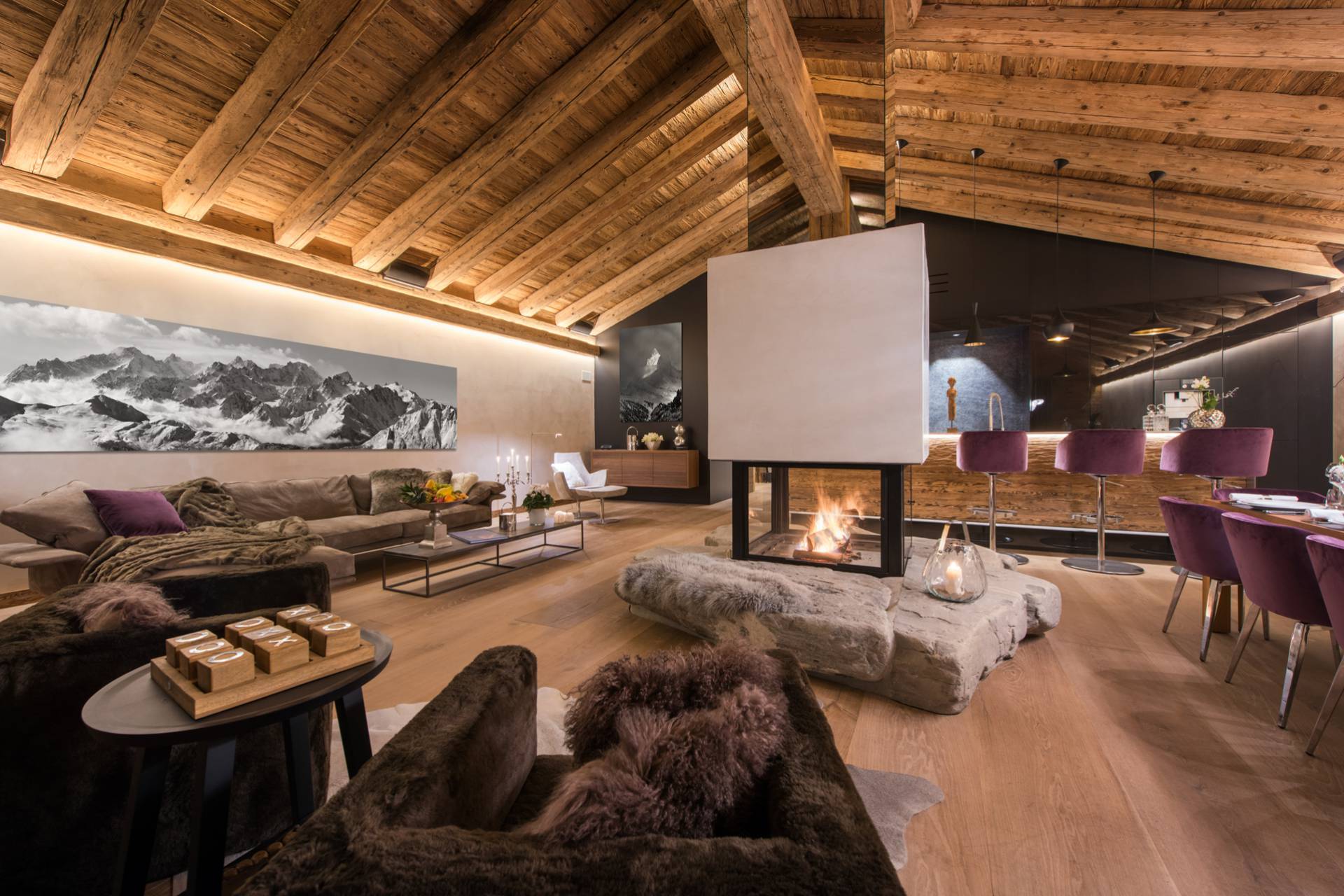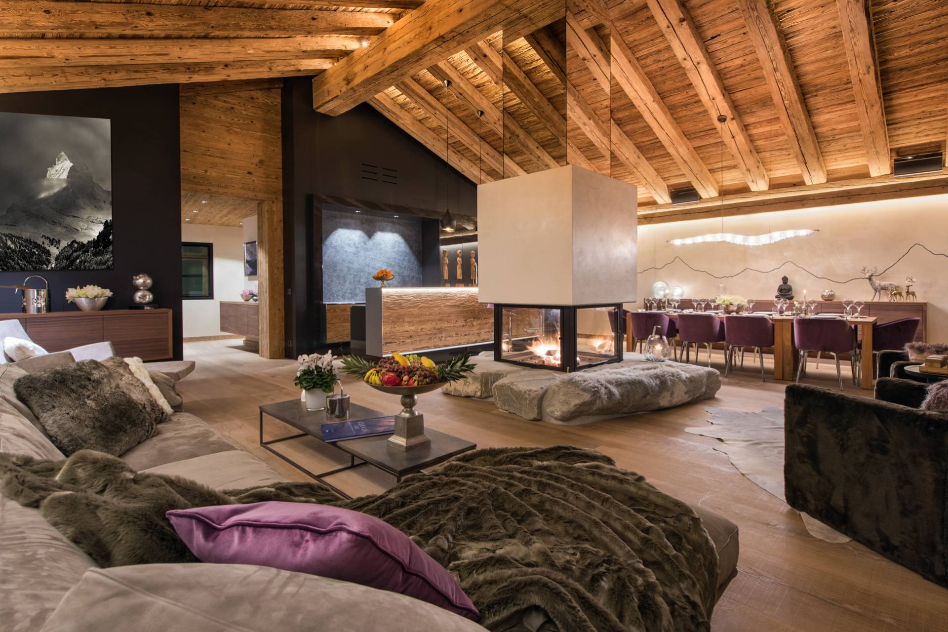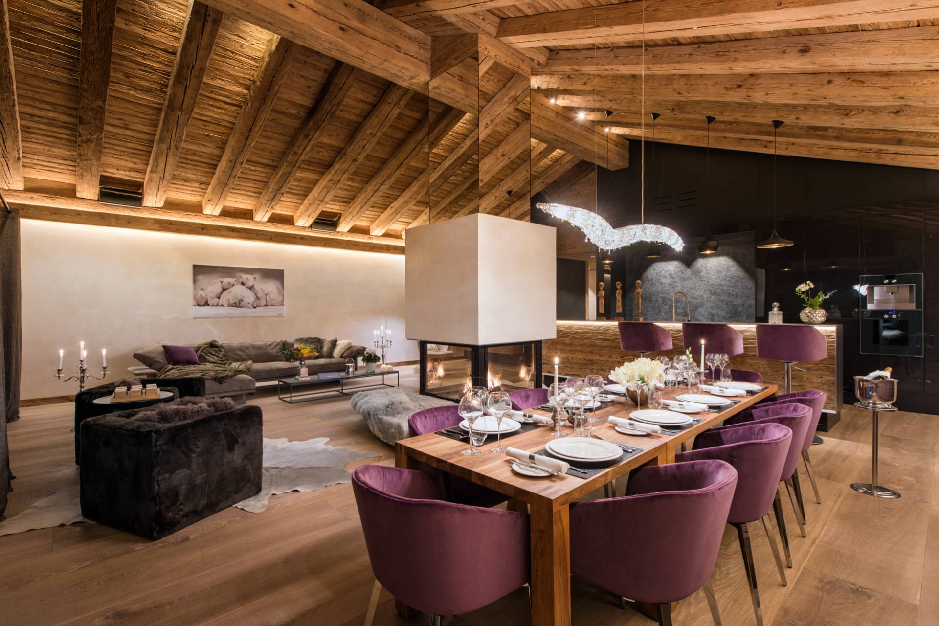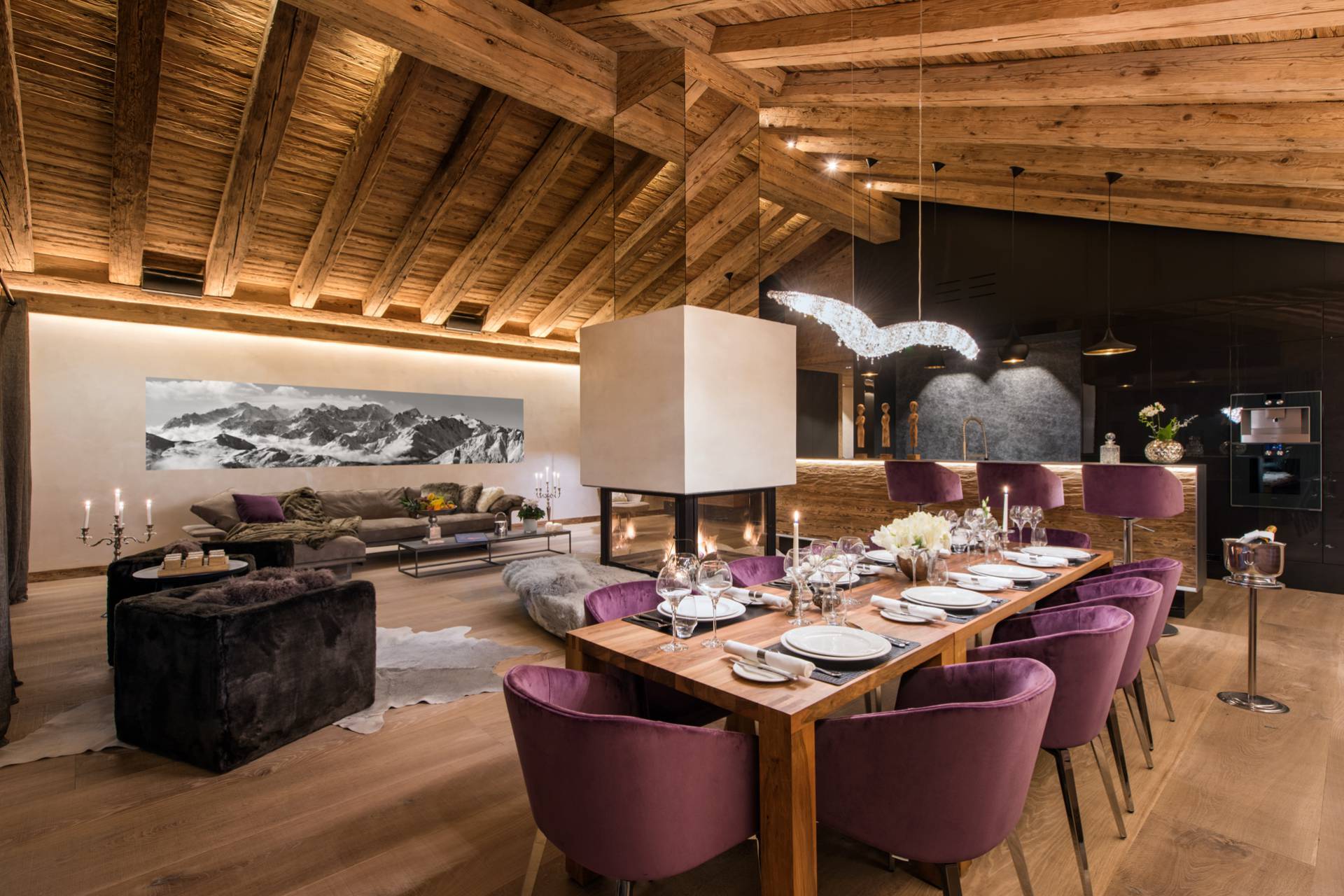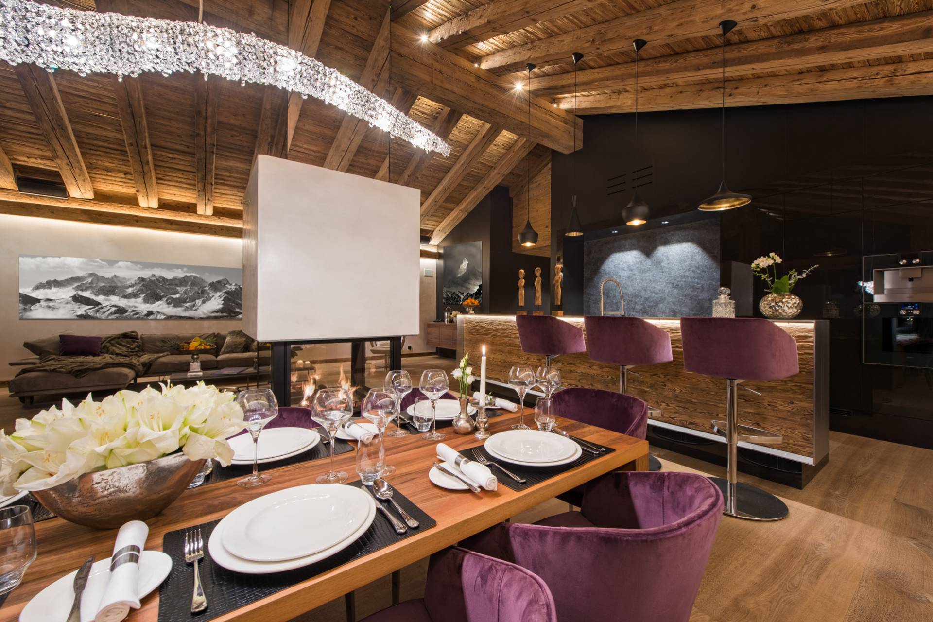 Au dernier étage, vous profiterez d’un impressionnant salon séparé de la salle à manger et de ses somptueux fauteuils en velours coloré par une cheminée centrale intégralement ouverte reposant sur une dalle de pierre. Sous une imposante charpente de bois apparente, cette pièce est un savant mélange de tradition alpine et de design contemporain. Une cuisine ouverte avec bar en inox complète la cuisine professionnelle située au rez-de-chaussée de la résidence. De très grandes baies vitrées bordent la pièce et ouvrent sur un balcon qui vous permettra de profiter de la magnifique vue sur le domaine.