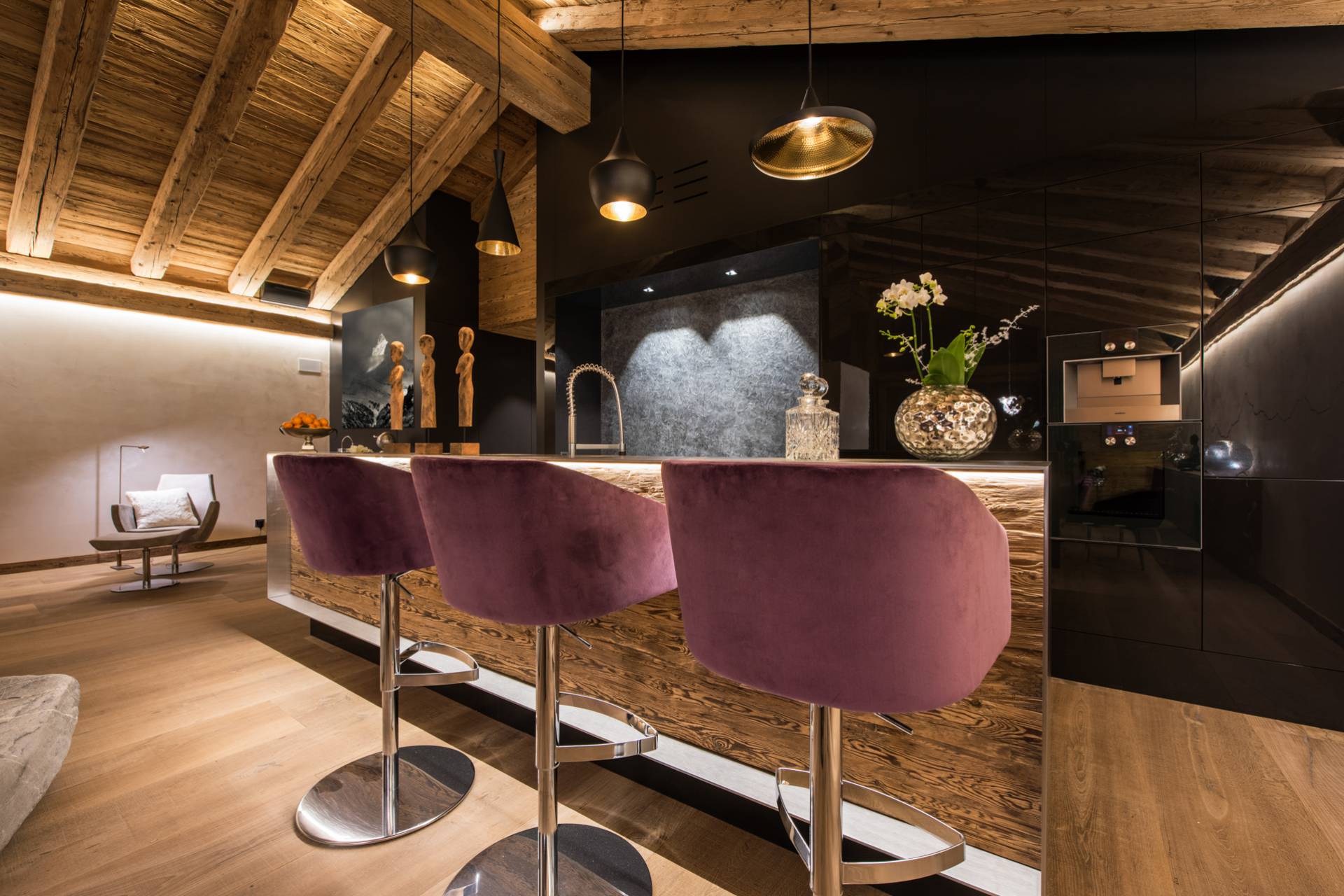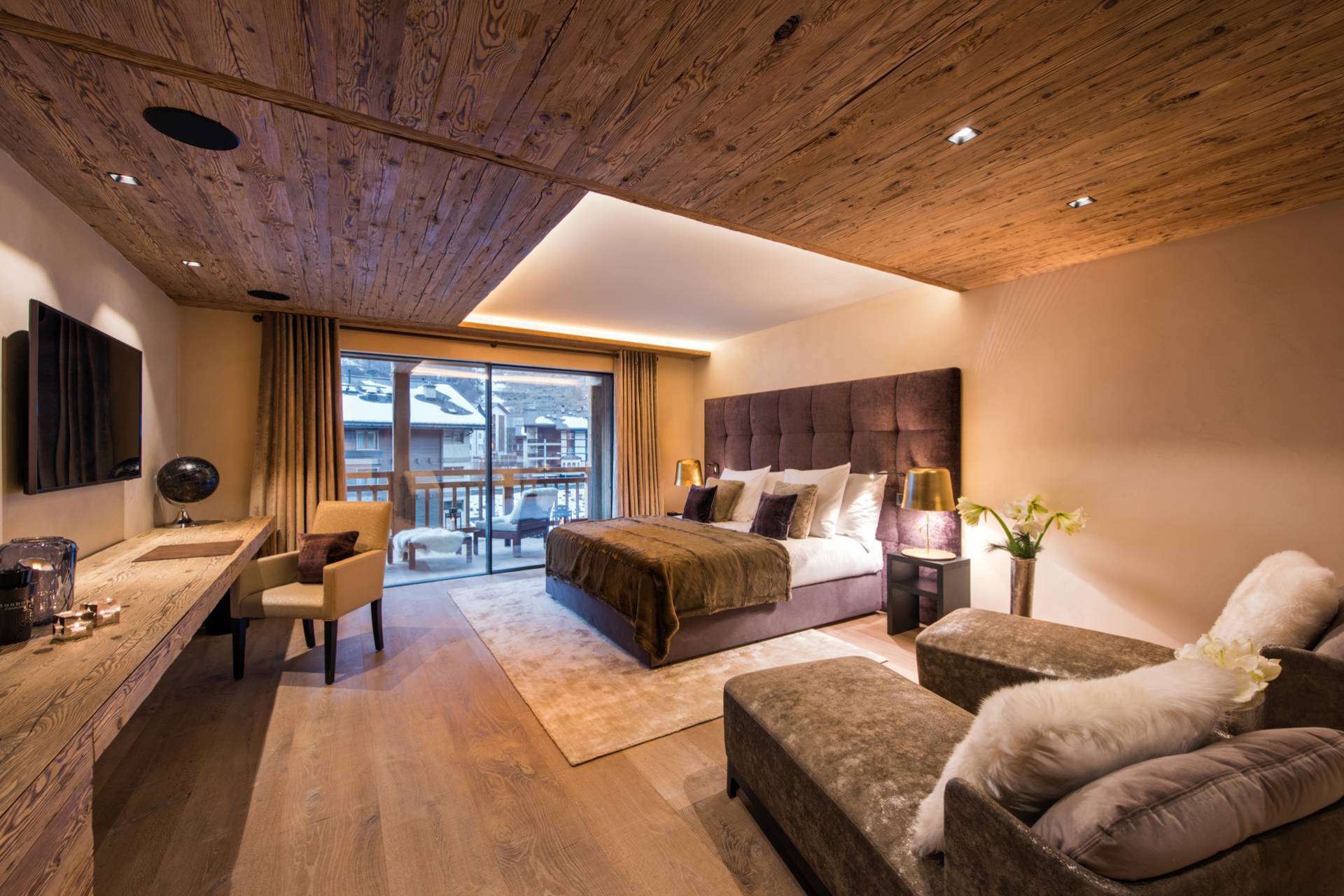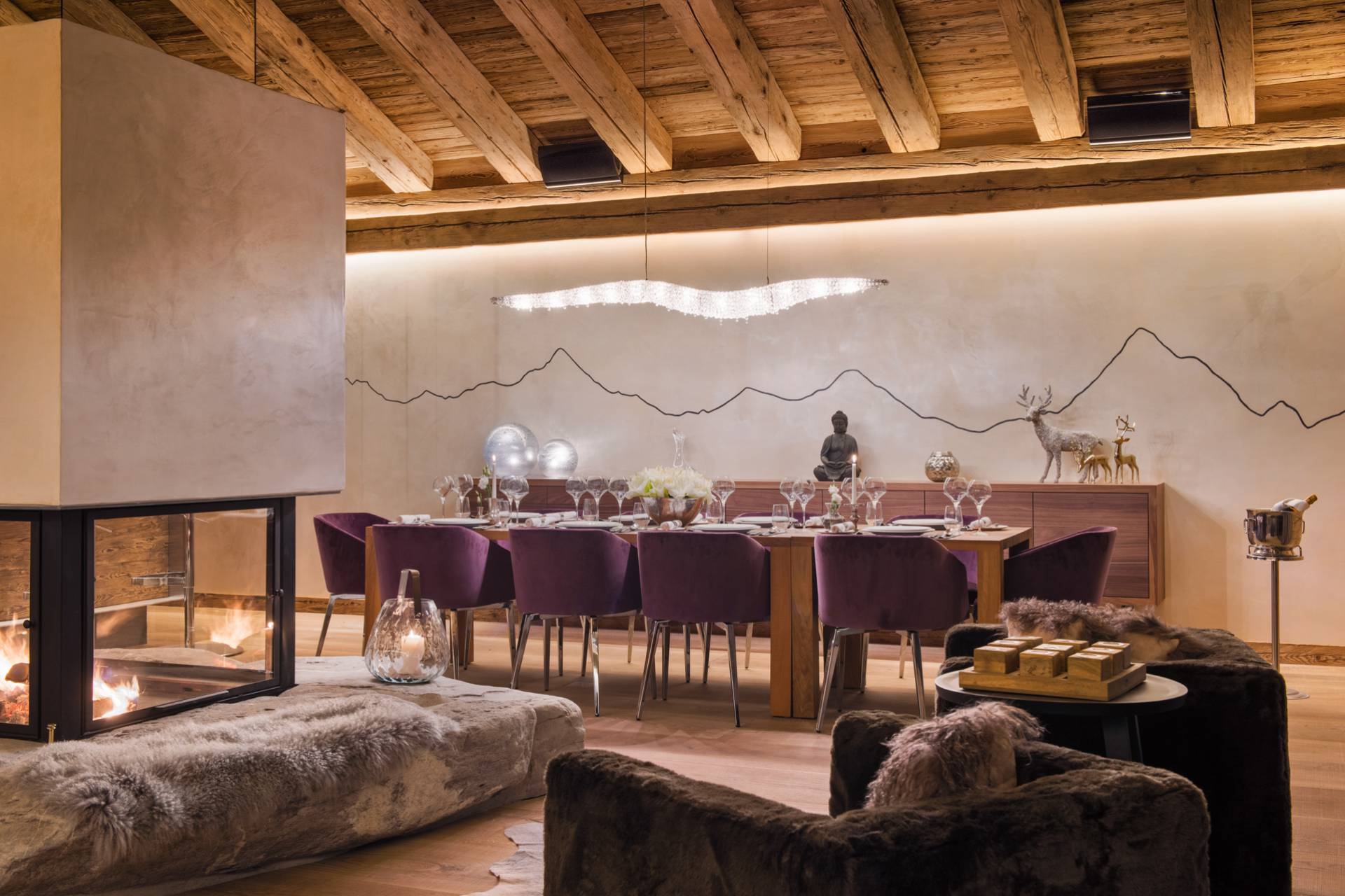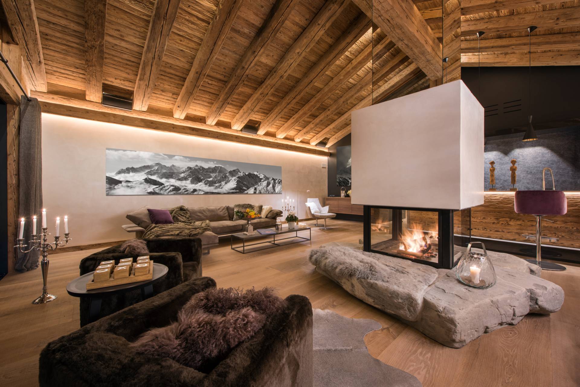 Au dernier étage, vous profiterez d’un impressionnant salon séparé de la salle à manger et de ses somptueux fauteuils en velours coloré par une cheminée centrale intégralement ouverte reposant sur une dalle de pierre. Sous une imposante charpente de bois apparente, cette pièce est un savant mélange de tradition alpine et de design contemporain. Une cuisine ouverte avec bar en inox complète la cuisine professionnelle située au rez-de-chaussée de la résidence. De très grandes baies vitrées bordent la pièce et ouvrent sur un balcon qui vous permettra de profiter de la magnifique vue sur le domaine.