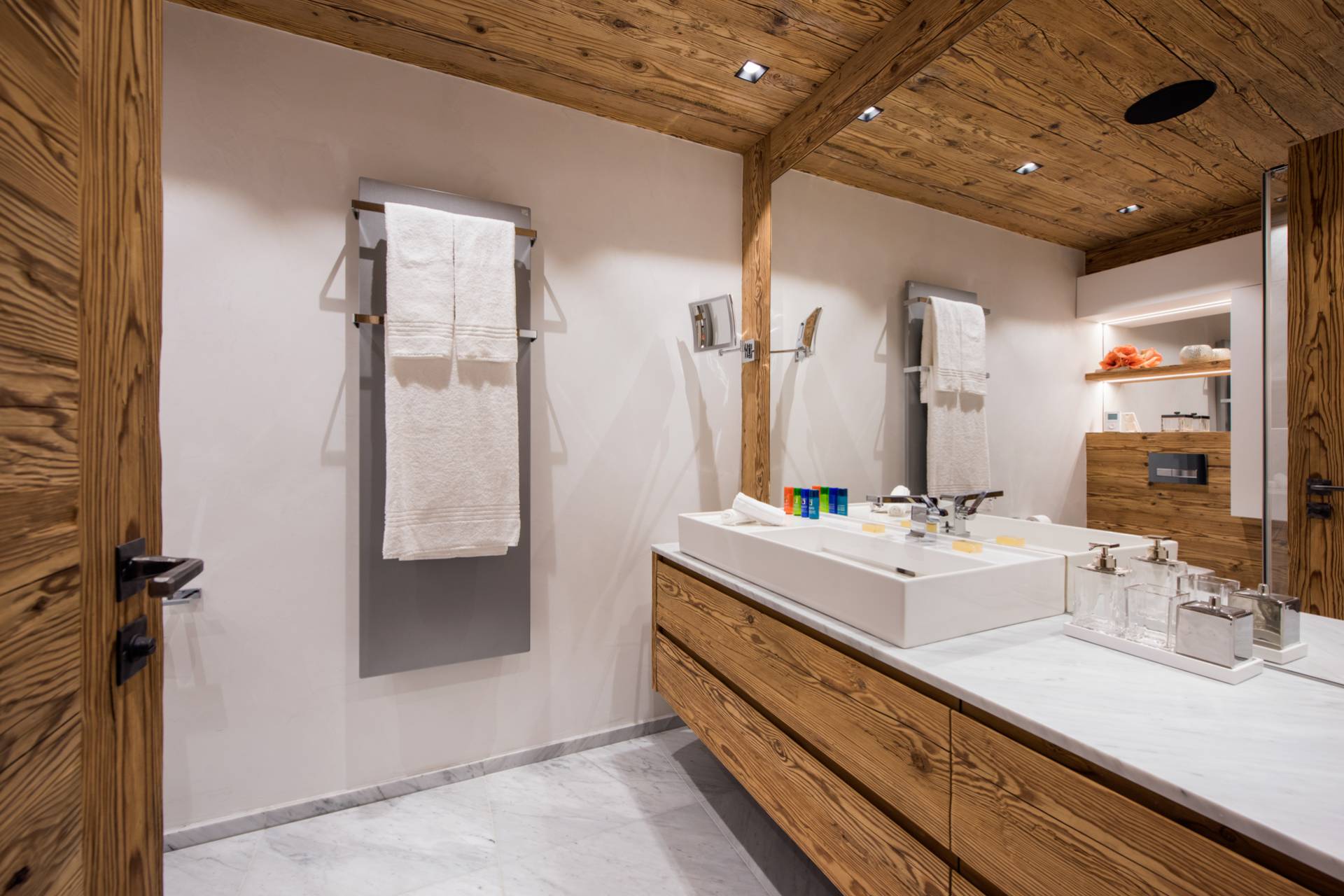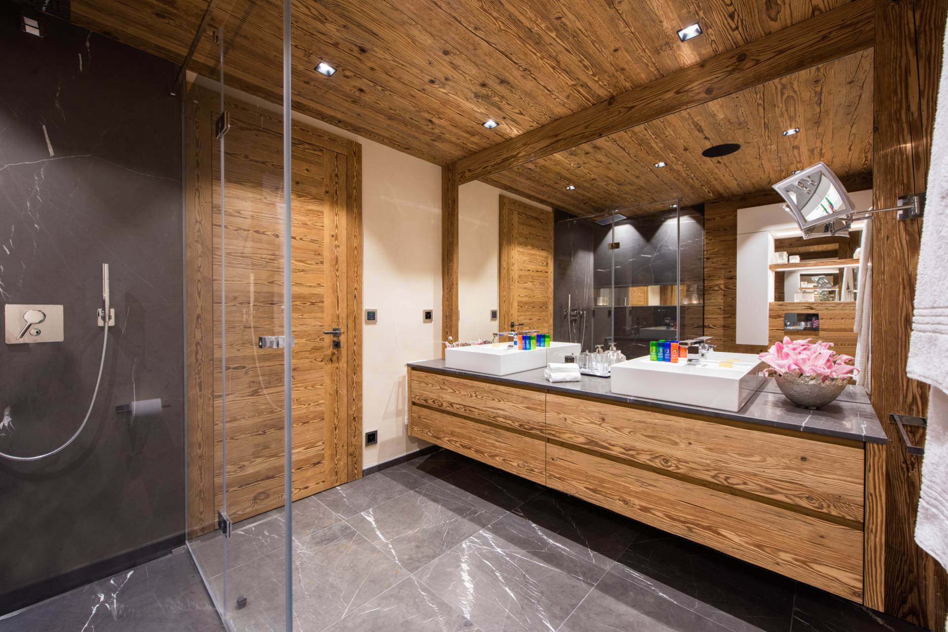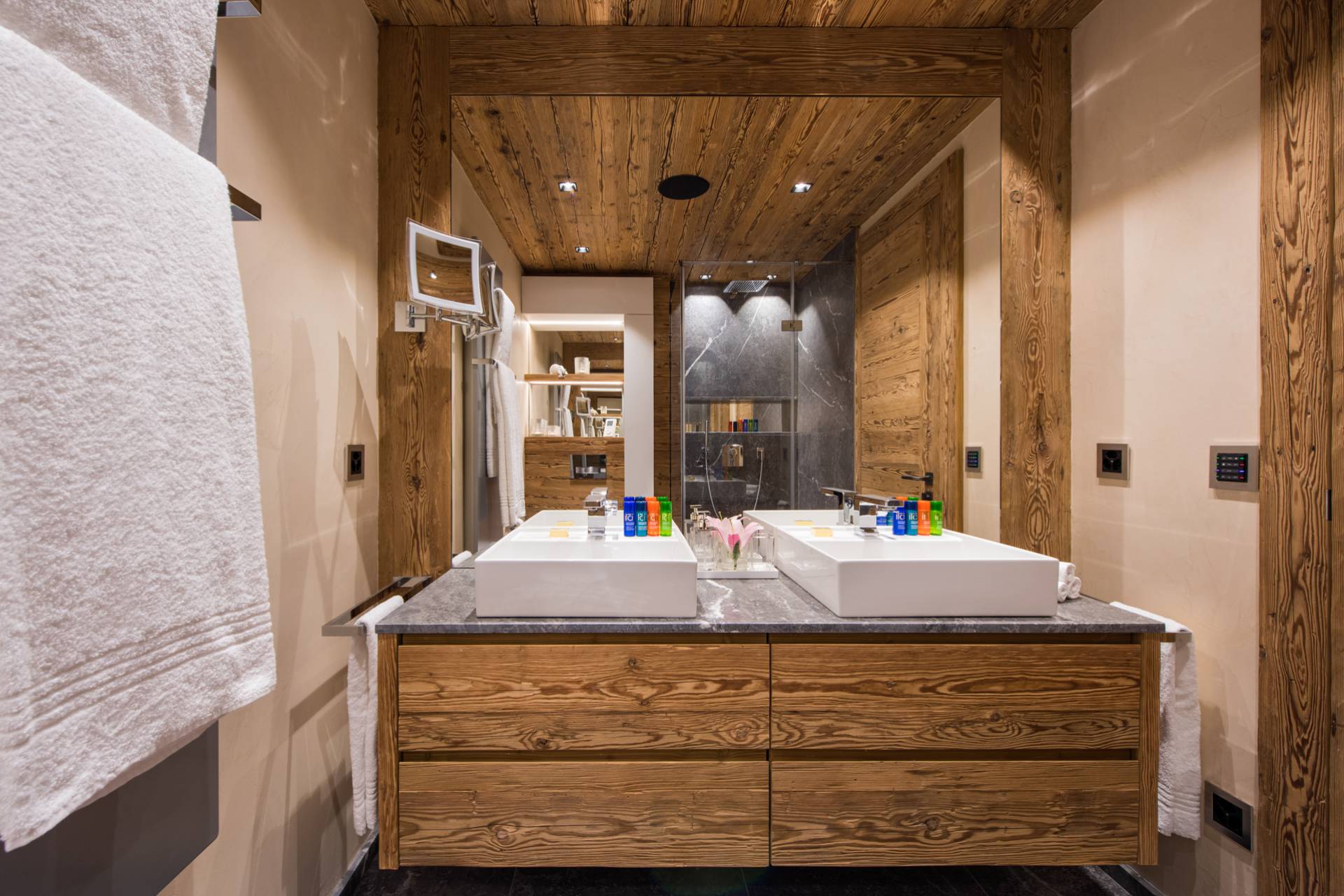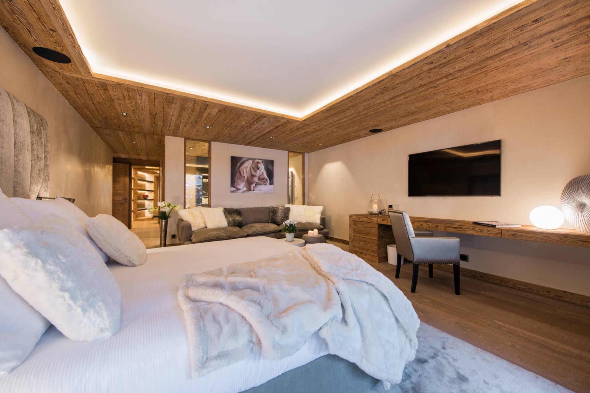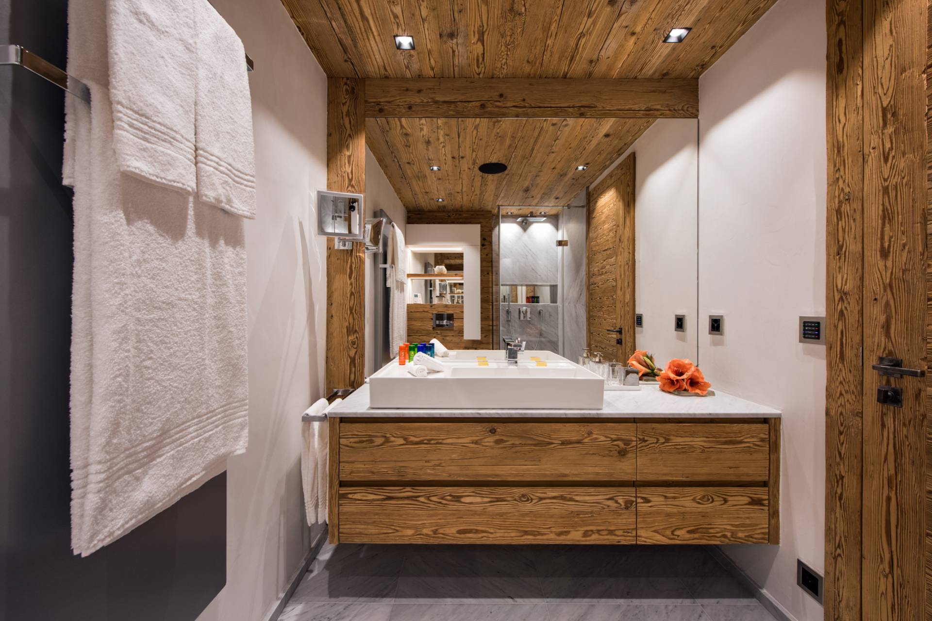 Au dernier étage, vous profiterez d’un impressionnant salon séparé de la salle à manger et de ses somptueux fauteuils en velours coloré par une cheminée centrale intégralement ouverte reposant sur une dalle de pierre. Sous une imposante charpente de bois apparente, cette pièce est un savant mélange de tradition alpine et de design contemporain. Une cuisine ouverte avec bar en inox complète la cuisine professionnelle située au rez-de-chaussée de la résidence. De très grandes baies vitrées bordent la pièce et ouvrent sur un balcon qui vous permettra de profiter de la magnifique vue sur le domaine.