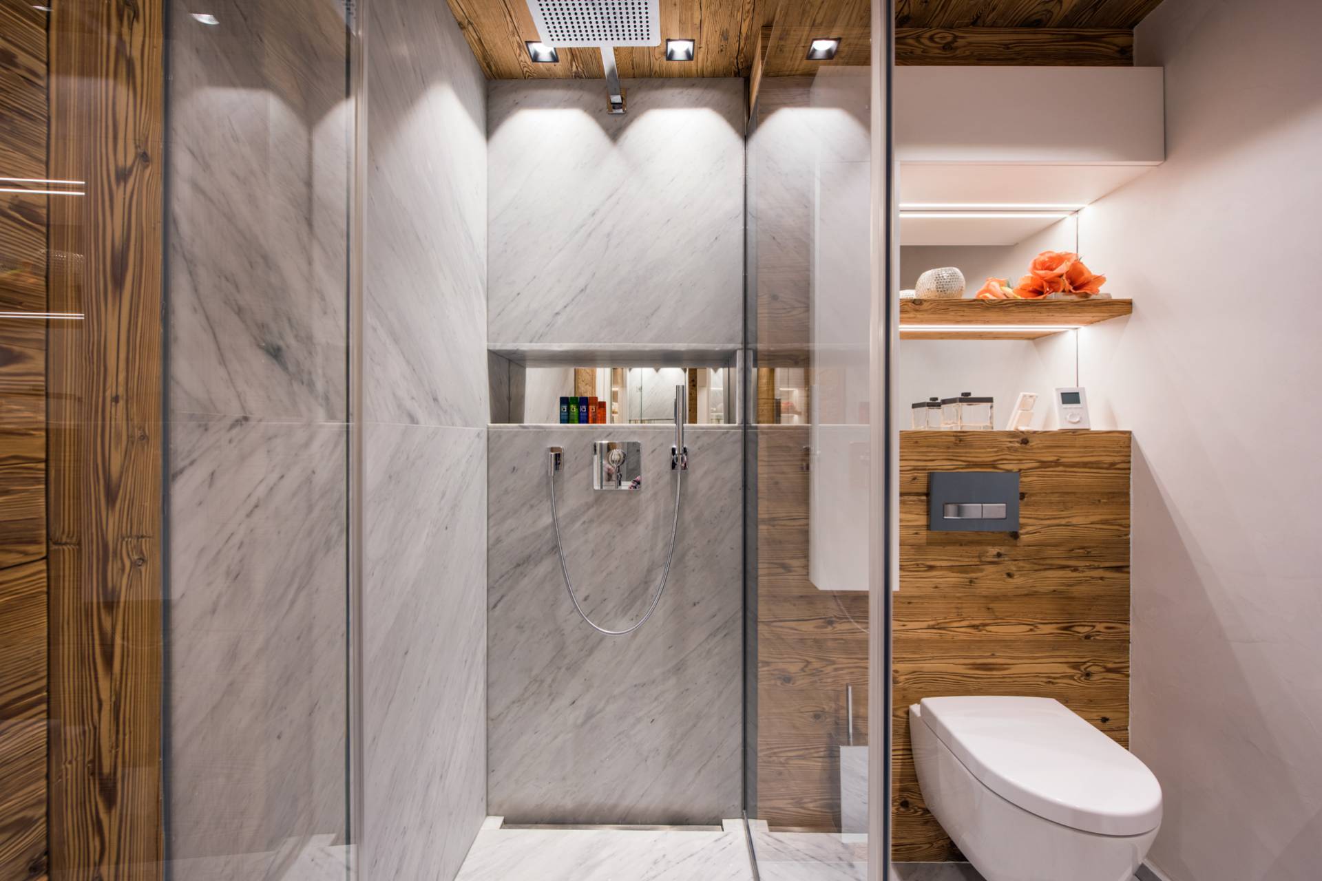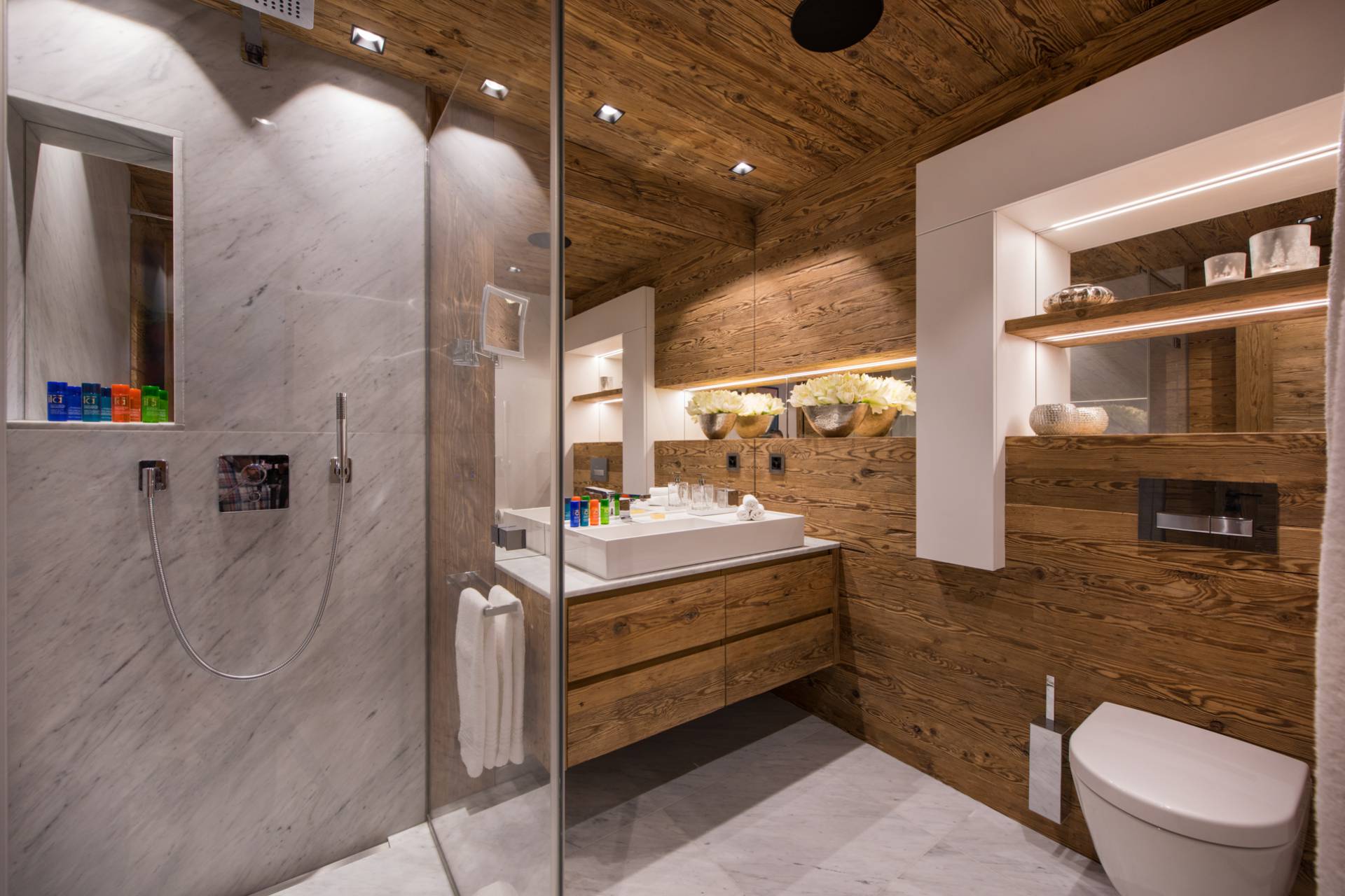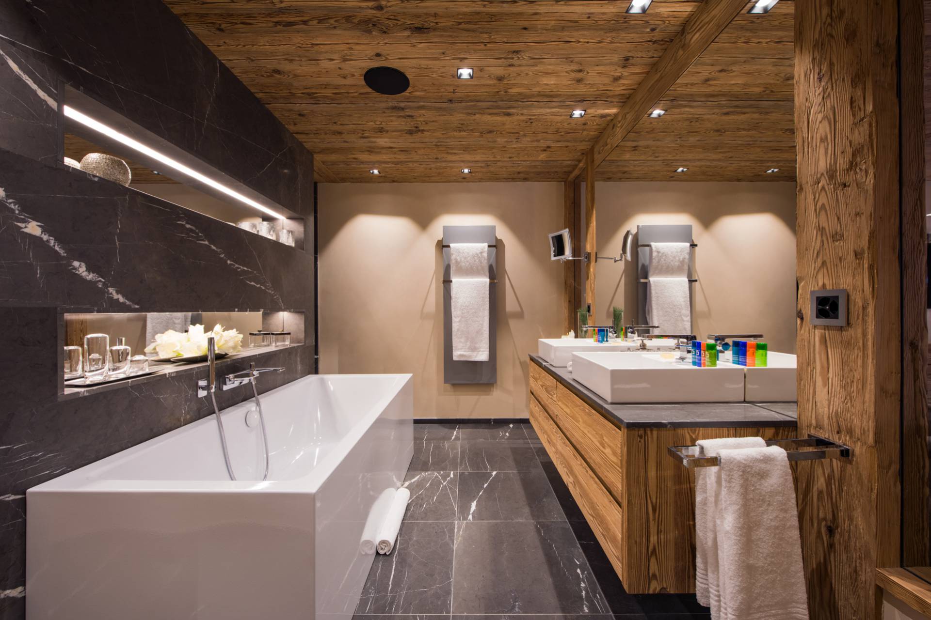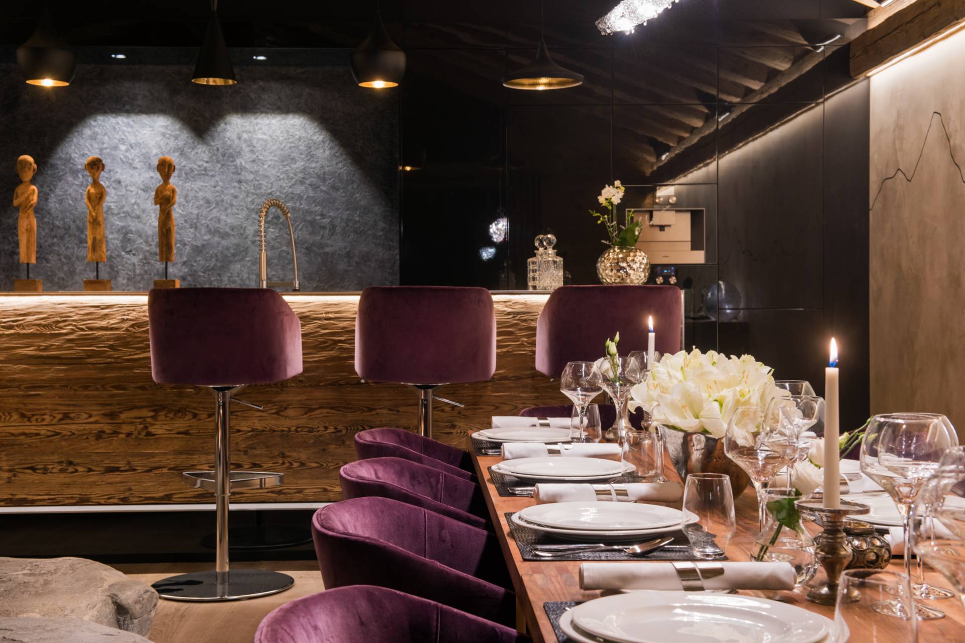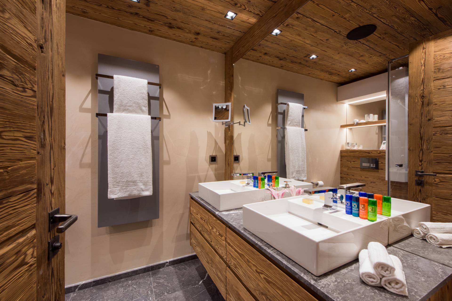 Au dernier étage, vous profiterez d’un impressionnant salon séparé de la salle à manger et de ses somptueux fauteuils en velours coloré par une cheminée centrale intégralement ouverte reposant sur une dalle de pierre. Sous une imposante charpente de bois apparente, cette pièce est un savant mélange de tradition alpine et de design contemporain. Une cuisine ouverte avec bar en inox complète la cuisine professionnelle située au rez-de-chaussée de la résidence. De très grandes baies vitrées bordent la pièce et ouvrent sur un balcon qui vous permettra de profiter de la magnifique vue sur le domaine.
