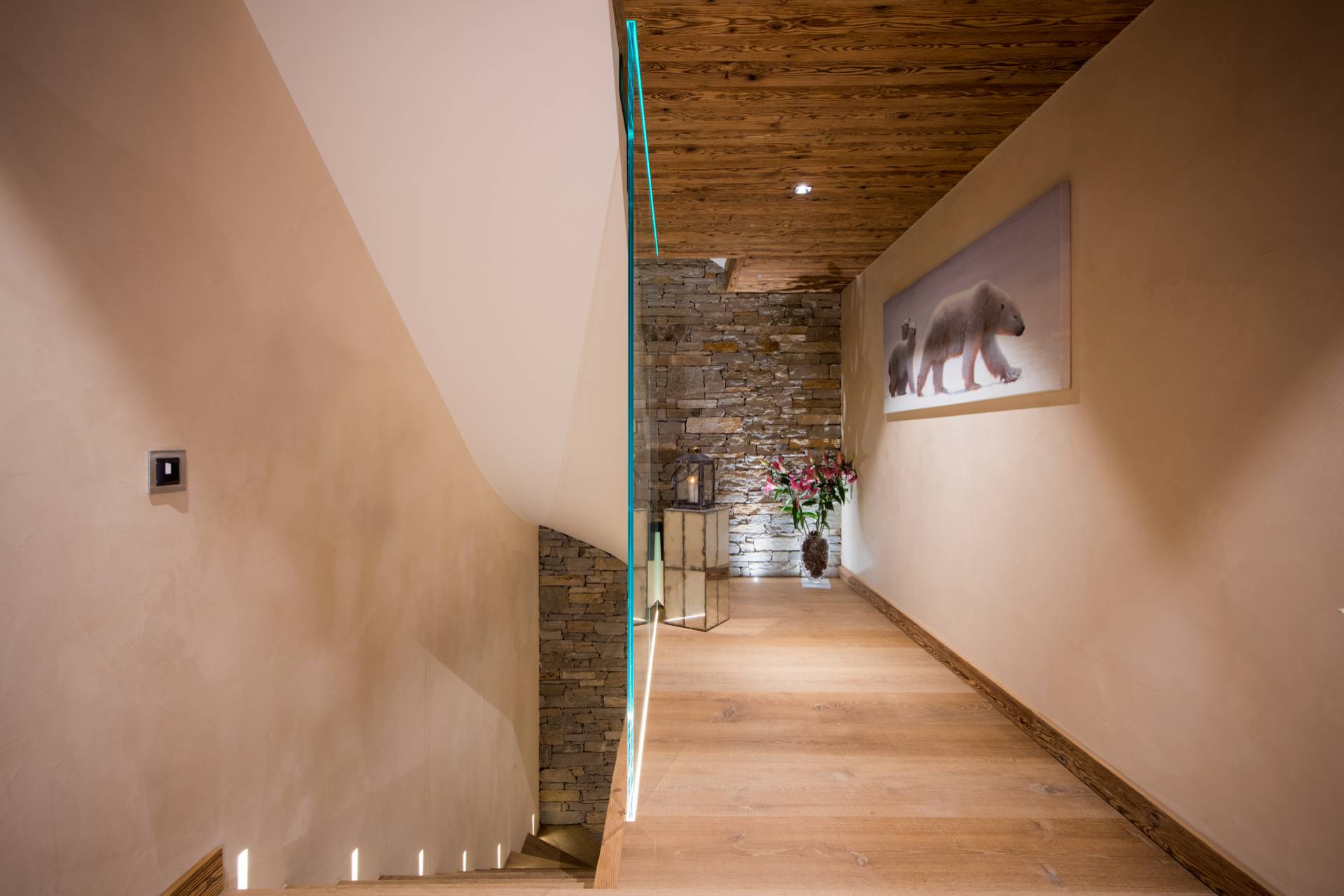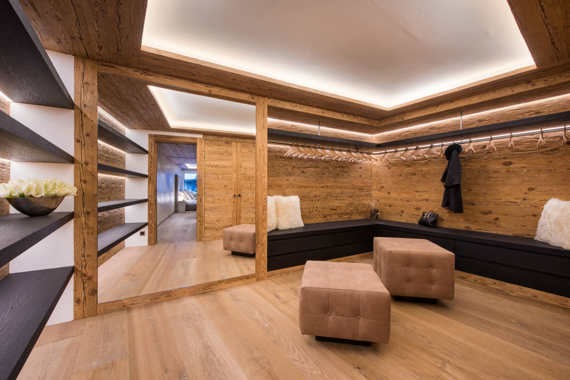 En entrant dans votre propriété, vous pourrez directement déposer votre matériel de ski dans le local privé prévu à cet effet, puis utiliser l’ascenseur pour accéder à l’ensemble des 535m² répartis sur quatre niveaux.