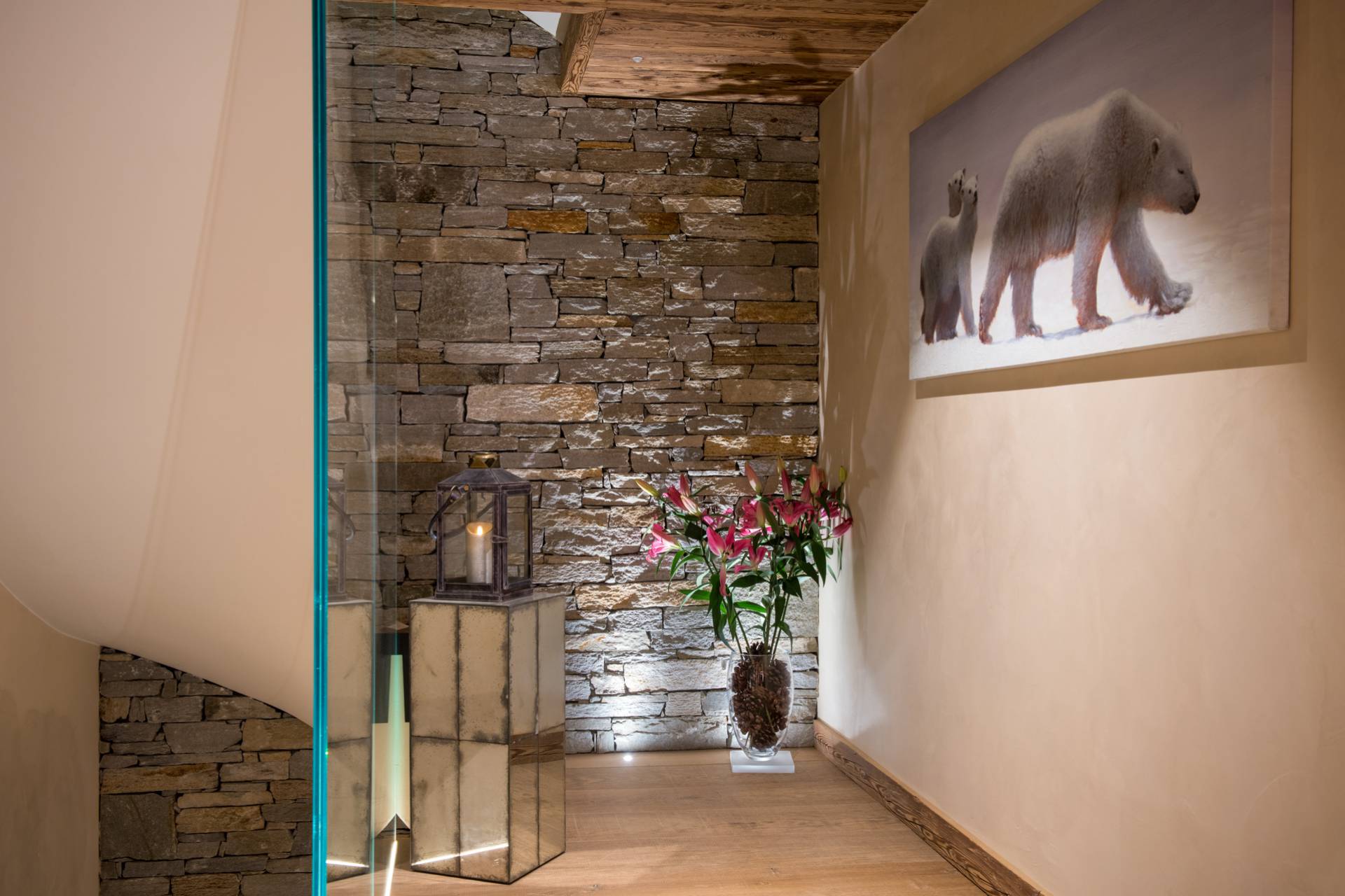 Vous devrez laisser votre voiture dans un parking privé au cœur d’un petit village alpin où les voitures sont interdites pour préserver l’aspect traditionnel du village. Une navette sera à votre disposition pour rejoindre la résidence, située à quelques minutes des remontées mécaniques. Vous arriverez dans un hall vous permettant d’accéder à une salle de sport à disposition de l’ensemble des clients, à un bar ou à votre chalet.