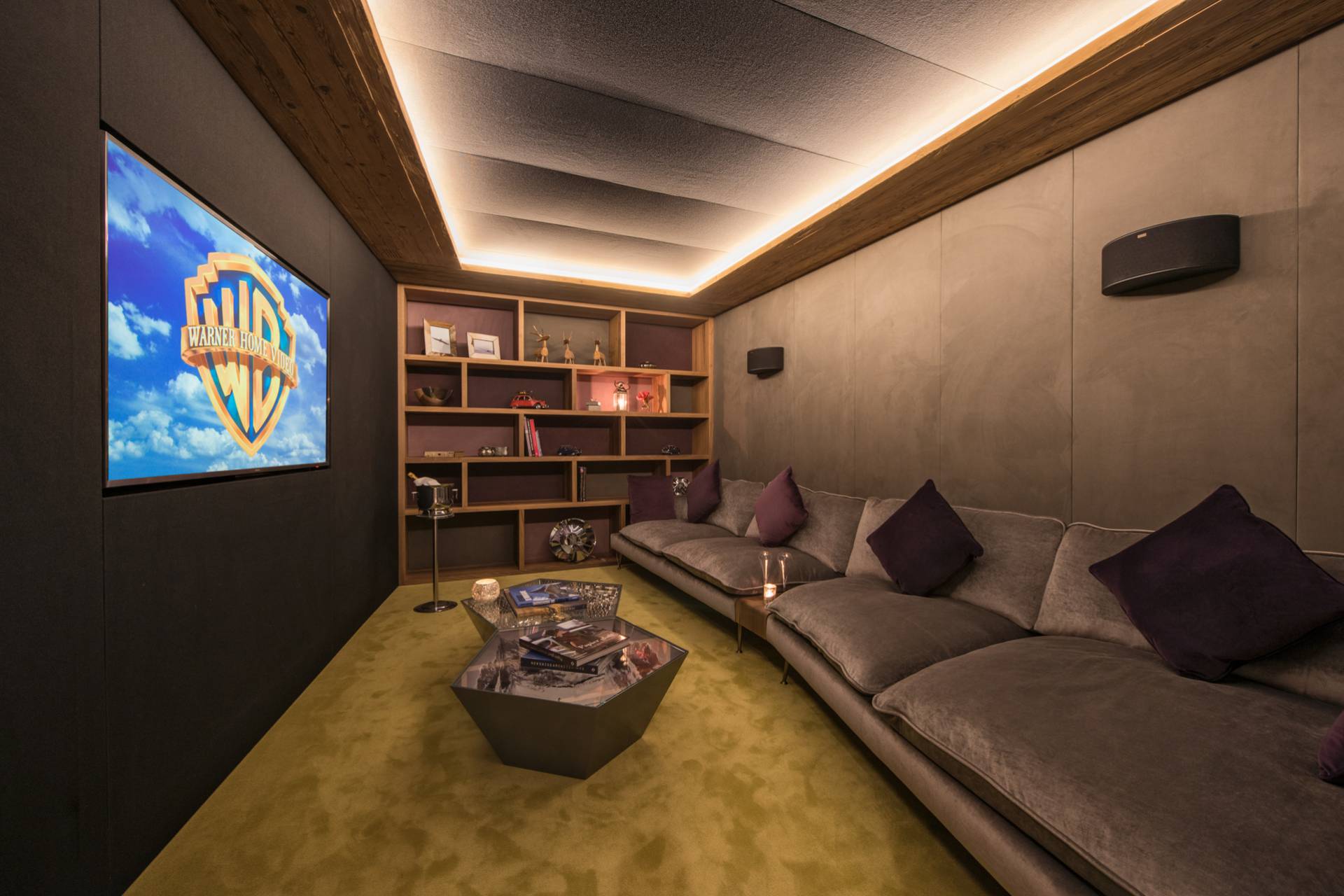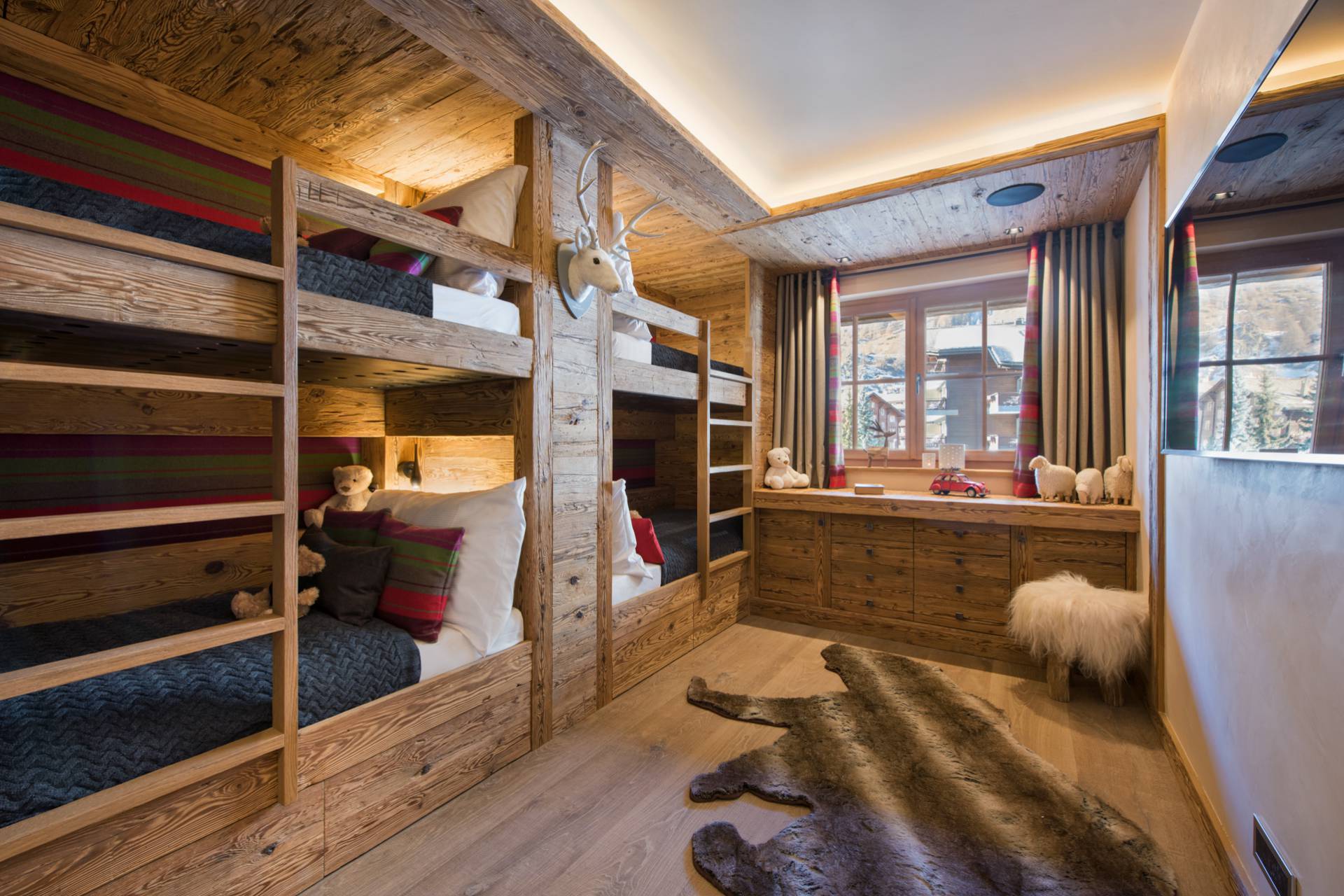 Le premier niveau abrite trois autres chambres ; deux chambres doubles modulables avec lits jumeaux et une chambre pour enfants avec quatre lits superposés. Chacune des chambres possède sa propre salle de bain spacieuse et fonctionnelle. À cet étage, vous aimerez encore vous détendre et vous divertir après une belle journée sur les pistes dans une confortable salle de cinéma.