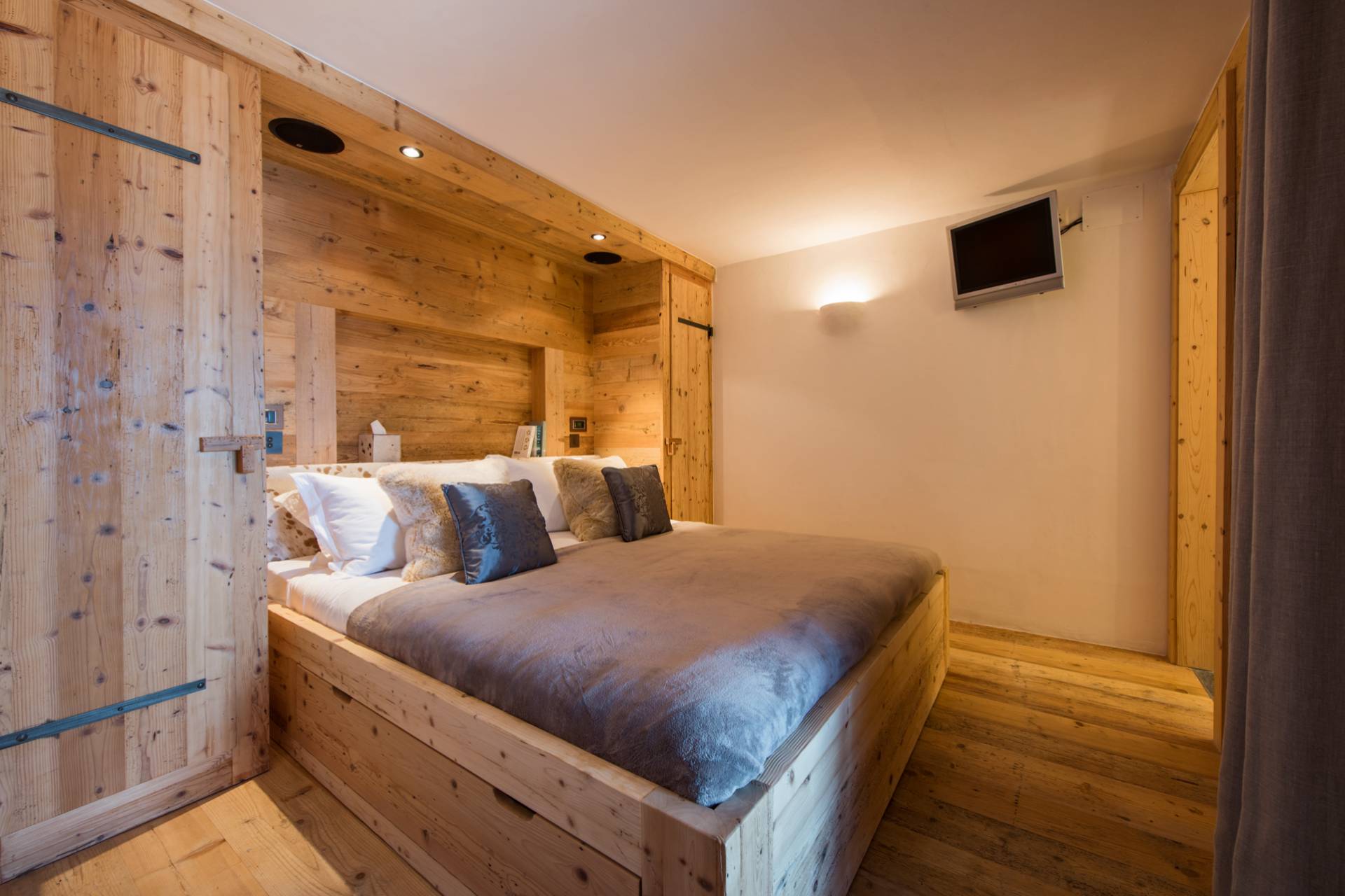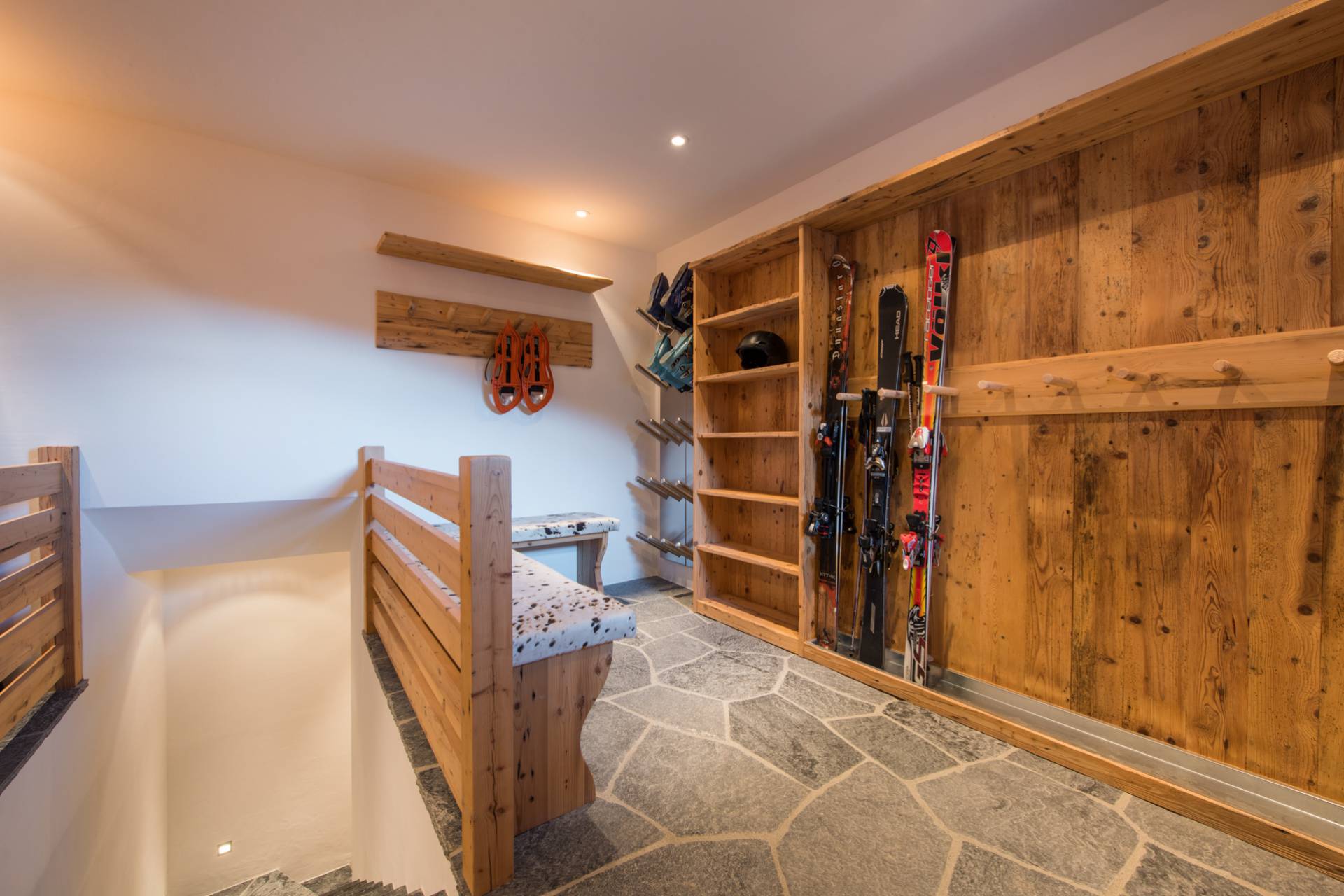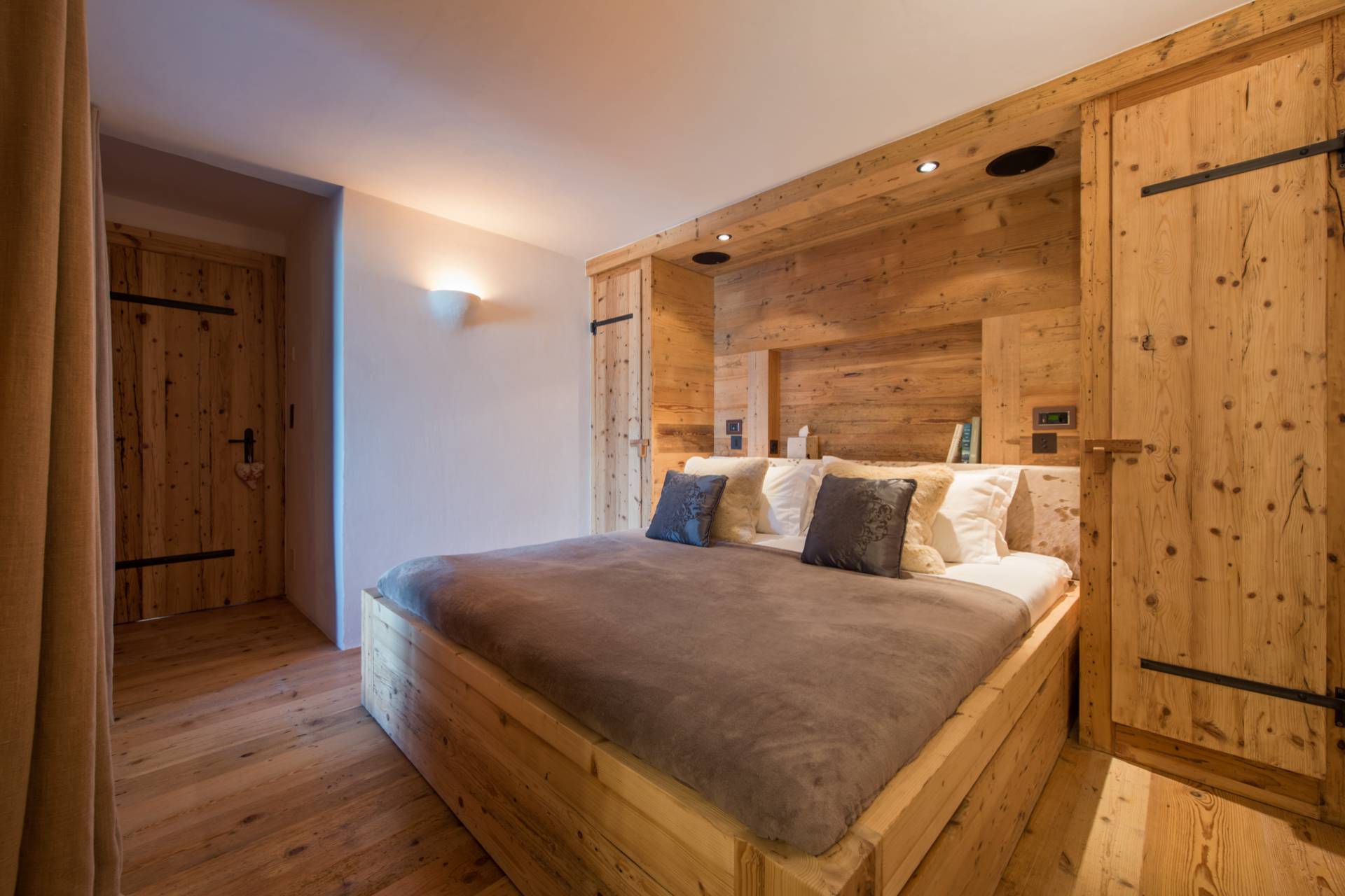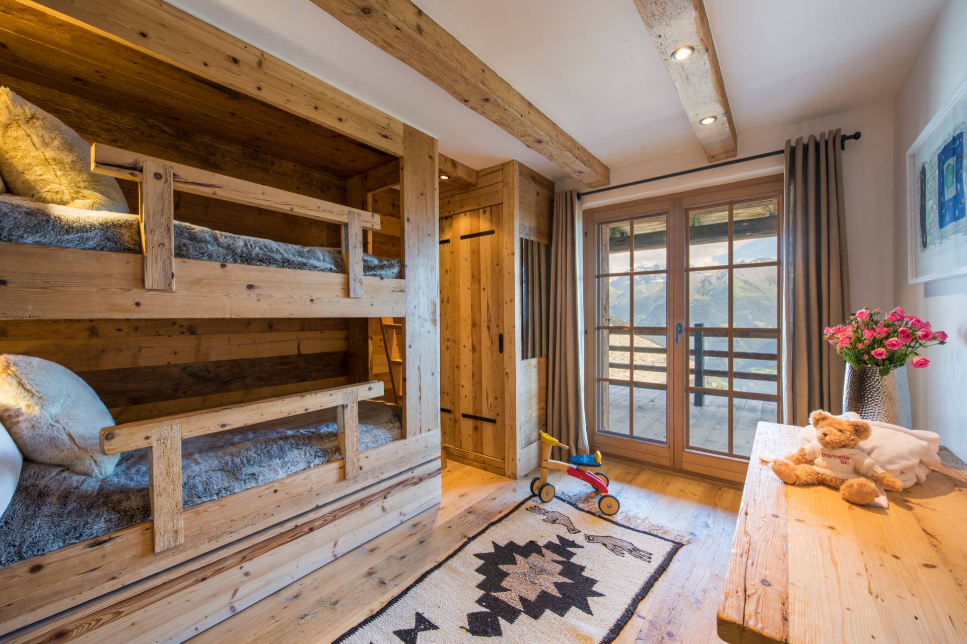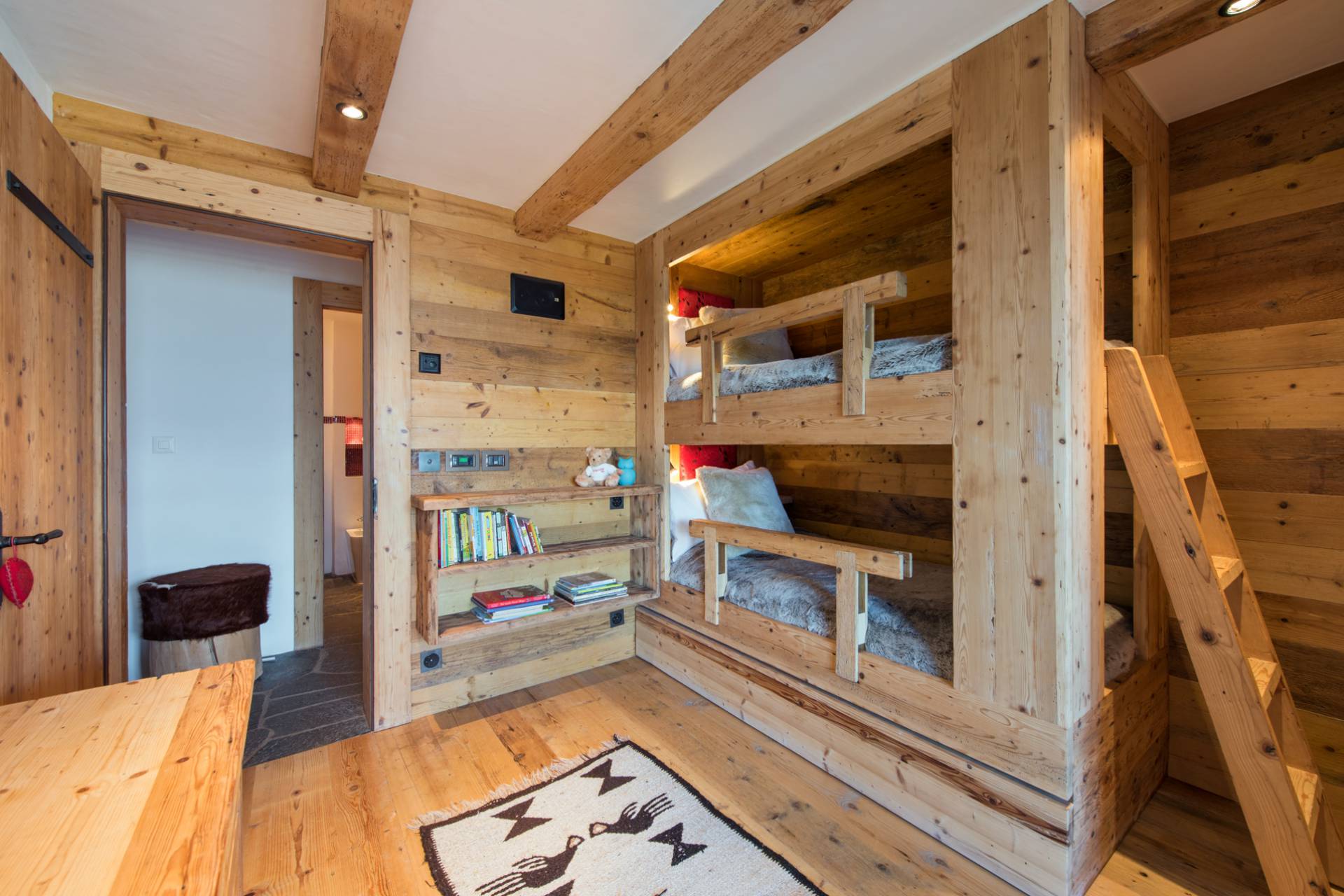 Vous trouverez aux étages supérieurs les commodités réservées aux chalets de grand luxe. Au premier étage, un local à skis est équipé de vestiaire et armoire à chaussures chauffantes tandis que les pièces mitoyennes vous offrent de vastes espaces de rangements. Le deuxième étage est destiné aux couchages. Quatre chambres se partagent l'espace dont deux doubles avec salles de bains attenantes et accès au balcon, une chambre double avec salle de douche et une chambre pour enfants avec lits superposés et accès vers une salle d'eau indépendante. Le mobilier en bois massif (lits, placards encastrés, murs lambrissés, poutres apparentes) et le travail de la ferronnerie vous rappellera le style traditionnel des chalets montagnards, revisité dans un goût ultra contemporain. Détail charmant : chaque salle de bain privée est parée de mosaïques de couleurs différentes et confère à chaque chambre son atmosphère particulière.
