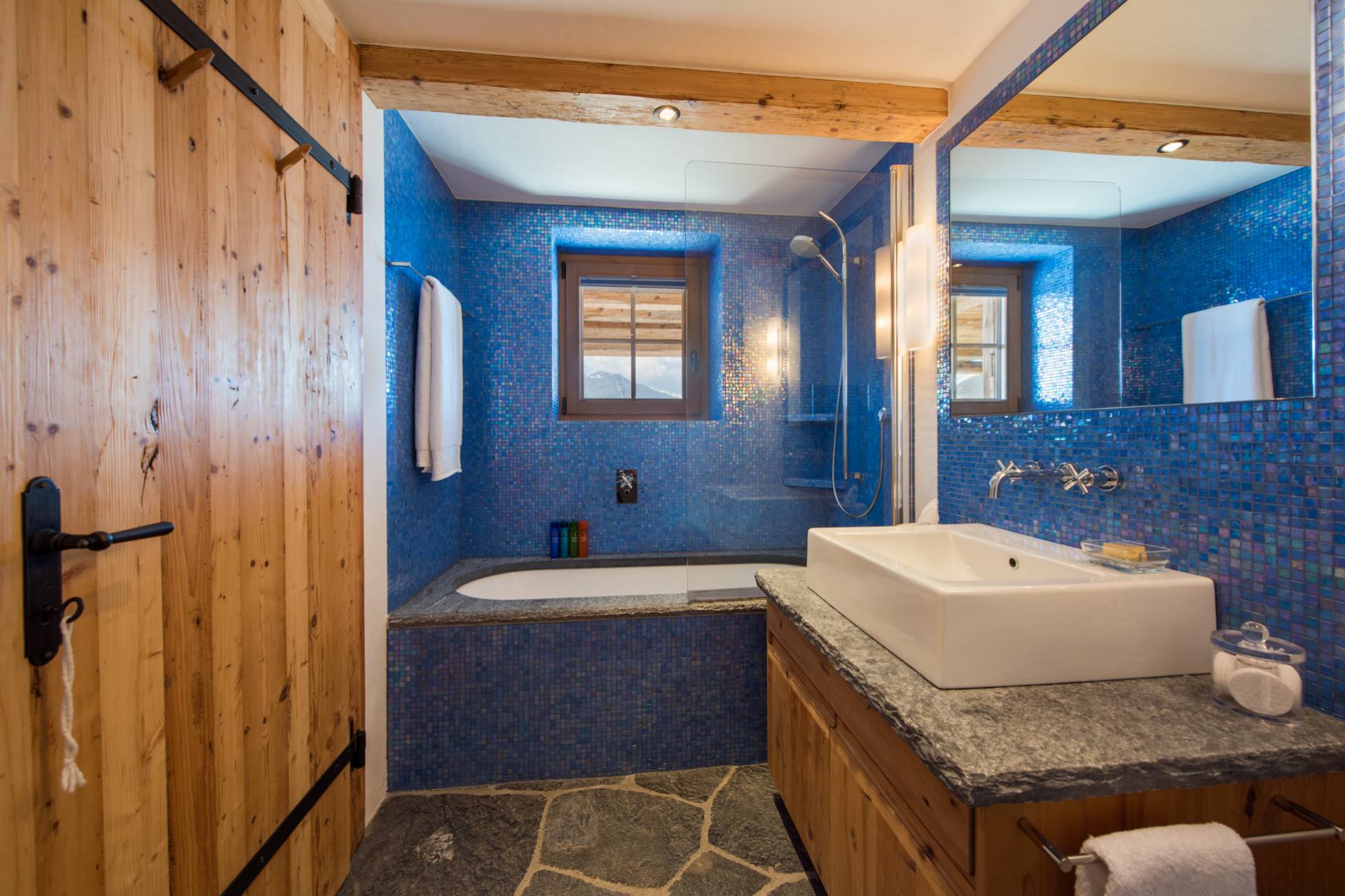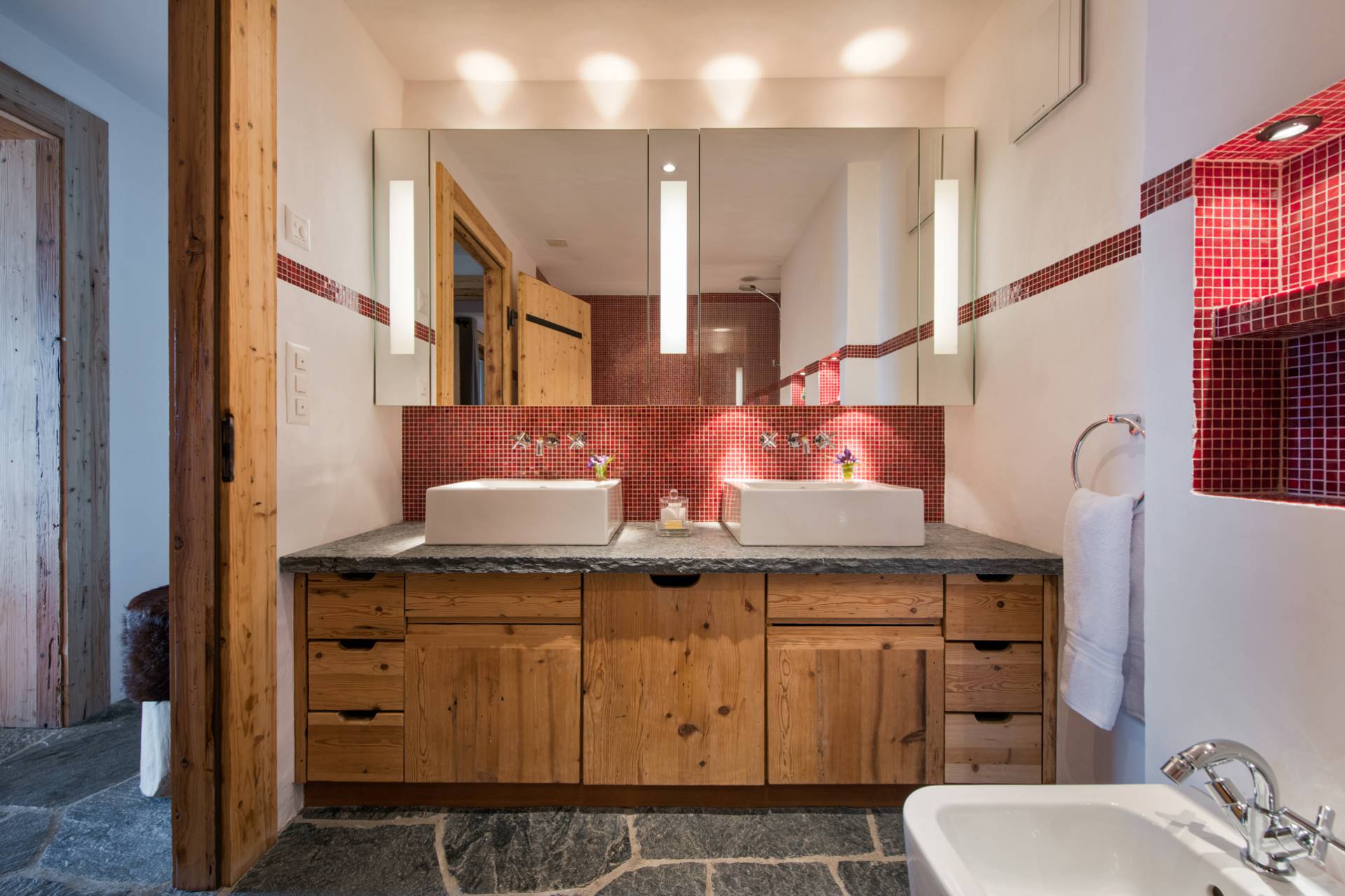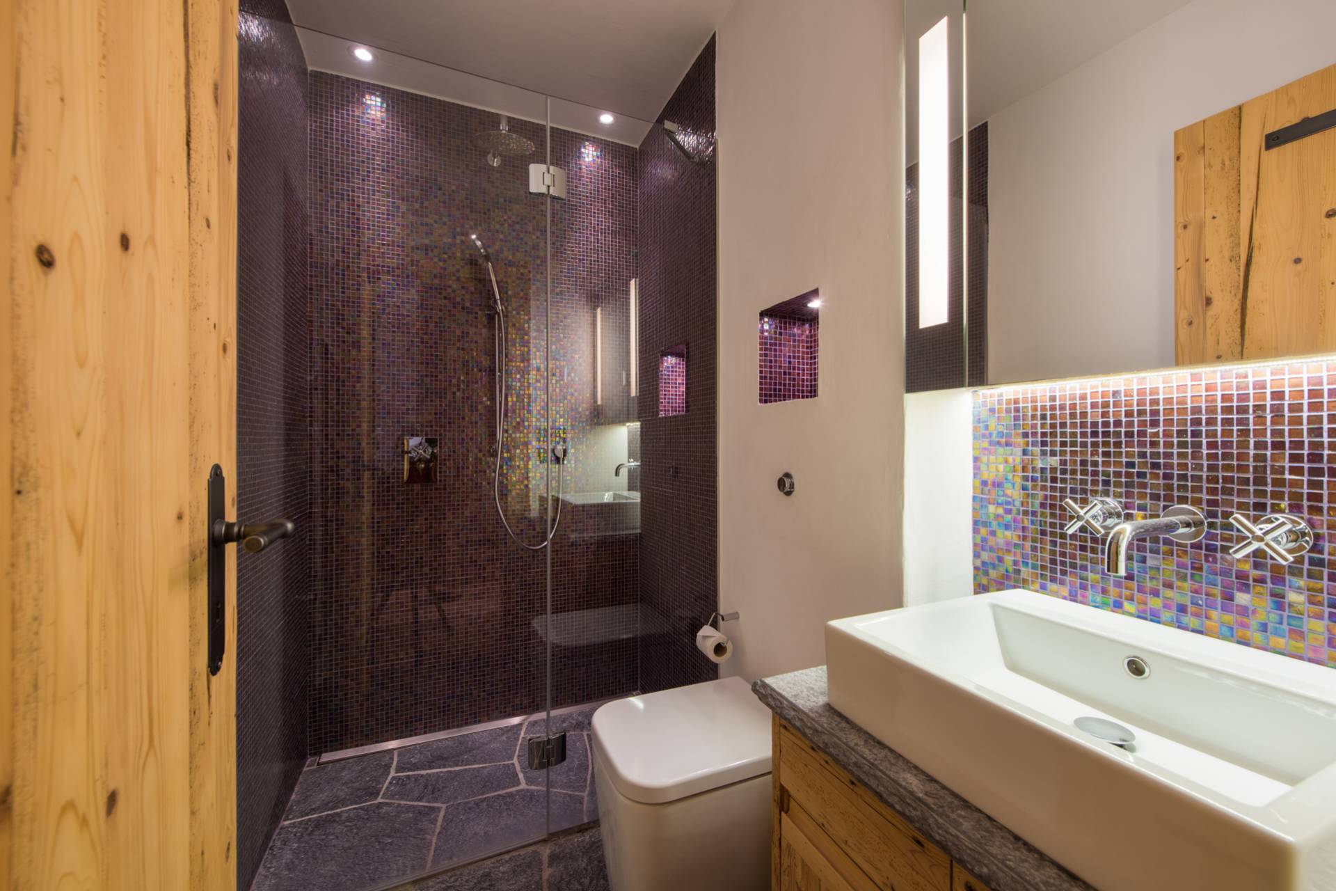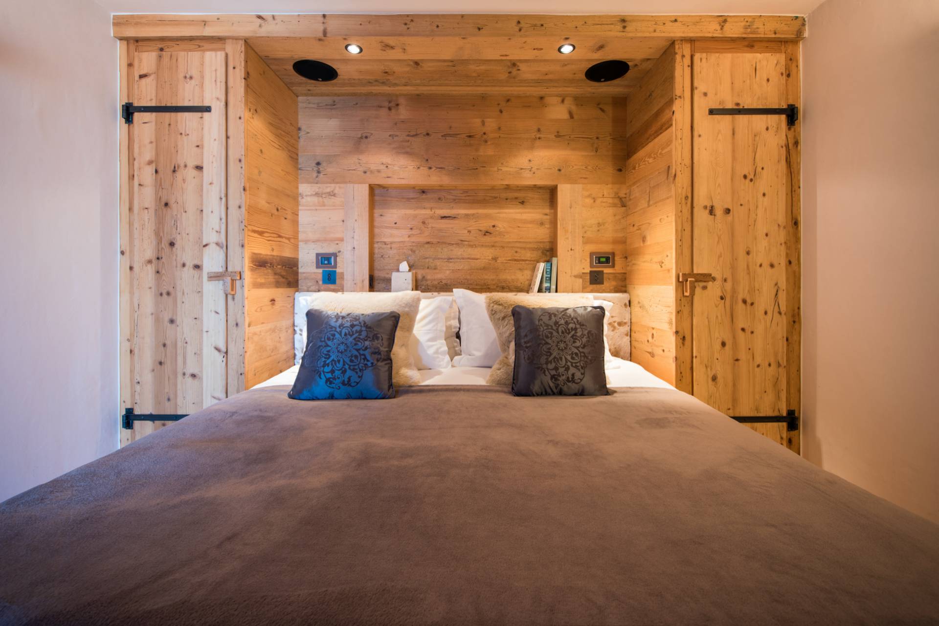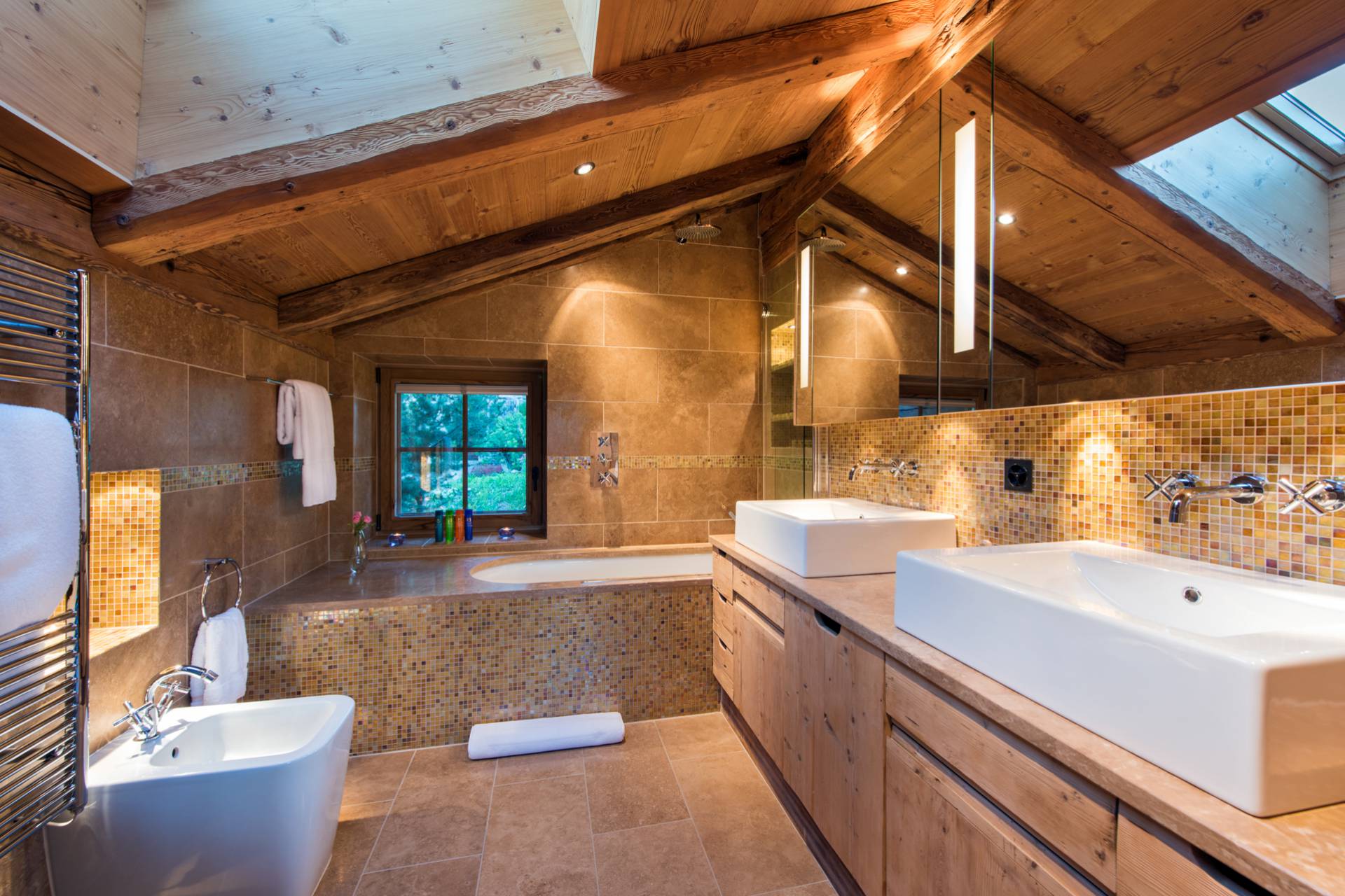 Vous trouverez aux étages supérieurs les commodités réservées aux chalets de grand luxe. Au premier étage, un local à skis est équipé de vestiaire et armoire à chaussures chauffantes tandis que les pièces mitoyennes vous offrent de vastes espaces de rangements. Le deuxième étage est destiné aux couchages. Quatre chambres se partagent l'espace dont deux doubles avec salles de bains attenantes et accès au balcon, une chambre double avec salle de douche et une chambre pour enfants avec lits superposés et accès vers une salle d'eau indépendante. Le mobilier en bois massif (lits, placards encastrés, murs lambrissés, poutres apparentes) et le travail de la ferronnerie vous rappellera le style traditionnel des chalets montagnards, revisité dans un goût ultra contemporain. Détail charmant : chaque salle de bain privée est parée de mosaïques de couleurs différentes et confère à chaque chambre son atmosphère particulière.