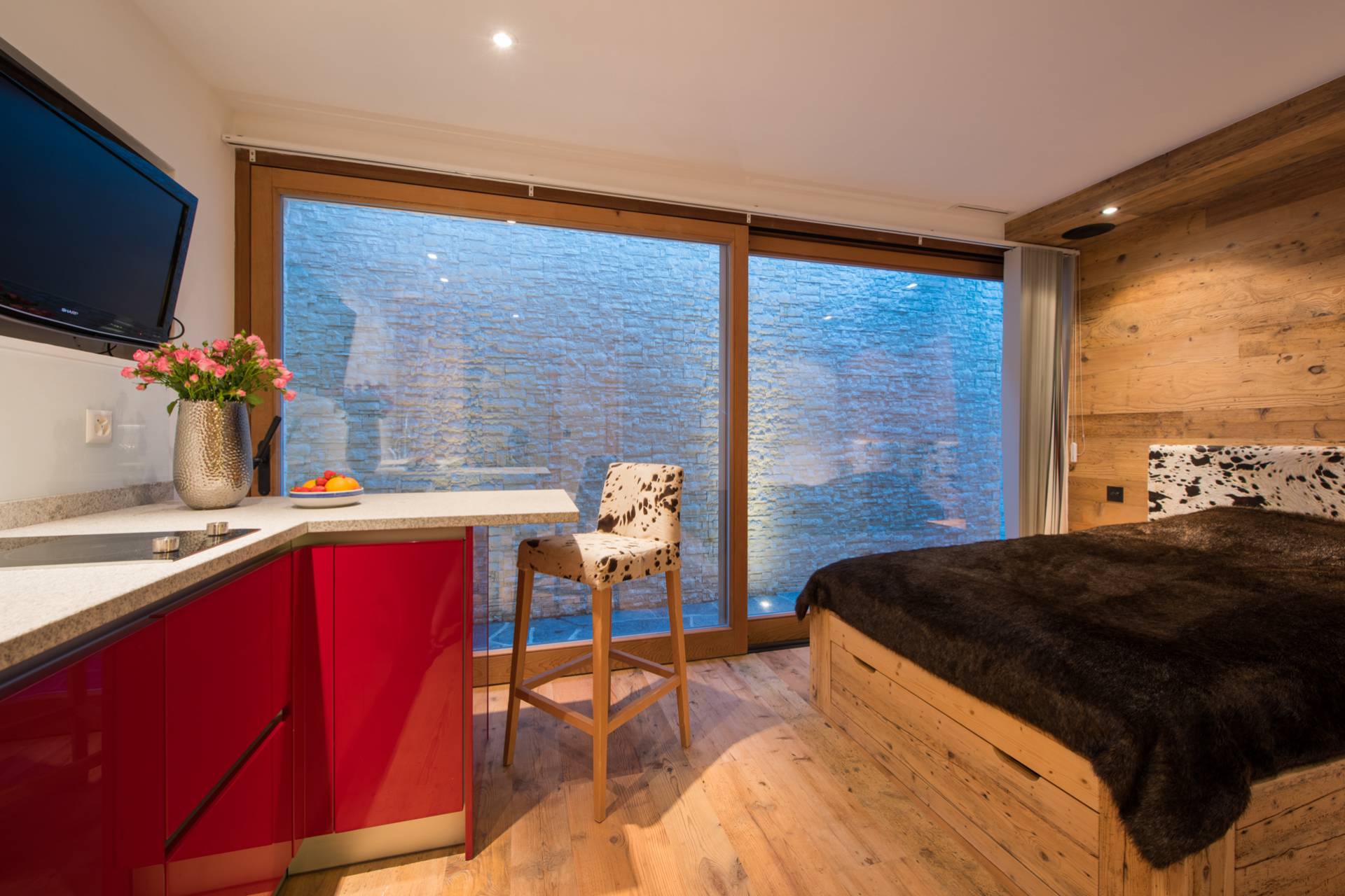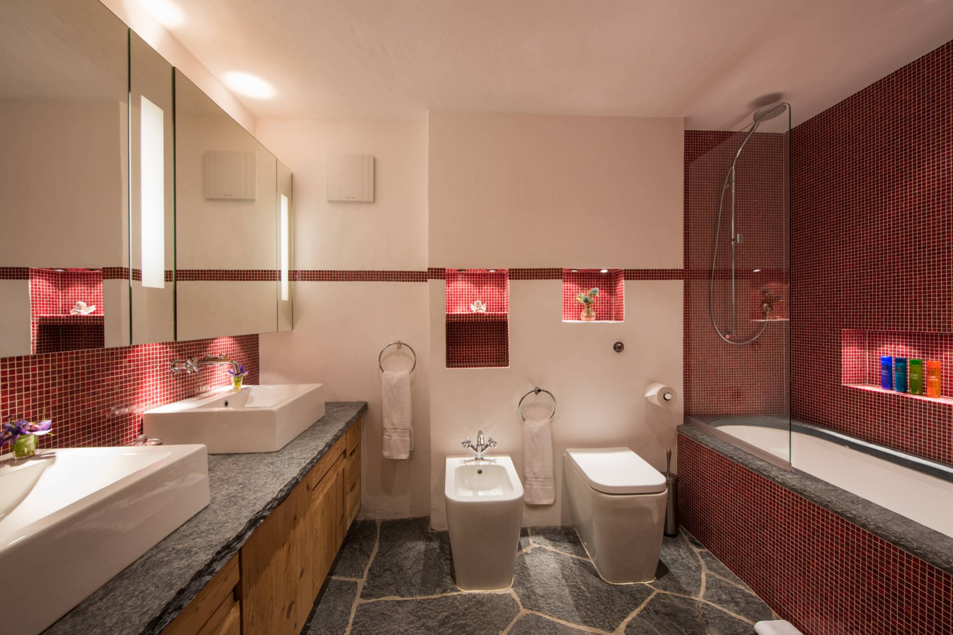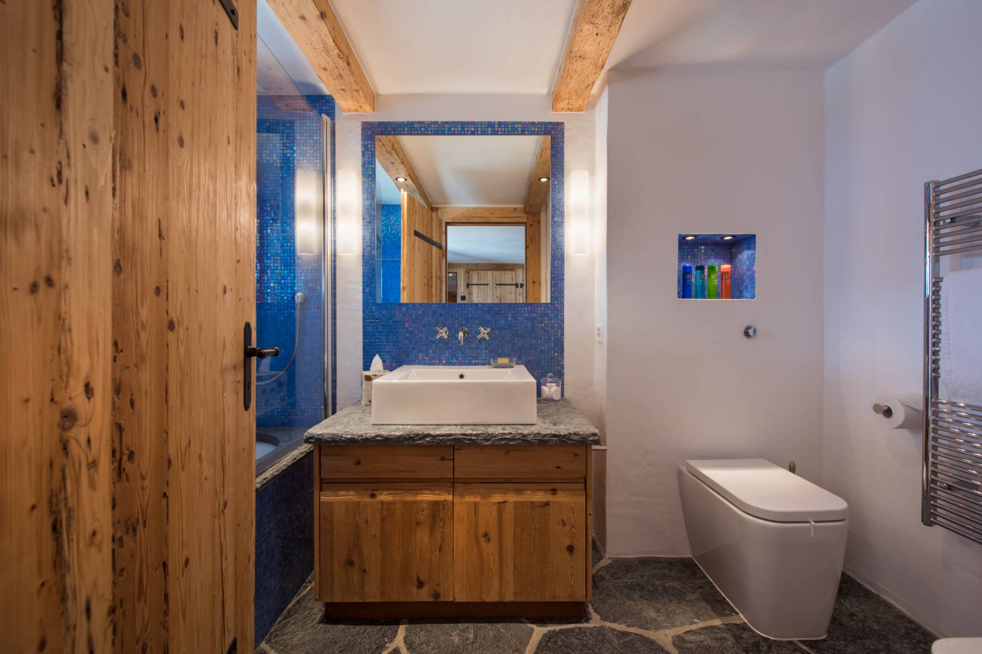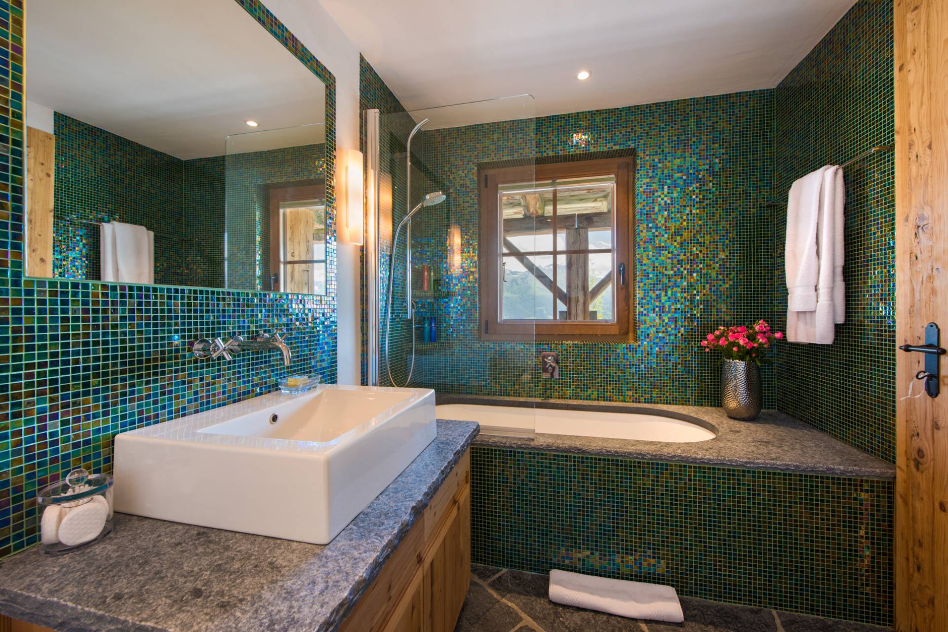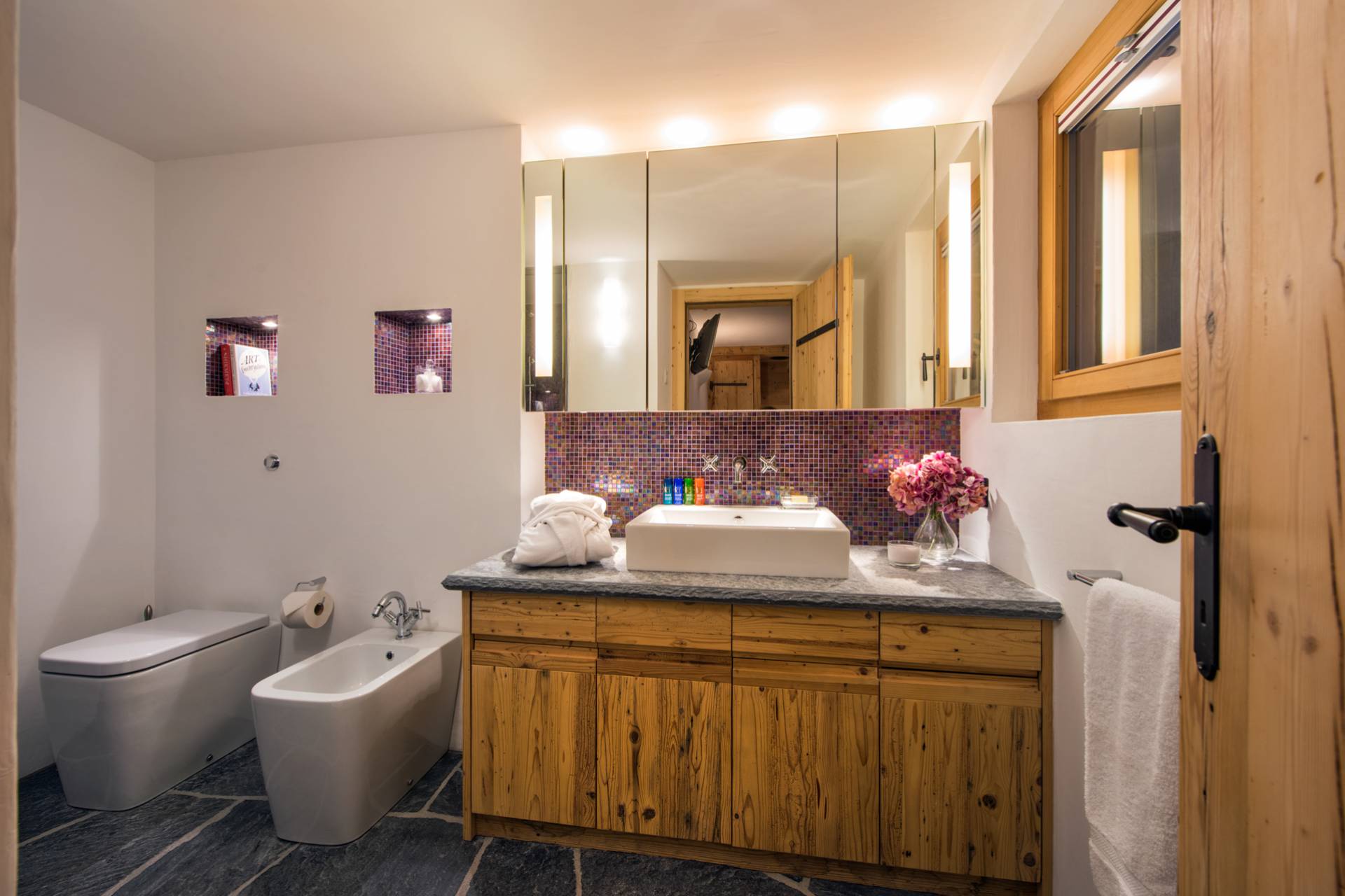 Vous trouverez aux étages supérieurs les commodités réservées aux chalets de grand luxe. Au premier étage, un local à skis est équipé de vestiaire et armoire à chaussures chauffantes tandis que les pièces mitoyennes vous offrent de vastes espaces de rangements. Le deuxième étage est destiné aux couchages. Quatre chambres se partagent l'espace dont deux doubles avec salles de bains attenantes et accès au balcon, une chambre double avec salle de douche et une chambre pour enfants avec lits superposés et accès vers une salle d'eau indépendante. Le mobilier en bois massif (lits, placards encastrés, murs lambrissés, poutres apparentes) et le travail de la ferronnerie vous rappellera le style traditionnel des chalets montagnards, revisité dans un goût ultra contemporain. Détail charmant : chaque salle de bain privée est parée de mosaïques de couleurs différentes et confère à chaque chambre son atmosphère particulière.