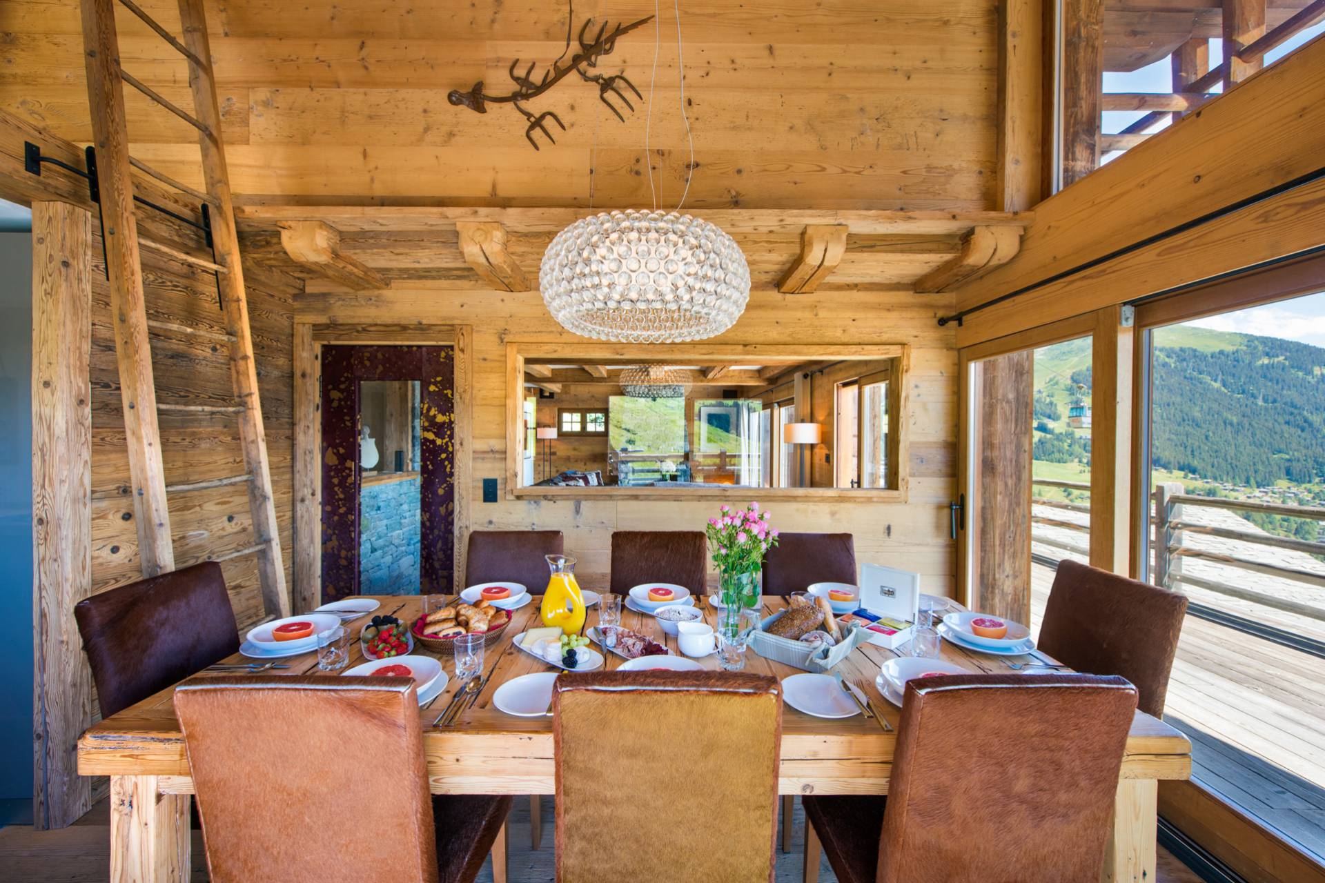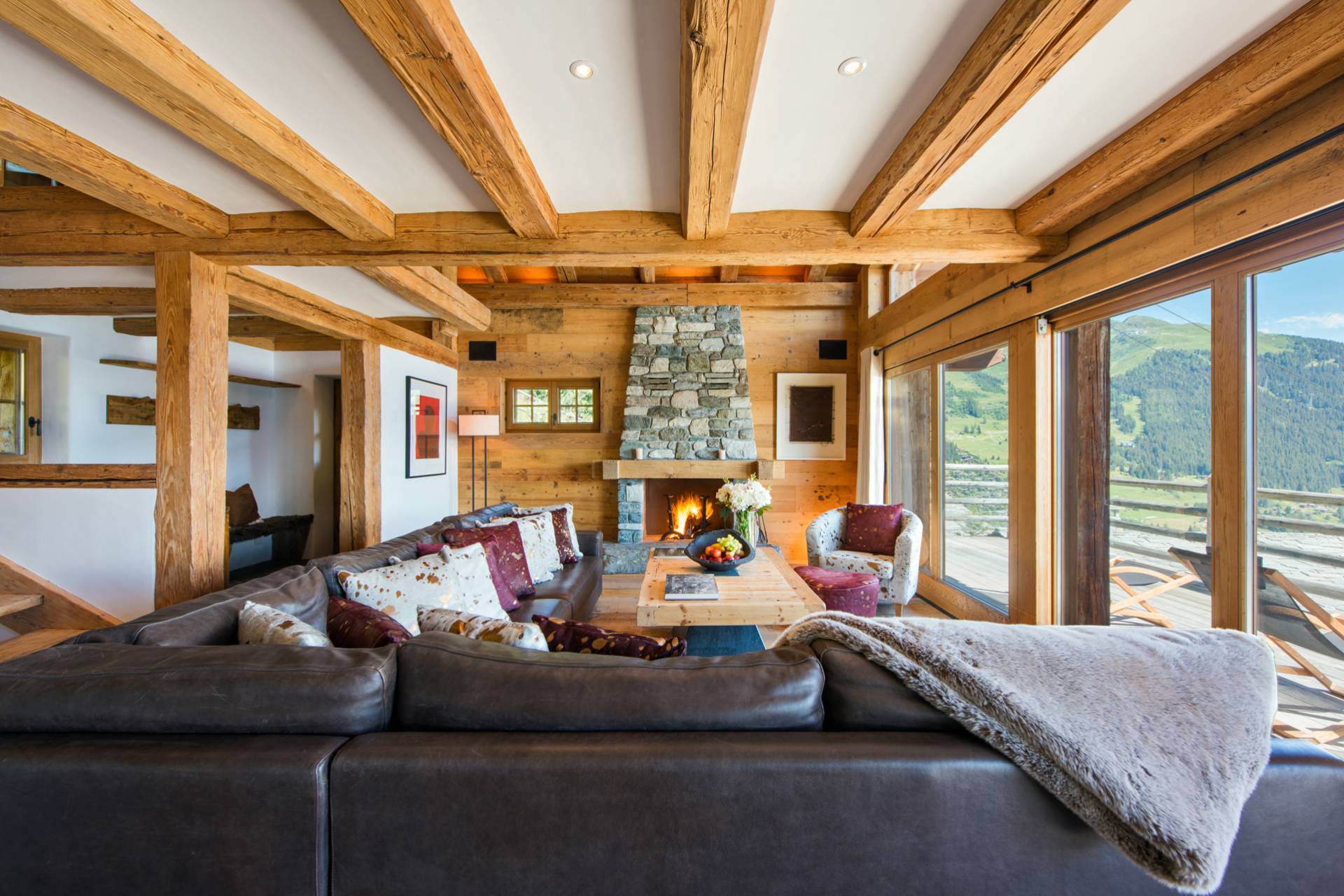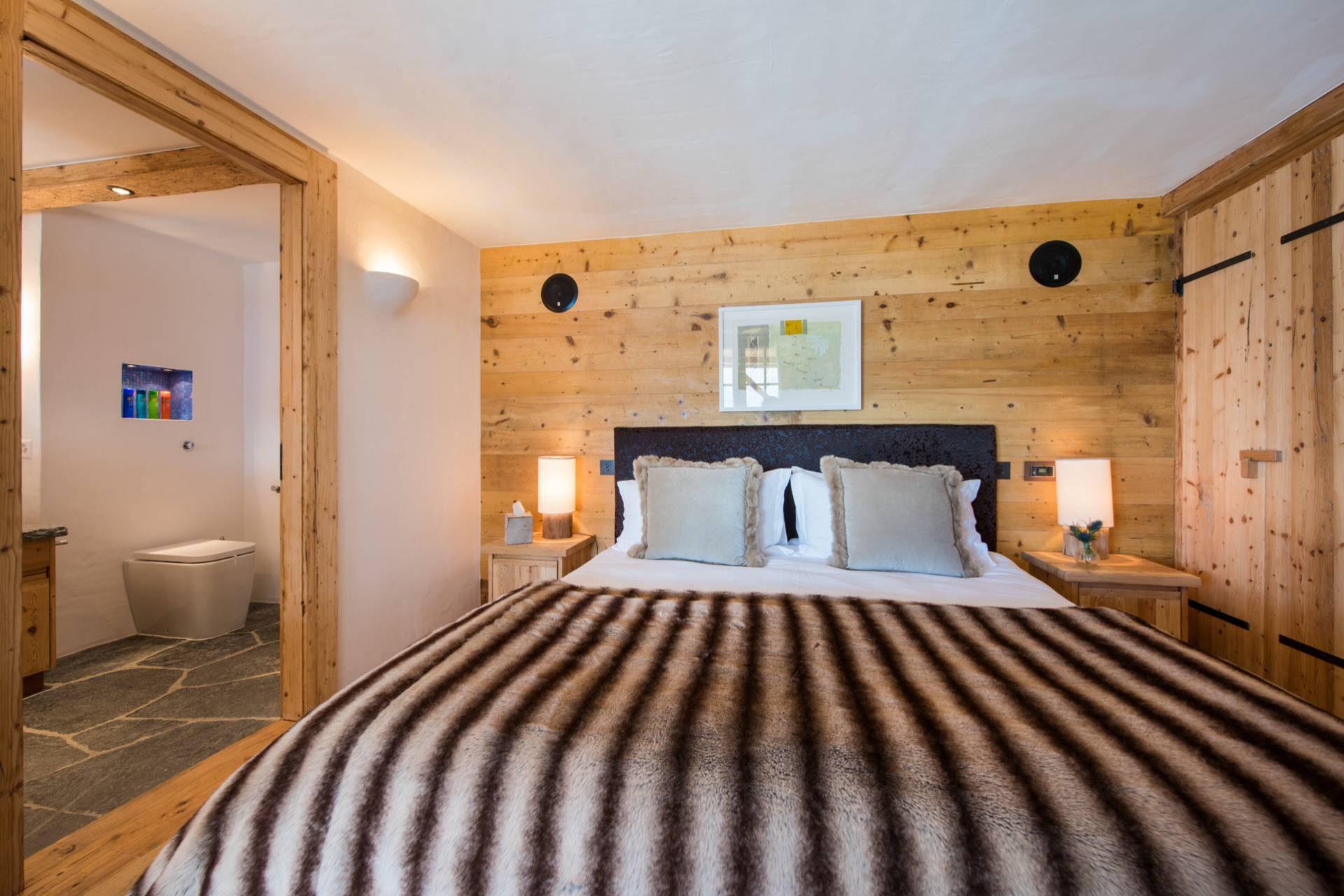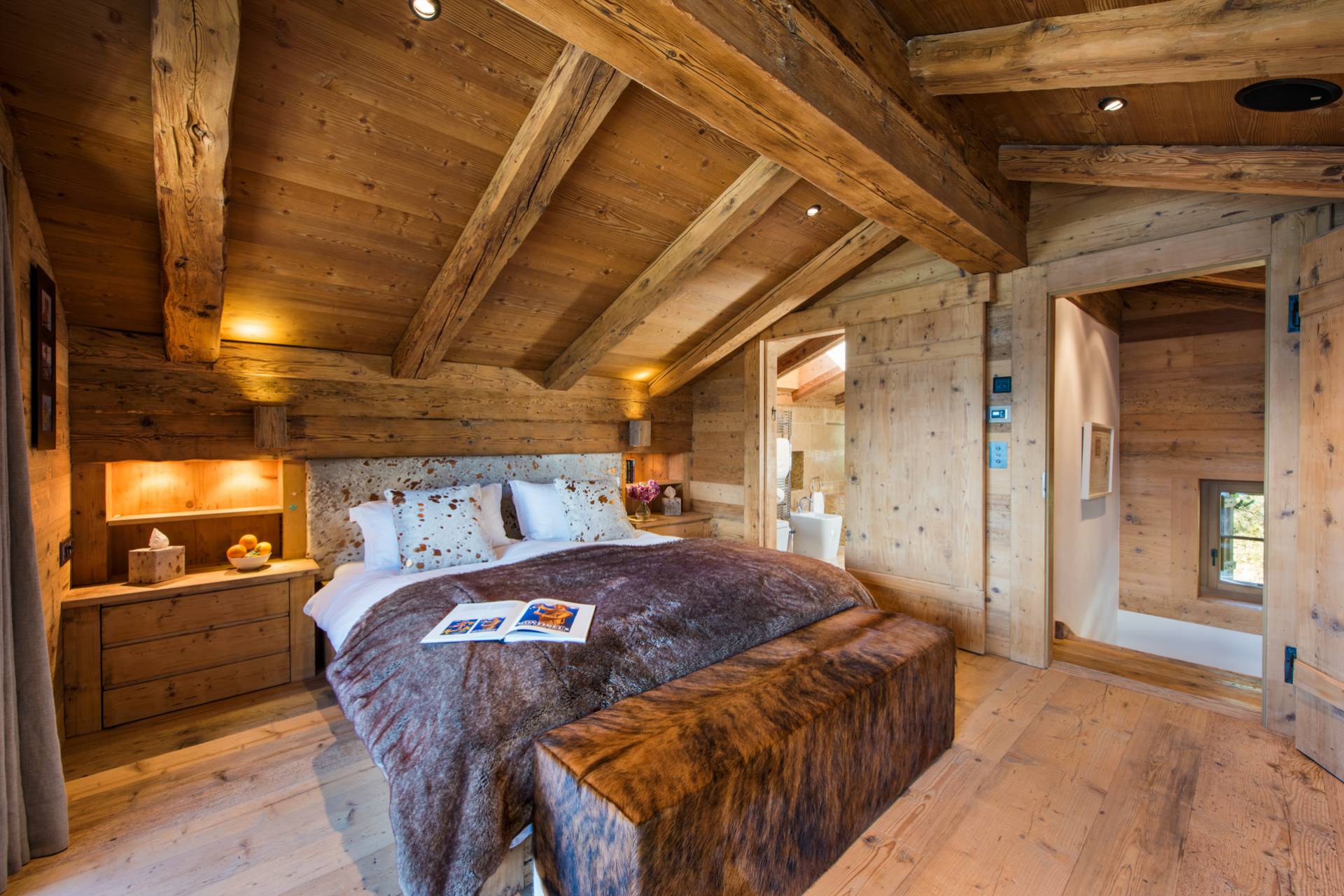 Au dernier étage se situent les espaces de vie commune et la suite parentale. Dans le vaste salon au coin de la cheminée de pierre, vous apprécierez la décoration qui associe matériaux bruts et objets de la culture paysanne aux lignes modernes des canapés et des grandes baies vitrées qui ouvrent sur la terrasse avec vue sur le paysage spectaculaire. L'ambiance intimiste et le caractère de cette somptueuse propriété émanent surtout de l'omniprésence du cuir et du remarquable travail de maroquinerie des canapés, fauteuils, sièges en peau retournée et bancs qui meublent l'ensemble du chalet. Côté salle à manger, la table rectangulaire peut réunir une dizaine de convives, tout près de la grande cuisine moderne parfaitement équipée et pourvue d’un superbe plan de travail en marbre où vous pourrez préparer vos repas. Quant à la suite parentale, directement sous la charpente, elle dispose d'un lit King size réchauffé par une épaisse couverture soyeuse, d'une spacieuse salle de bain éclairée à la lumière zénithale et d'un balcon privé.
