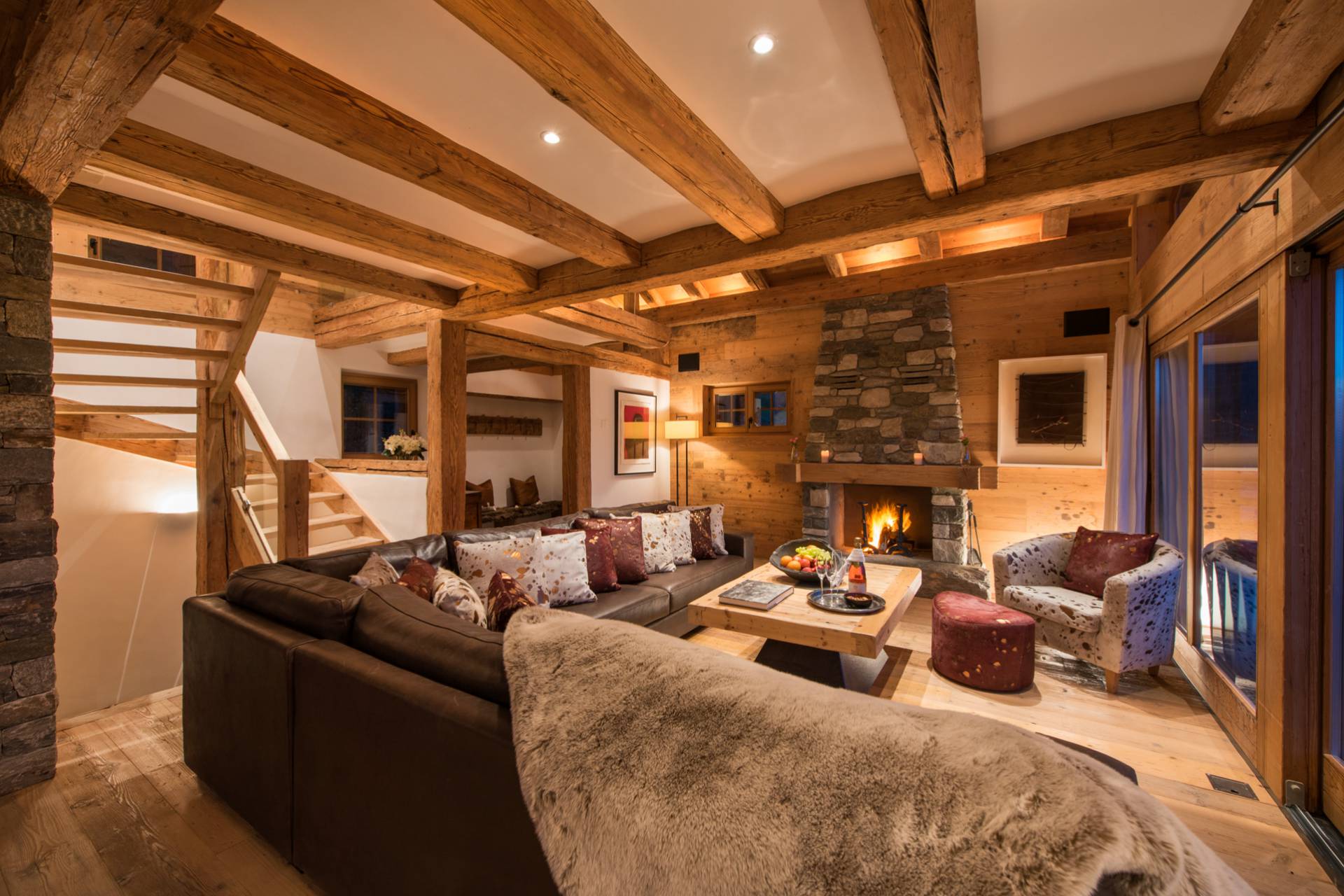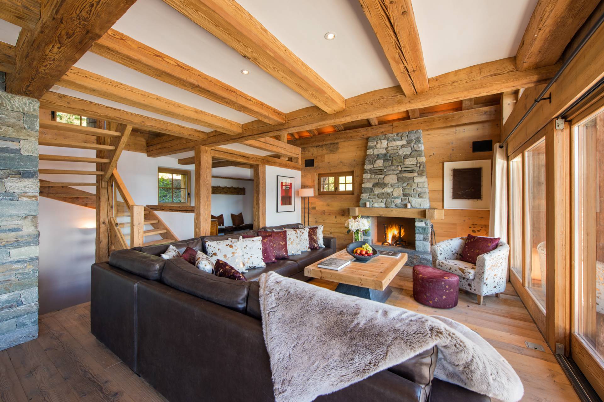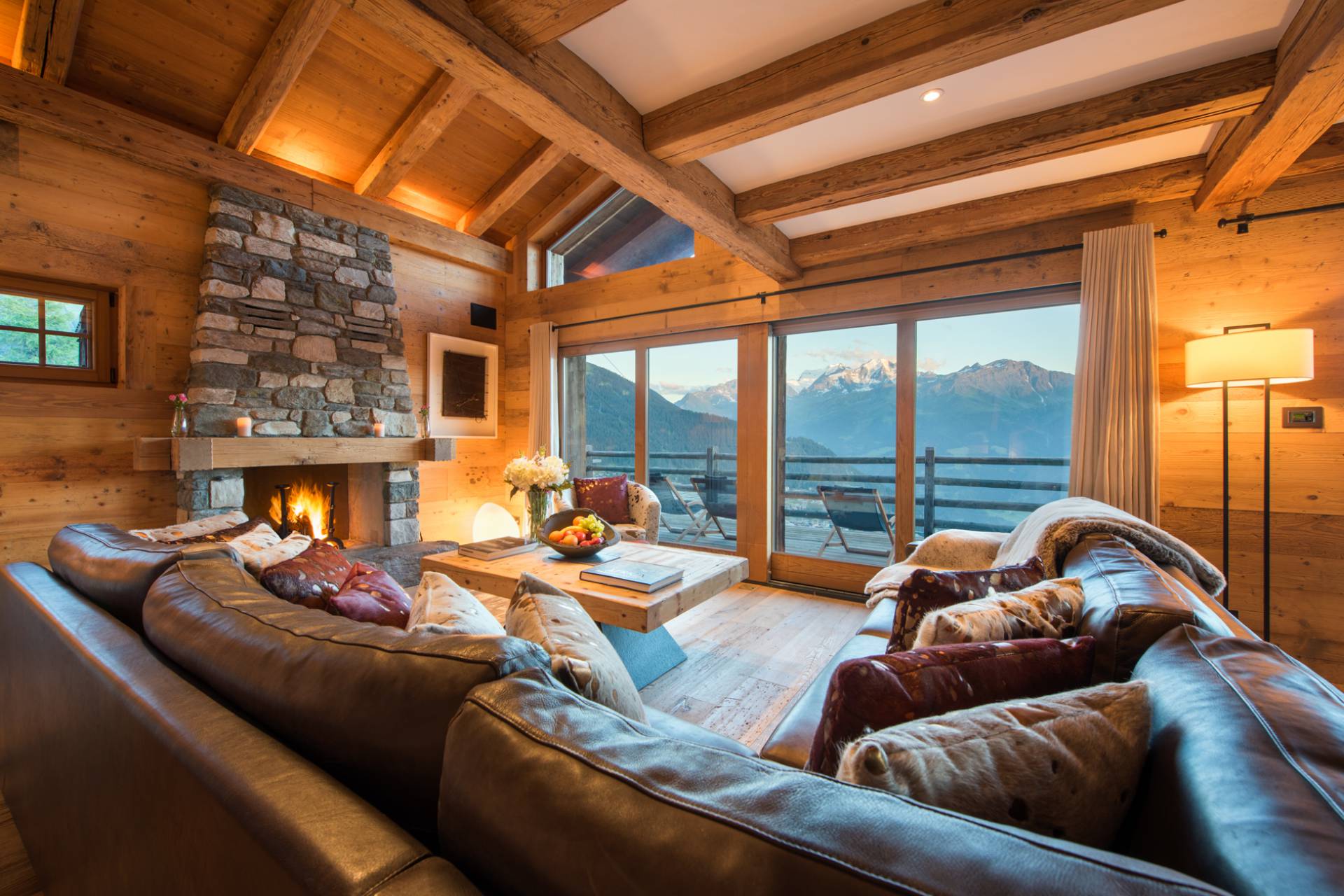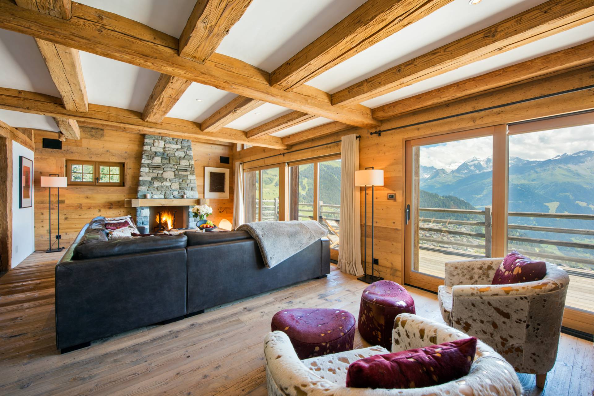 Au dernier étage se situent les espaces de vie commune et la suite parentale. Dans le vaste salon au coin de la cheminée de pierre, vous apprécierez la décoration qui associe matériaux bruts et objets de la culture paysanne aux lignes modernes des canapés et des grandes baies vitrées qui ouvrent sur la terrasse avec vue sur le paysage spectaculaire. L'ambiance intimiste et le caractère de cette somptueuse propriété émanent surtout de l'omniprésence du cuir et du remarquable travail de maroquinerie des canapés, fauteuils, sièges en peau retournée et bancs qui meublent l'ensemble du chalet. Côté salle à manger, la table rectangulaire peut réunir une dizaine de convives, tout près de la grande cuisine moderne parfaitement équipée et pourvue d’un superbe plan de travail en marbre où vous pourrez préparer vos repas. Quant à la suite parentale, directement sous la charpente, elle dispose d'un lit King size réchauffé par une épaisse couverture soyeuse, d'une spacieuse salle de bain éclairée à la lumière zénithale et d'un balcon privé.