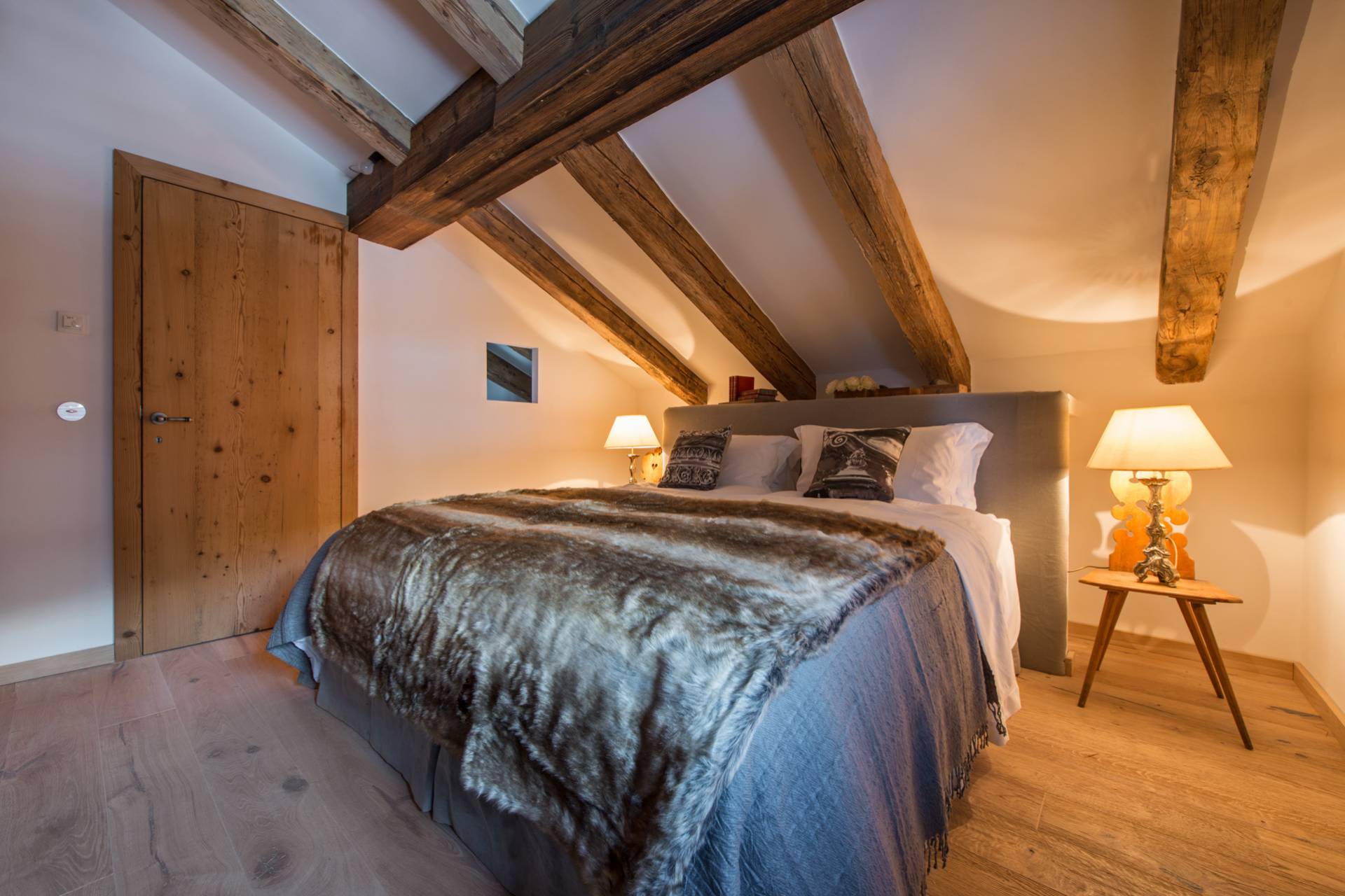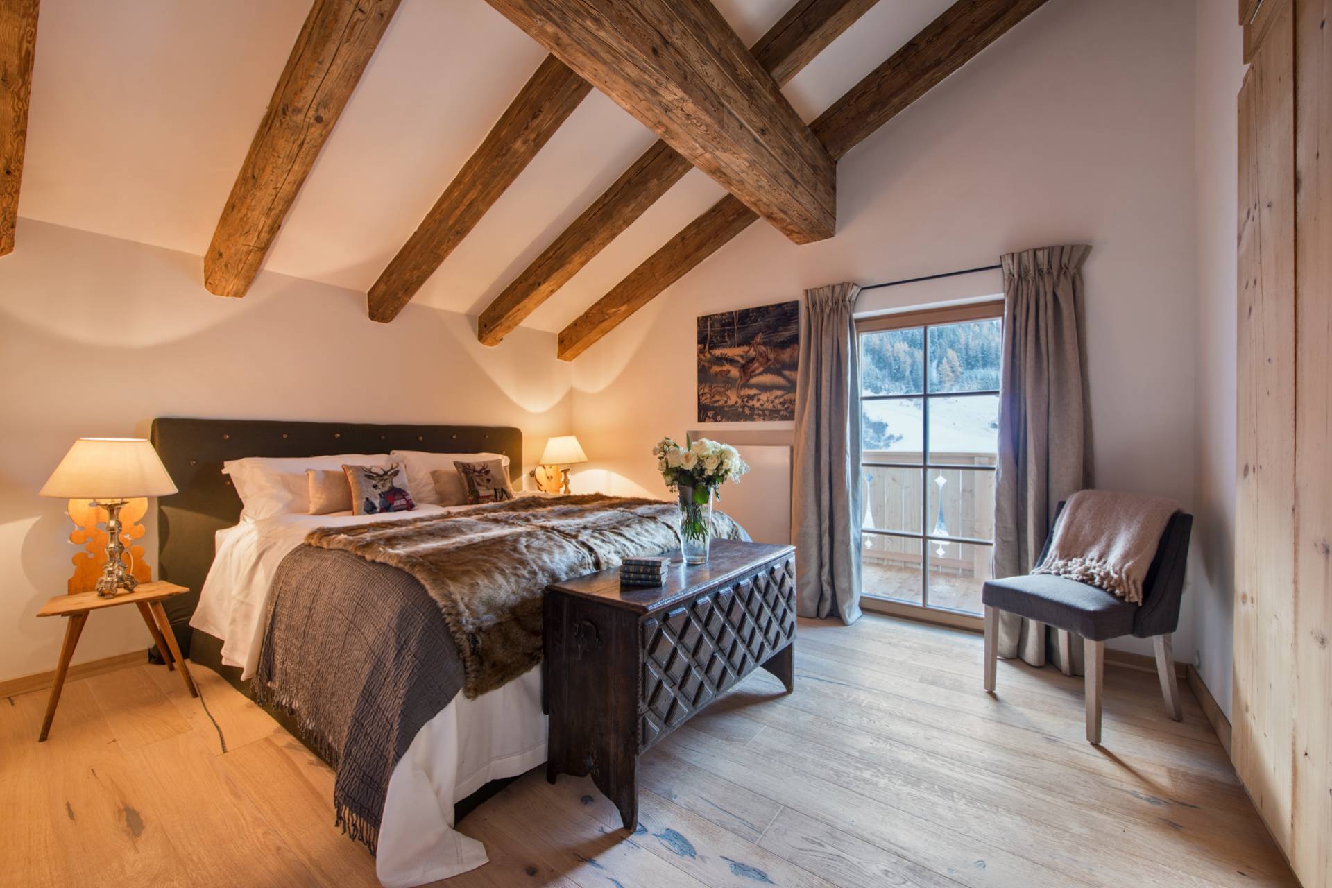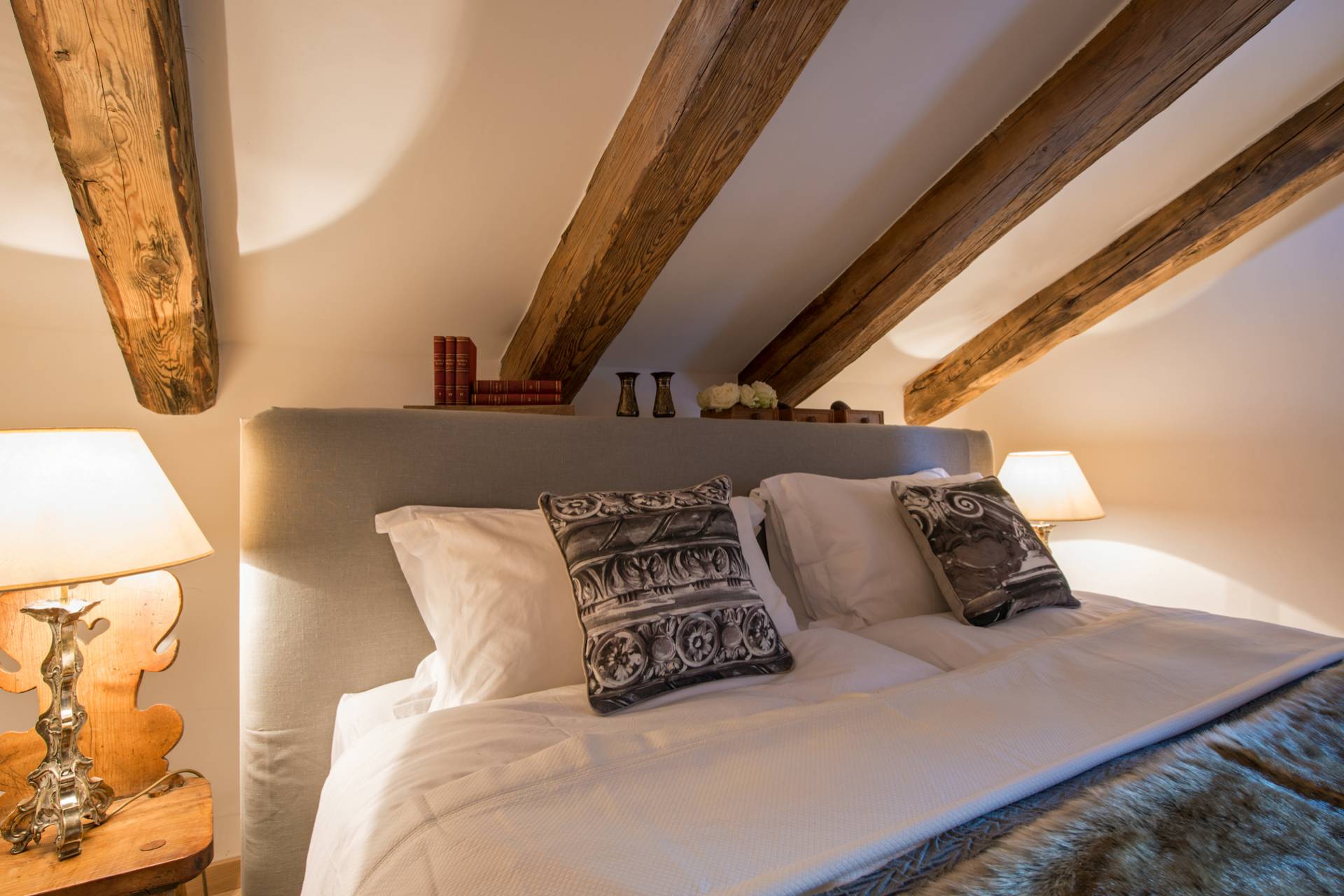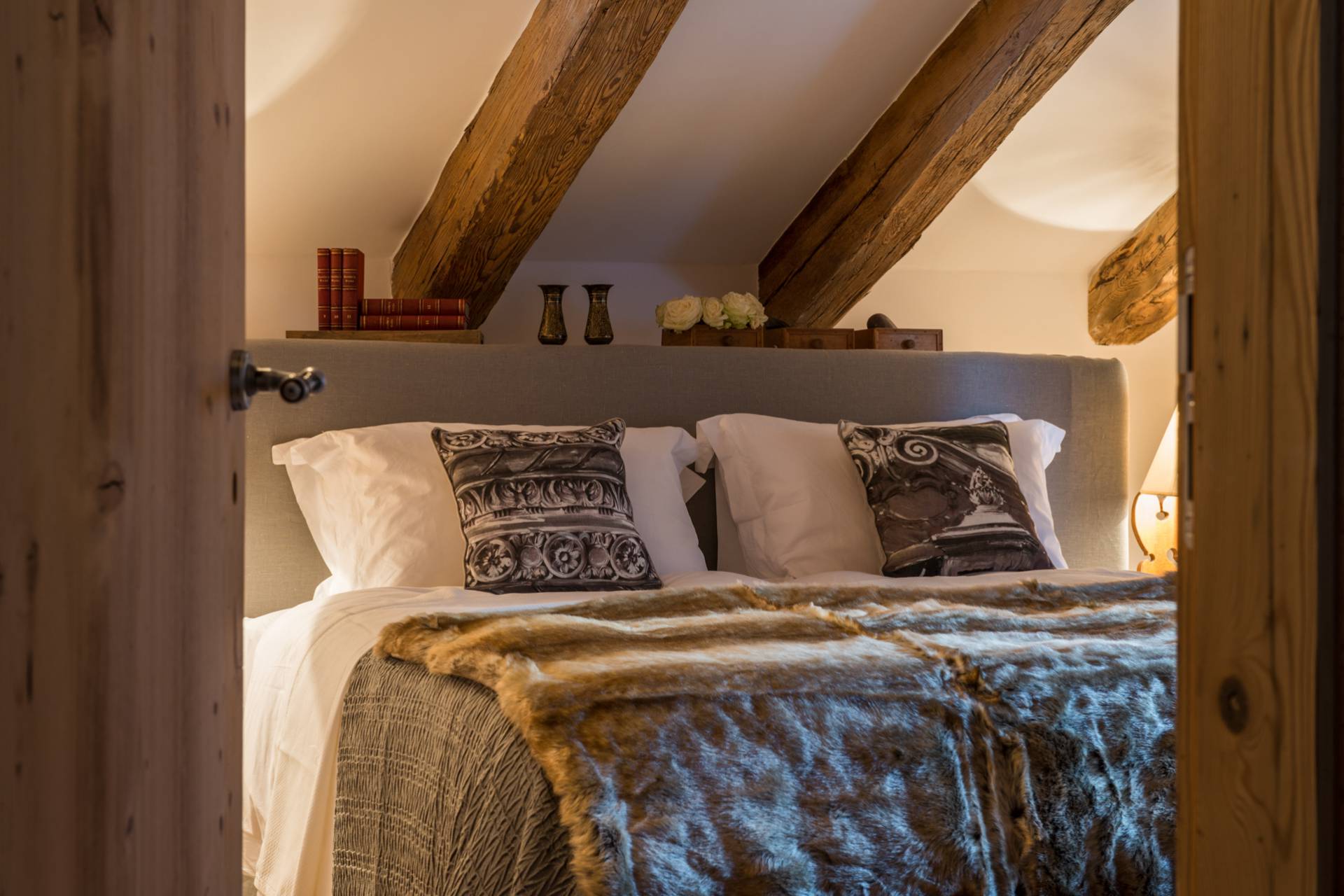 Avec un plafond aux poutres apparentes, l’étage supérieur est réservé à quatre magnifiques chambres et salles de bains privées. Elles sont toutes facilement modulables grâce à leurs lits jumeaux agrémentés de plaids moelleux en peau. Les baies vitrées de la chambre principale vous donneront accès au balcon. Décorée selon le thème du voyage, l’une des chambres est réservée aux enfants qui en aimeront les jolis coussins composés de fanions personnalisés. Une autre chambre ravira ses occupants par sa splendide armoire en bois de style tyrolien.