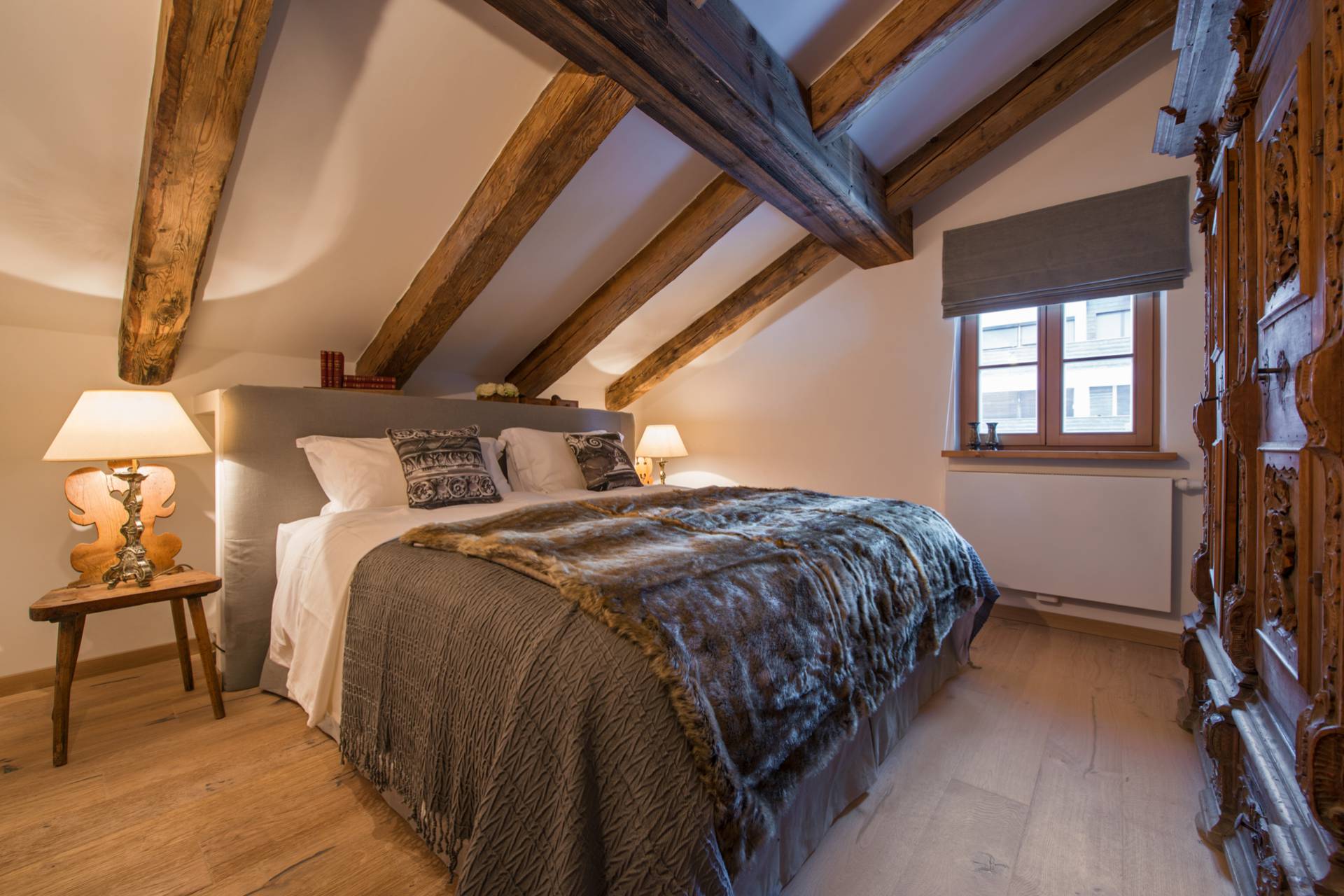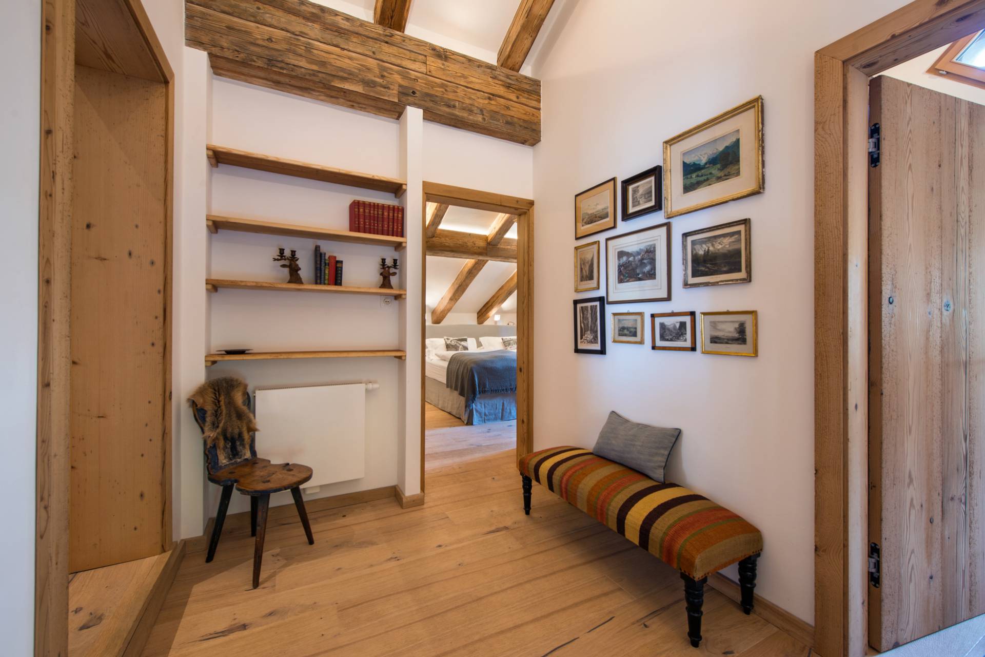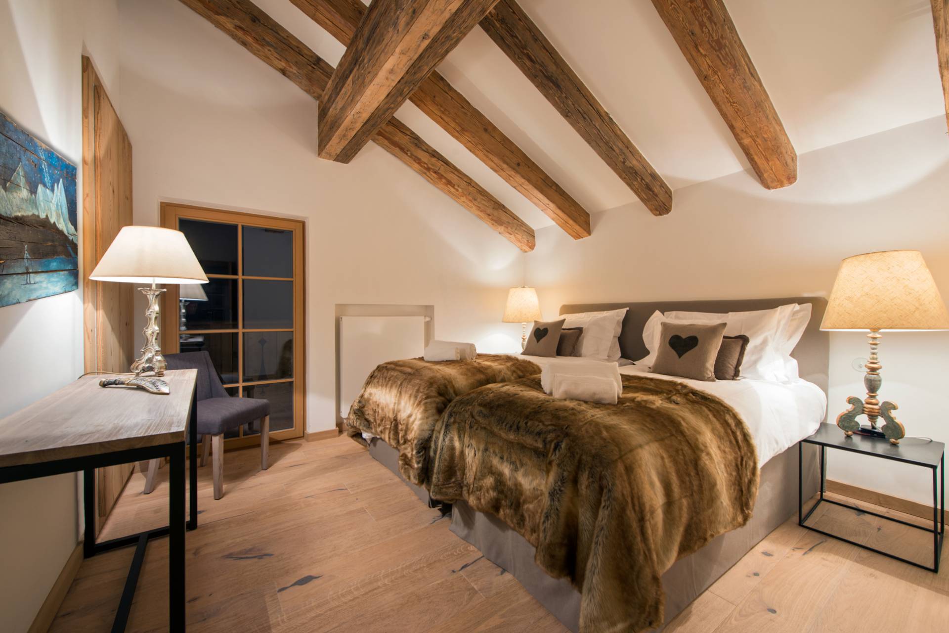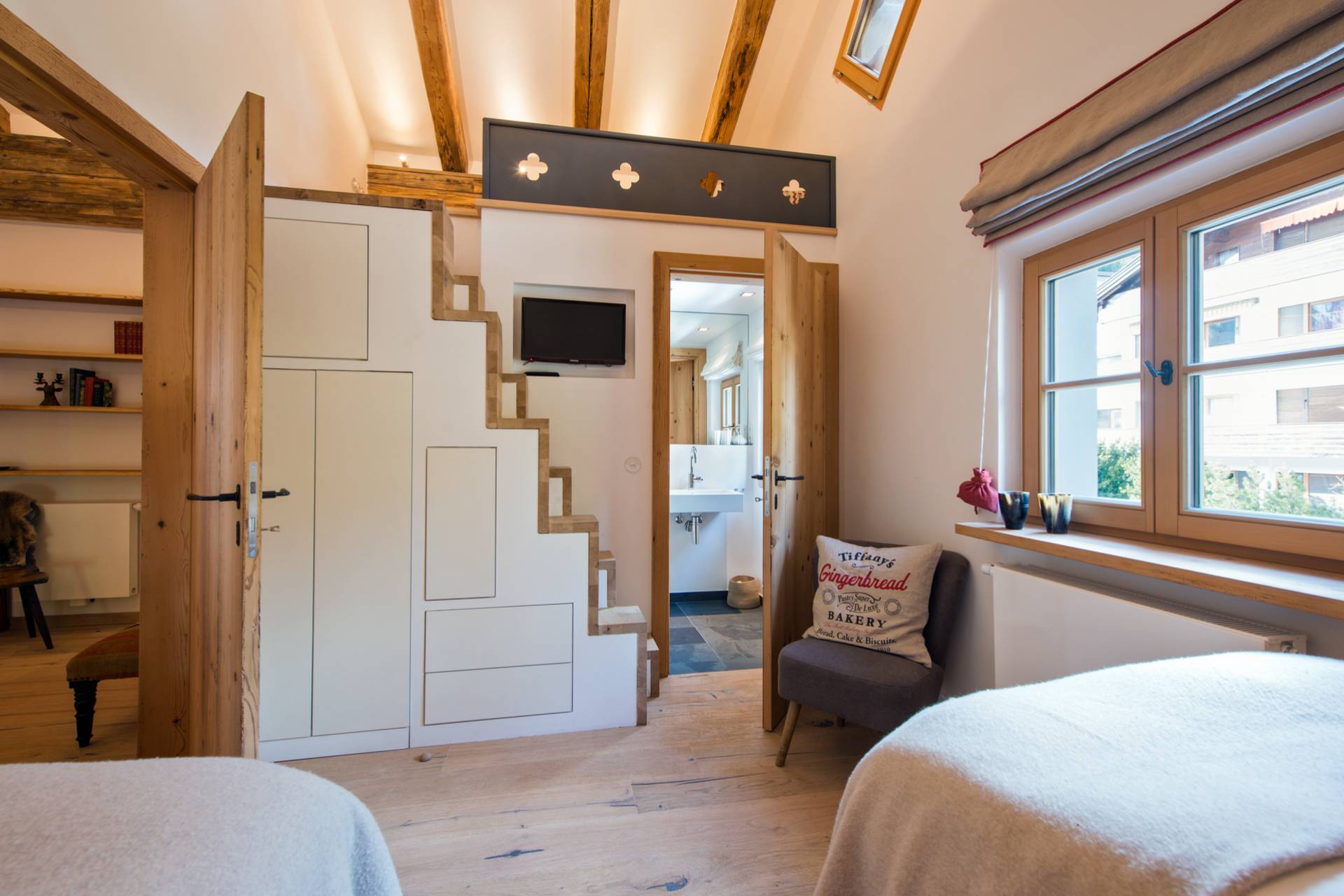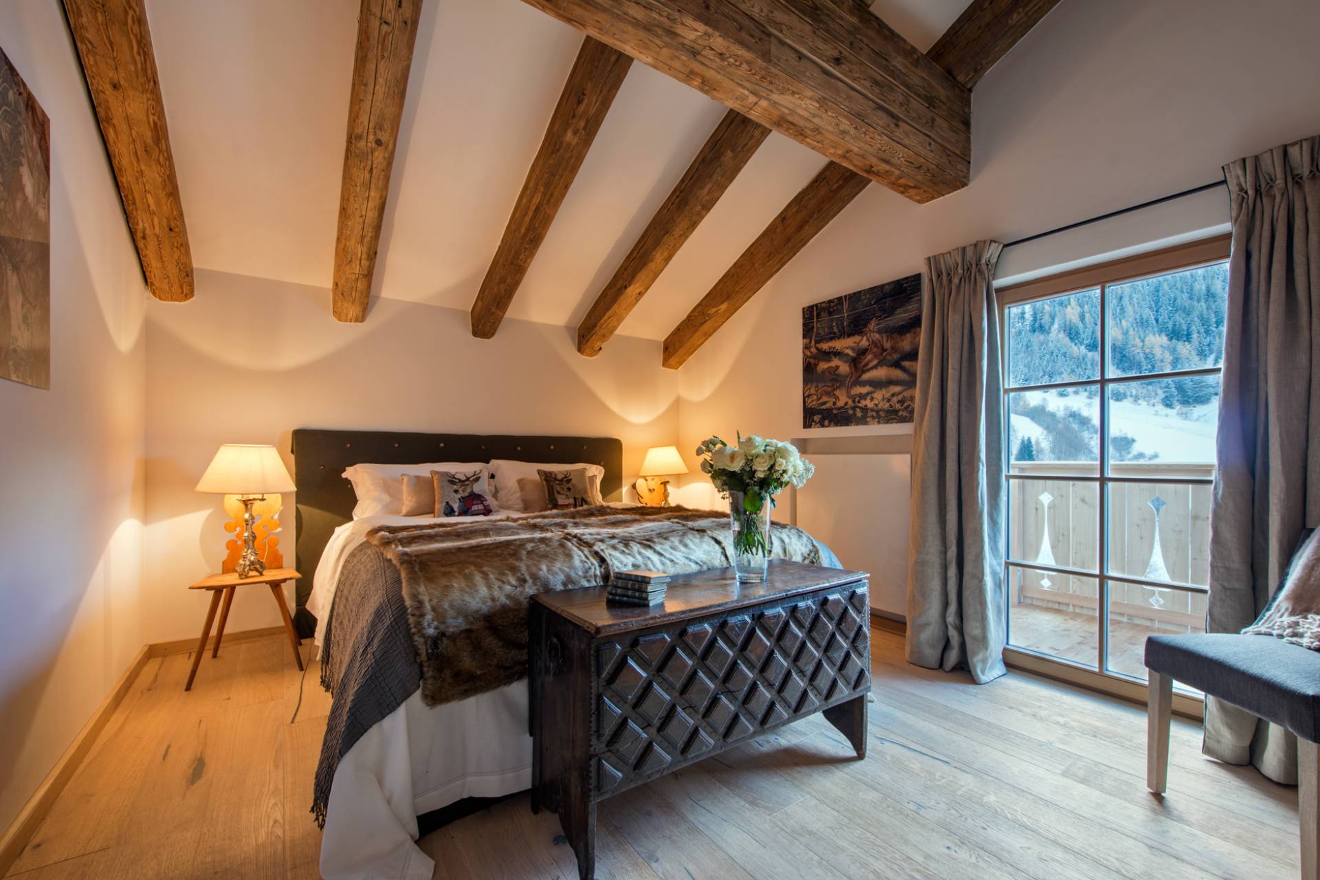 Avec un plafond aux poutres apparentes, l’étage supérieur est réservé à quatre magnifiques chambres et salles de bains privées. Elles sont toutes facilement modulables grâce à leurs lits jumeaux agrémentés de plaids moelleux en peau. Les baies vitrées de la chambre principale vous donneront accès au balcon. Décorée selon le thème du voyage, l’une des chambres est réservée aux enfants qui en aimeront les jolis coussins composés de fanions personnalisés. Une autre chambre ravira ses occupants par sa splendide armoire en bois de style tyrolien.