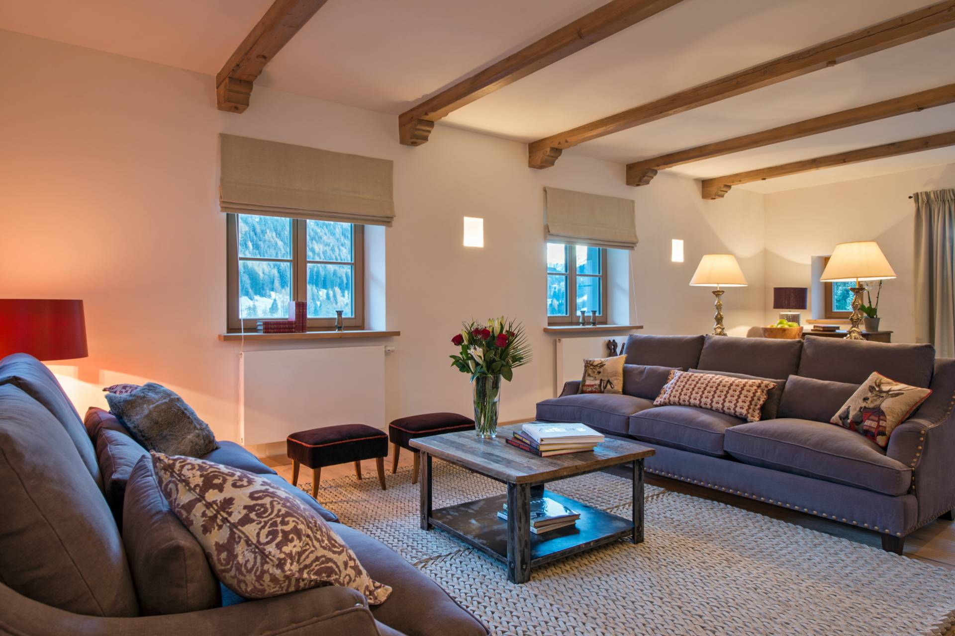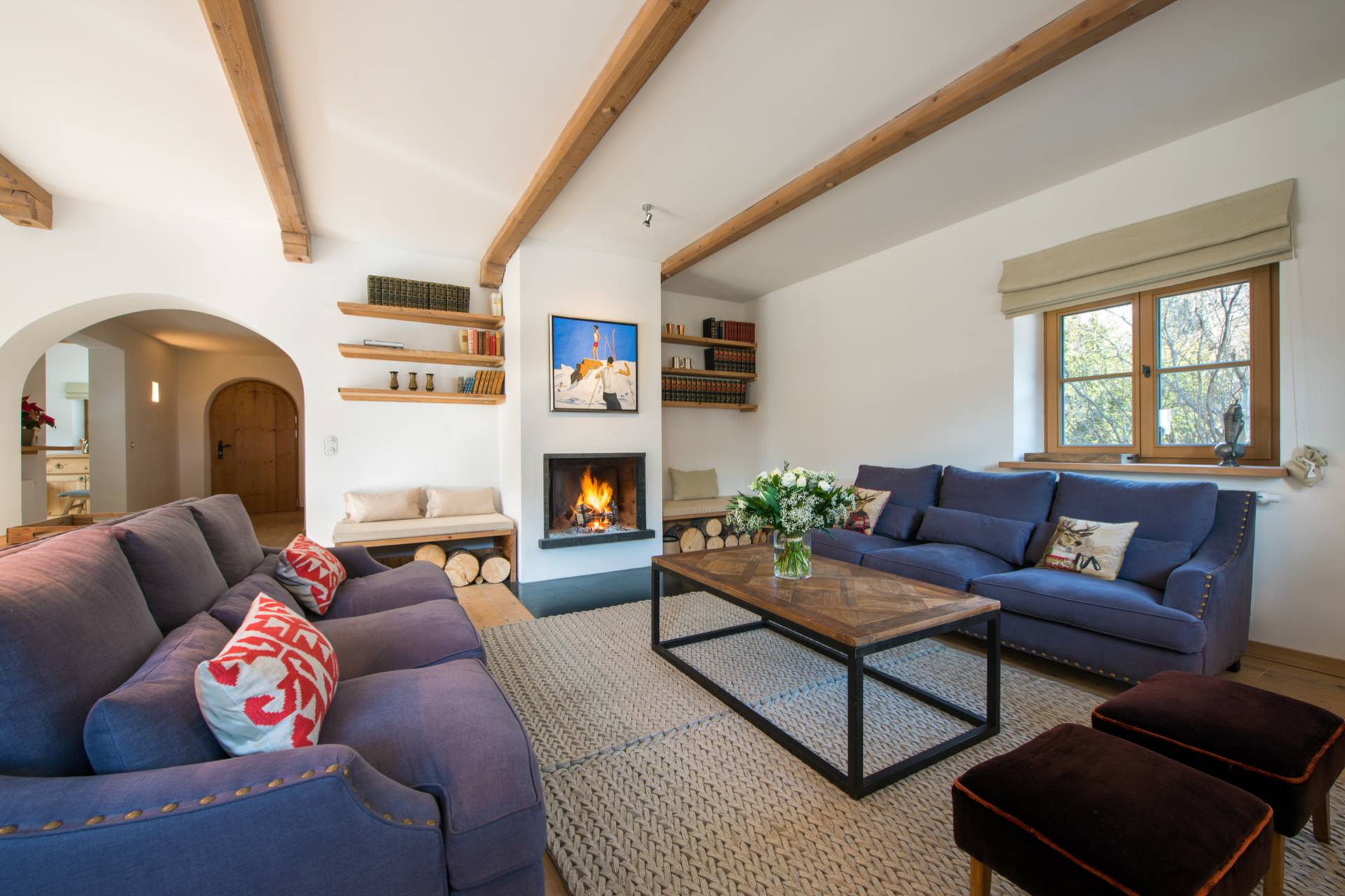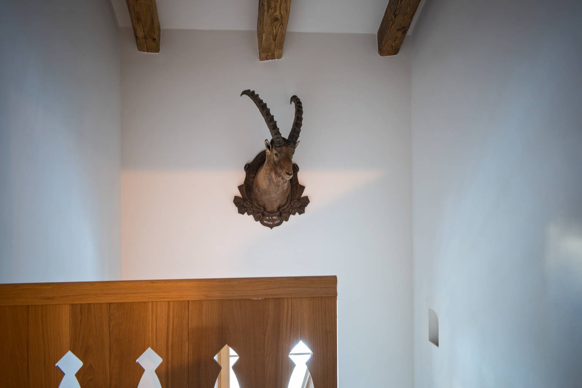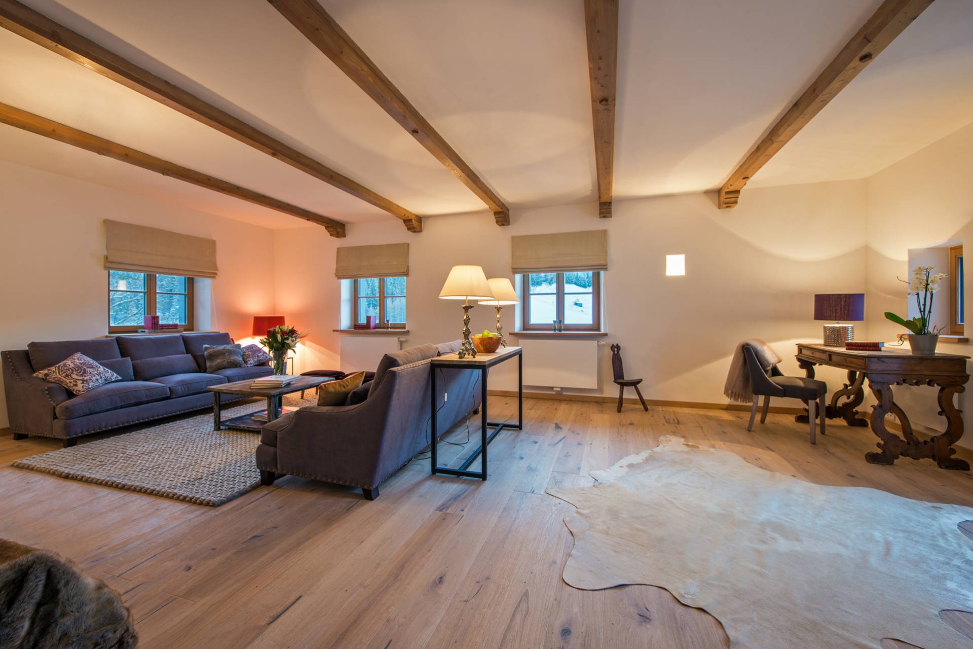 Avec un plafond aux poutres apparentes, l’étage supérieur est réservé à quatre magnifiques chambres et salles de bains privées. Elles sont toutes facilement modulables grâce à leurs lits jumeaux agrémentés de plaids moelleux en peau. Les baies vitrées de la chambre principale vous donneront accès au balcon. Décorée selon le thème du voyage, l’une des chambres est réservée aux enfants qui en aimeront les jolis coussins composés de fanions personnalisés. Une autre chambre ravira ses occupants par sa splendide armoire en bois de style tyrolien.