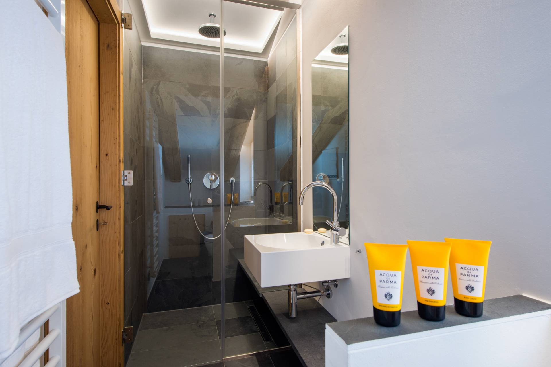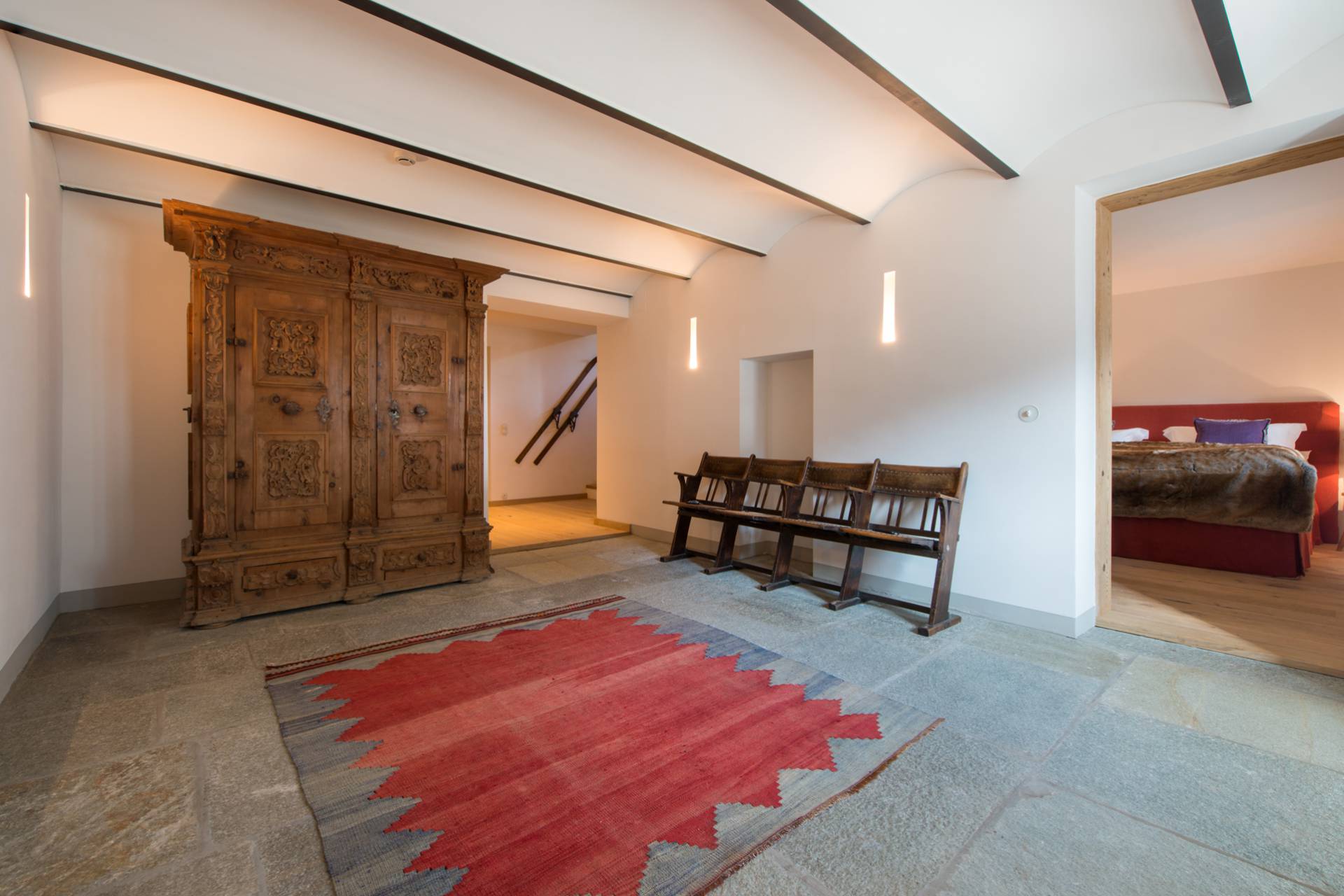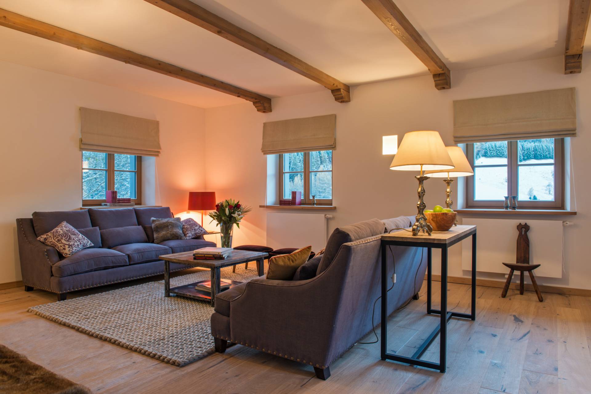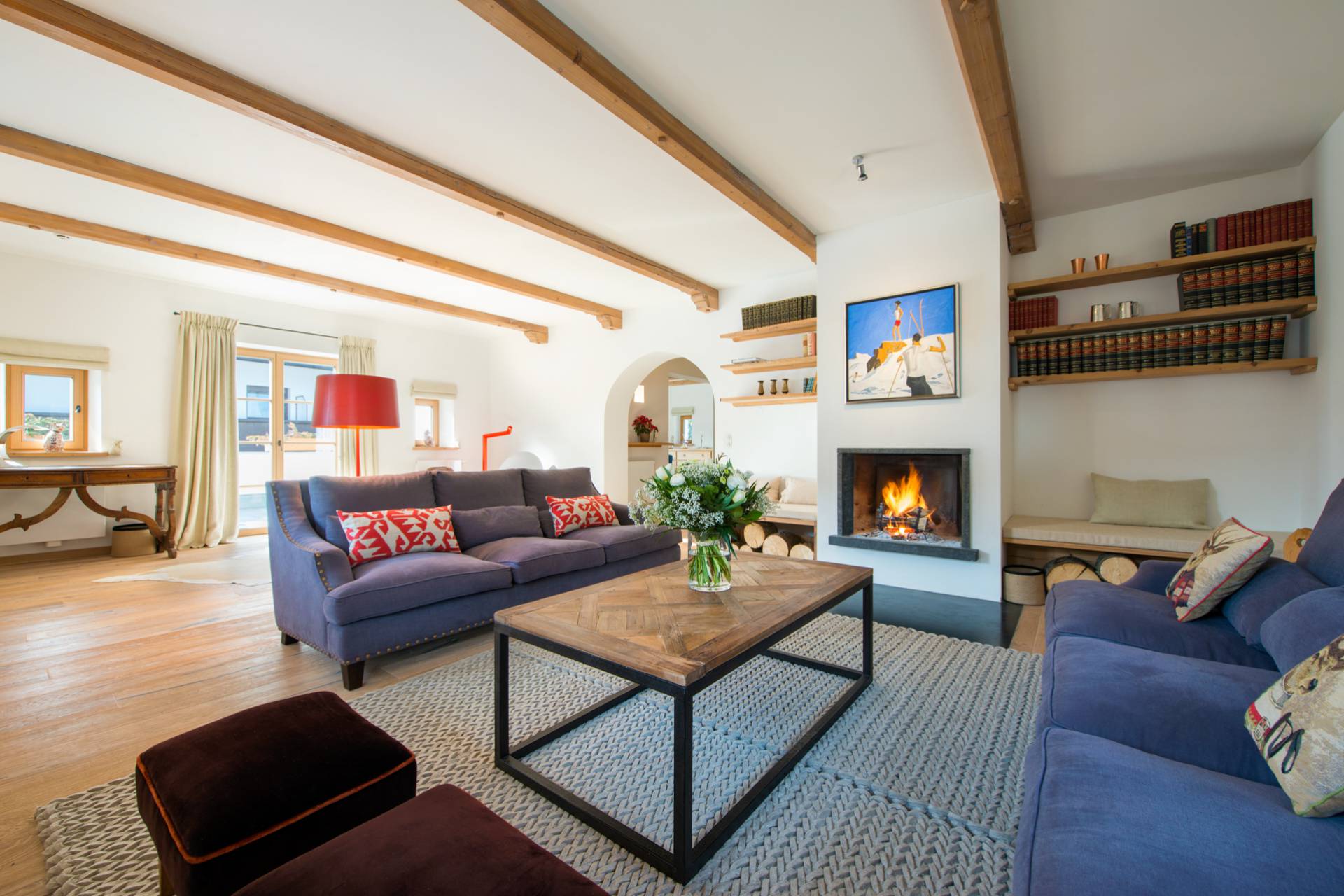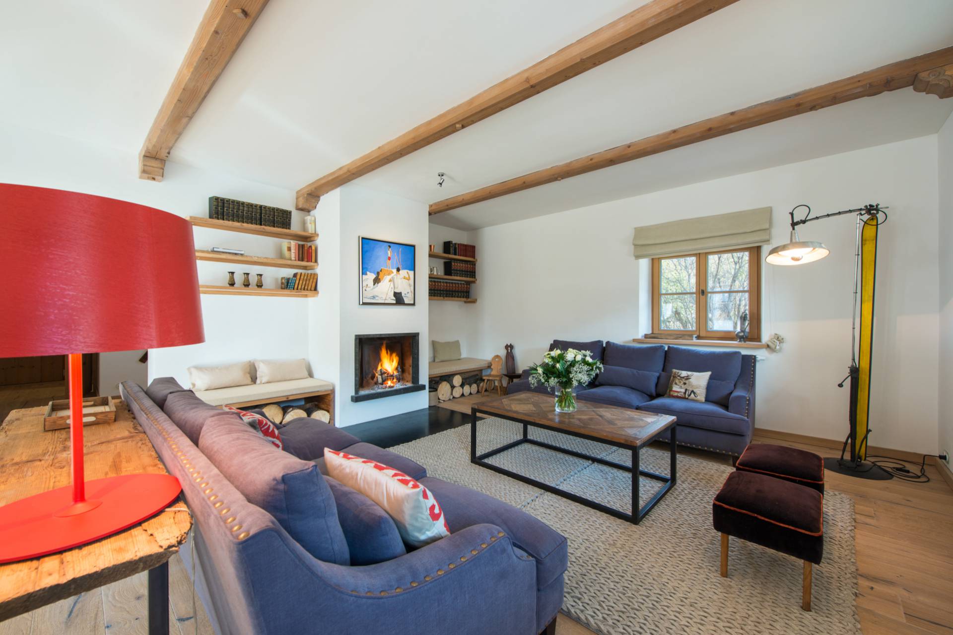 Avec un plafond aux poutres apparentes, l’étage supérieur est réservé à quatre magnifiques chambres et salles de bains privées. Elles sont toutes facilement modulables grâce à leurs lits jumeaux agrémentés de plaids moelleux en peau. Les baies vitrées de la chambre principale vous donneront accès au balcon. Décorée selon le thème du voyage, l’une des chambres est réservée aux enfants qui en aimeront les jolis coussins composés de fanions personnalisés. Une autre chambre ravira ses occupants par sa splendide armoire en bois de style tyrolien.