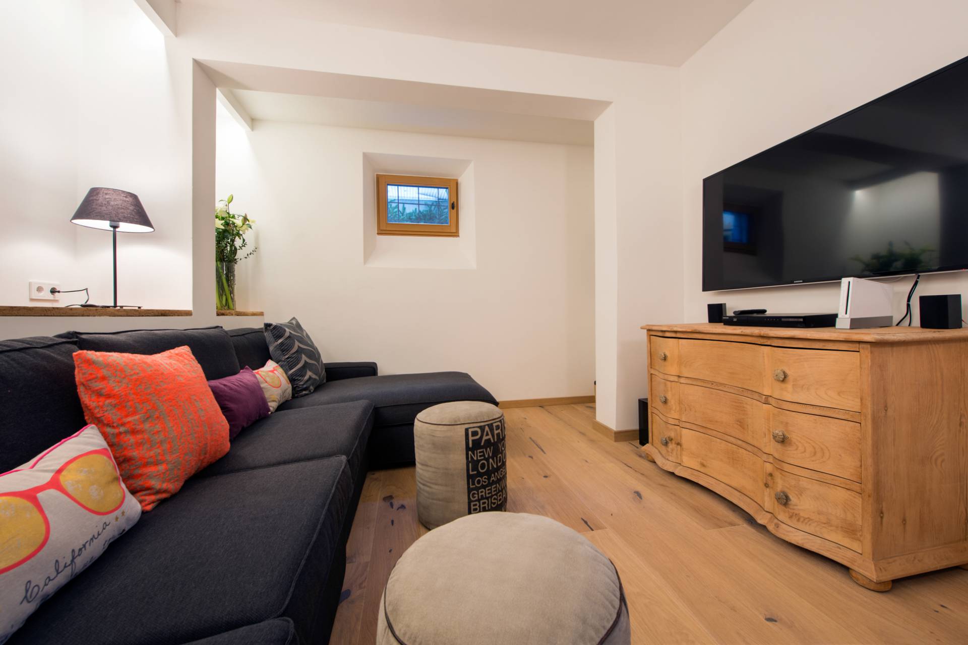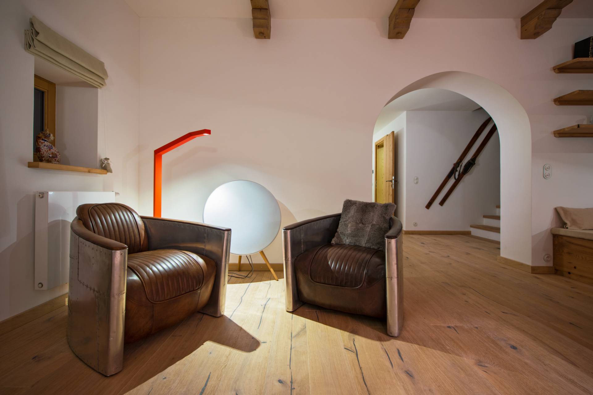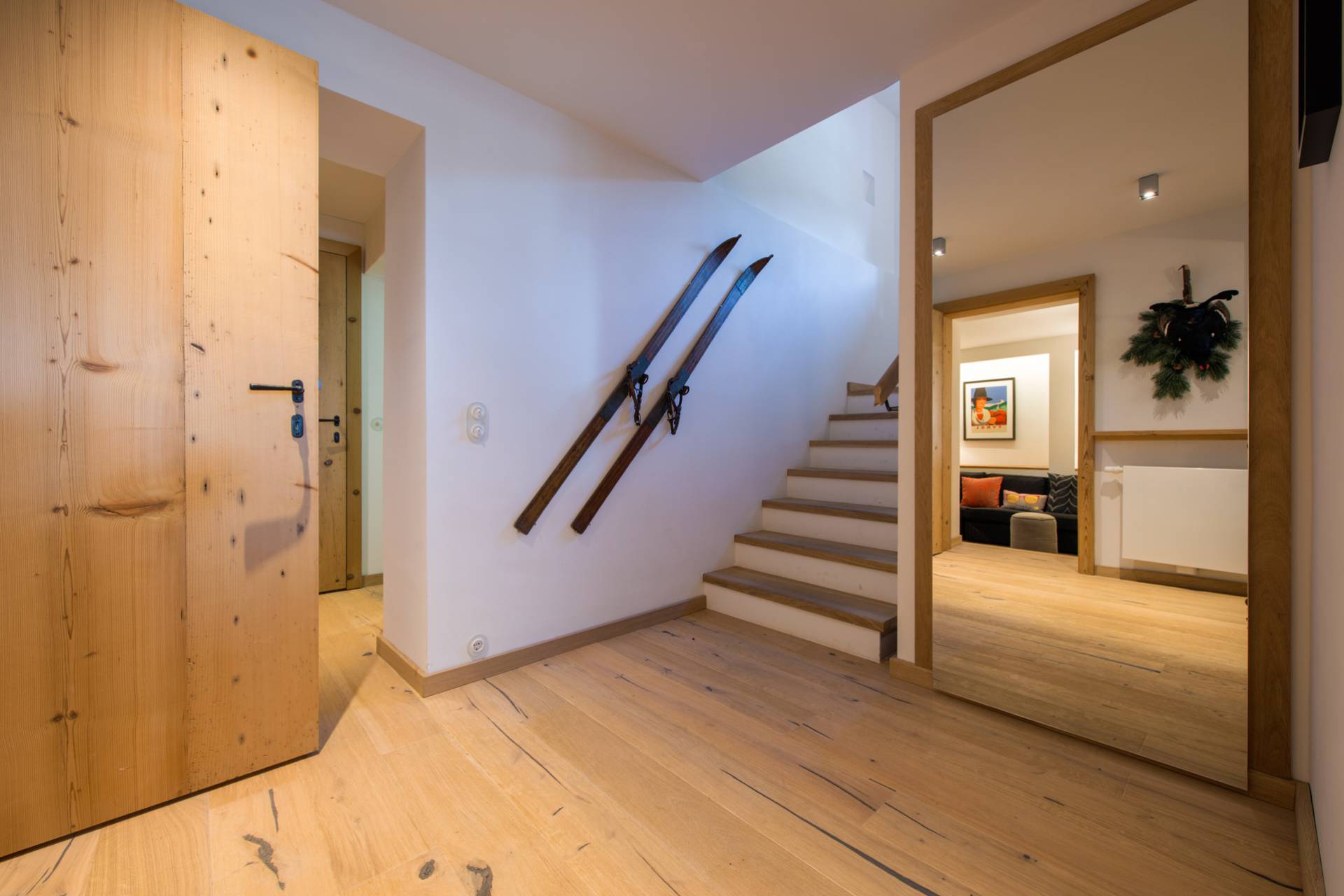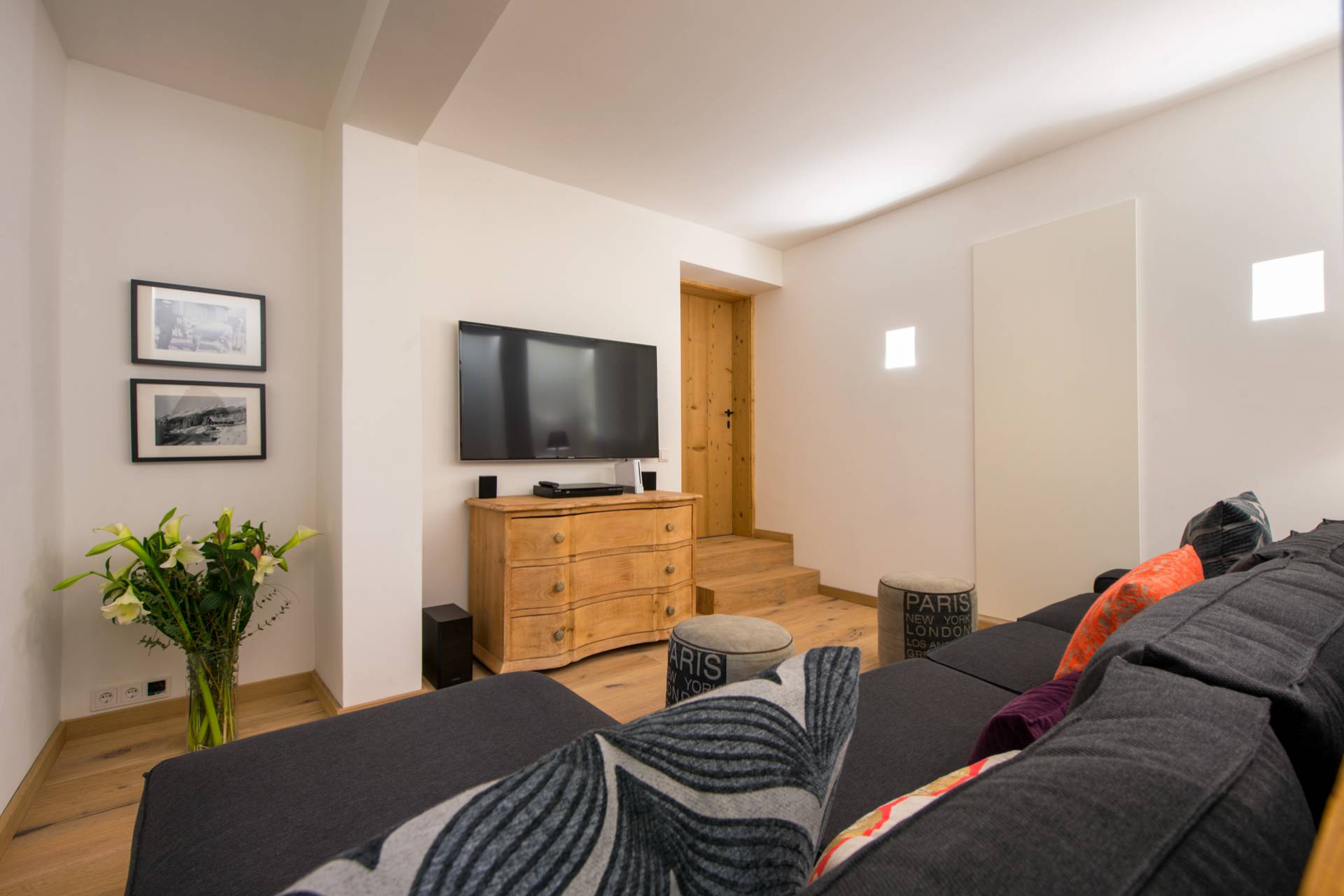 À l’entrée du chalet, une décoration sobre et élégante vous accueillera : l’armoire aux motifs tyroliens et le tapis traditionnel se marient à merveille avec les formes horizontales du plafond et le motif des skis au mur. Pour les férus de films ou de séries, une salle de cinéma avec un large canapé, réchauffé par des coussins au décor pop, les attend au retour des pistes. Après de longues journées de glisse, vous pourrez aussi profiter de la vue depuis la terrasse.