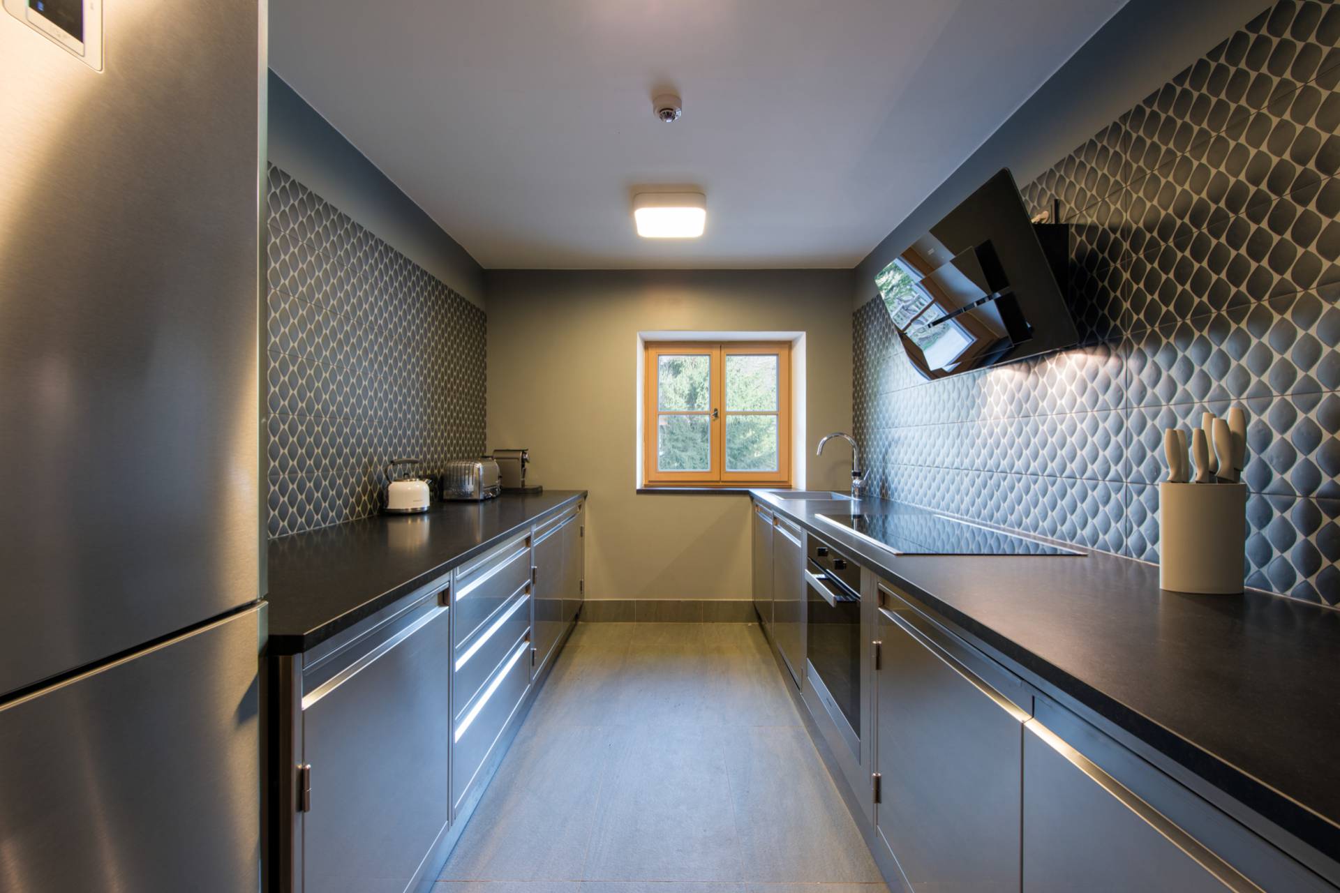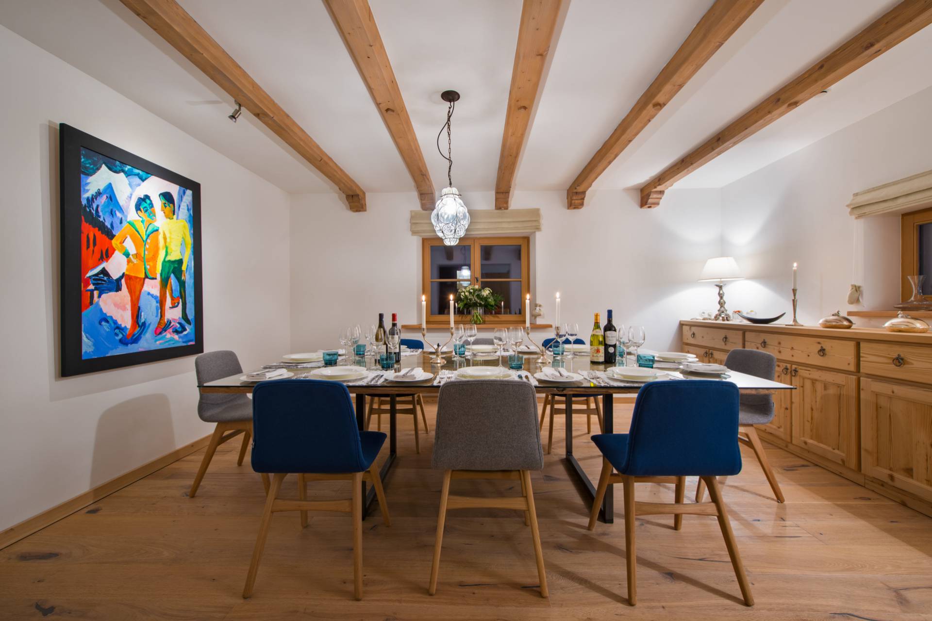 À l’étage inférieur, vous trouverez une cuisine équipée ultra moderne ainsi qu’un grand espace de vie commun. Face à la cuisine, une salle à manger vous accueillera pour partager des repas conviviaux autour d’une table pour douze personnes à la décoration chic et contemporaine. Si vous levez les yeux, vous apercevrez au mur une toile moderne qui prend la montagne pour décor et éclaire la pièce par ses couleurs vives.