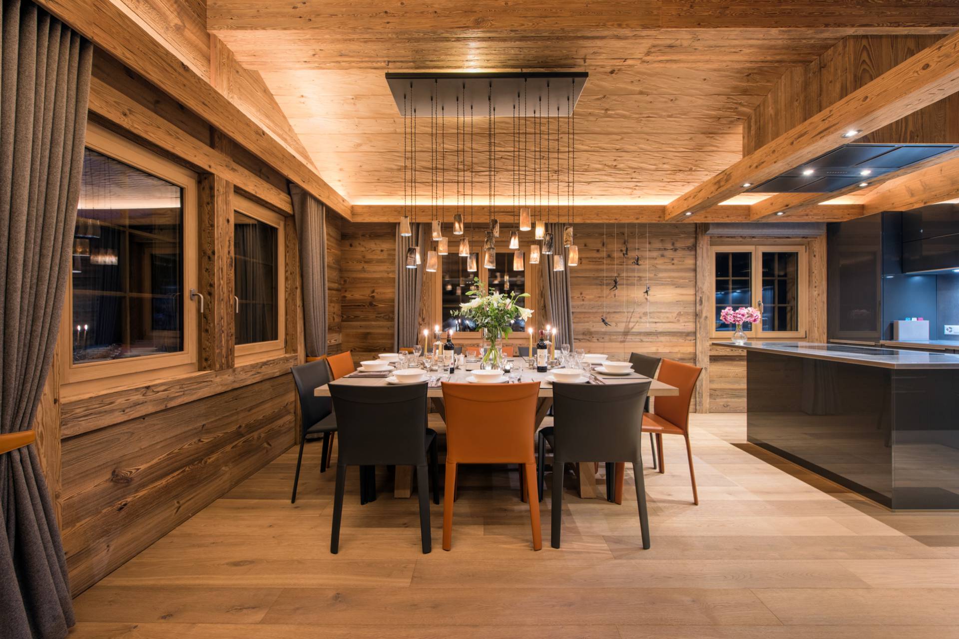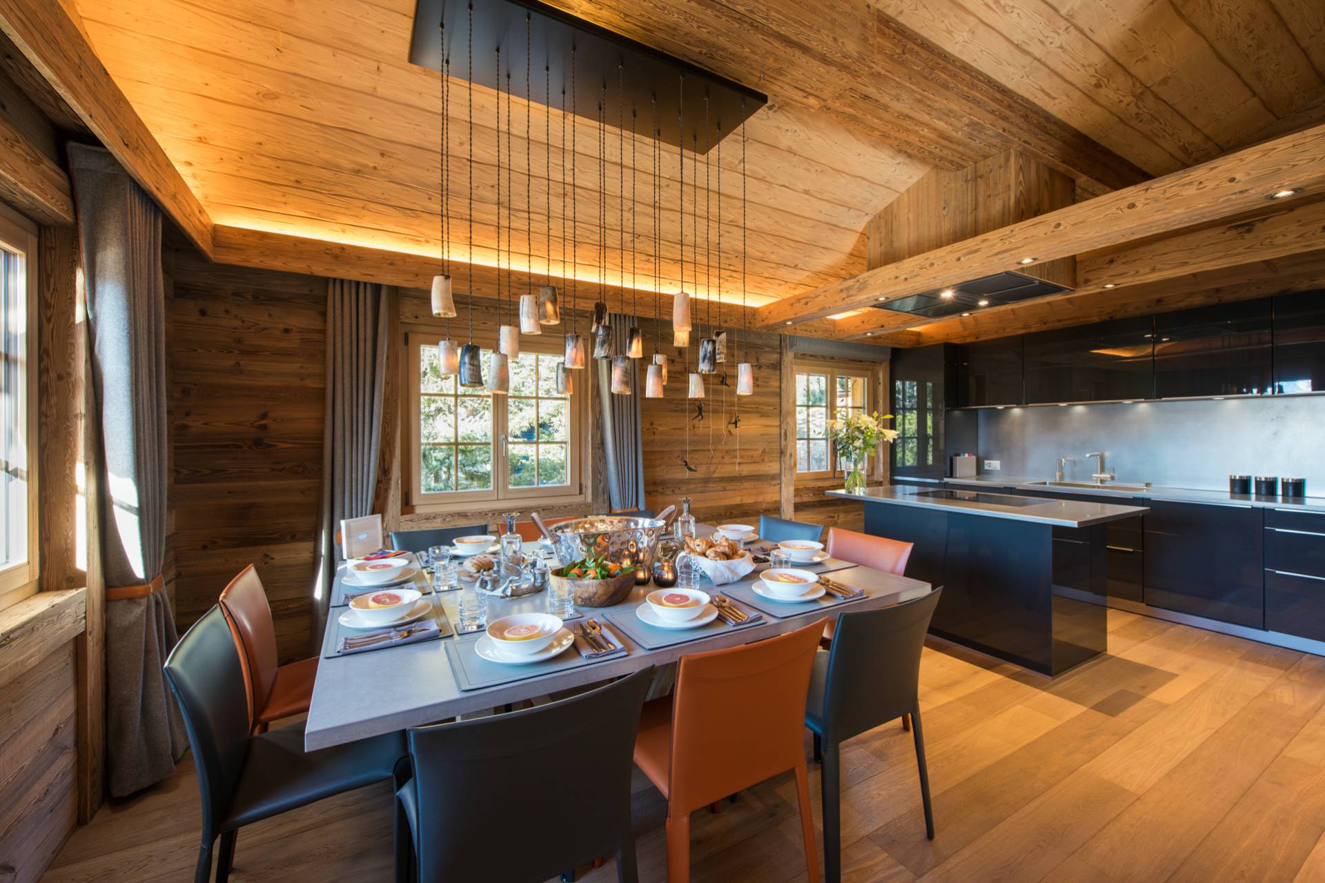 L’ensemble de la pièce est aménagé avec élégance. À côté de la cuisine américaine ultra moderne, la table de la salle à manger au dessin contemporain est dotée de chaises de cuir brun et orangé, dans un jeu de couleurs franches qui se retrouve dans chaque détail de la décoration. Vous apprécierez le choix des luminaires comme la collection d’affiches et d’œuvres d’art sur le thème montagnard qui ornent le chalet.
