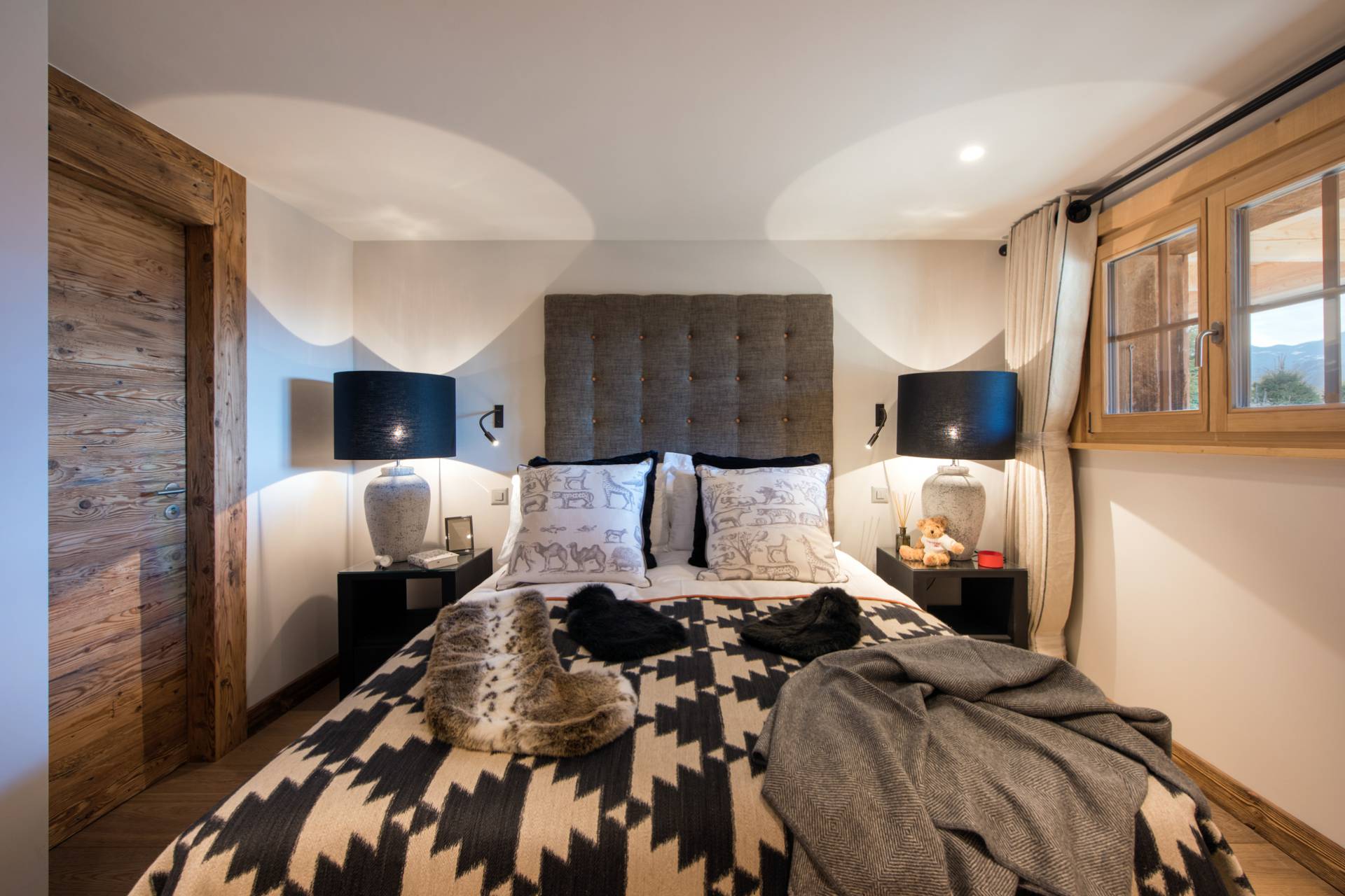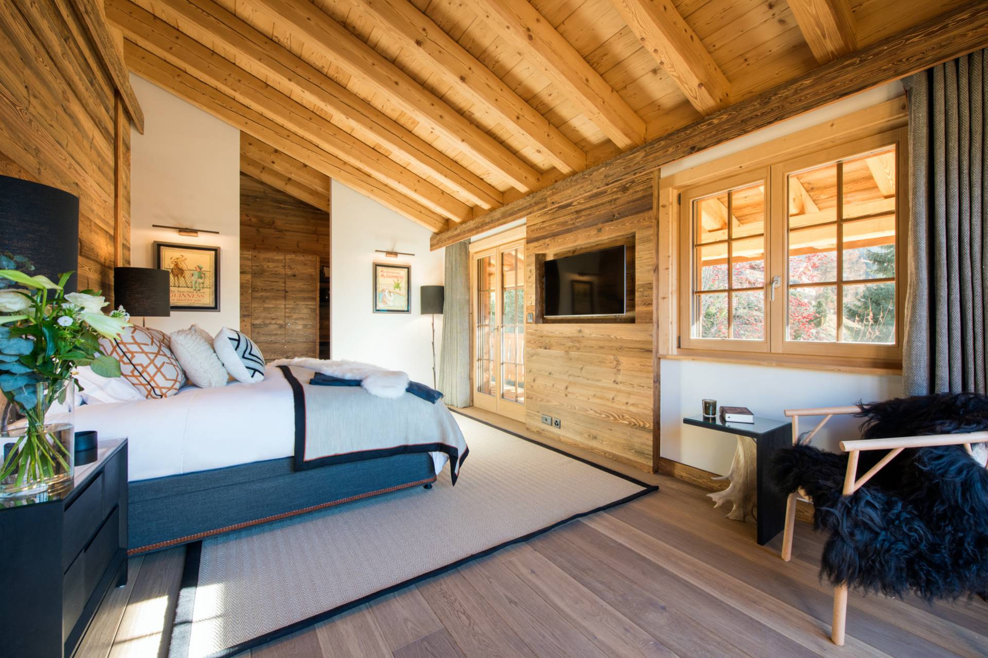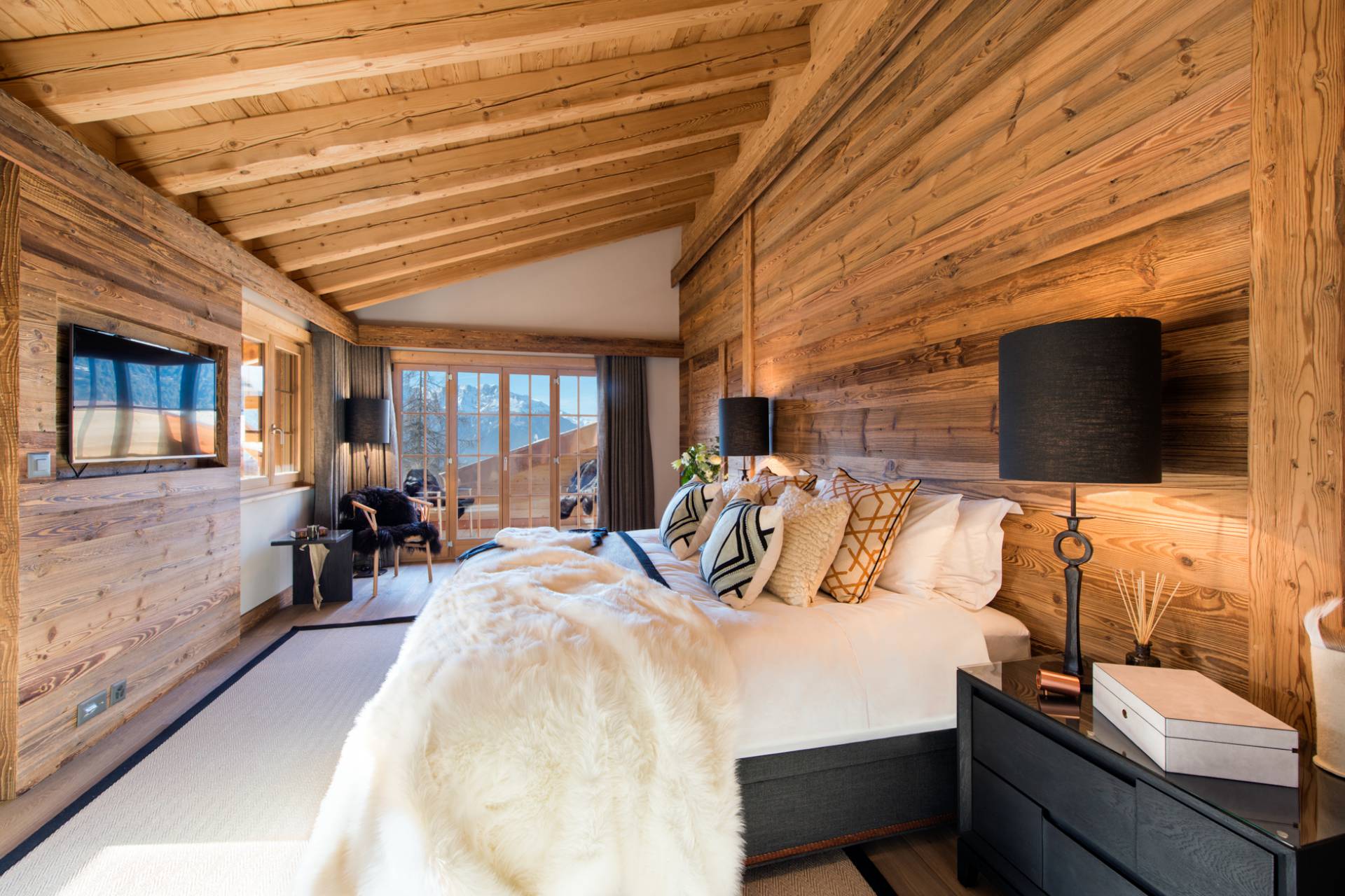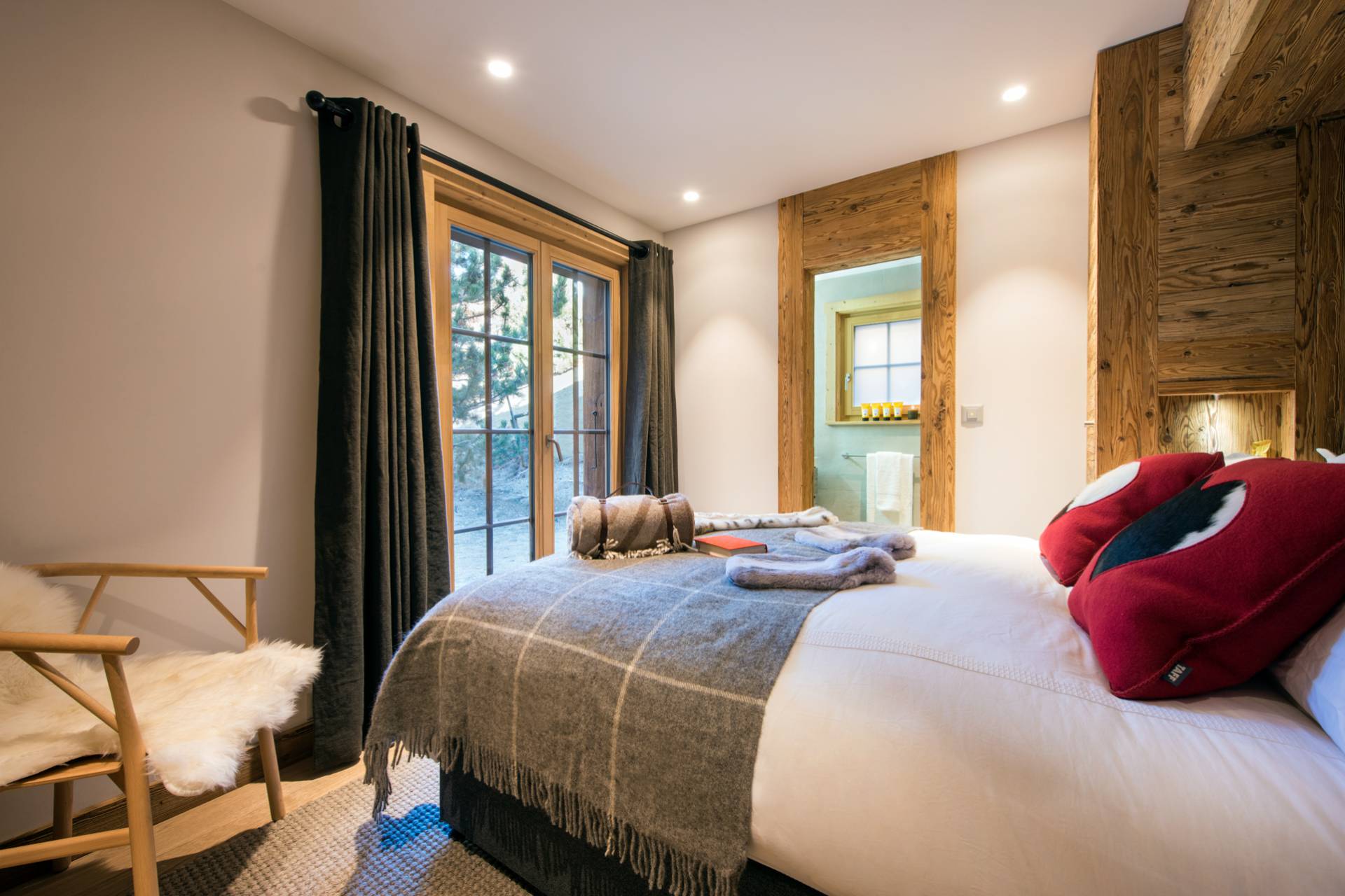 Le deuxième et dernier étage du chalet est entièrement consacré à la suite parentale. Celle-ci est tout simplement somptueuse, pourvue d’un lit King size, d’une télévision à écran plat et d’un dressing. Elle est décorée avec sobriété, égayée par des étoffes aux motifs géométriques et colorés et des couvertures en fourrure soyeuses. Sa salle de bain est grandiose : entièrement parée de bois, elle vous procurera le confort d’un grand lavabo à double vasque, d’une baignoire, d’une douche et de toilettes séparées. Vous pourrez enfin profiter ici de deux balcons privés, avec des perspectives remarquables sur les sommets enneigés.