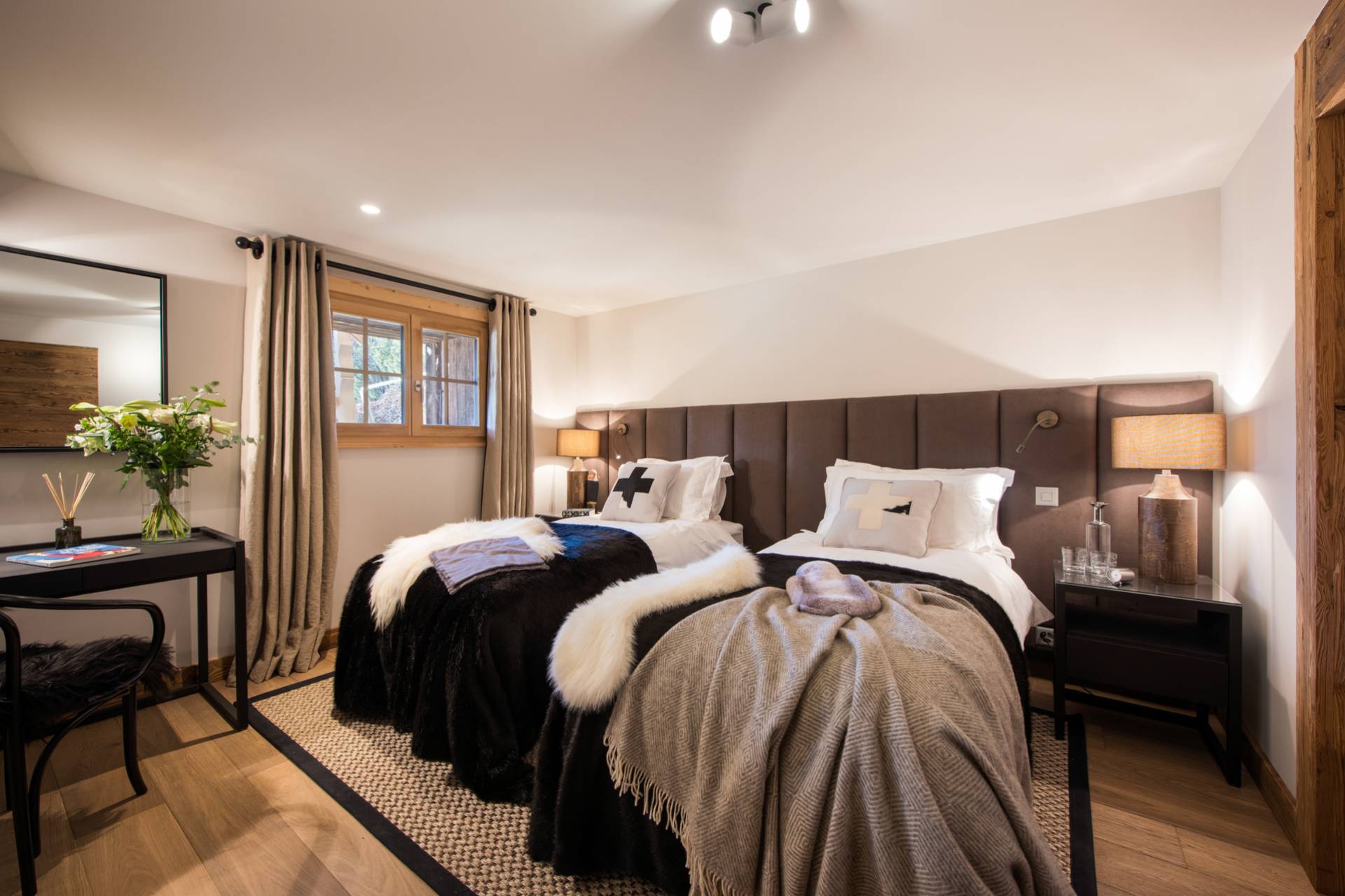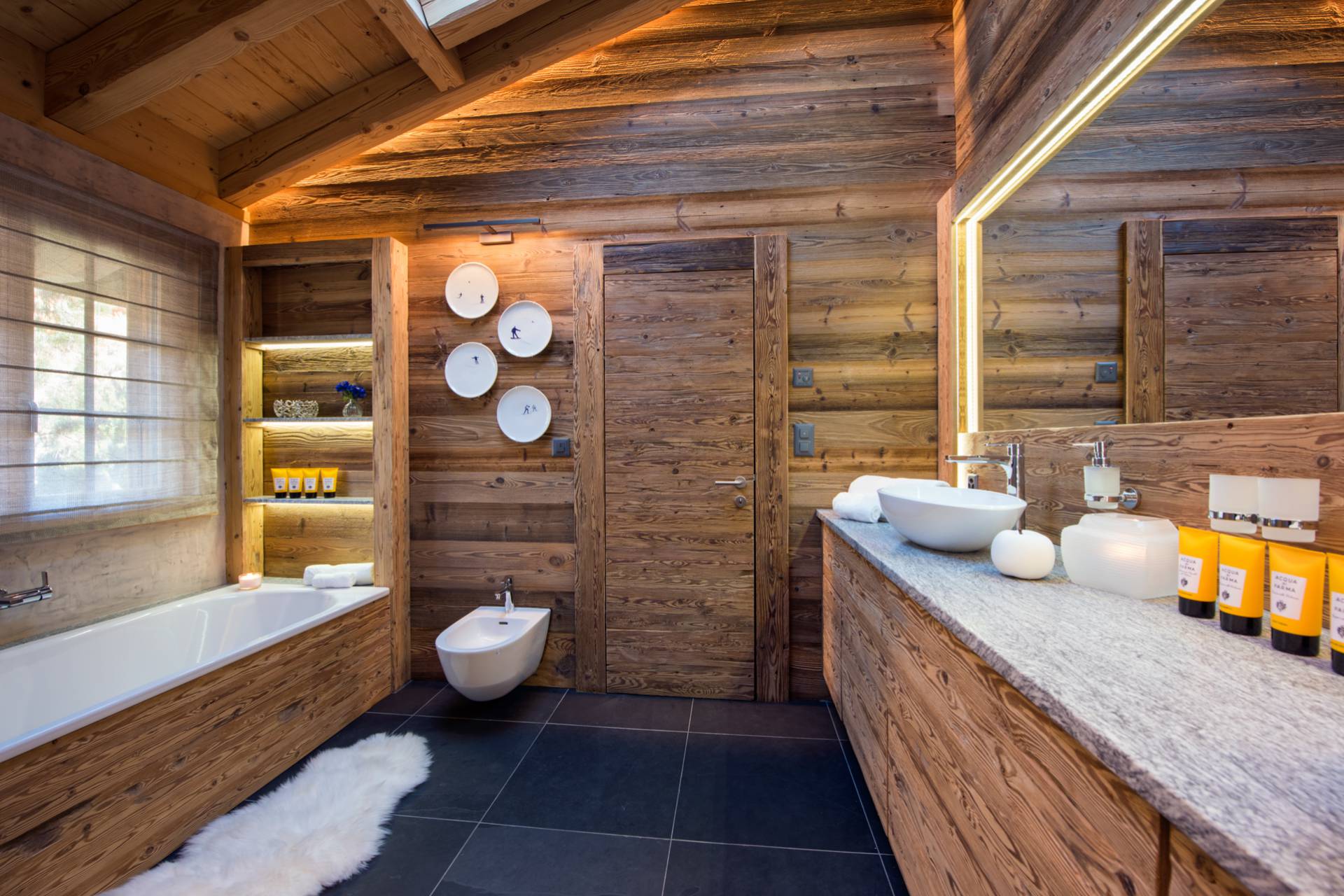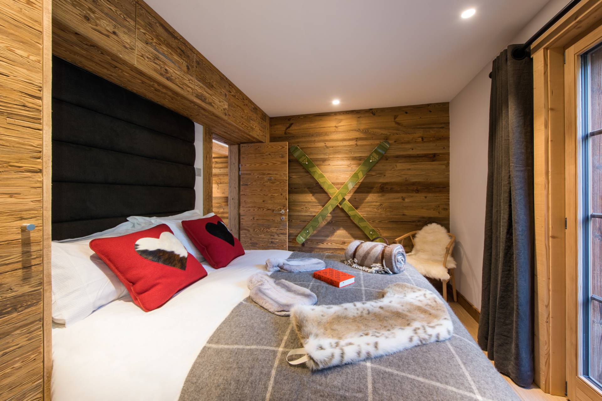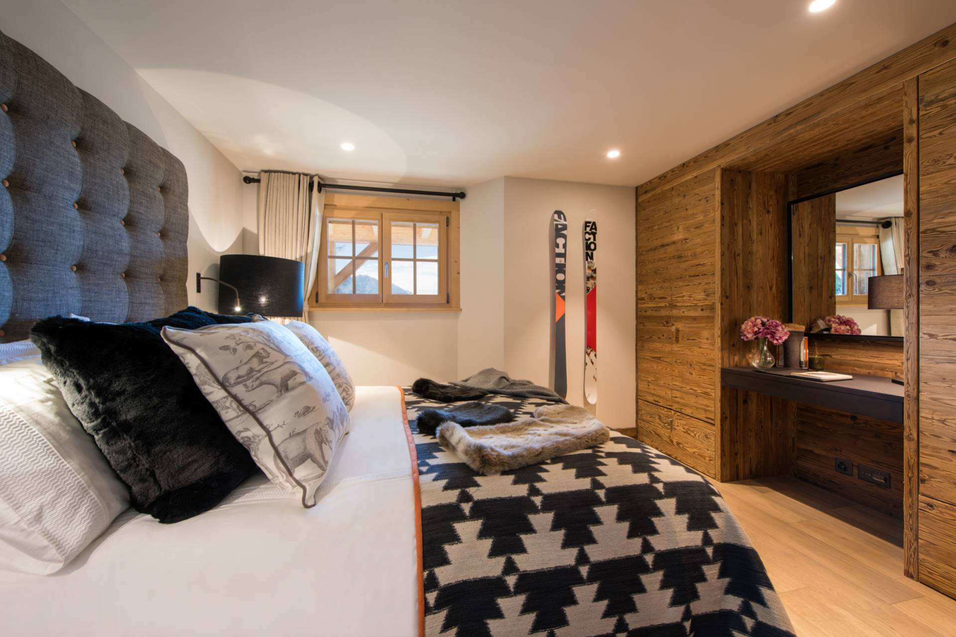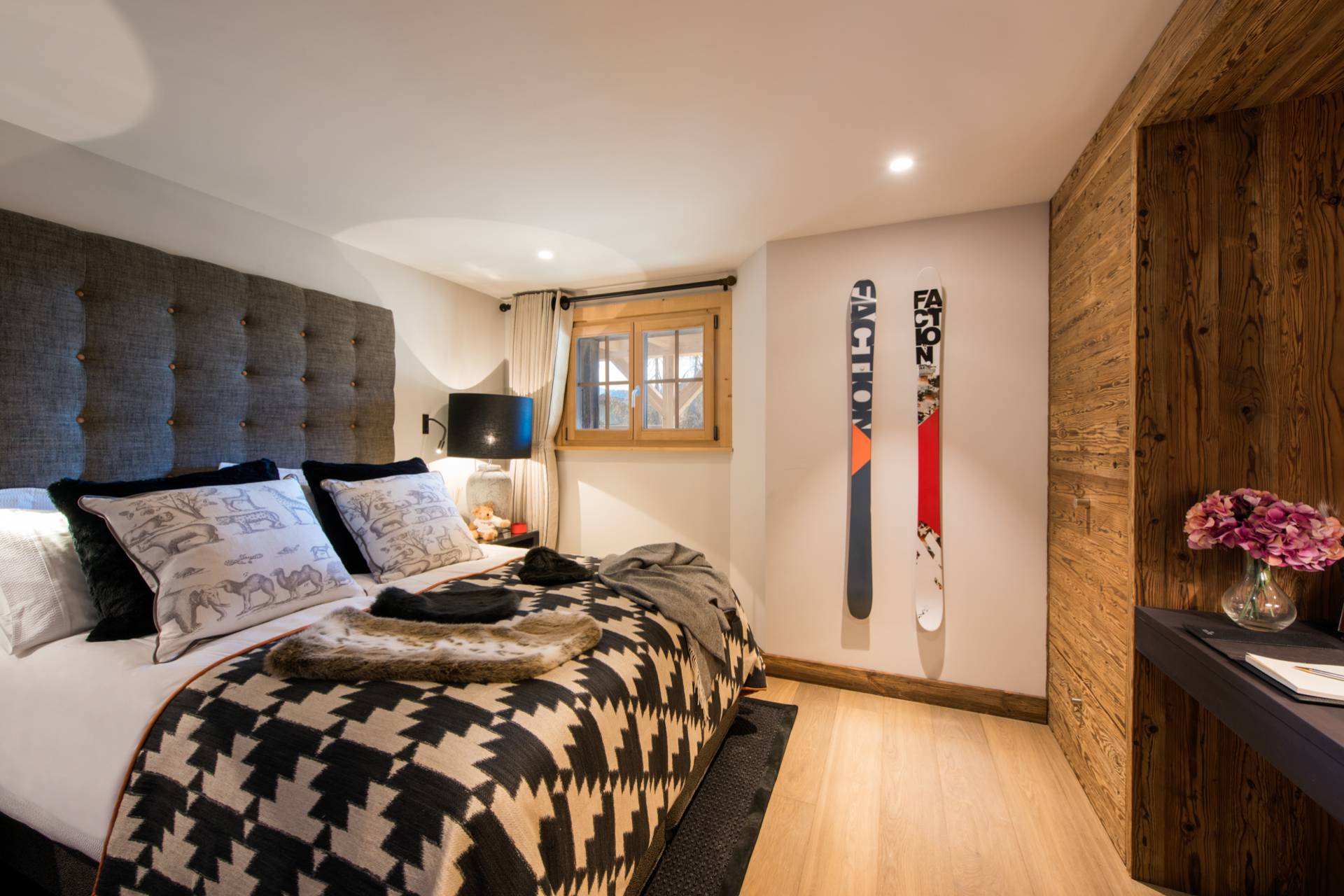 Le deuxième et dernier étage du chalet est entièrement consacré à la suite parentale. Celle-ci est tout simplement somptueuse, pourvue d’un lit King size, d’une télévision à écran plat et d’un dressing. Elle est décorée avec sobriété, égayée par des étoffes aux motifs géométriques et colorés et des couvertures en fourrure soyeuses. Sa salle de bain est grandiose : entièrement parée de bois, elle vous procurera le confort d’un grand lavabo à double vasque, d’une baignoire, d’une douche et de toilettes séparées. Vous pourrez enfin profiter ici de deux balcons privés, avec des perspectives remarquables sur les sommets enneigés.