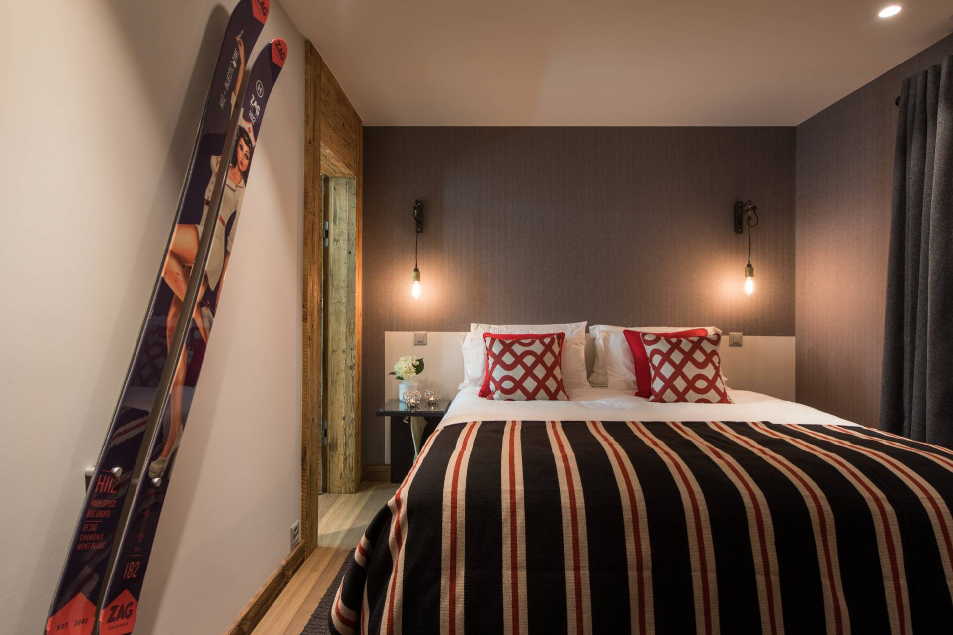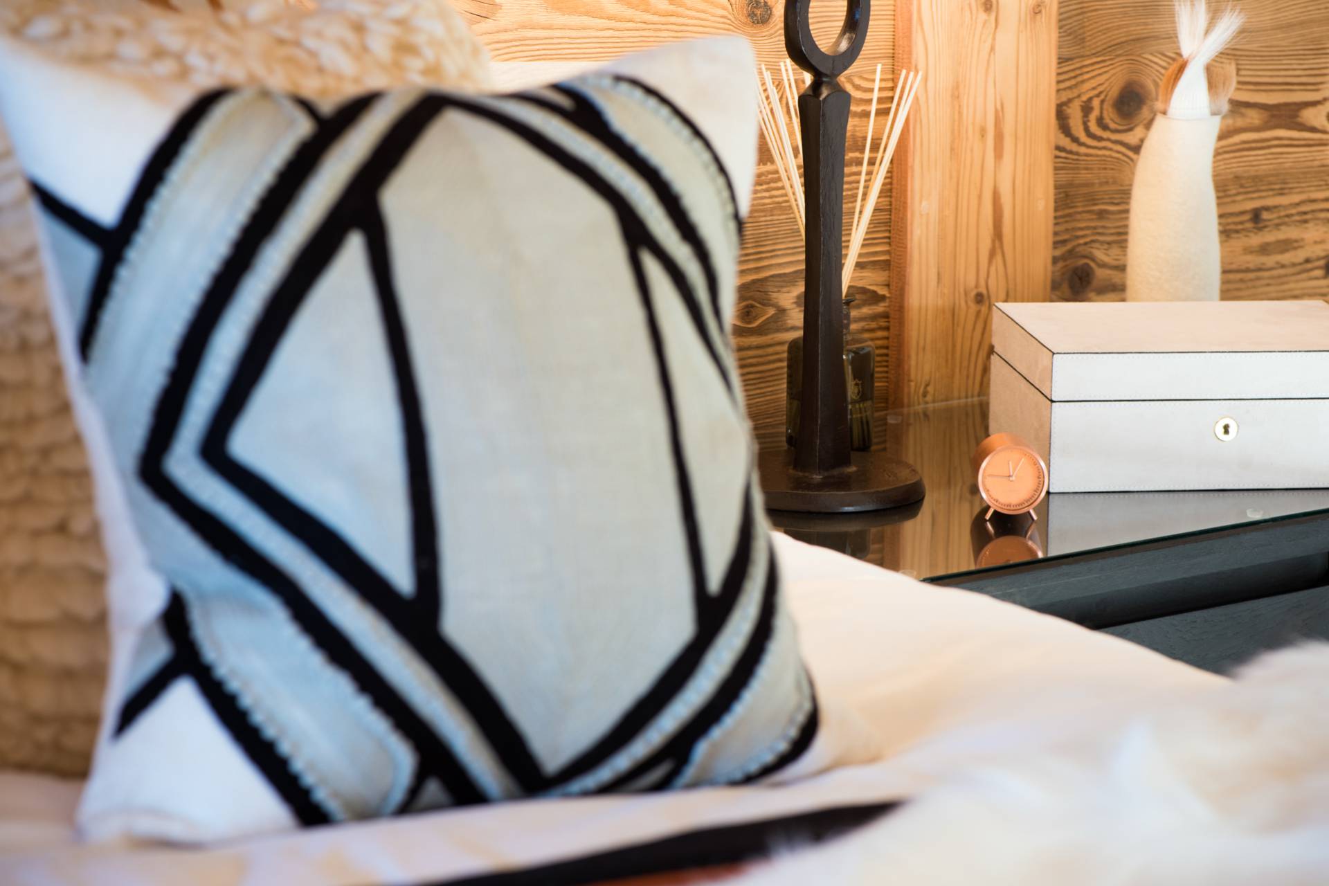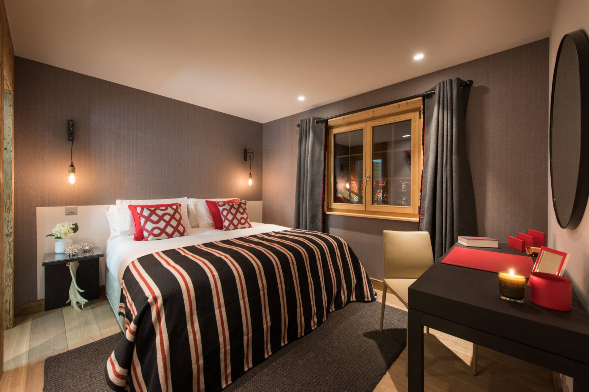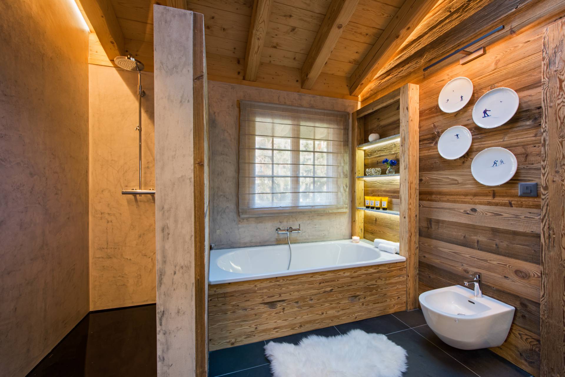 Le deuxième et dernier étage du chalet est entièrement consacré à la suite parentale. Celle-ci est tout simplement somptueuse, pourvue d’un lit King size, d’une télévision à écran plat et d’un dressing. Elle est décorée avec sobriété, égayée par des étoffes aux motifs géométriques et colorés et des couvertures en fourrure soyeuses. Sa salle de bain est grandiose : entièrement parée de bois, elle vous procurera le confort d’un grand lavabo à double vasque, d’une baignoire, d’une douche et de toilettes séparées. Vous pourrez enfin profiter ici de deux balcons privés, avec des perspectives remarquables sur les sommets enneigés.