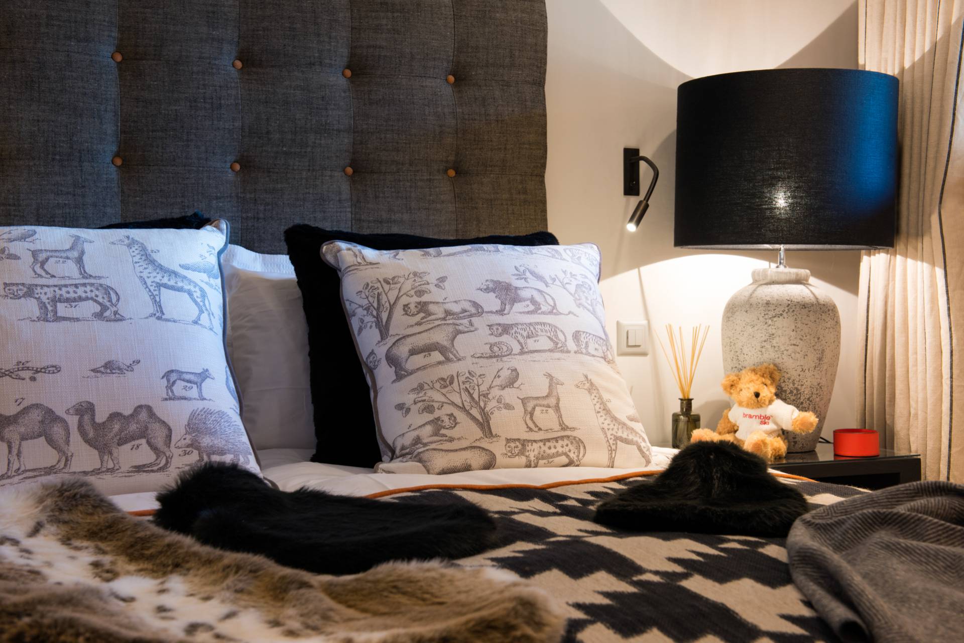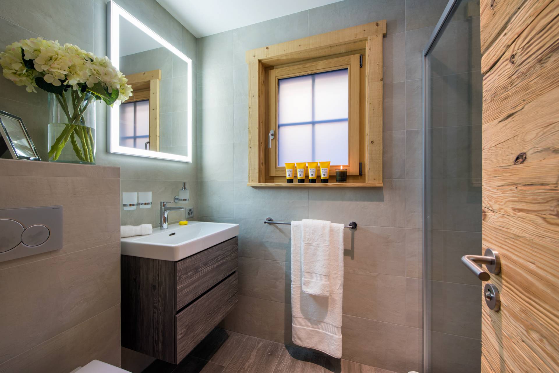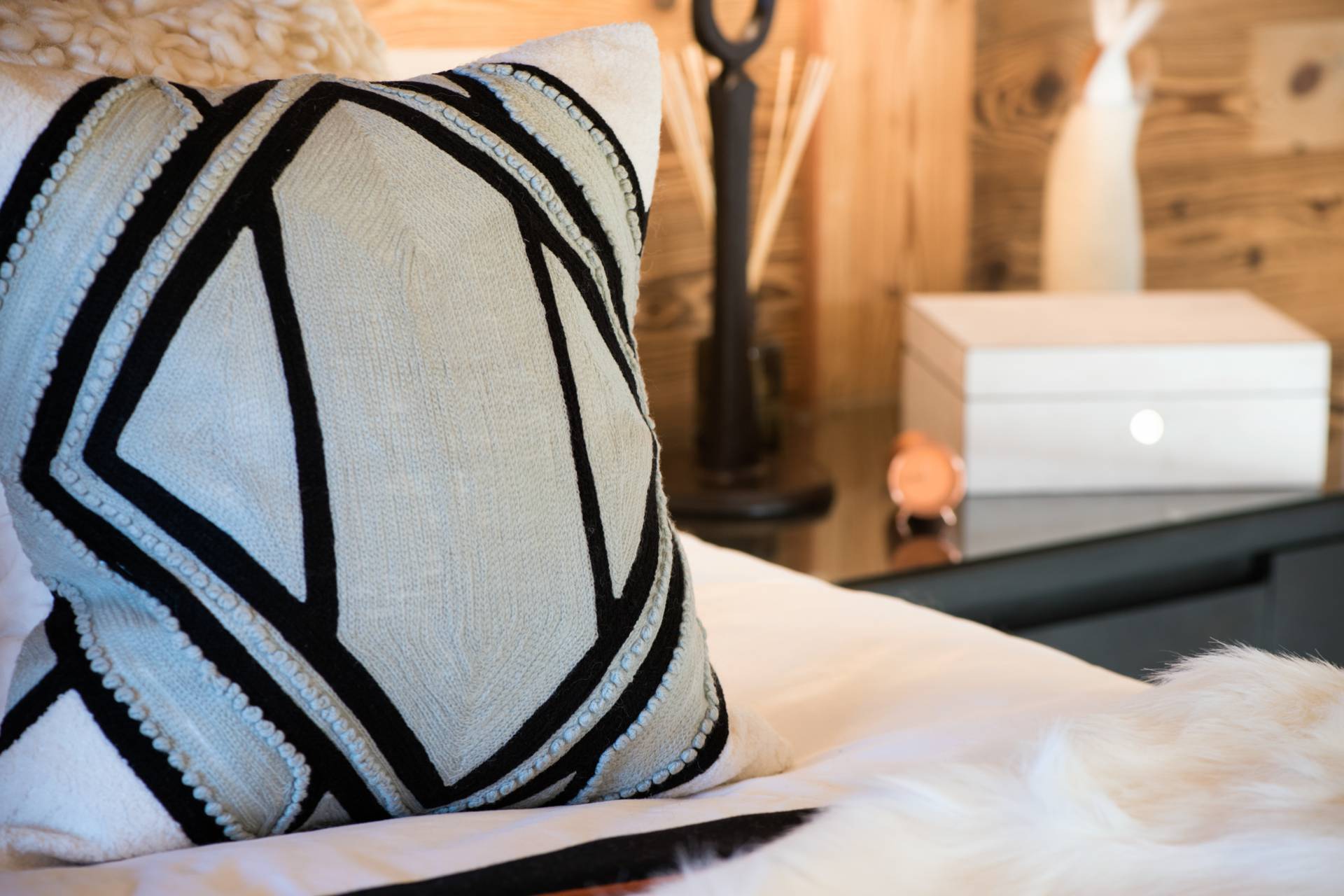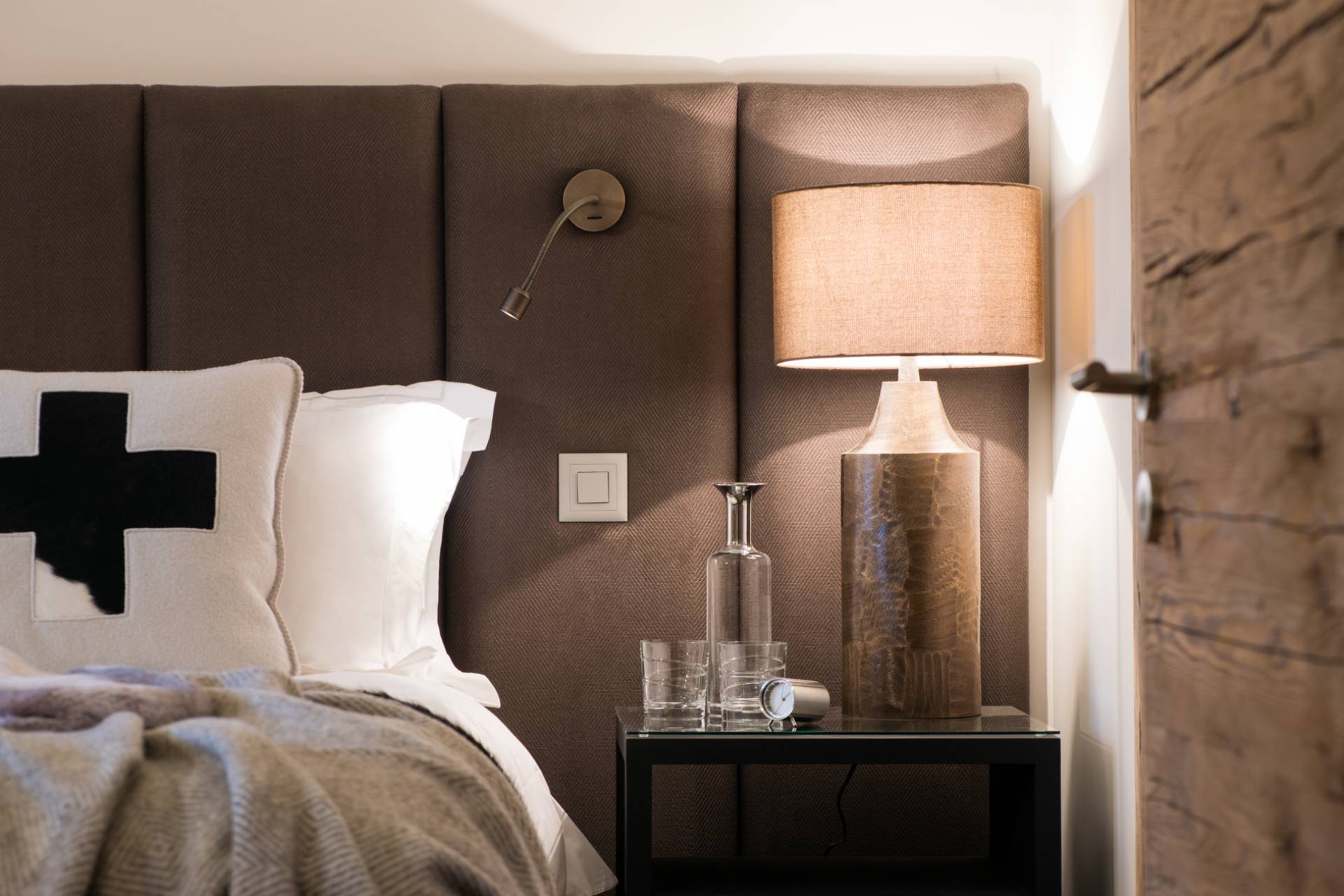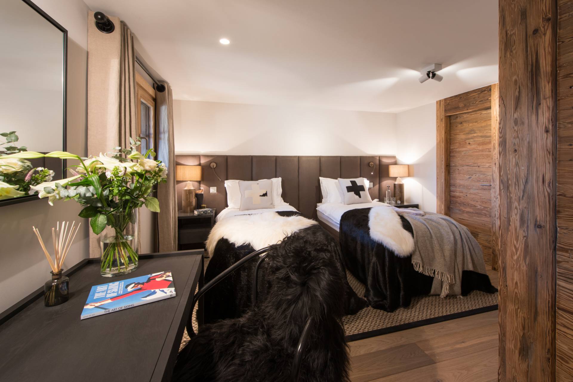 Le deuxième et dernier étage du chalet est entièrement consacré à la suite parentale. Celle-ci est tout simplement somptueuse, pourvue d’un lit King size, d’une télévision à écran plat et d’un dressing. Elle est décorée avec sobriété, égayée par des étoffes aux motifs géométriques et colorés et des couvertures en fourrure soyeuses. Sa salle de bain est grandiose : entièrement parée de bois, elle vous procurera le confort d’un grand lavabo à double vasque, d’une baignoire, d’une douche et de toilettes séparées. Vous pourrez enfin profiter ici de deux balcons privés, avec des perspectives remarquables sur les sommets enneigés.