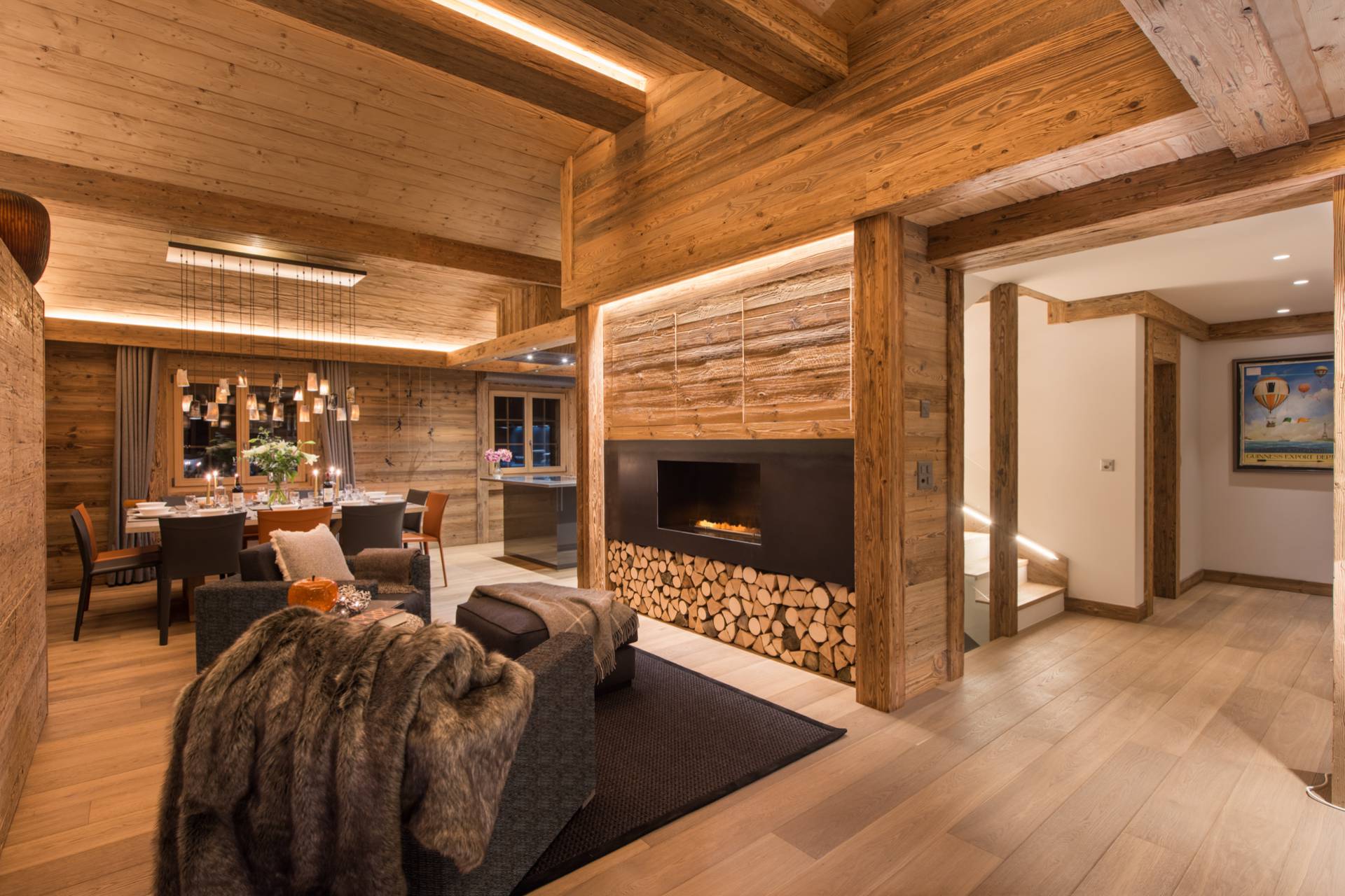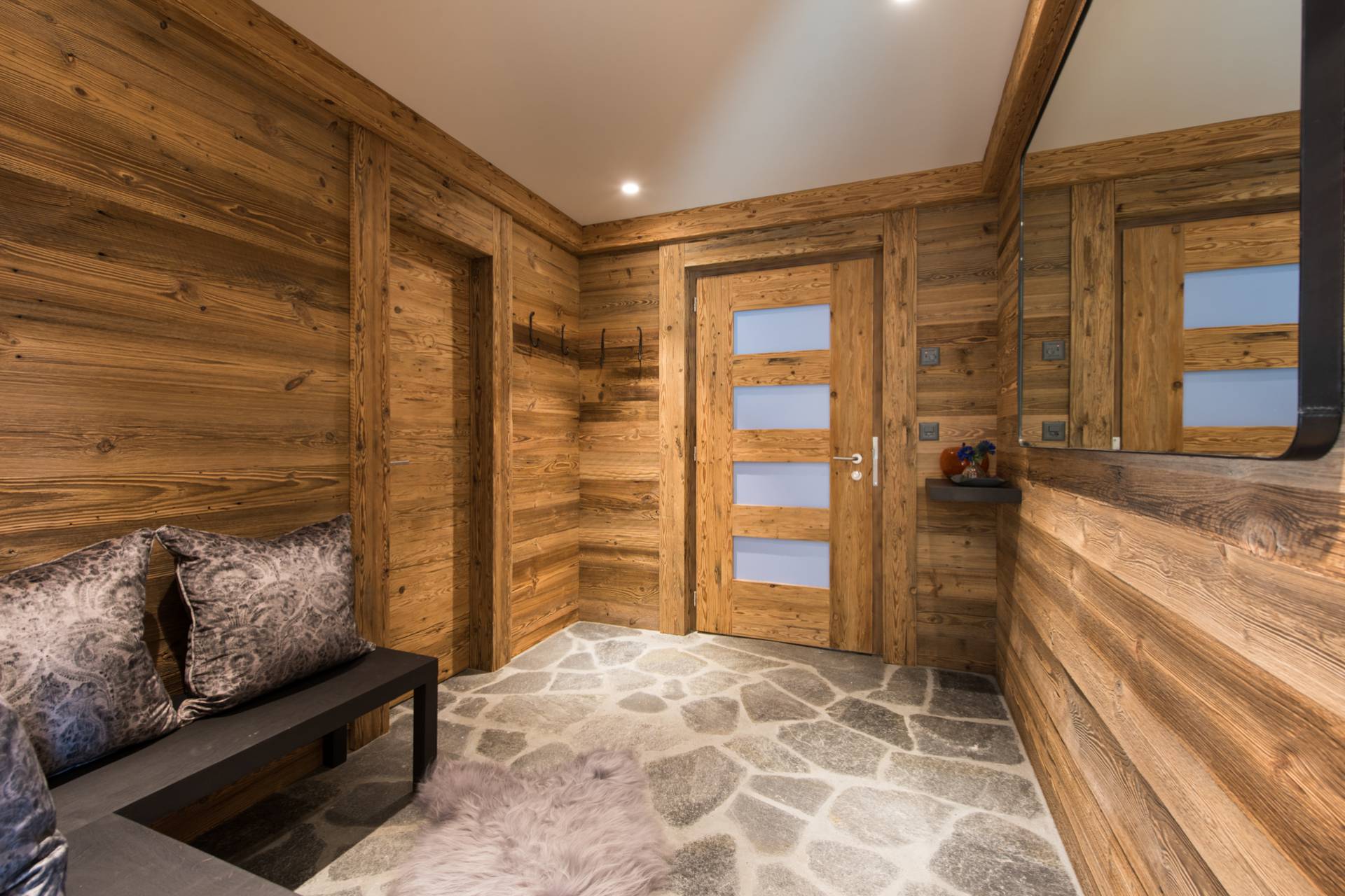 Vous entrerez dans le chalet par le rez-de-chaussée, où vous trouverez le garage (avec deux places de parking) et le local à skis où vous déposerez vos affaires dans les vestiaires et armoires à chaussures chauffantes prévus à cet effet. Passé le seuil de la porte, vous apprécierez d’emblée le luxe et le raffinement de la décoration de la propriété. D’inspiration alpine, l’architecture fait la part belle au bois et à la pierre apparente, dans une ambiance résolument moderne.