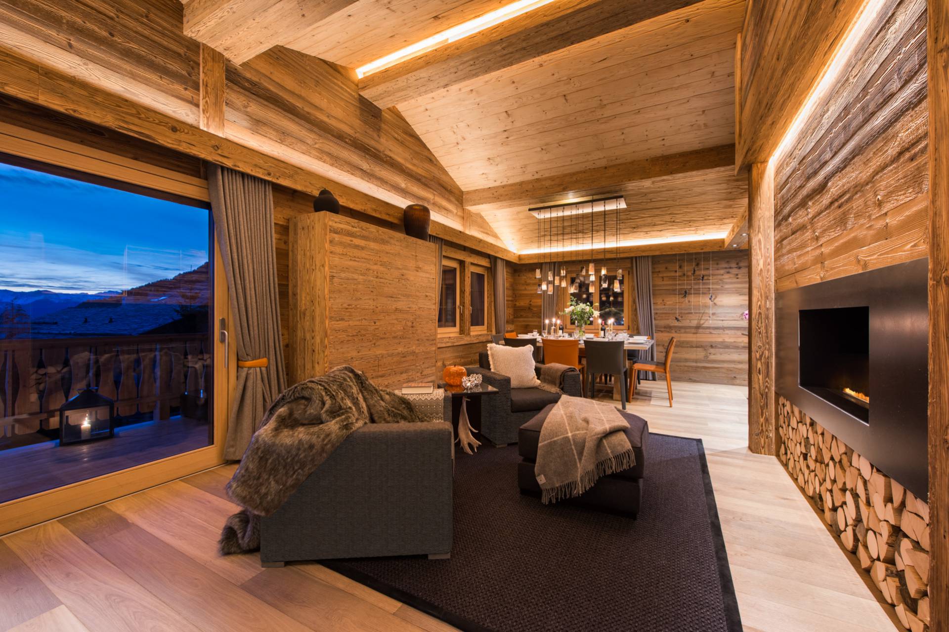 En montant au premier étage, vous découvrirez le niveau principal du chalet auquel on peut accéder directement par les escaliers extérieurs. Une immense pièce à vivre se divise en salon, salle à manger et cuisine ouverte, bordée par une superbe terrasse meublée pour partager repas et moments de convivialité à l’extérieur, face à un panorama éblouissant. Sous la charpente, une cheminée design bio à l’éthanol diffuse une douce chaleur. Vous pourrez vous lover dans de confortables fauteuils au coin du feu tandis que d’autres préfèreront se détendre dans le large canapé en angle devant un bon film.