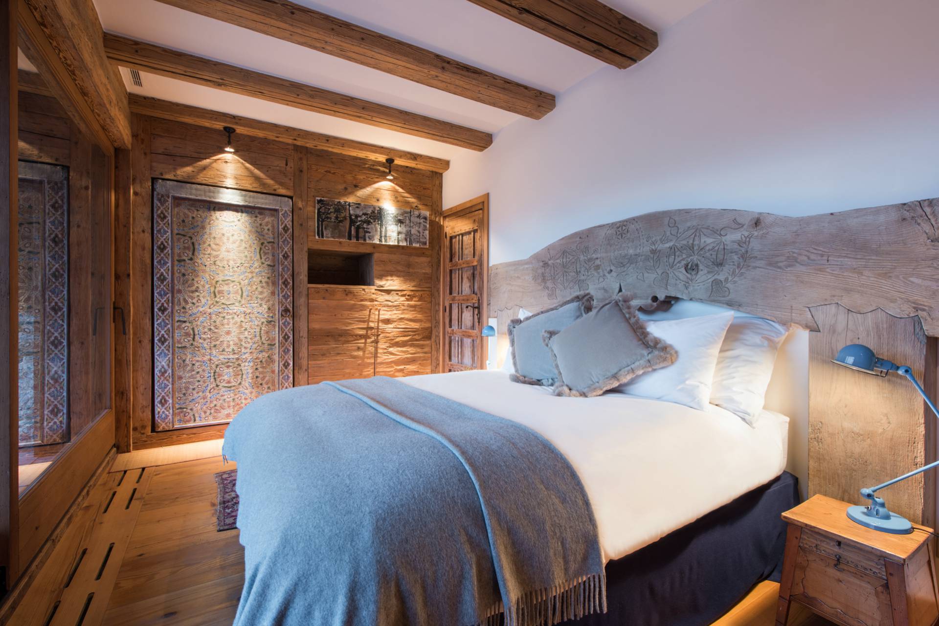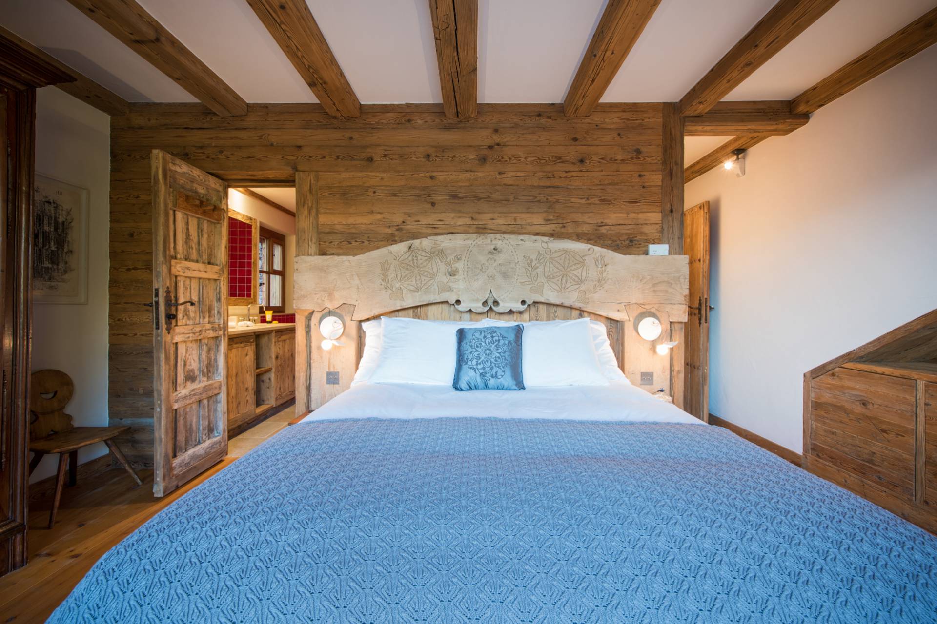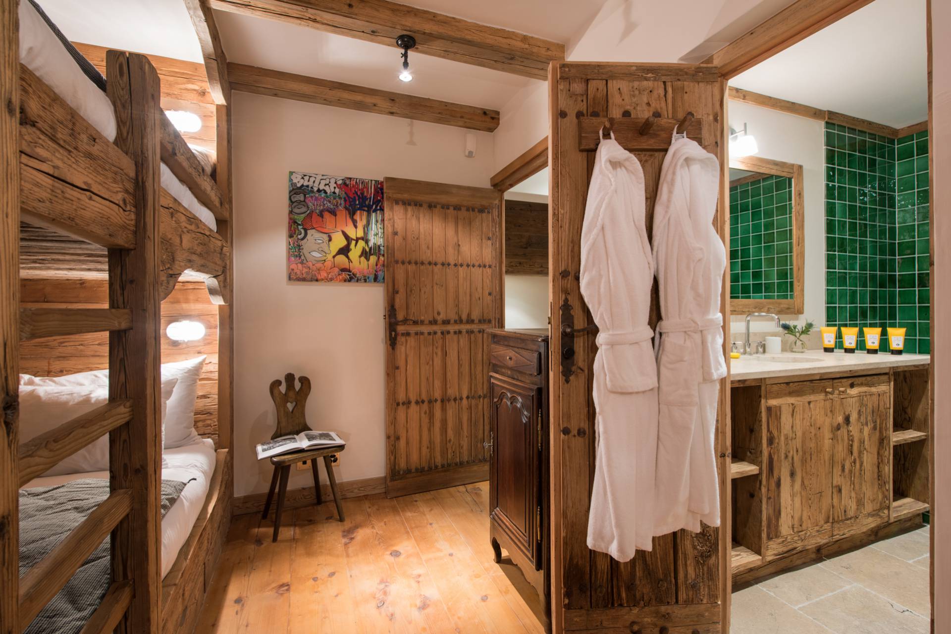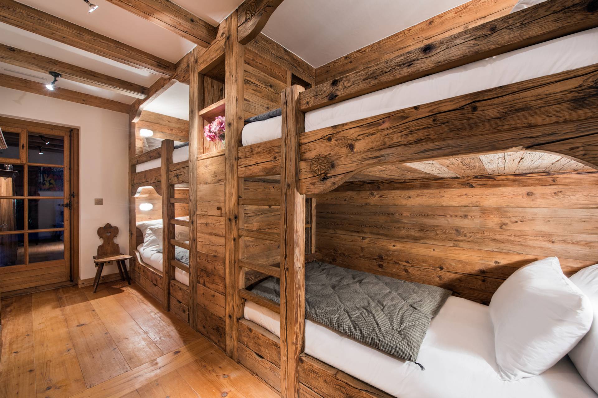 Une seconde famille pourra habiter le niveau supérieur, dans une chambre double ayant également accès à la terrasse et une seconde chambre pour enfants, celle-ci équipée de quatre lits superposés. Toutes deux disposent de salles de bain privées. Dans ce chalet, chaque chambre à sa décoration singulière et son propre caractère, selon un goût impeccable.