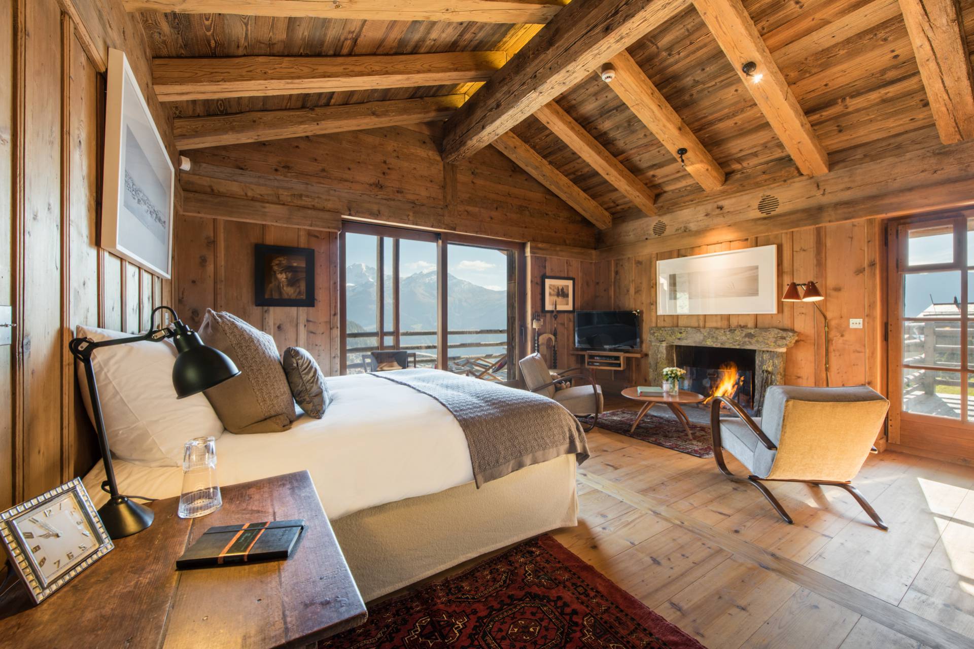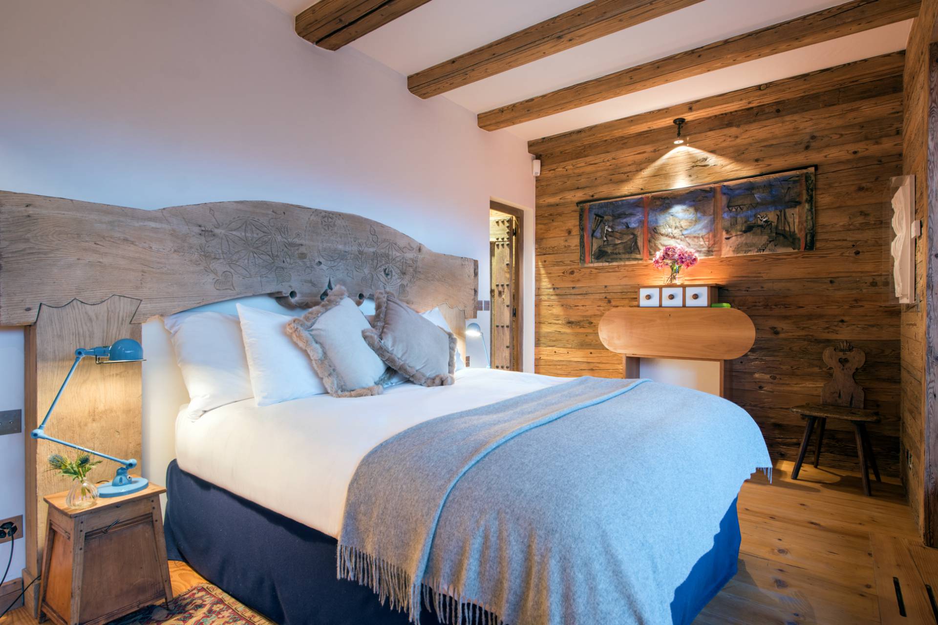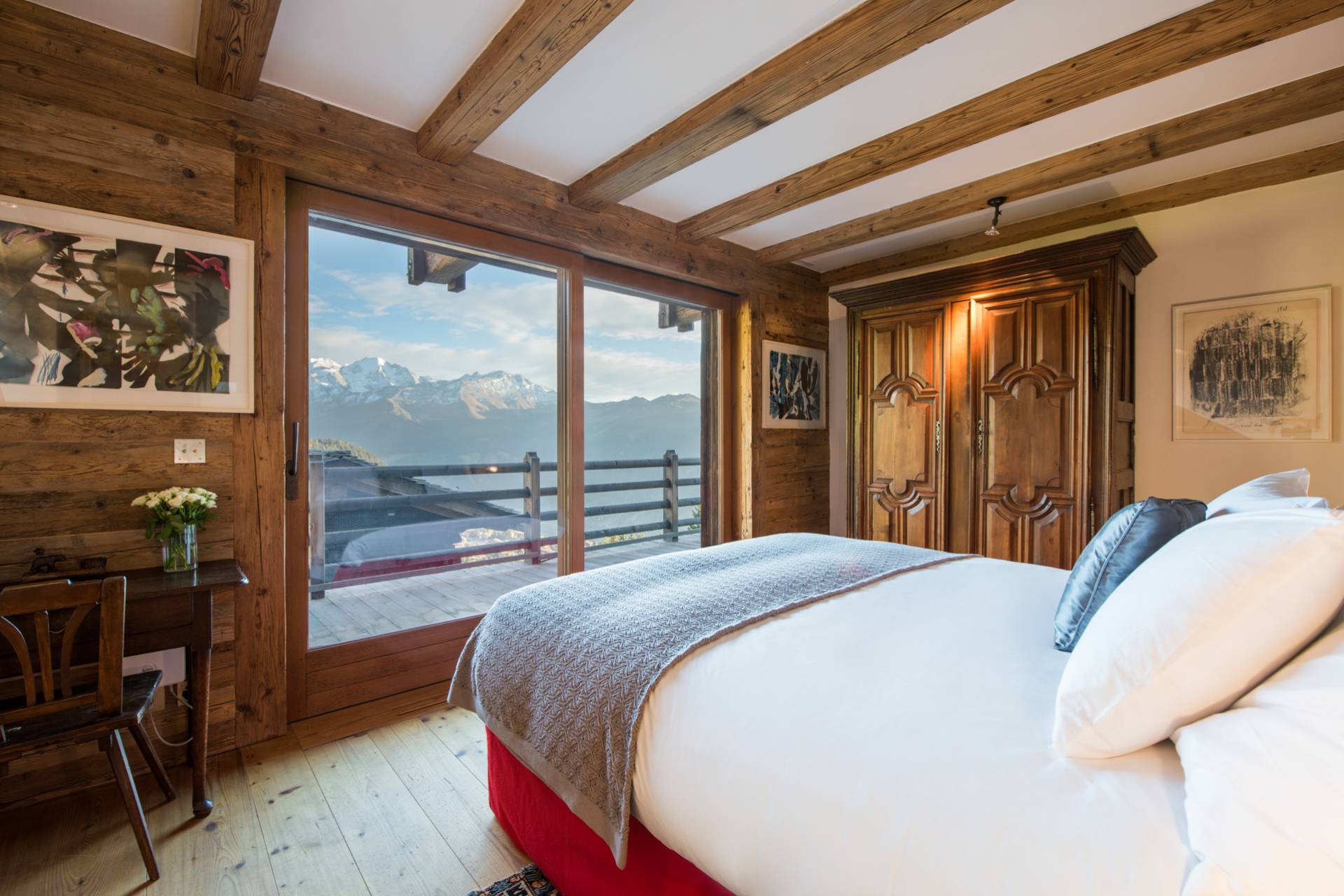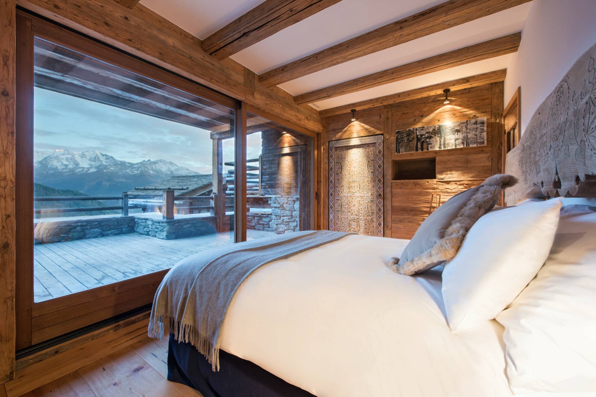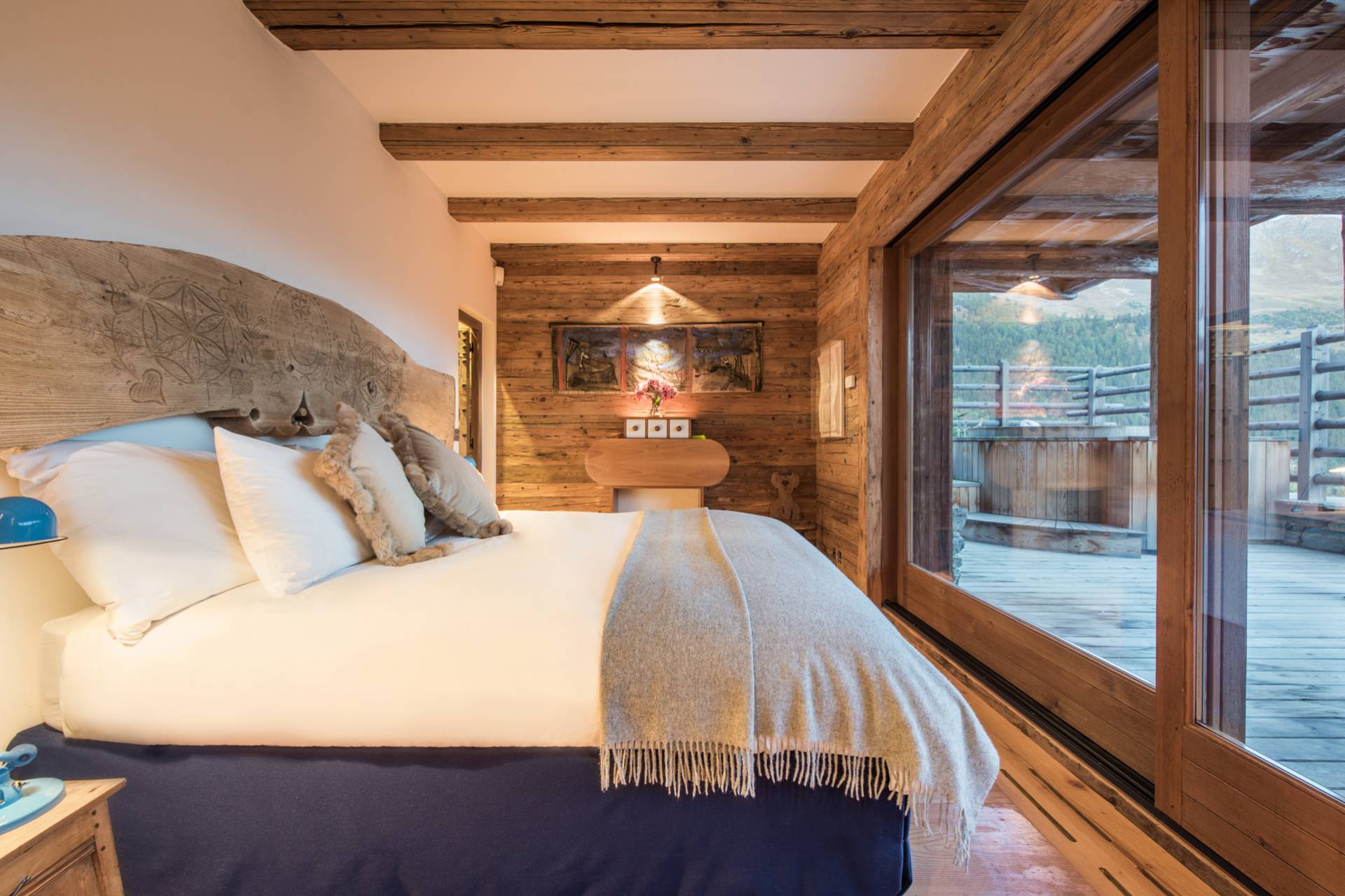 Une seconde famille pourra habiter le niveau supérieur, dans une chambre double ayant également accès à la terrasse et une seconde chambre pour enfants, celle-ci équipée de quatre lits superposés. Toutes deux disposent de salles de bain privées. Dans ce chalet, chaque chambre à sa décoration singulière et son propre caractère, selon un goût impeccable.