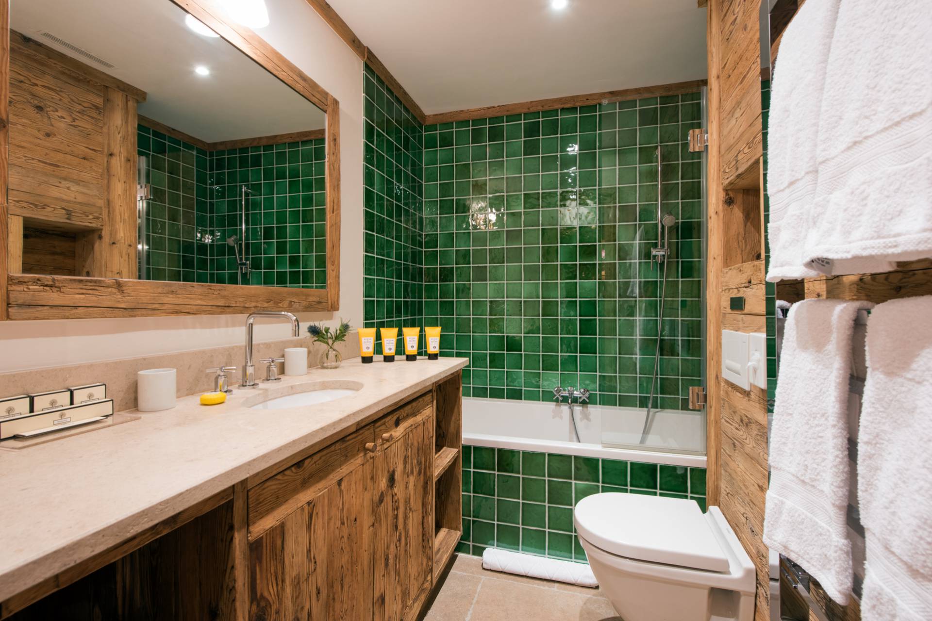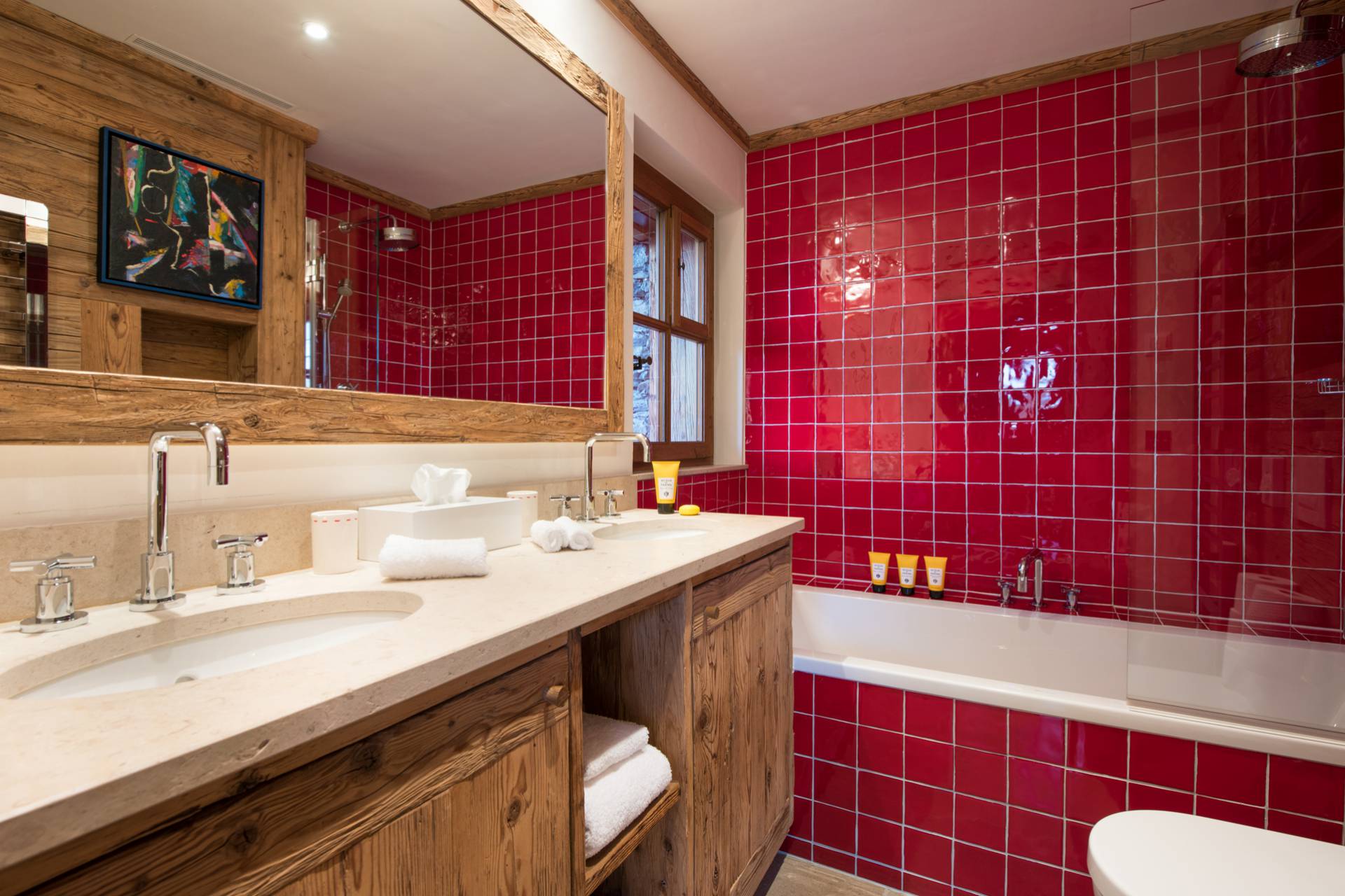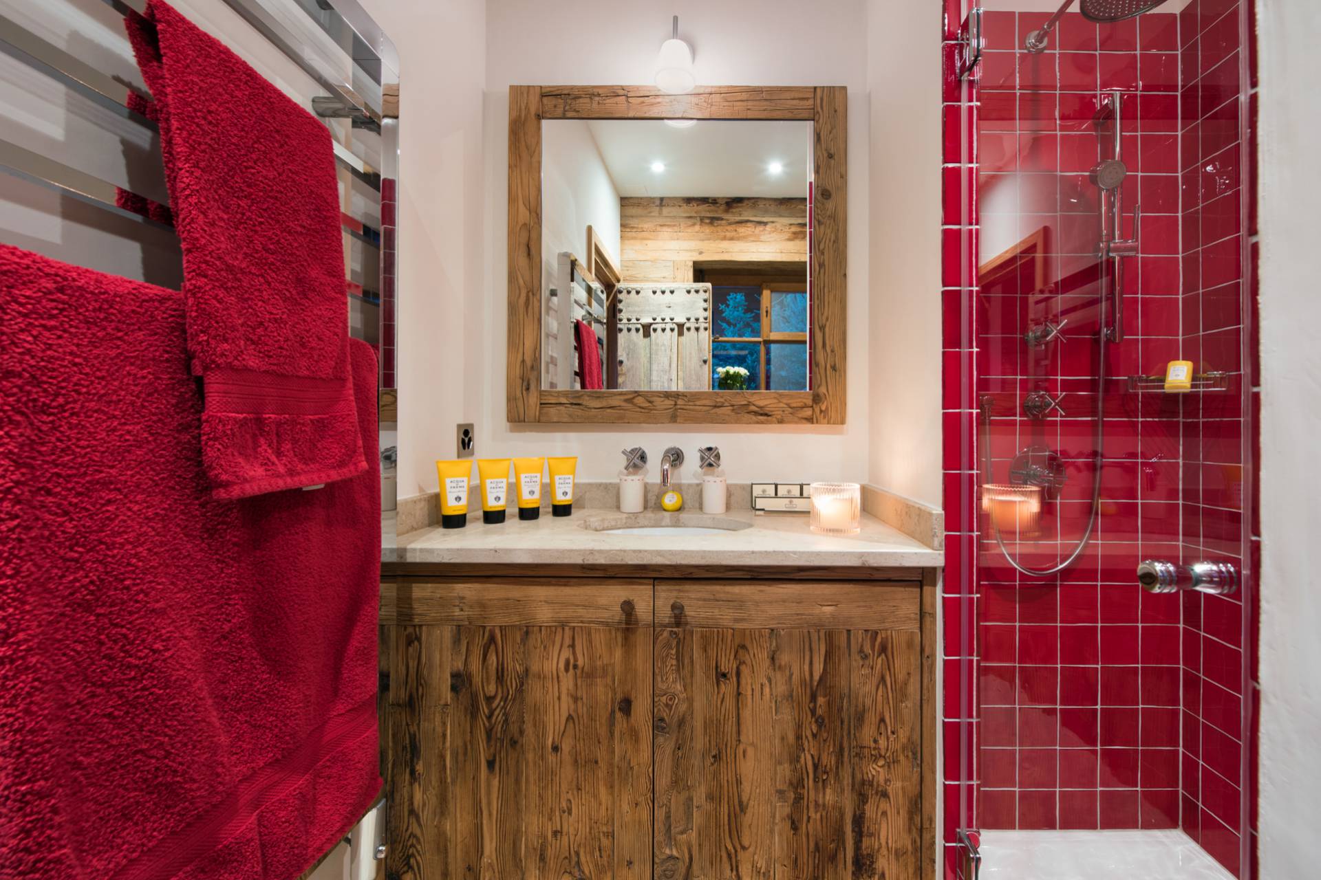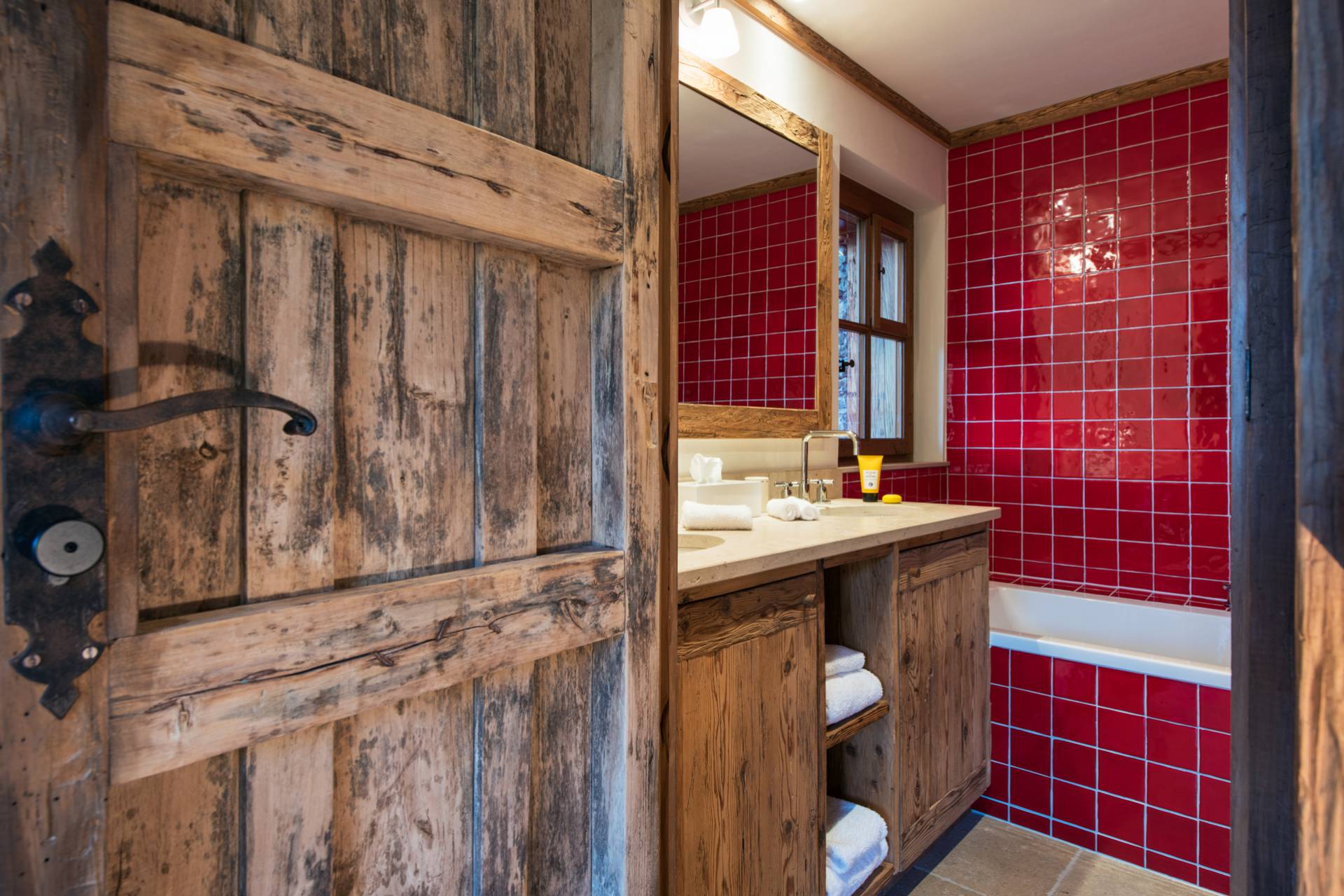 Une seconde famille pourra habiter le niveau supérieur, dans une chambre double ayant également accès à la terrasse et une seconde chambre pour enfants, celle-ci équipée de quatre lits superposés. Toutes deux disposent de salles de bain privées. Dans ce chalet, chaque chambre à sa décoration singulière et son propre caractère, selon un goût impeccable.