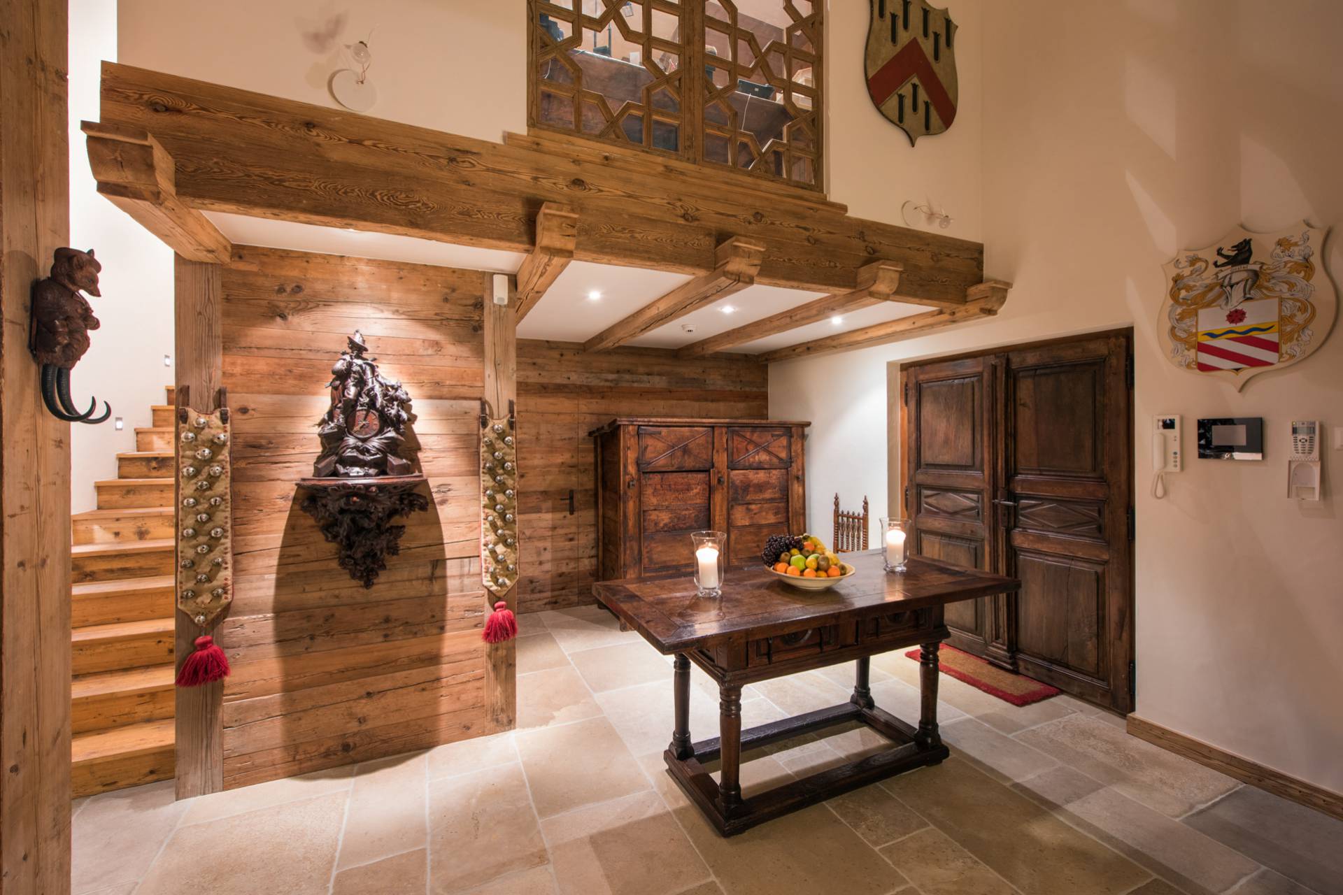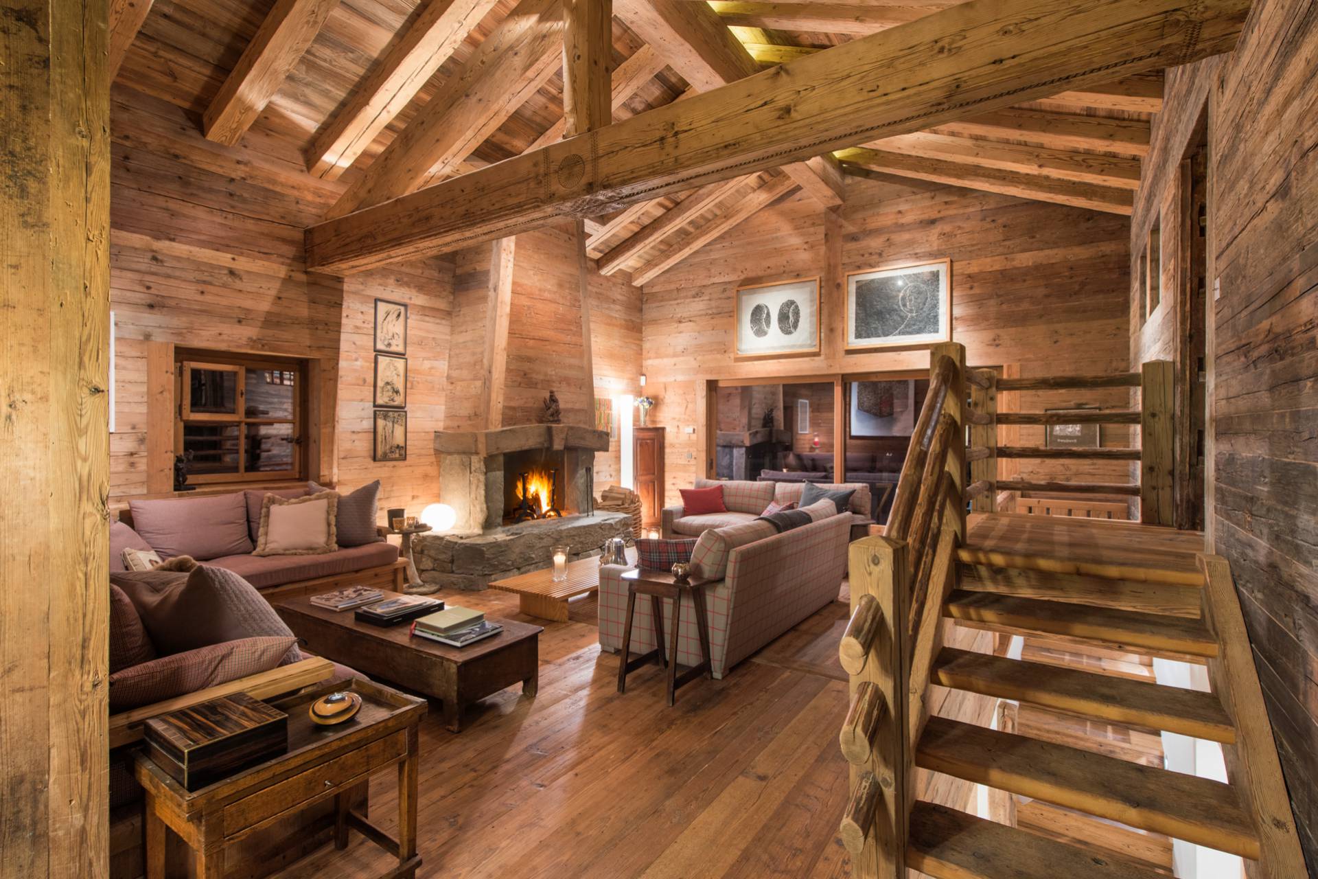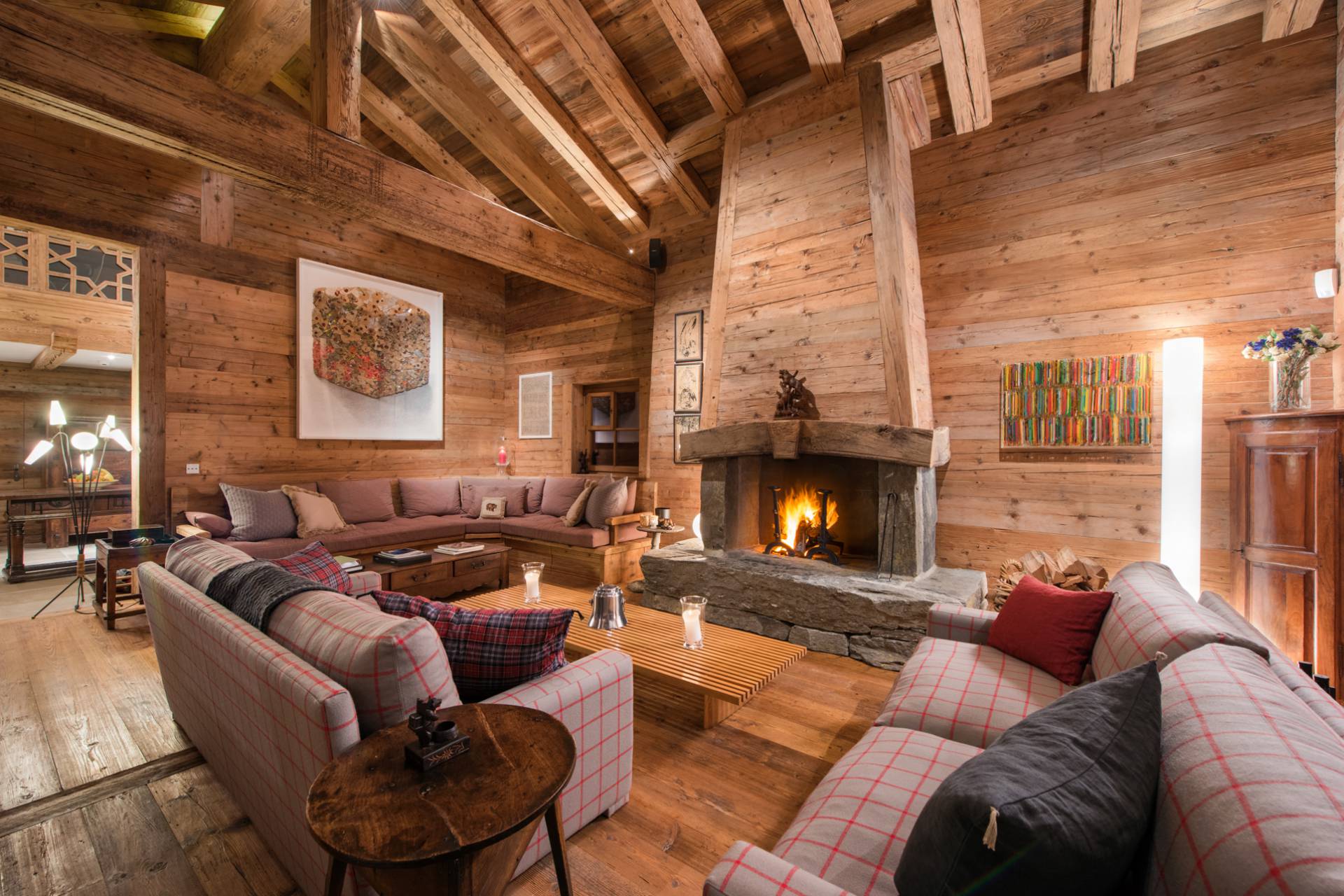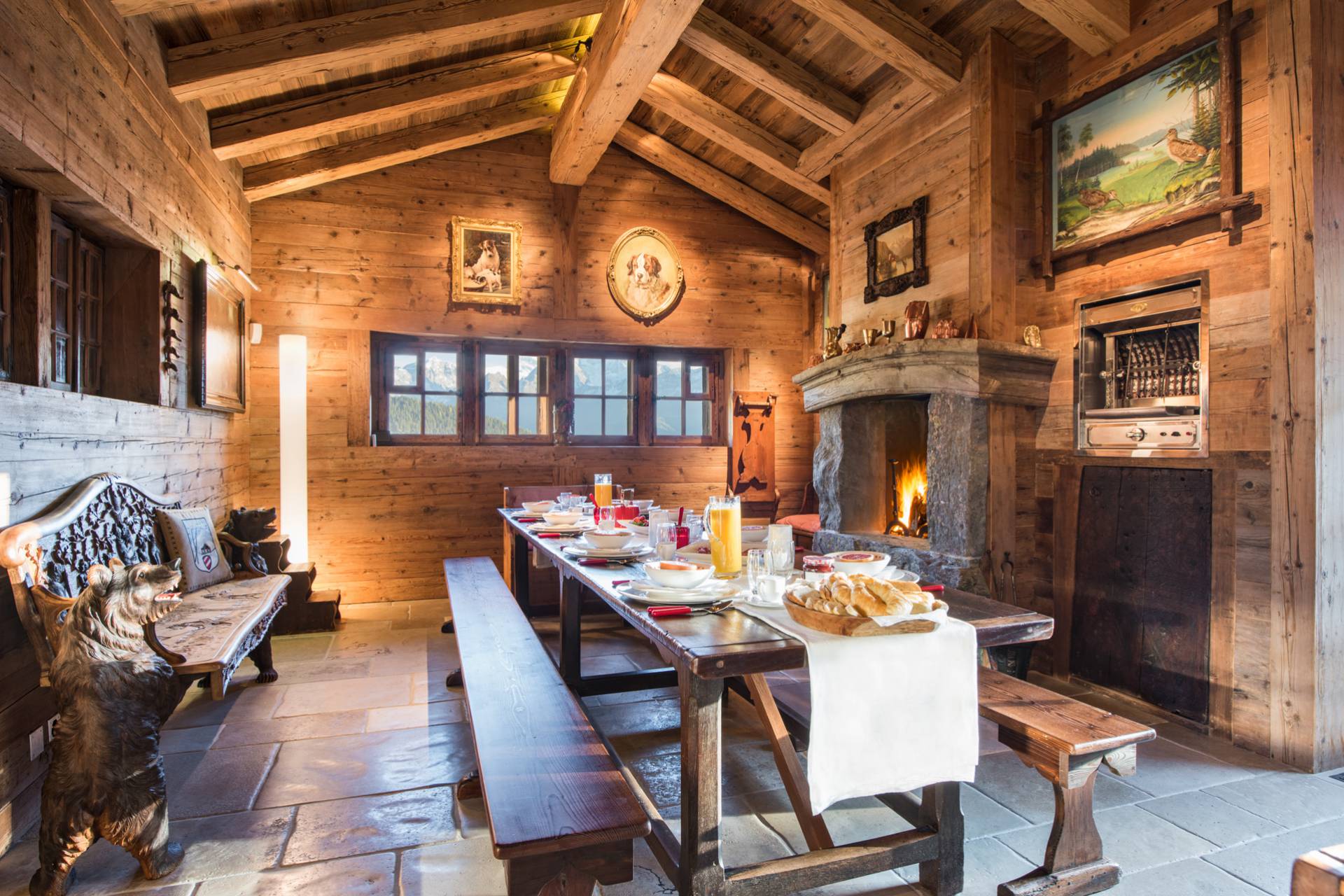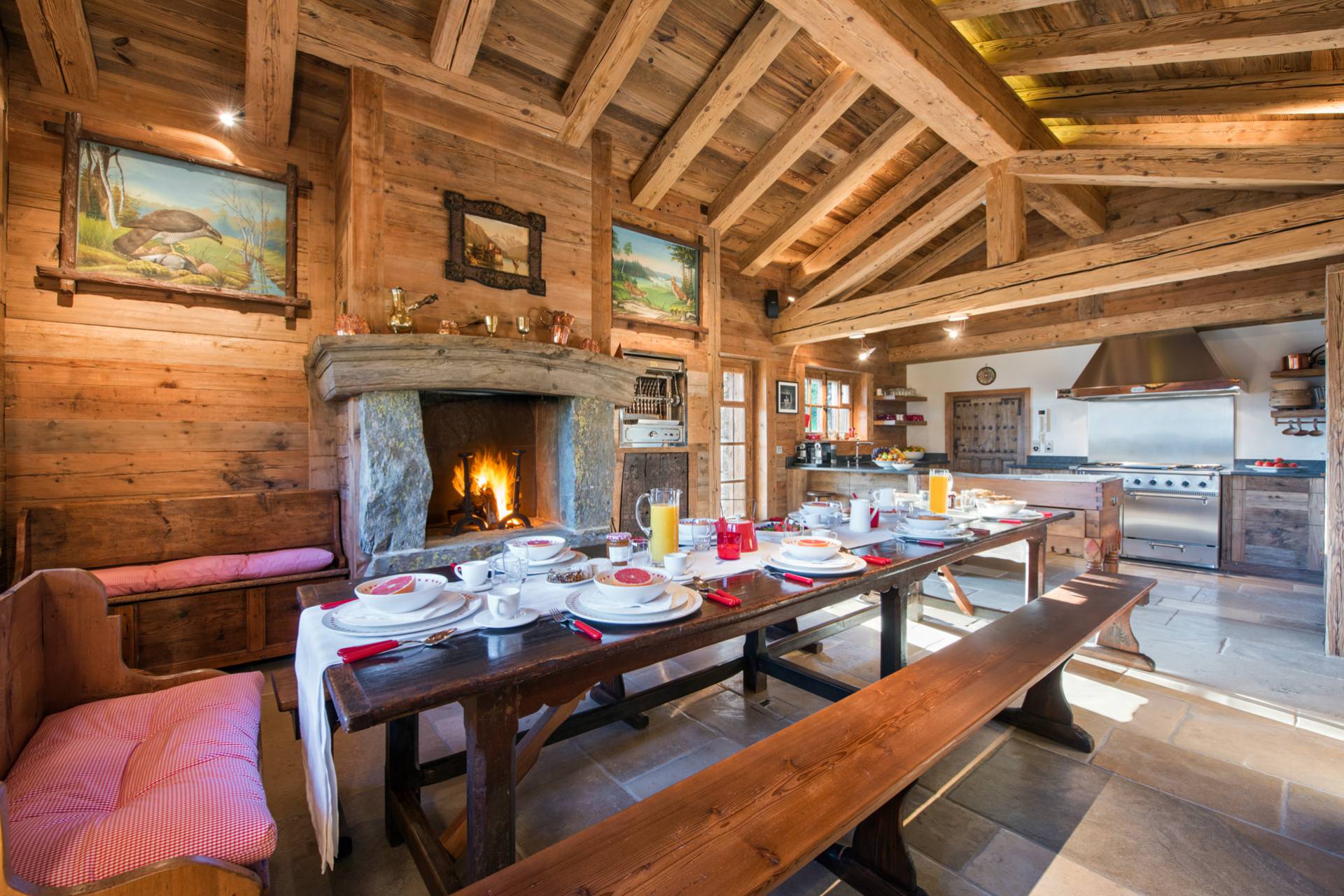 La grande pièce à vivre se déploie au troisième étage. Sous l’impressionnante charpente en bois massif, les canapés du salon font face au foyer d’une imposante cheminée rustique. La décoration fait ici la part belle au bois et à la pierre naturelle. Vous admirerez la collection éclectique d’objets du monde entier et d’œuvres d’art ancien et moderne qui ornent le chalet et lui confère une atmosphère unique. L’ensemble dialogue avec un mobilier traditionnel choisi, en harmonie avec le travail de menuiserie et de ferronnerie typique de la région. Côté salle à manger, vous pourrez vous réunir en nombre au coin d’une deuxième cheminée, dans une ambiance campagne chic, tout près d’une cuisine inspirée des fermes d’autrefois, pourvue d’un authentique four à rôtir.