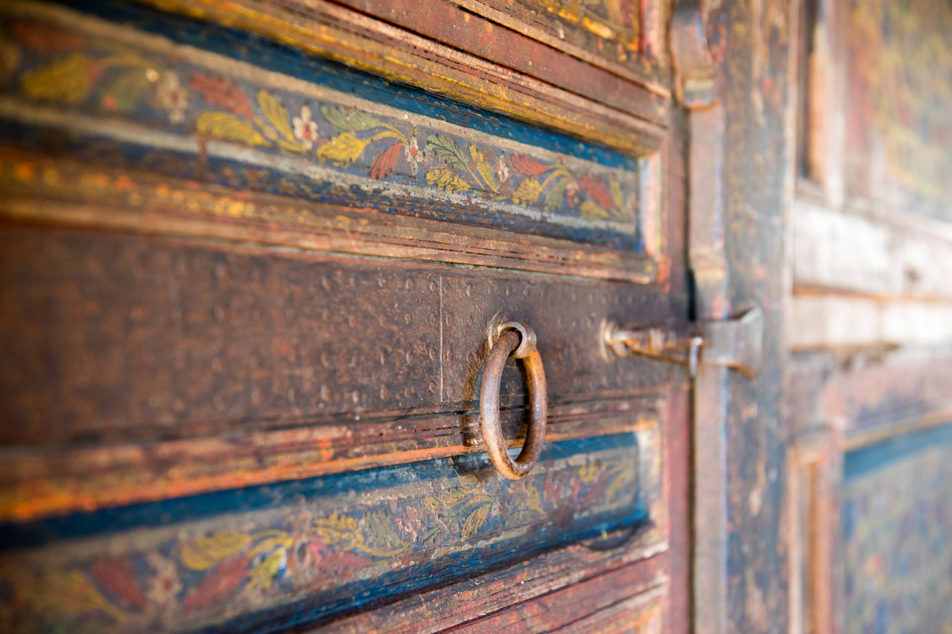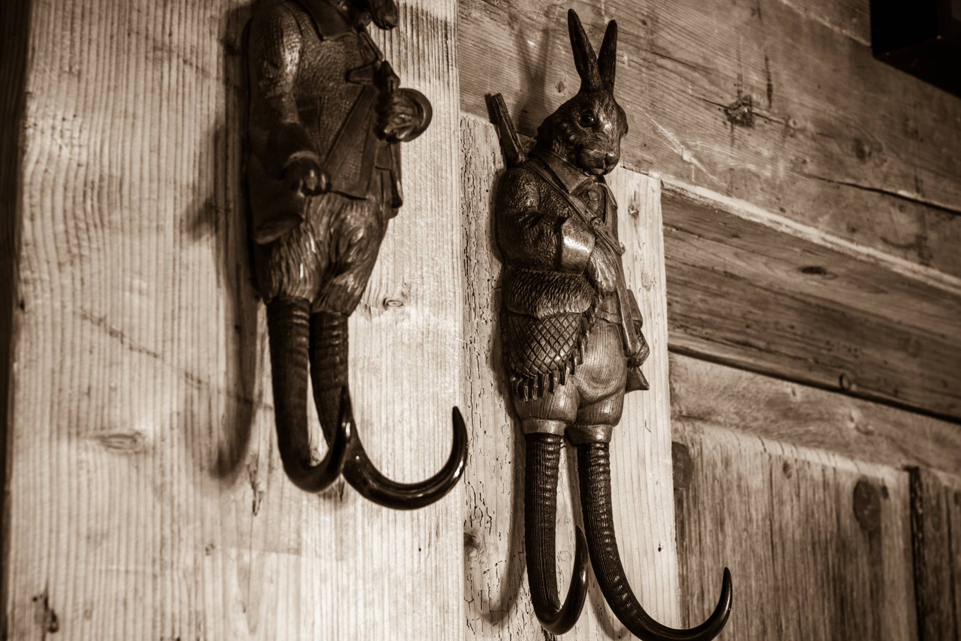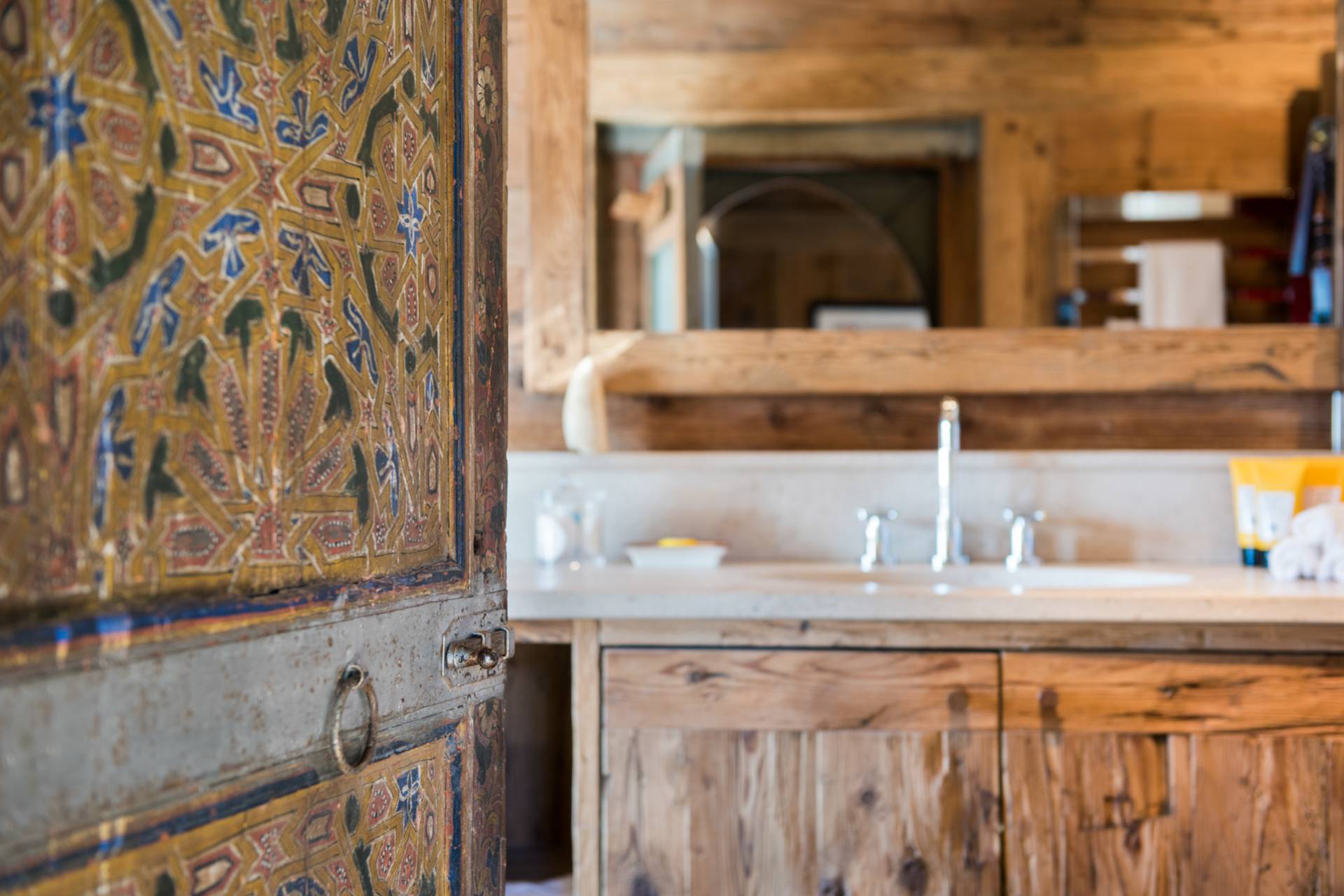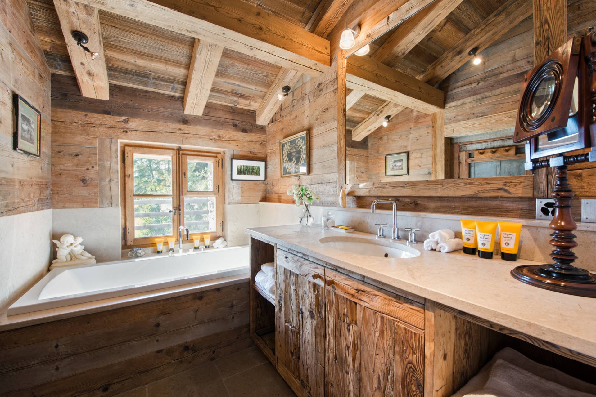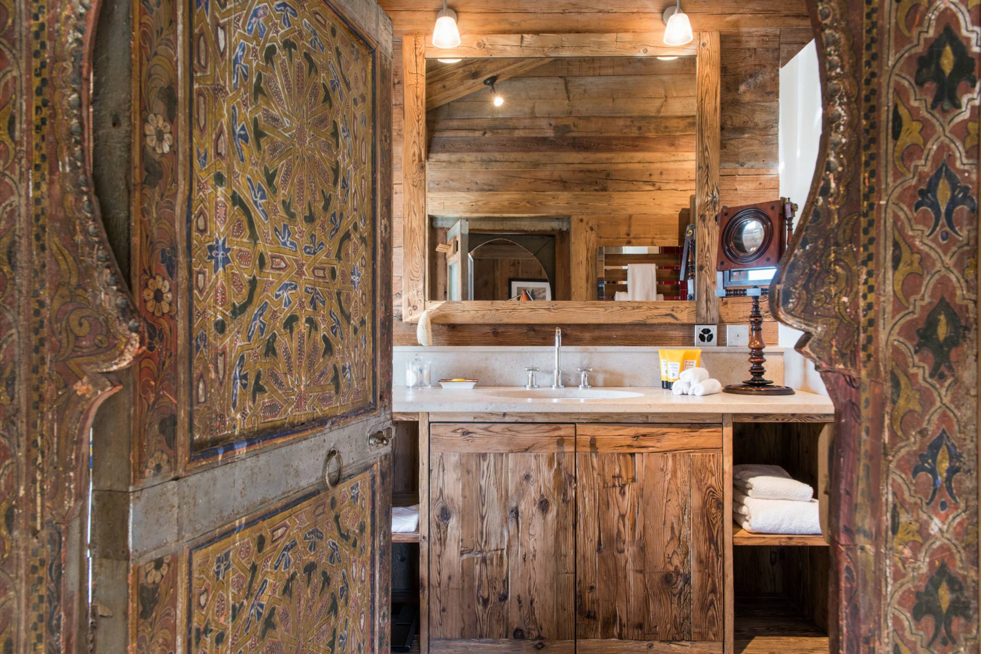La grande pièce à vivre se déploie au troisième étage. Sous l’impressionnante charpente en bois massif, les canapés du salon font face au foyer d’une imposante cheminée rustique. La décoration fait ici la part belle au bois et à la pierre naturelle. Vous admirerez la collection éclectique d’objets du monde entier et d’œuvres d’art ancien et moderne qui ornent le chalet et lui confère une atmosphère unique. L’ensemble dialogue avec un mobilier traditionnel choisi, en harmonie avec le travail de menuiserie et de ferronnerie typique de la région. Côté salle à manger, vous pourrez vous réunir en nombre au coin d’une deuxième cheminée, dans une ambiance campagne chic, tout près d’une cuisine inspirée des fermes d’autrefois, pourvue d’un authentique four à rôtir.