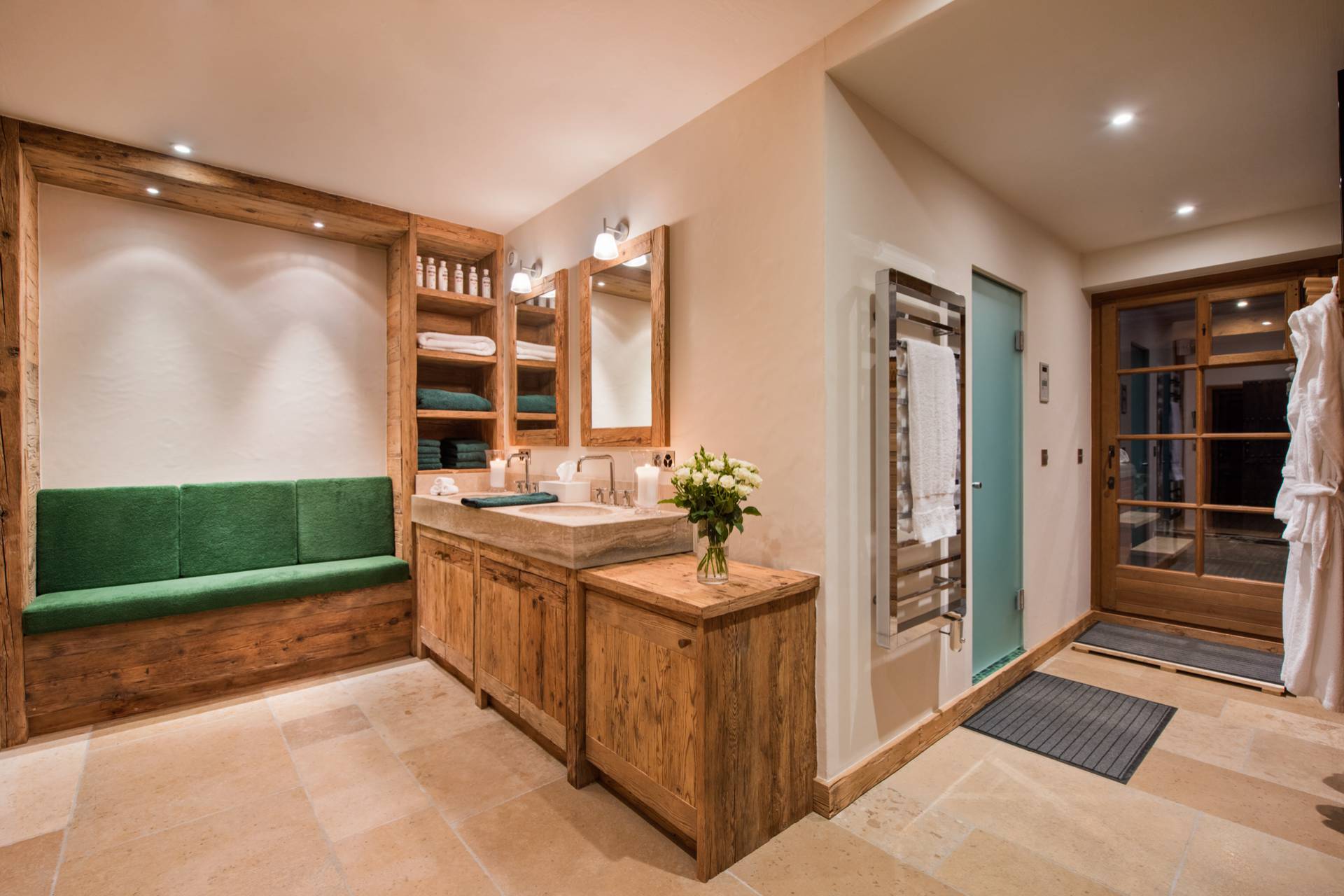 Vous entrez dans la propriété par le garage souterrain faisant également office de rez-de-chaussée, qui abrite un local à skis équipé d’une armoire à chaussures chauffantes ainsi qu’un grand vestiaire avec de nombreux rangements. Des escaliers et un ascenseur desservent l’ensemble du chalet.