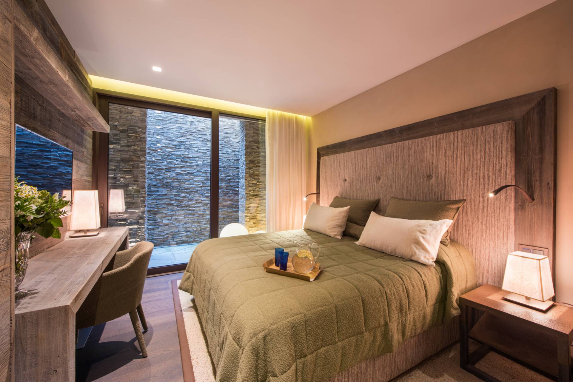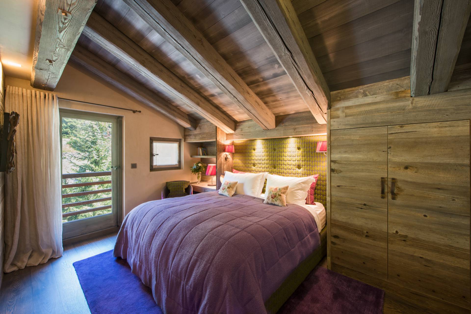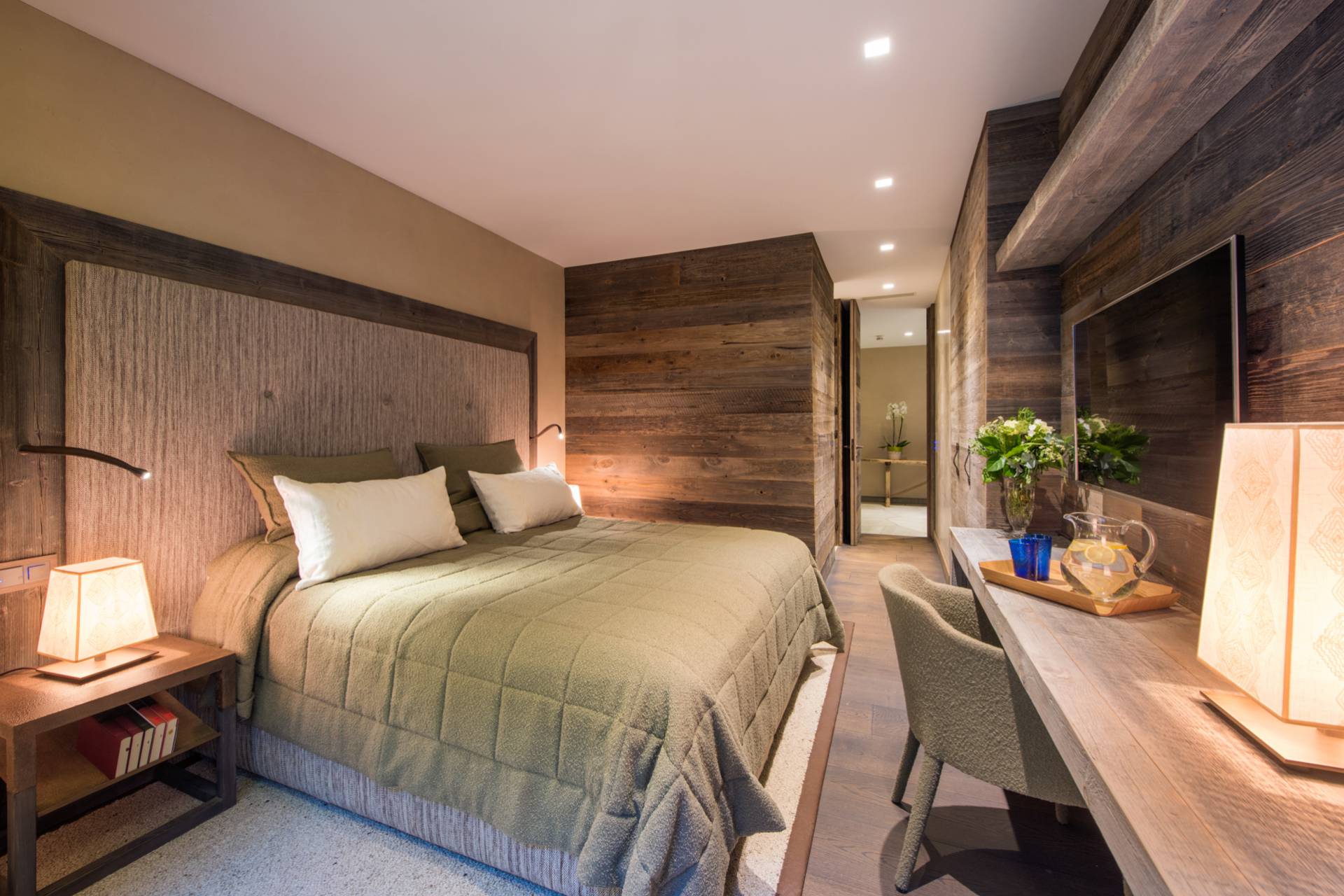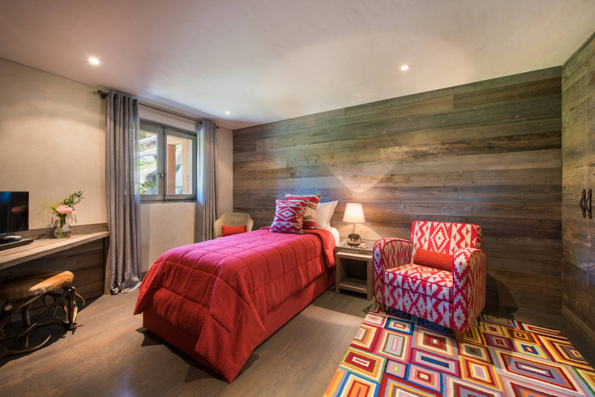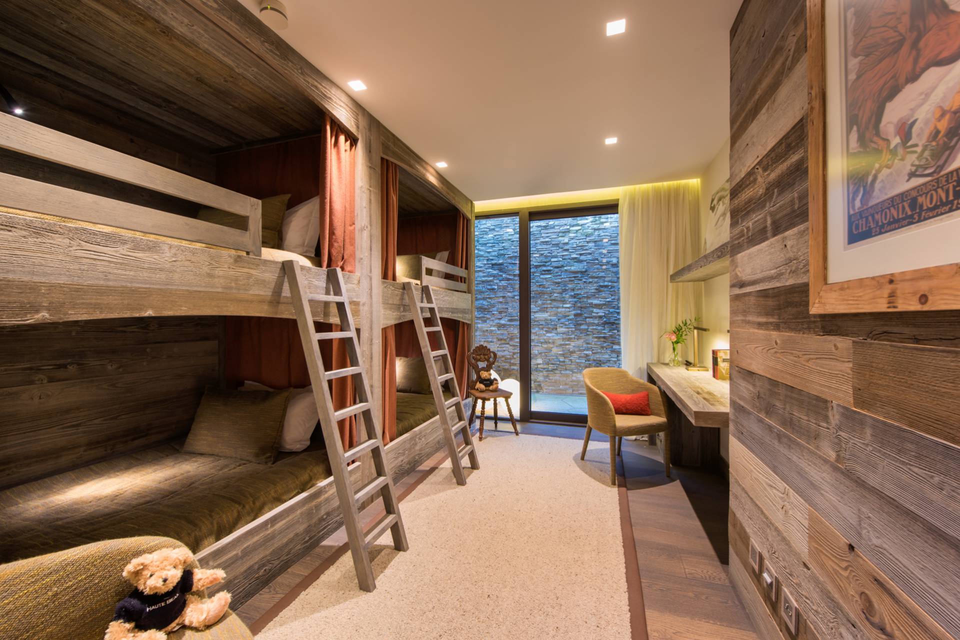 Aux étages inférieurs se répartissent les six autres chambres. Trois d’entre elles sont doubles et facilement modulables grâce à leurs lits jumeaux, avec coin bureau, télévision et salles de bains privées. Vous pourrez également loger l’un de vos invités ou votre jeune fille au pair dans une chambre simple chaleureusement décorée de motifs géométriques colorés. Les enfants auront quant à eux plaisir à coucher dans la chambre qui leur est réservée, équipée de quatre lits superposés dans l’esprit typique de la région. Chaque chambre est dotée d’un mobilier confortable et contemporain (jetés de lits moelleux, tapis épais, coussins feutrés), avec chacune leur propre couleur et de larges ouvertures sur les montagnes environnantes.