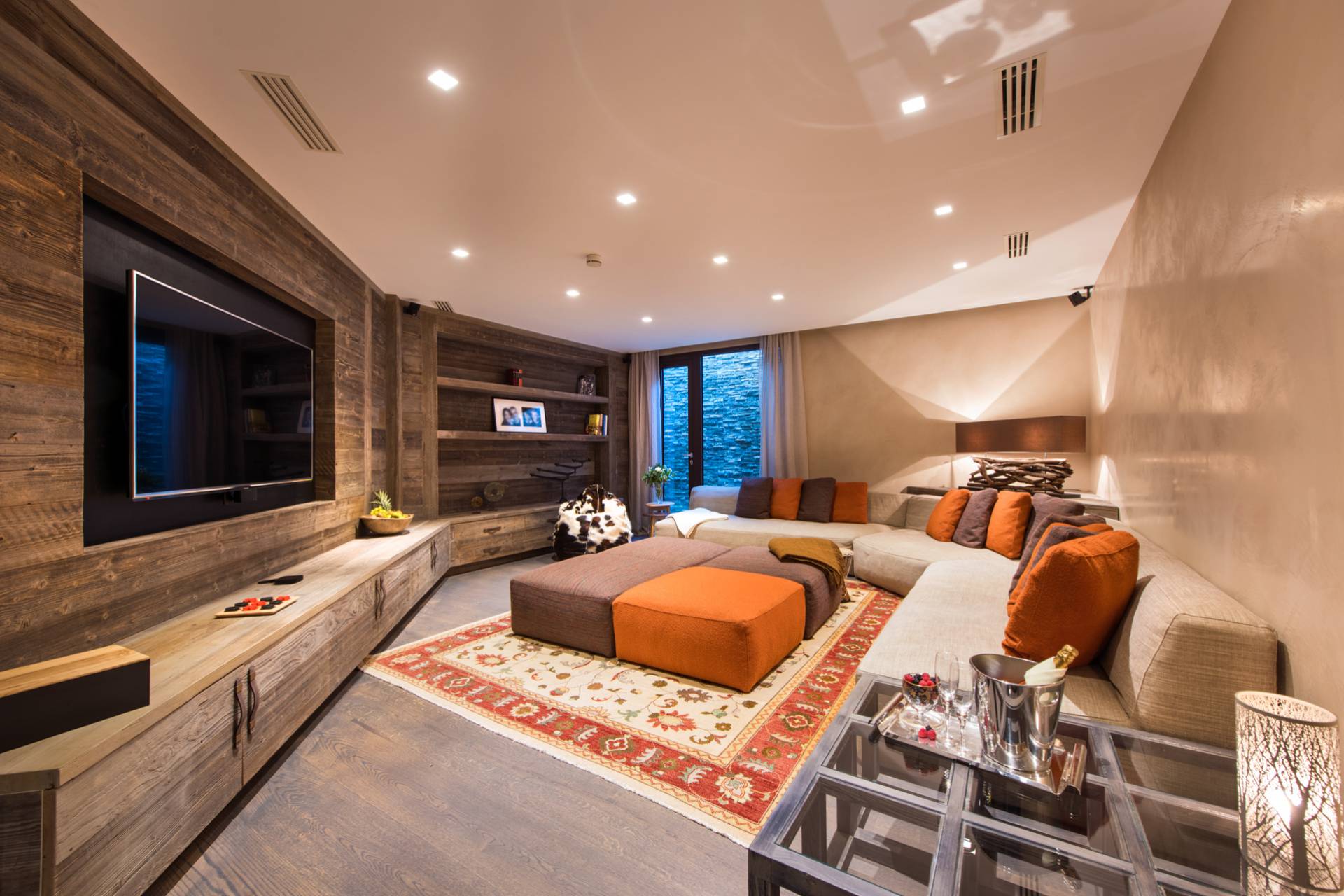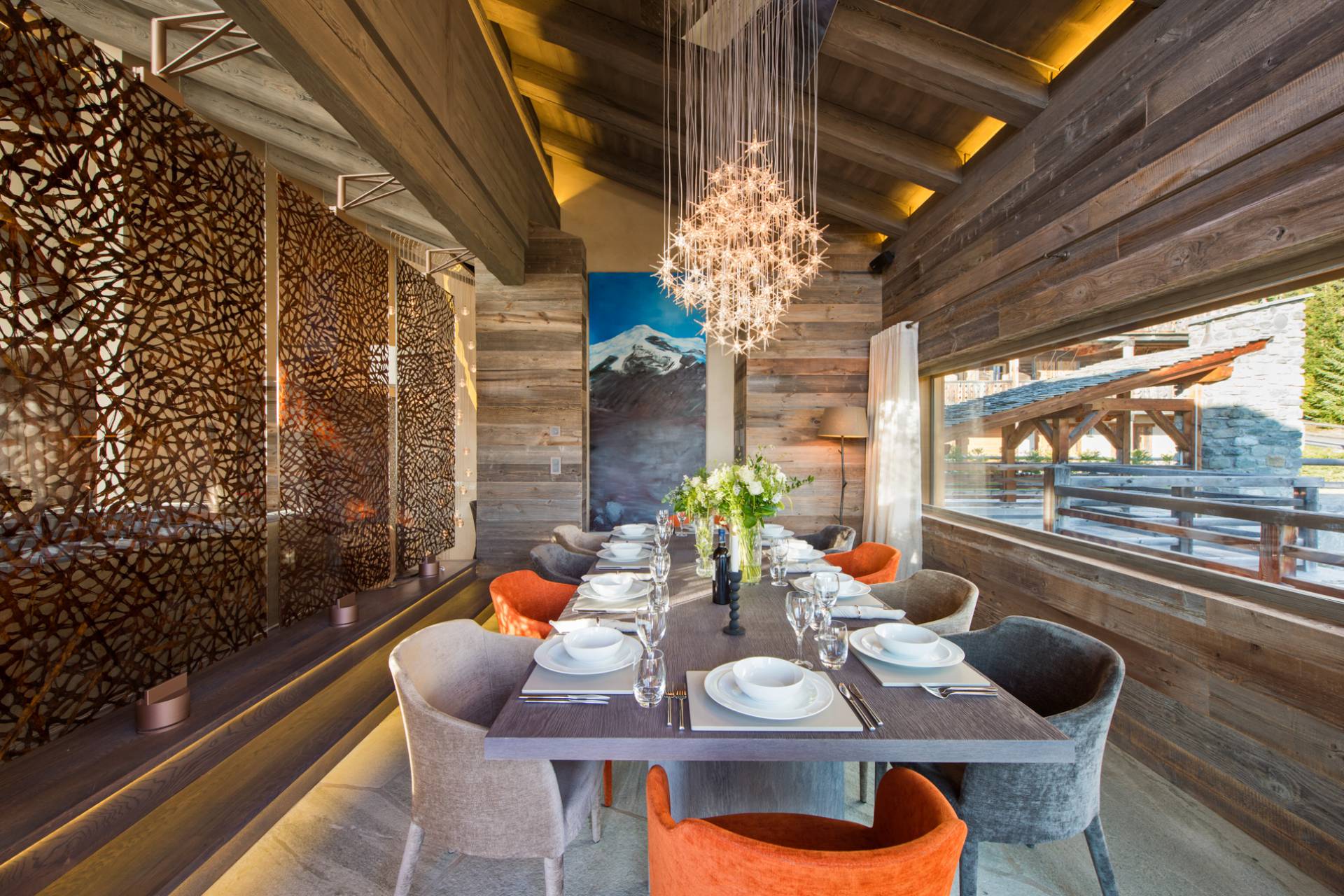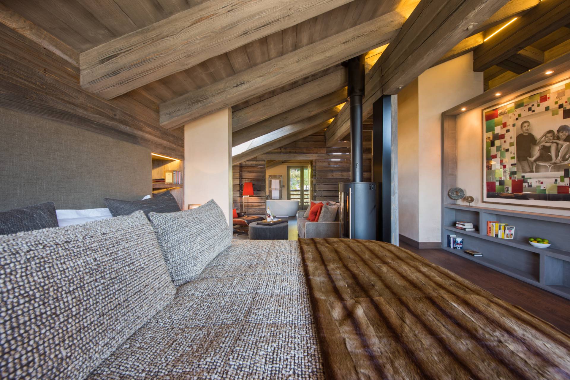 Au premier étage, le salon offre une vue panoramique sur les sommets du Combin et le massif du Mont-Blanc. Les grands canapés aux lignes contemporaines entourent une haute cheminée de pierre, promesse de détente dans la douce chaleur du feu. L’utilisation des matériaux bruts (bois de la charpente, murs lambrissés, parquet massif, pierre apparente) associée au choix soigné des étoffes colorées crée d’emblée une atmosphère élégante et raffinée, tout en préservant le caractère rustique de l’architecture montagnarde. Séparée par des panneaux au design graphique tamisant la lumière, la salle à manger peut réunir une douzaine de personnes. Elle jouxte une salle de jeux avec télévision. L’ensemble est pensé avec goût et aménagé en un confortable lieu de vie, mêlant matériaux traditionnels et lignes radicales.