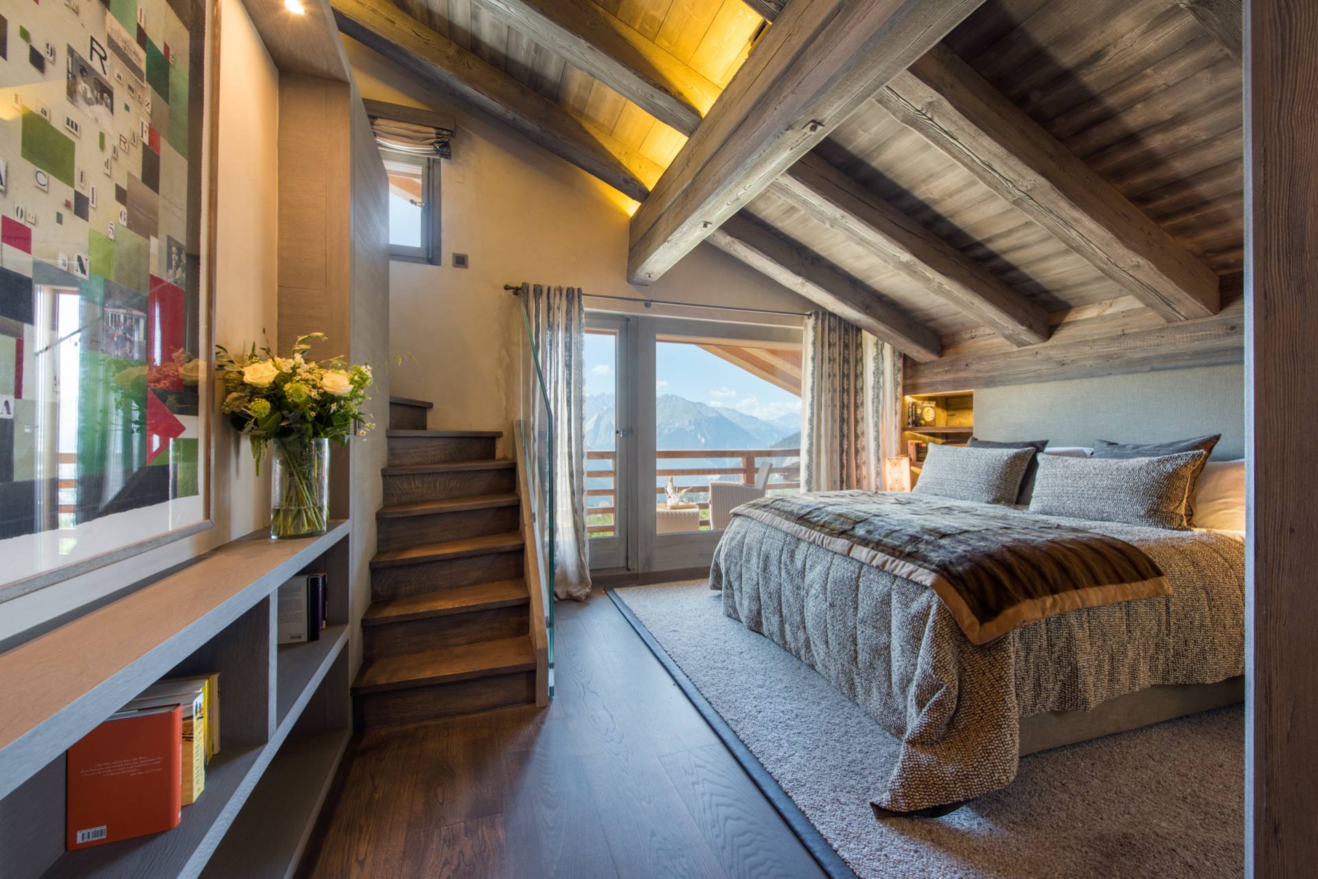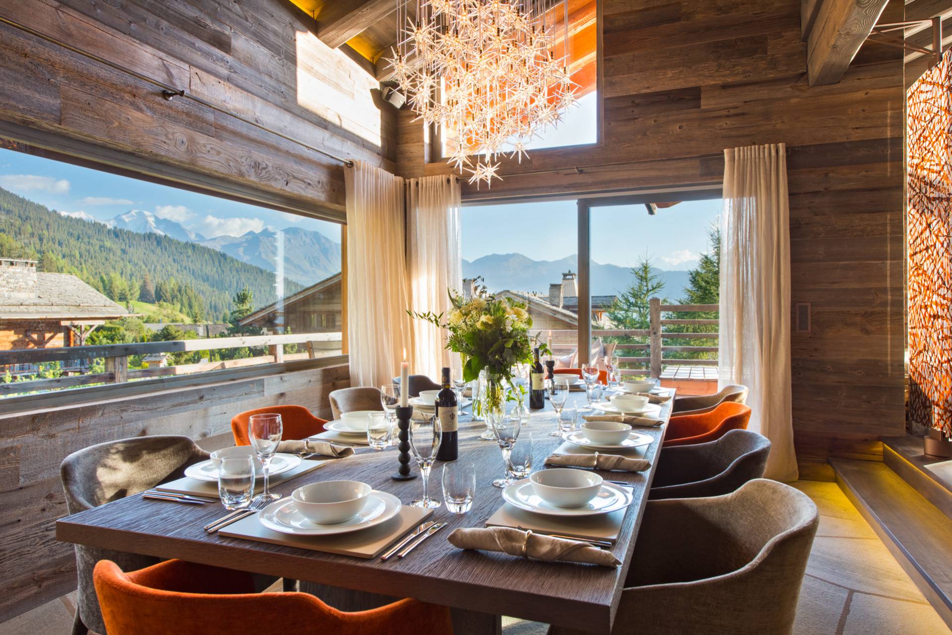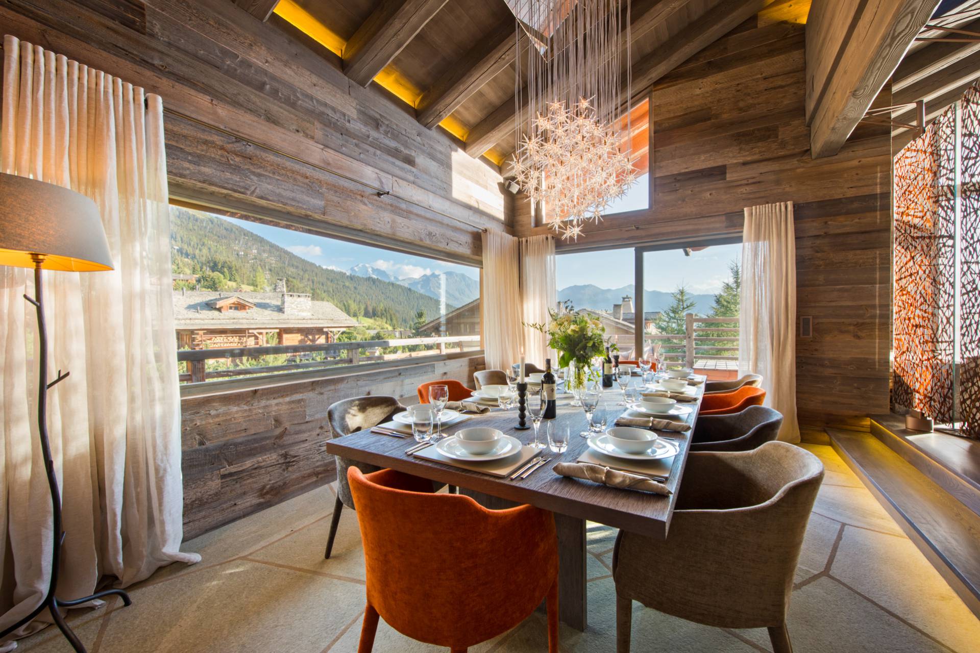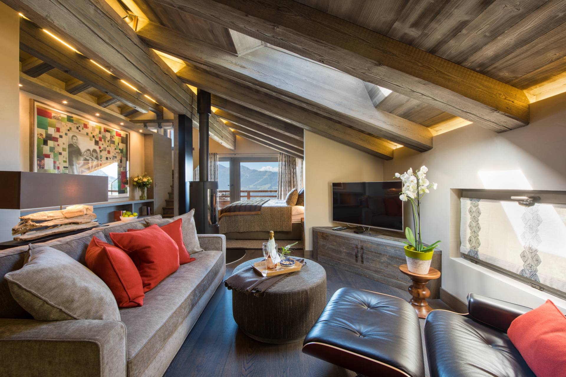 Au premier étage, le salon offre une vue panoramique sur les sommets du Combin et le massif du Mont-Blanc. Les grands canapés aux lignes contemporaines entourent une haute cheminée de pierre, promesse de détente dans la douce chaleur du feu. L’utilisation des matériaux bruts (bois de la charpente, murs lambrissés, parquet massif, pierre apparente) associée au choix soigné des étoffes colorées crée d’emblée une atmosphère élégante et raffinée, tout en préservant le caractère rustique de l’architecture montagnarde. Séparée par des panneaux au design graphique tamisant la lumière, la salle à manger peut réunir une douzaine de personnes. Elle jouxte une salle de jeux avec télévision. L’ensemble est pensé avec goût et aménagé en un confortable lieu de vie, mêlant matériaux traditionnels et lignes radicales.