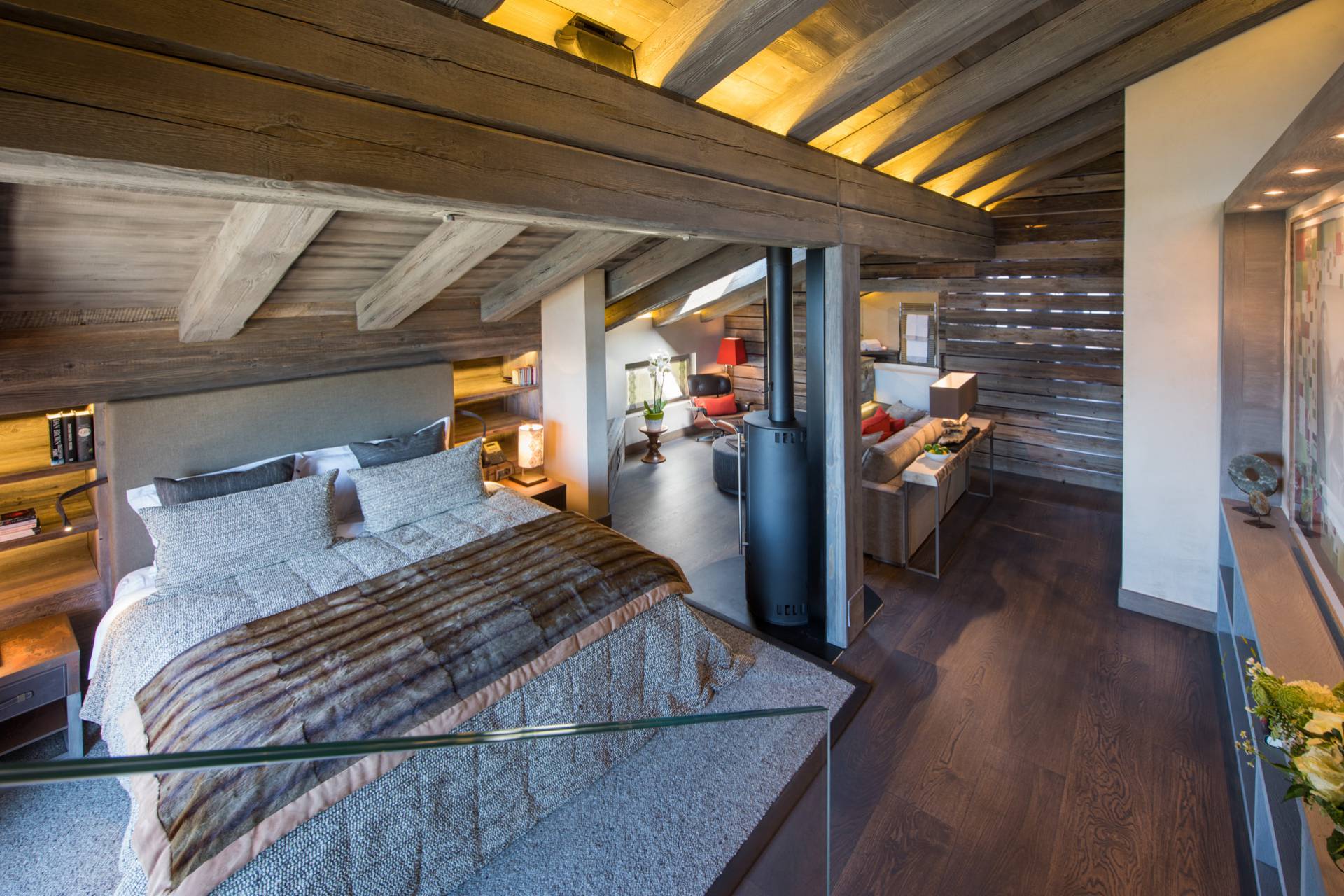 Au deuxième étage, la superbe suite parentale se révèle être un véritable espace de vie indépendant pour préserver repos et tranquillité de ceux qui y séjournent. Sous la charpente boisée du chalet, elle dispose d’un balcon privé et d’un coin salon moderne avec télévision, réchauffé par un poêle à bois central. Elle est également pourvue d’un dressing et d’une salle de bain habillée de bois, avec baignoire et douche à l’italienne et coup d’œil sur les forêts voisines. Une autre chambre double occupe l’étage, dotée d’un coin bureau et d’une salle de bain attenante avec baignoire et douche séparées.