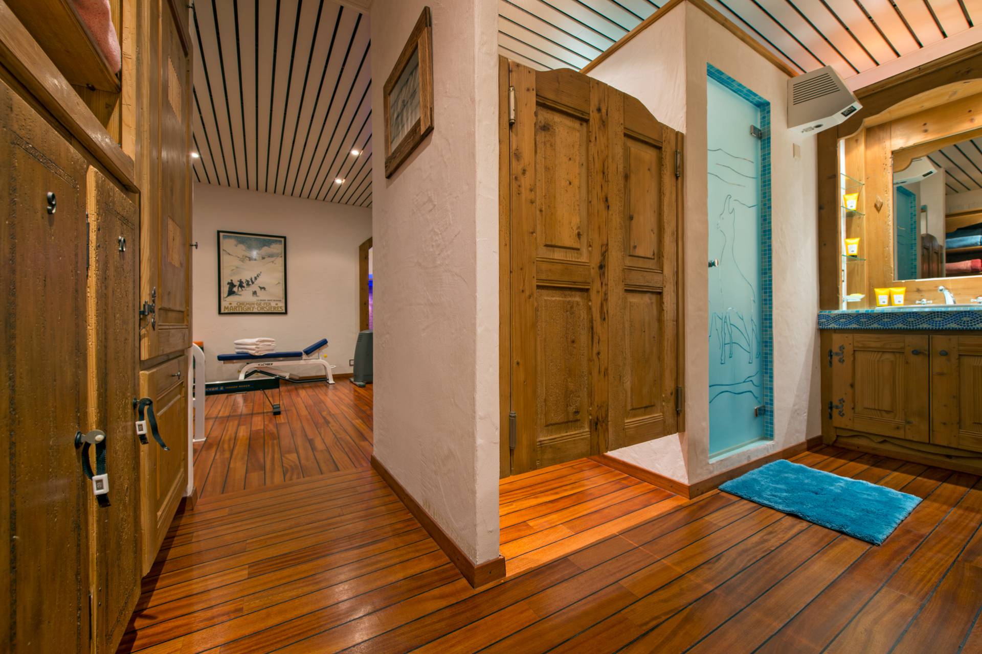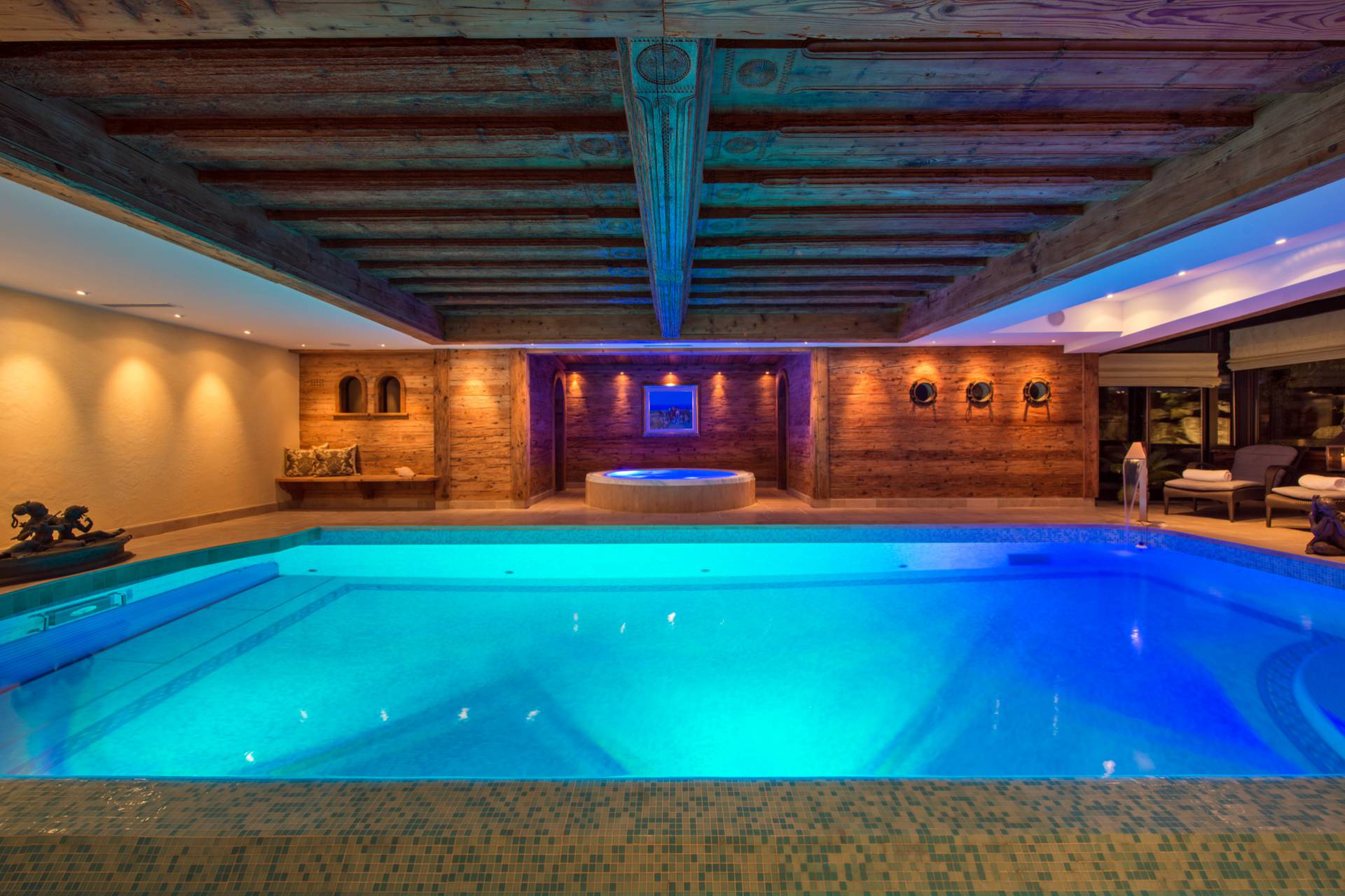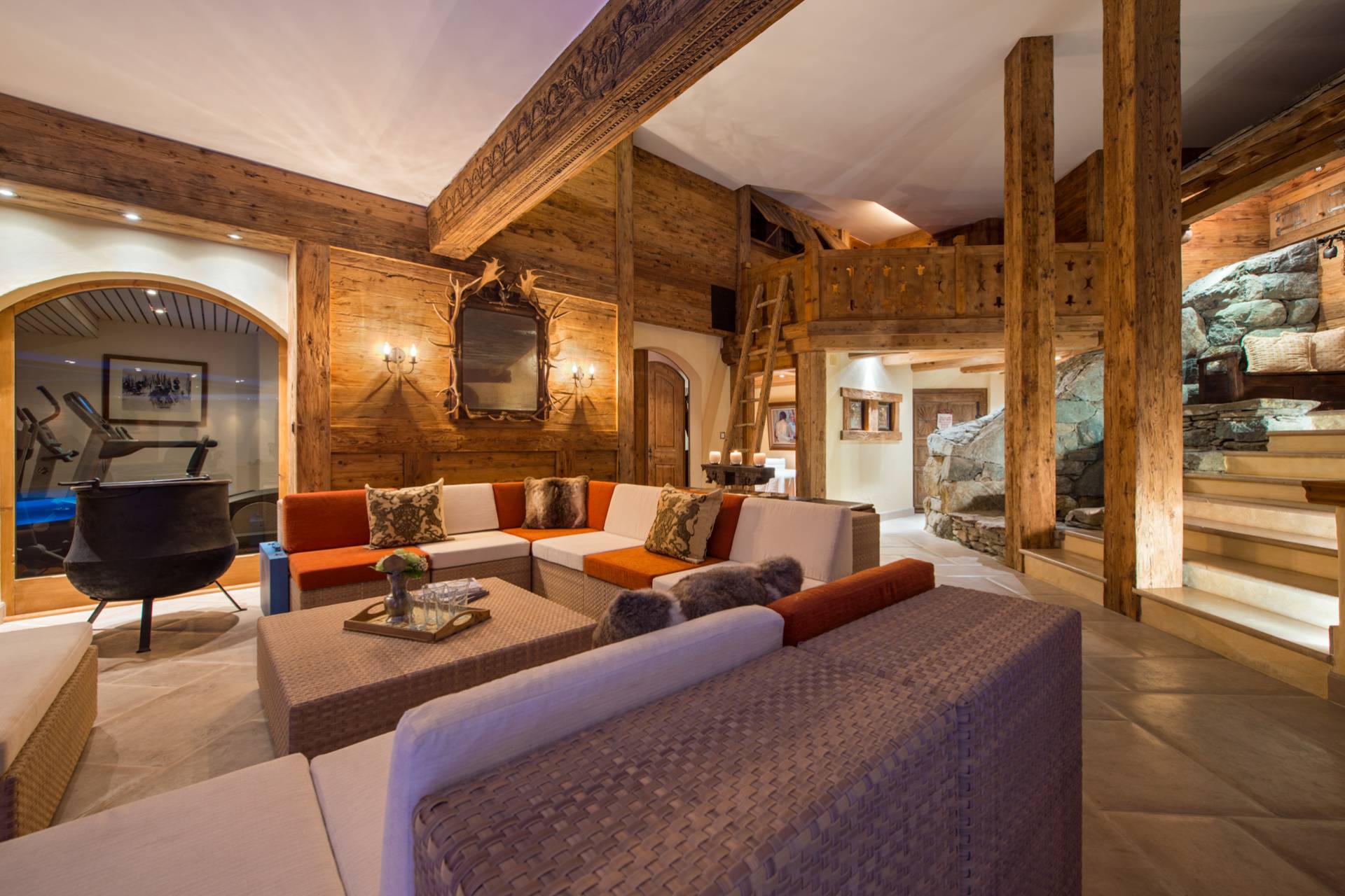 La majestueuse piscine intérieure avec cascade, le jacuzzi, le sauna et le hammam, tout comme la salle de massage, vous offriront d’agréables instants de détente après vos efforts sportifs dans ce chalet de luxe entre tradition et modernité, à moins que vous ne souhaitiez les prolonger dans le gymnase disposant d’une douche et d’un vestiaire.