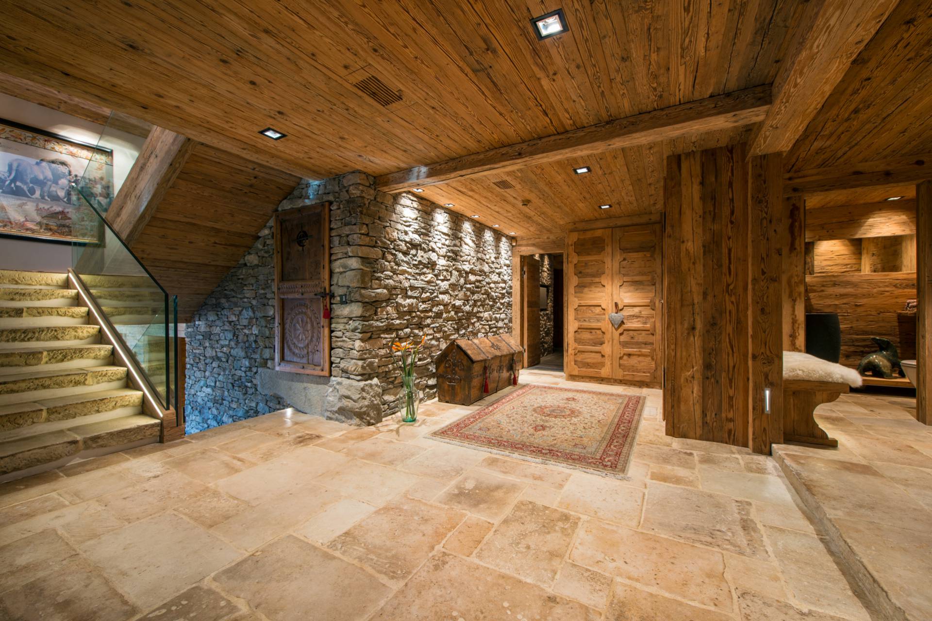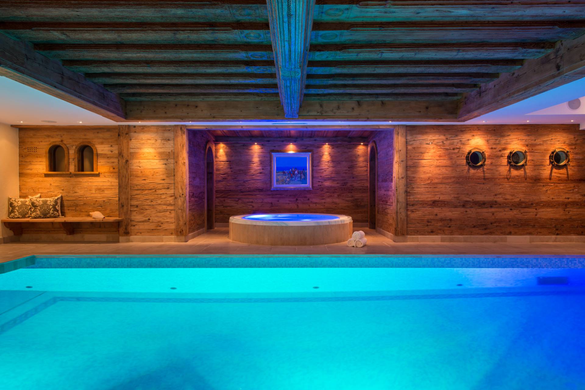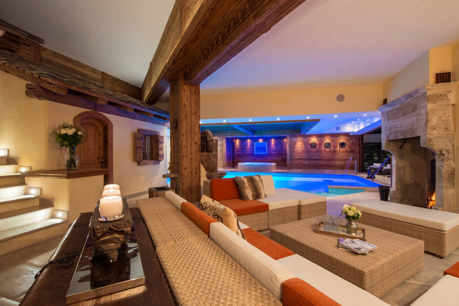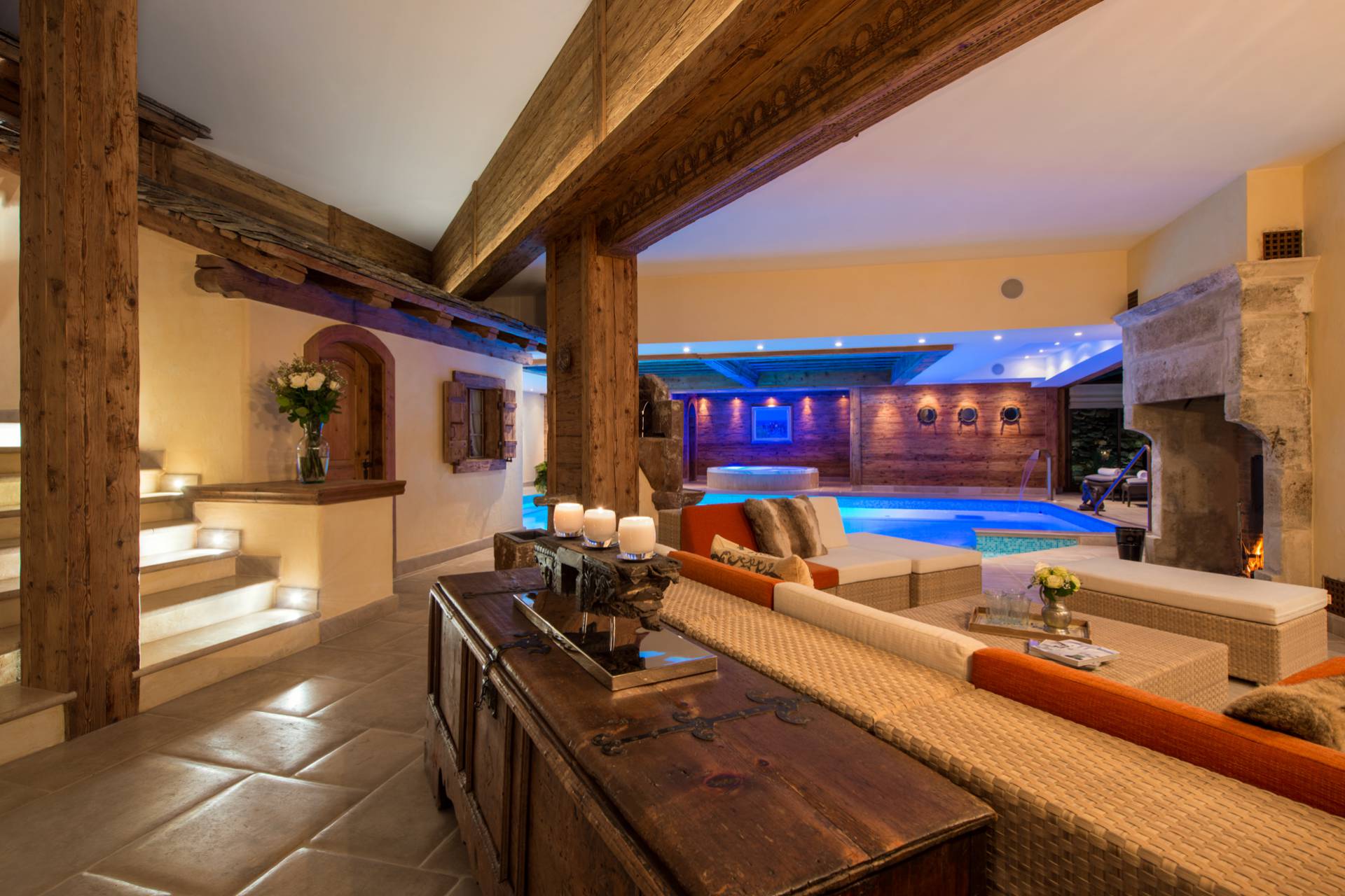 La majestueuse piscine intérieure avec cascade, le jacuzzi, le sauna et le hammam, tout comme la salle de massage, vous offriront d’agréables instants de détente après vos efforts sportifs dans ce chalet de luxe entre tradition et modernité, à moins que vous ne souhaitiez les prolonger dans le gymnase disposant d’une douche et d’un vestiaire.