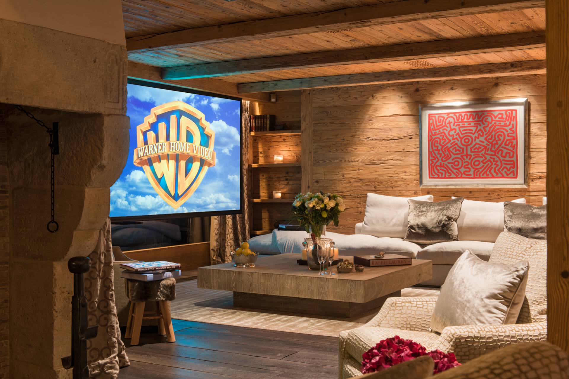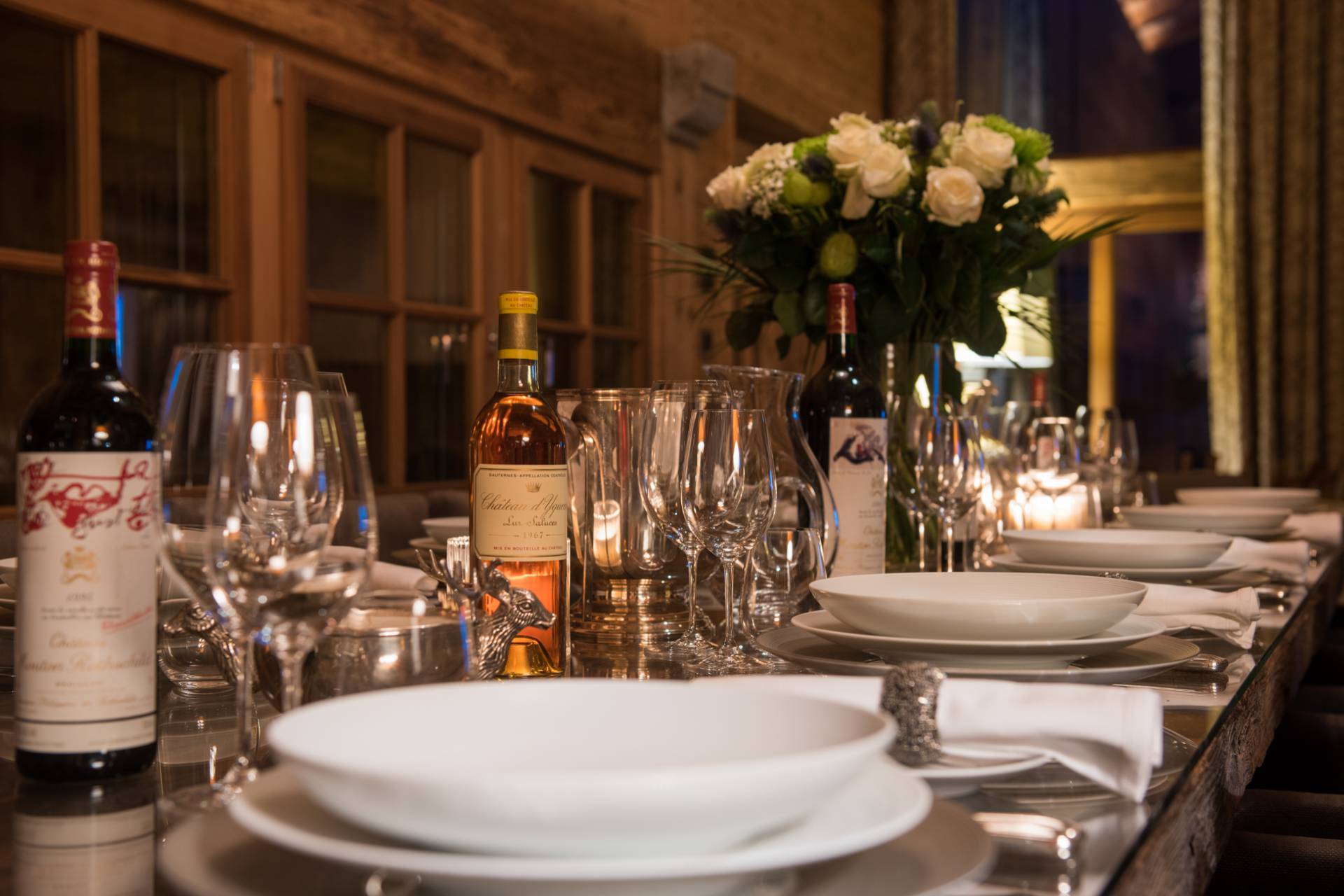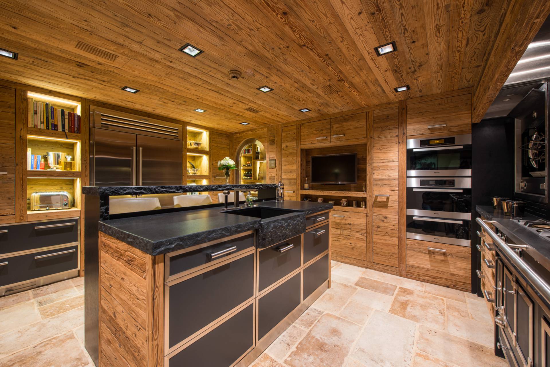 L’aménagement intérieur du chalet favorise la convivialité : le superbe salon aux murs de bois et de pierre et sa cheminée en briques au rez-de-chaussée sera le cadre idéal d’un moment de détente après une journée de ski. Vous aurez le choix entre deux espaces pour vous restaurer à cet étage : à l’intérieur dans la belle salle à manger au design moderne, ou sur la terrasse pour profiter de la nature environnante. La cuisine, avec son bar en ardoise, privilégie, elle aussi, les matériaux naturels, en harmonie avec le reste de la demeure.