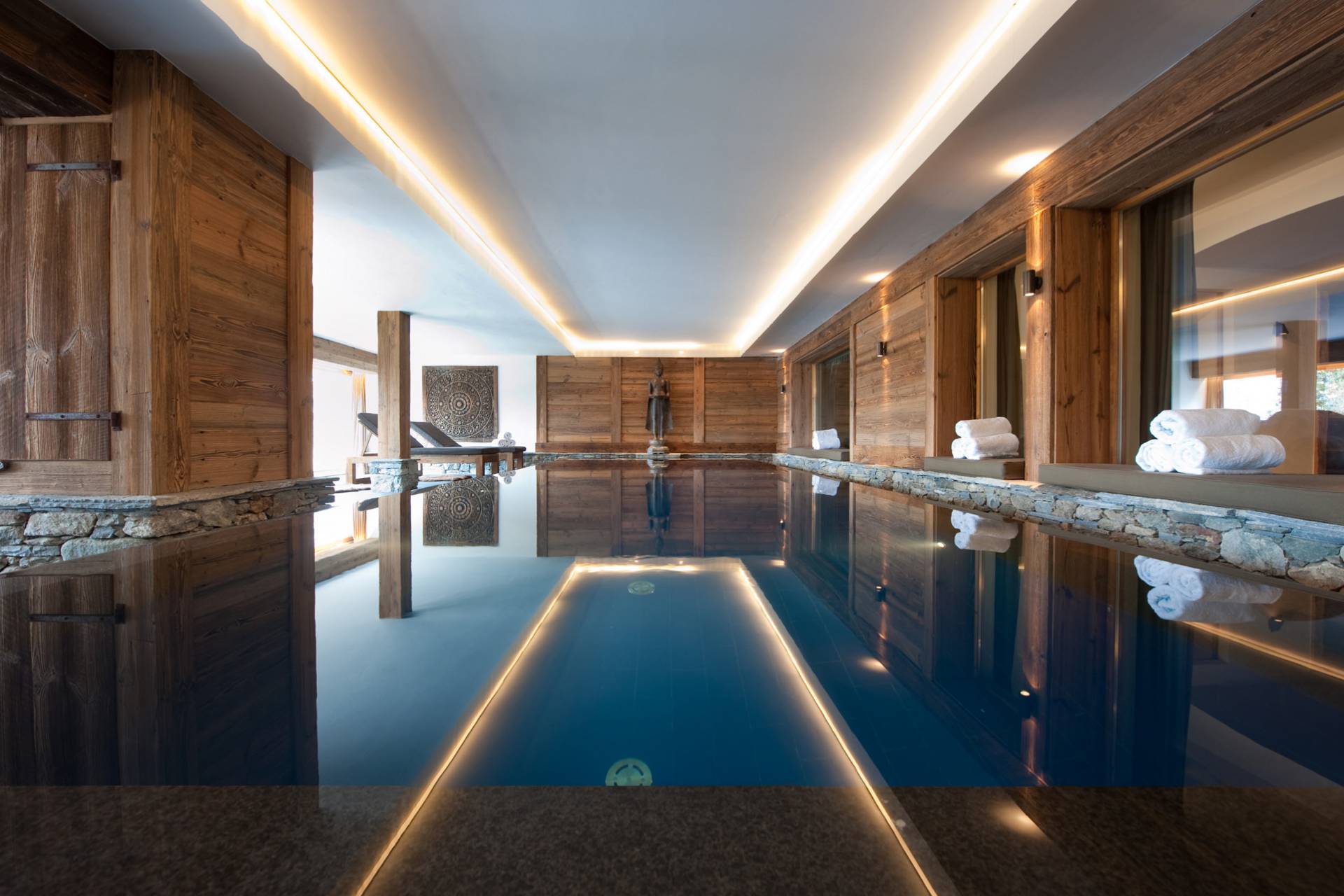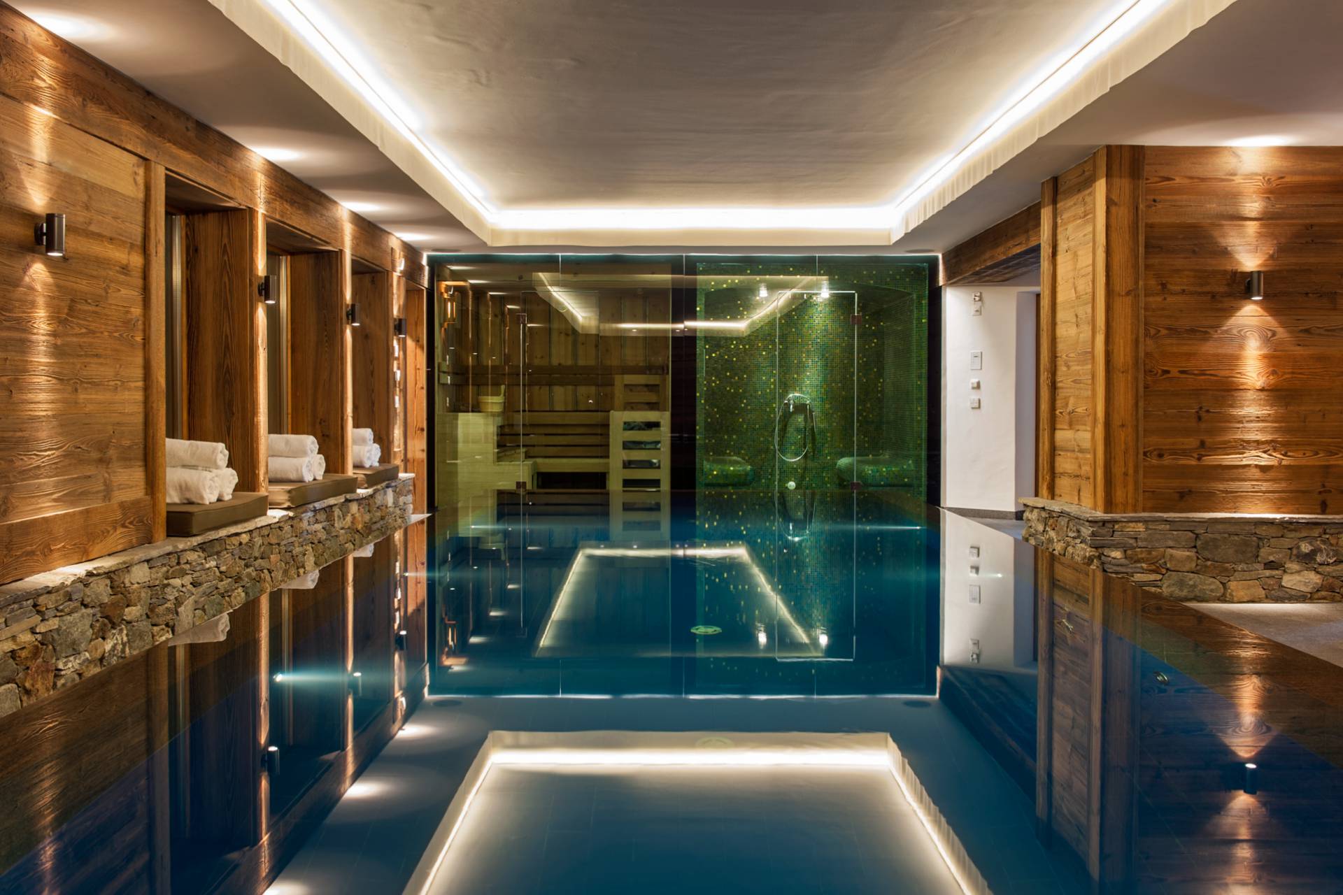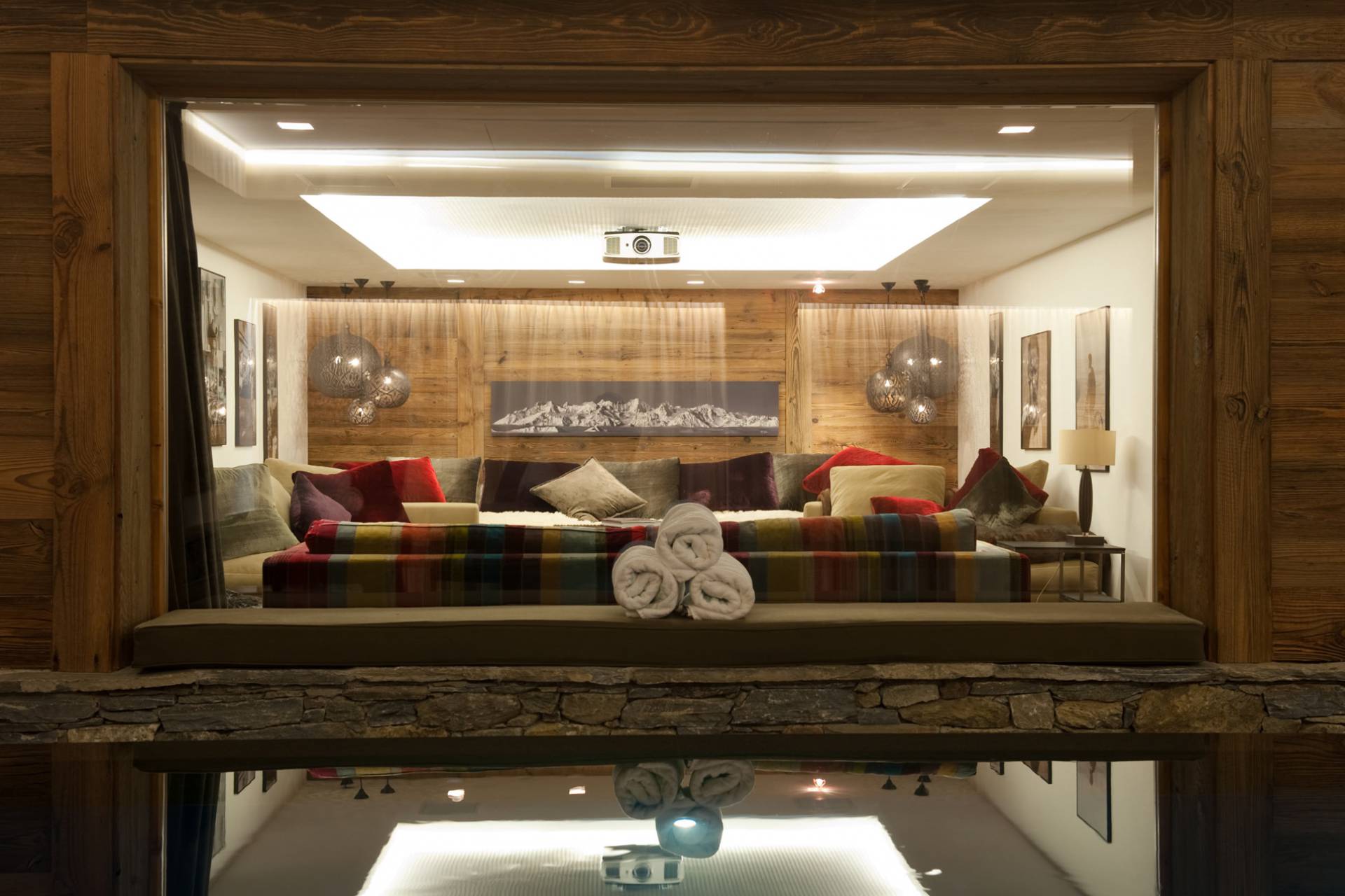 Au rez-de-chaussée, le spa avec piscine intérieure, hammam et sauna, aux touches décoratives venues d’Asie lui donnant une agréable ambiance zen, est l’un des atouts de cette incroyable propriété, tout comme la salle de sport et la salle de cinéma équipée des dernières technologies audio et vidéo. Au retour de votre journée de sport d’hiver, après avoir déposé vos skis dans le local dédié, vous jouirez d’un moment de détente autour d’un verre au bar disposant de sa propre cave à vins.