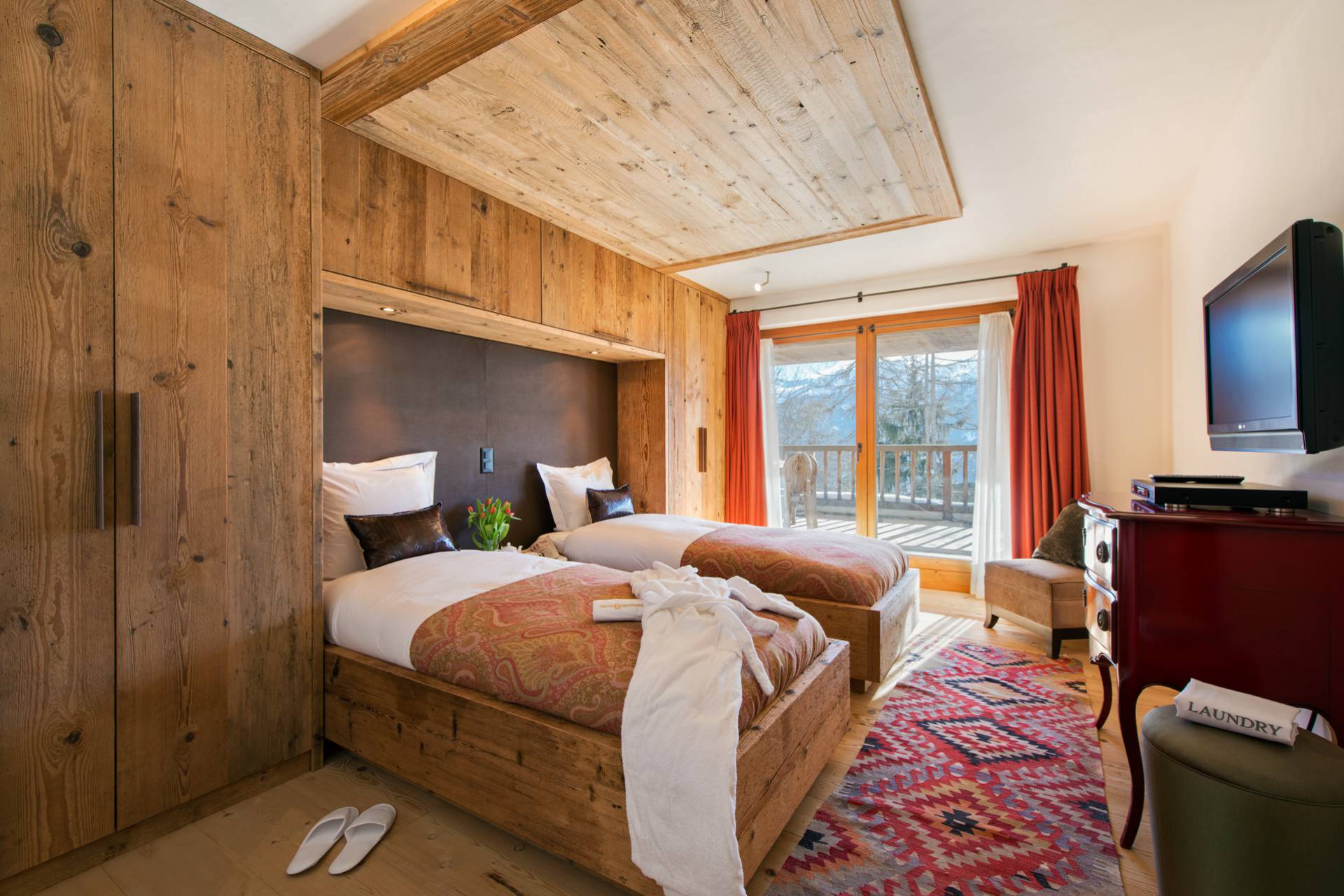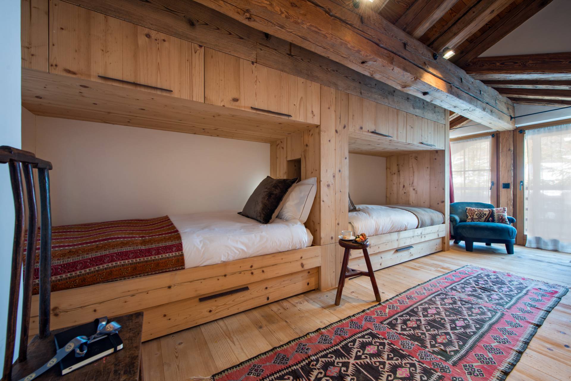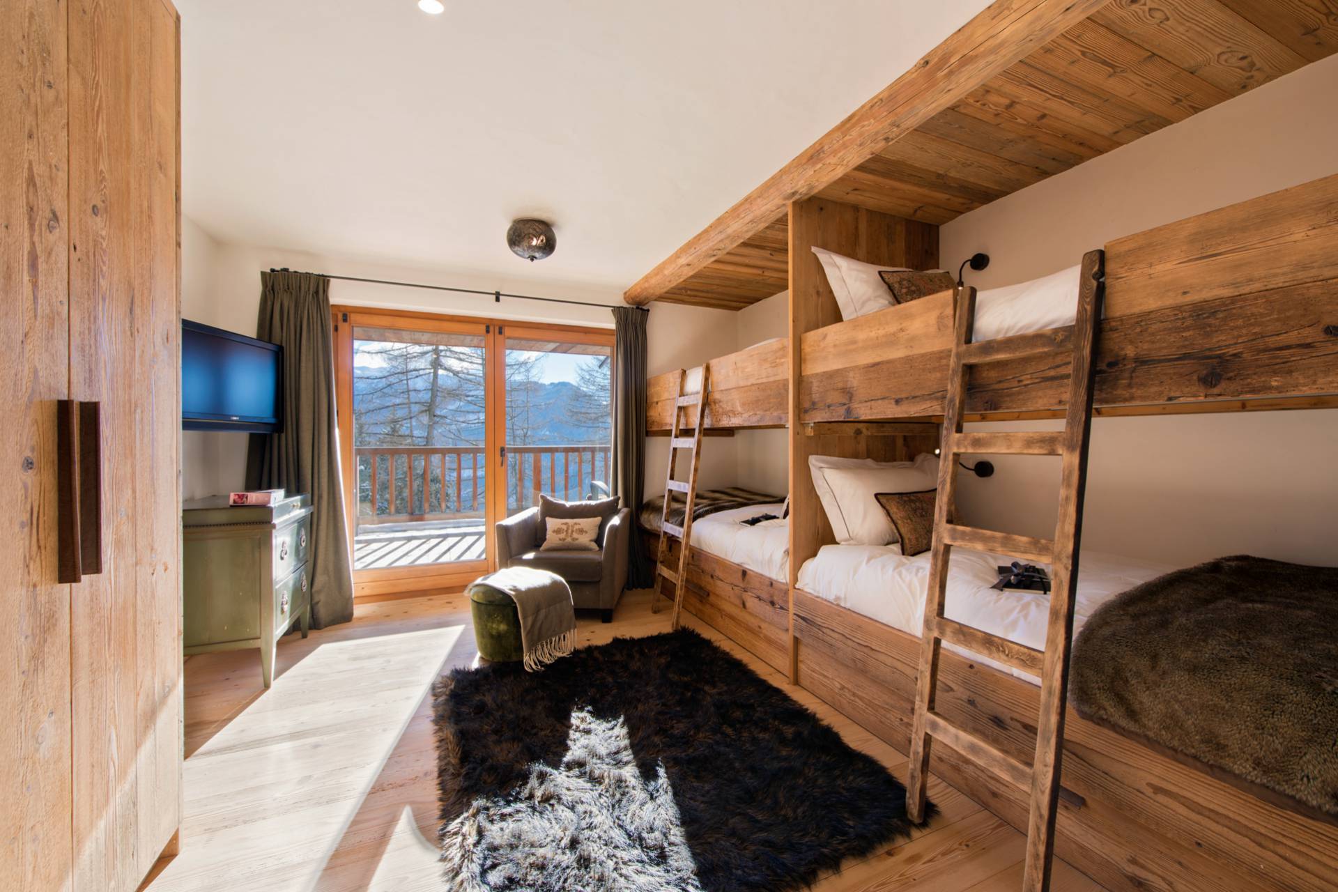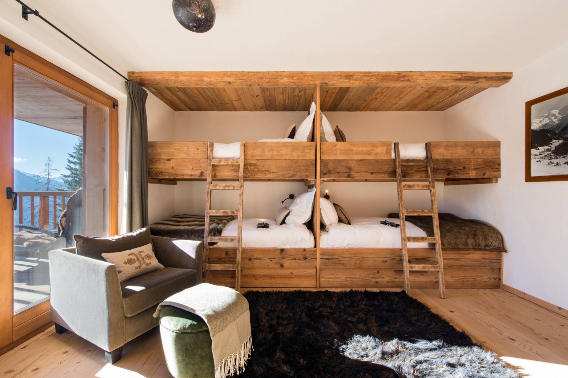 Le premier étage contient quatre chambres indépendantes, ayant l’avantage de disposer toutes de leur propre salle de bain ou douche et d’un accès au balcon. L’agencement intérieur est pensé pour s’adapter à tous vos invités, avec deux chambres avec lits doubles, une chambre avec lits superposés pour les enfants, et une chambre avec lits jumeaux. Leur décoration est à la fois élégante, moderne et confortable avec cette touche alpine caractéristique de ce chalet spectaculaire sur les hauteurs de Verbier.