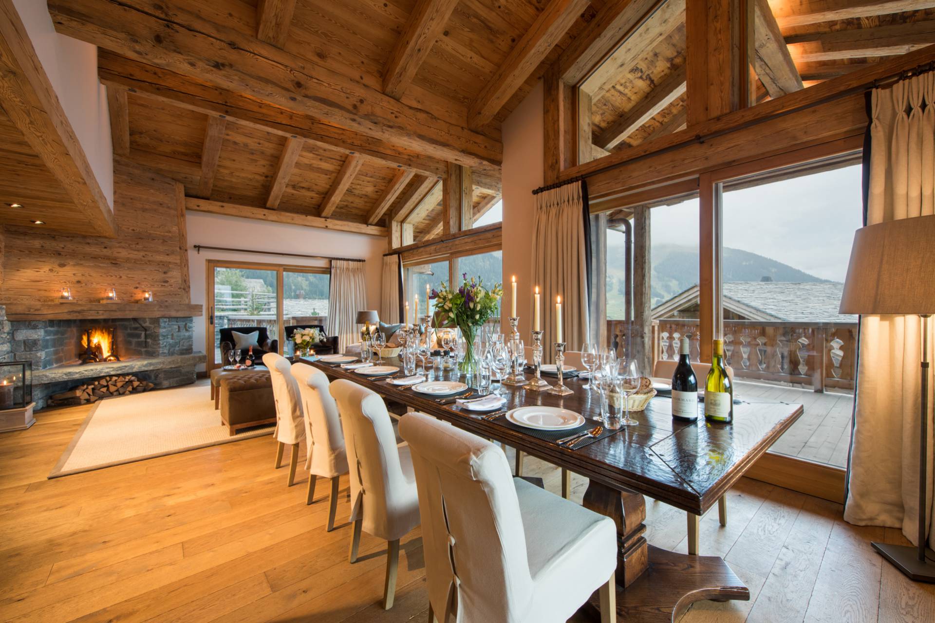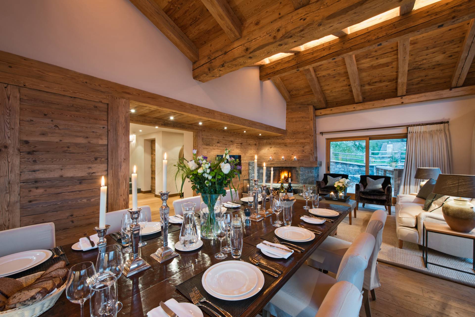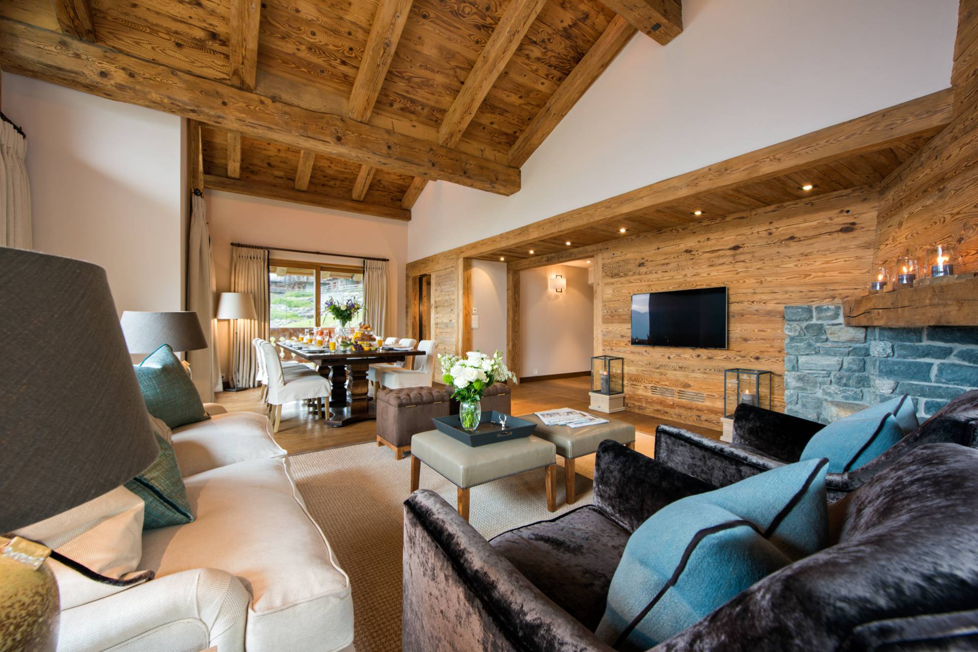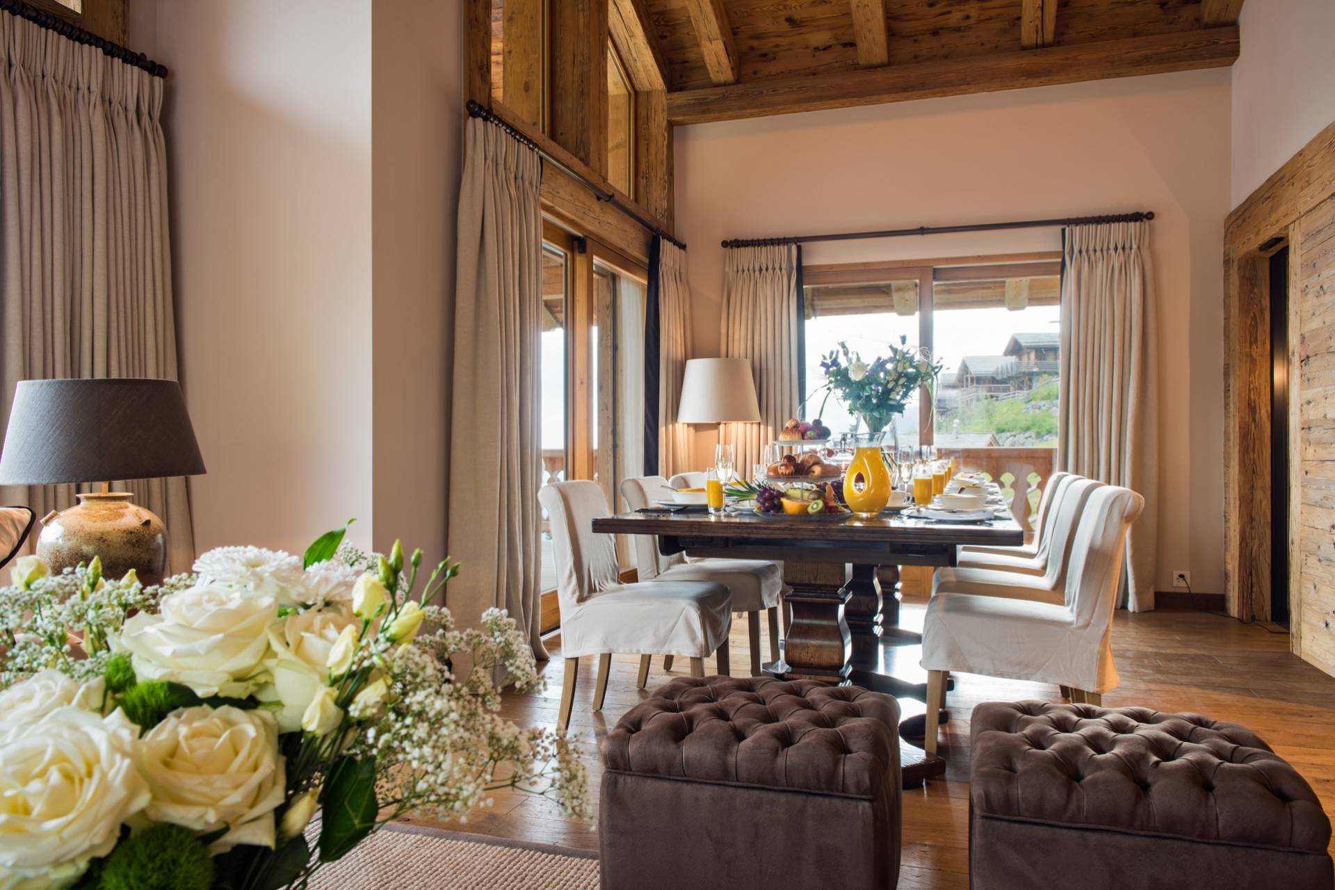 Vous montez ensuite par l’escalier ou l’ascenseur au deuxième étage où se trouvent les espaces de vie. Avec ses portes fenêtres coulissantes donnant sur le paysage enneigé et sa belle hauteur sous plafond, le salon-salle à manger est spacieux et lumineux. La cheminée en bois et pierres, le mobilier chic et contemporain dans des tons de beige et de blanc, avec de discrètes touches de couleurs, donnent un aspect élégant et chaleureux à cette pièce qui s’ouvre sur une superbe terrasse. La cuisine séparée permettra de préparer vos repas en toute tranquillité.