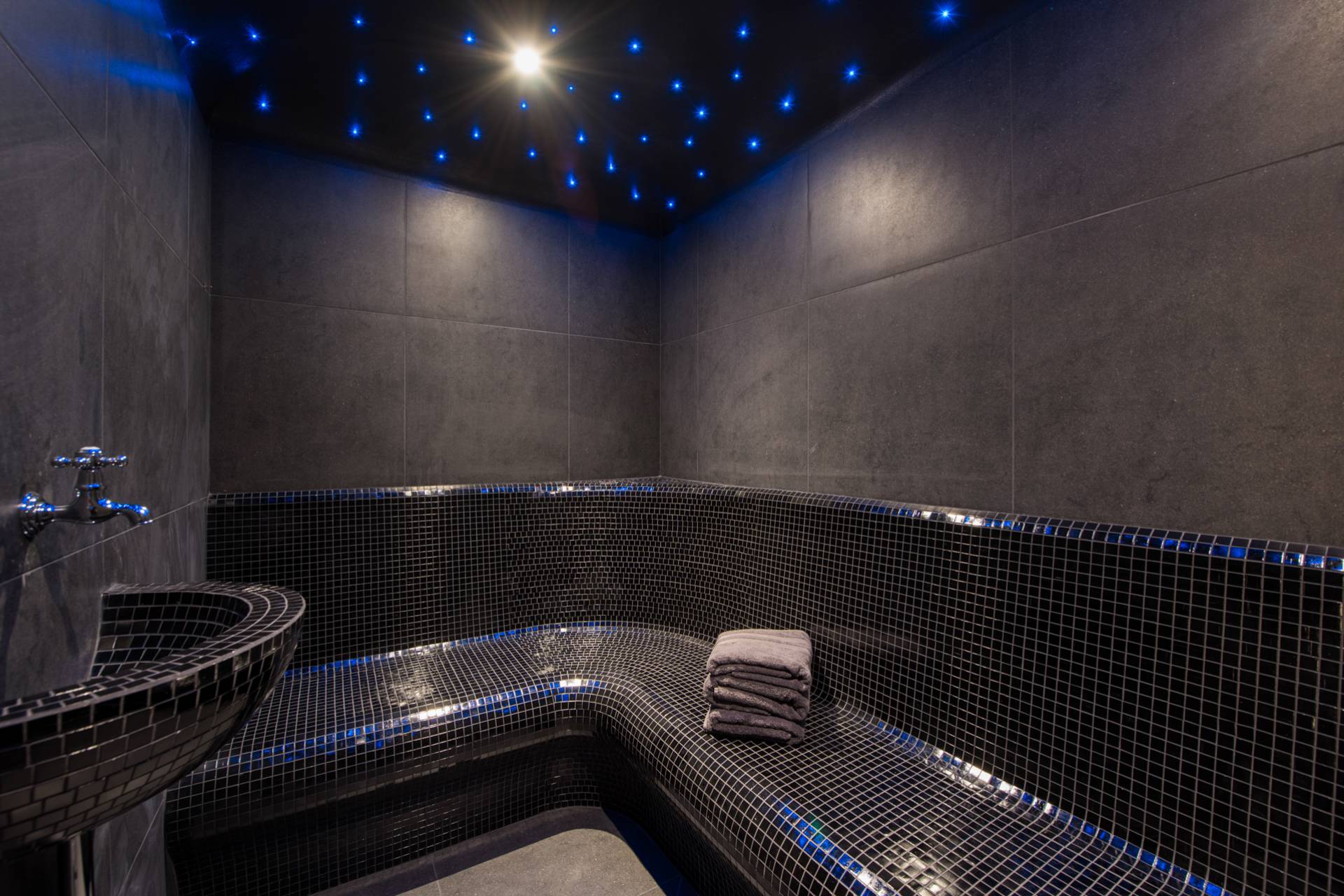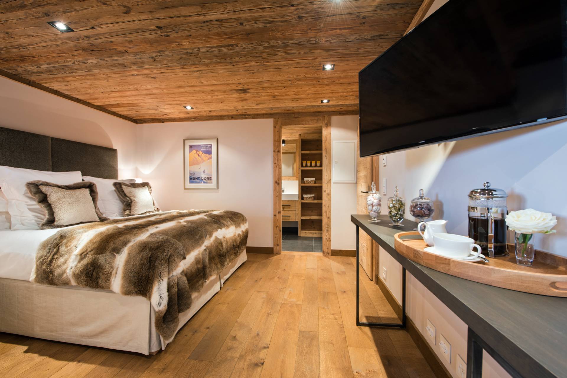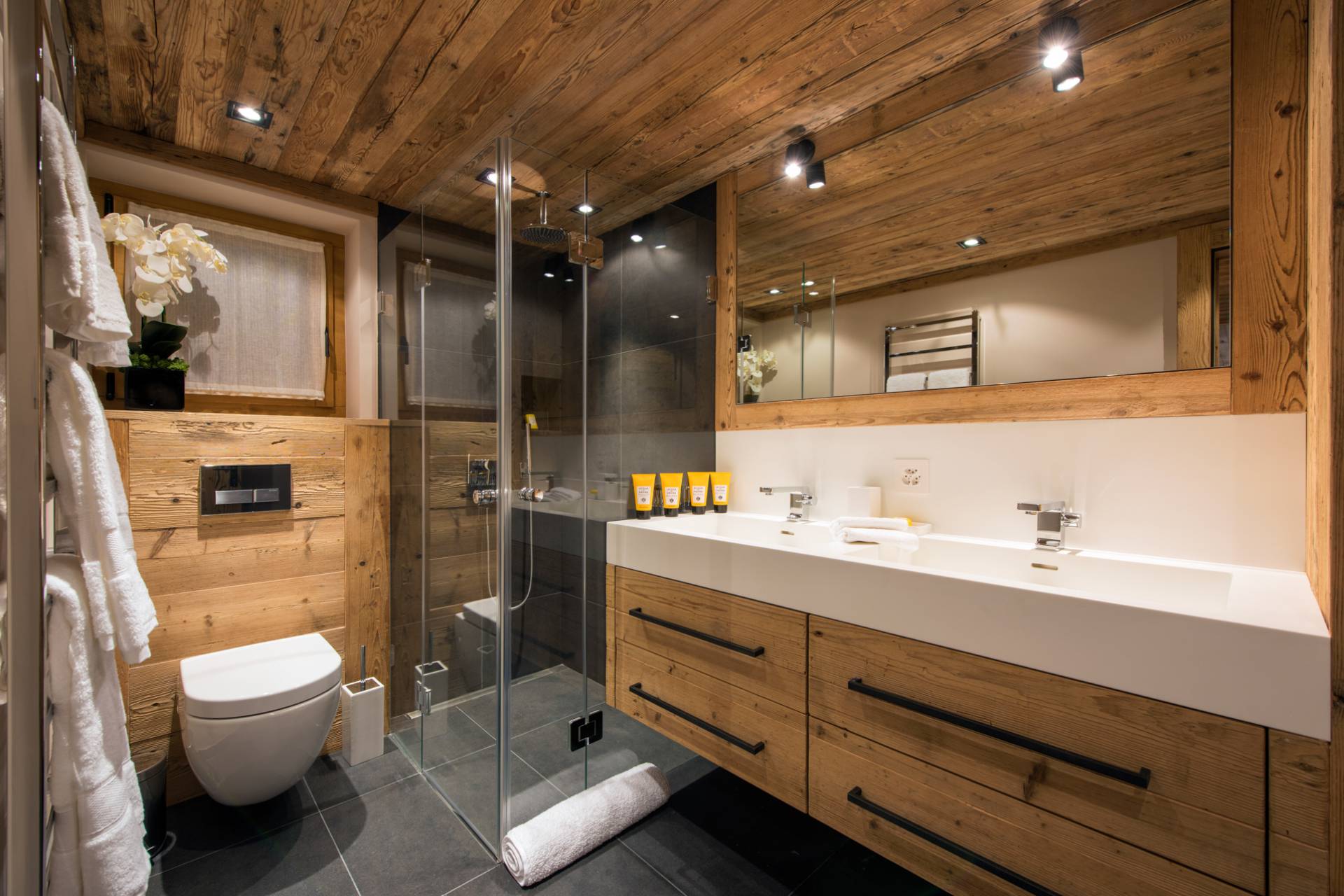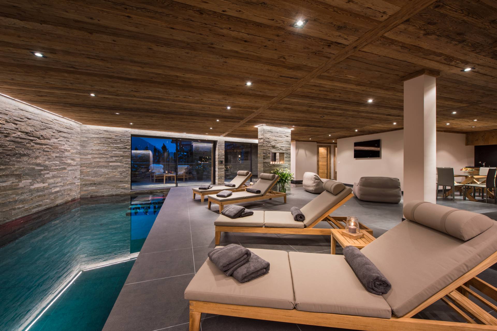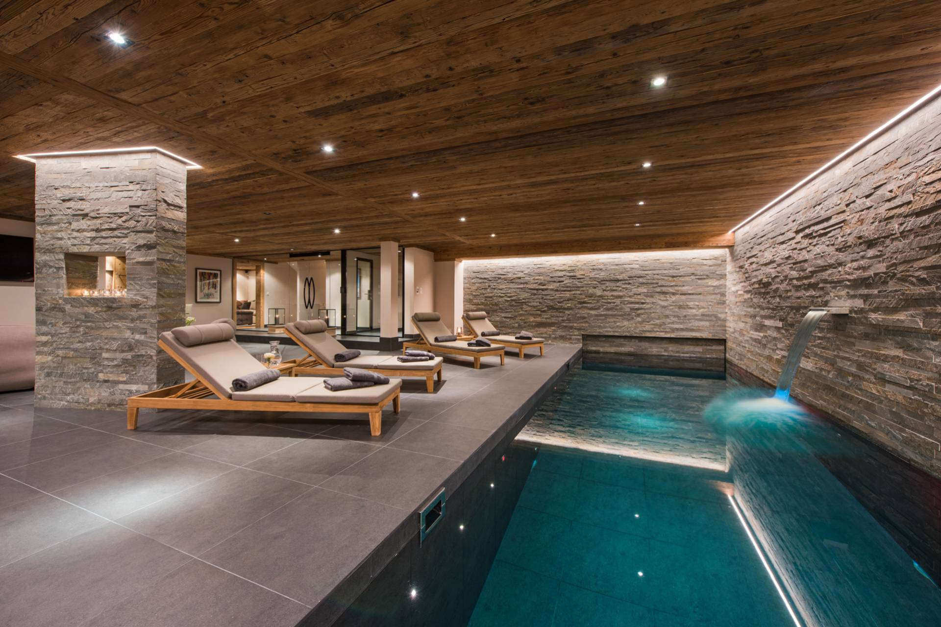 Un incroyable spa vous attend au rez-de-chaussée pour vous remettre de vos émotions sur les pistes. Jacuzzi, piscine intérieure, hammam, sauna et même salle de massage : tout encourage au repos et au délassement un cadre au design épuré de bois et pierre. Cet étage comprend aussi une agréable salle de cinéma, une cave à vins et une petite cuisine avec bar, offrant un deuxième espace de convivialité dans ce chalet unique à flanc de montagne, lauréat du prix du World’s Best New Chalet au World Ski Awards en 2015.